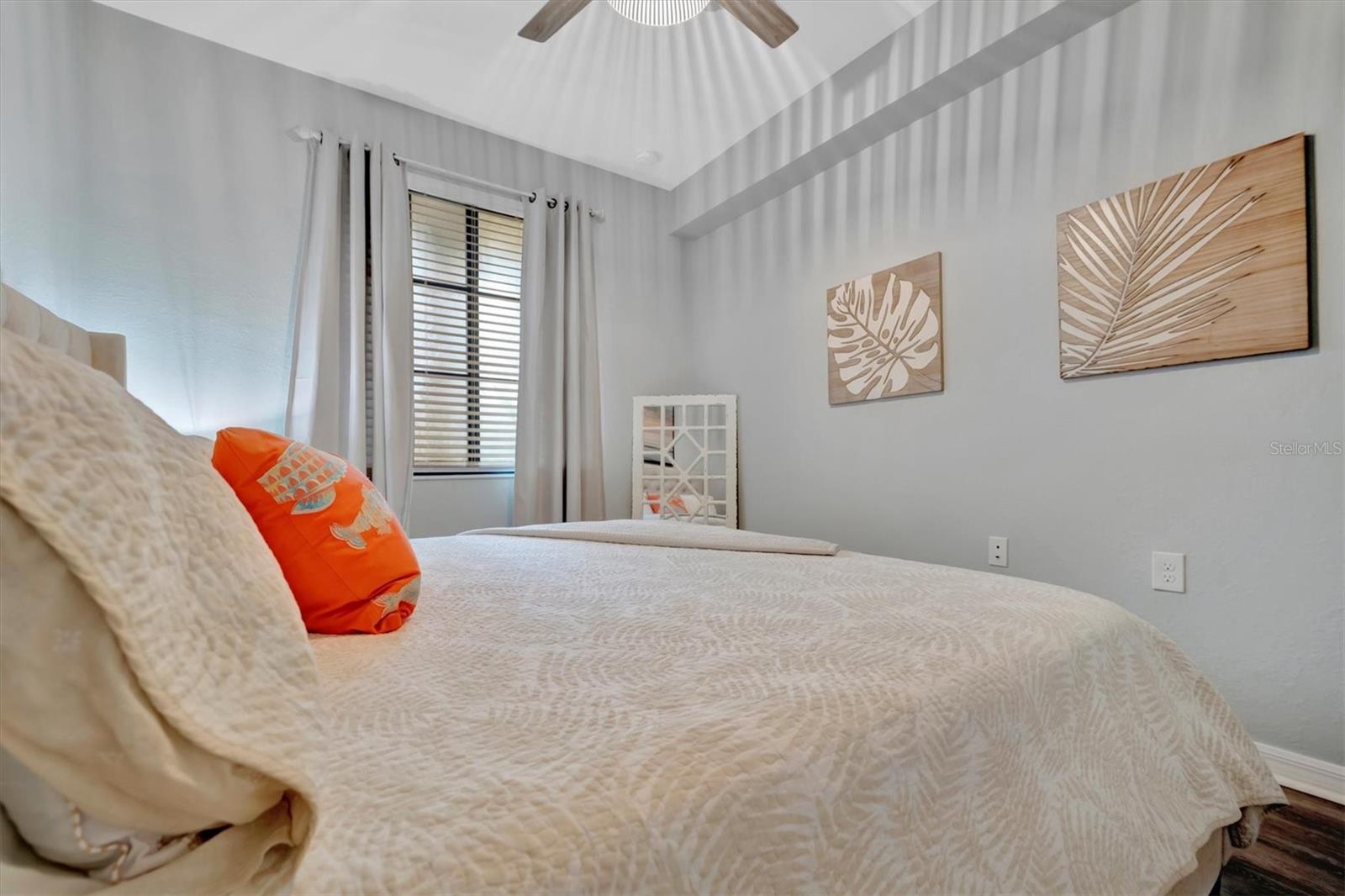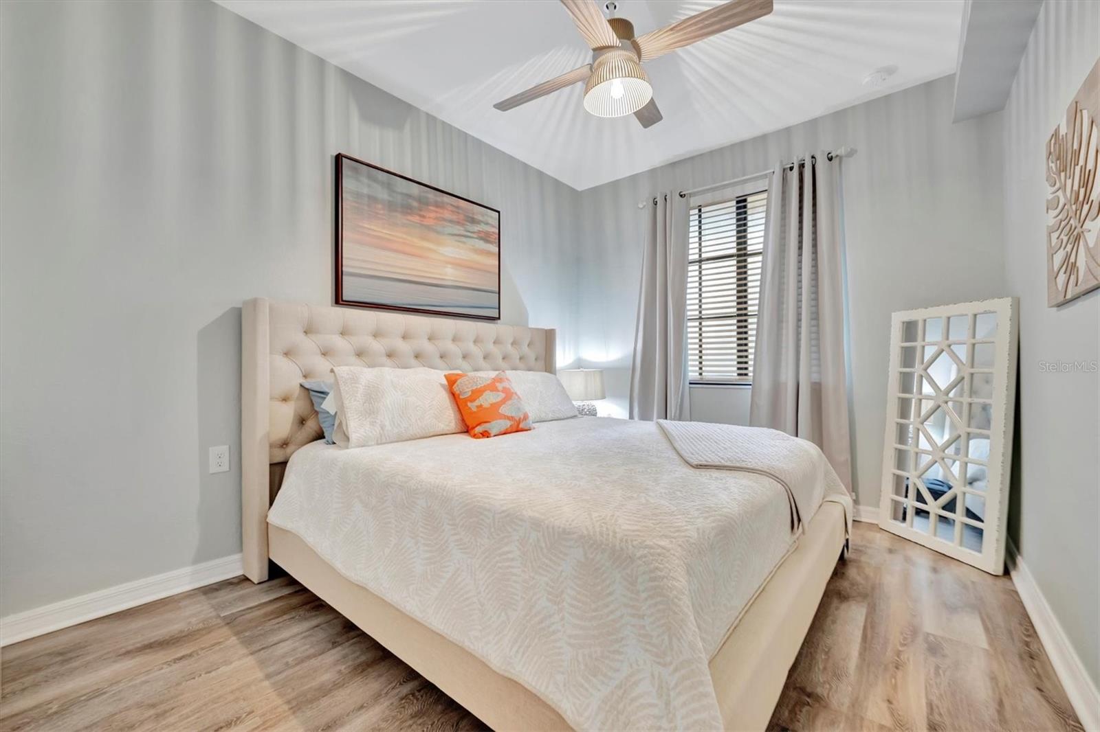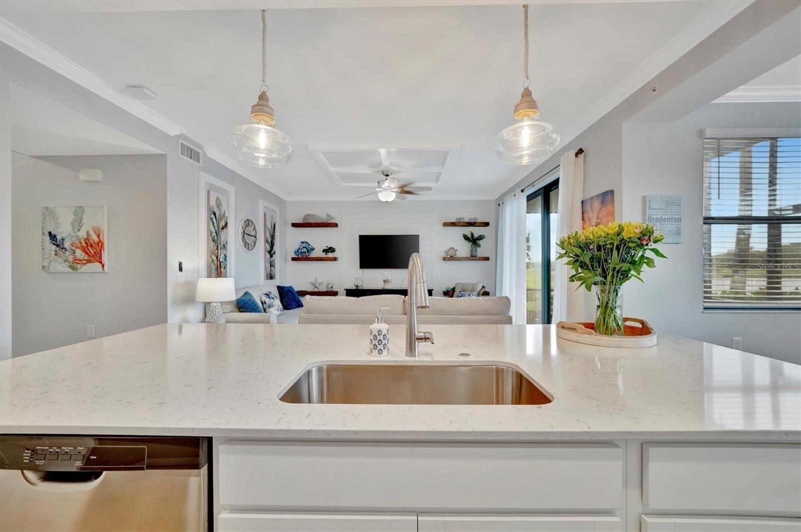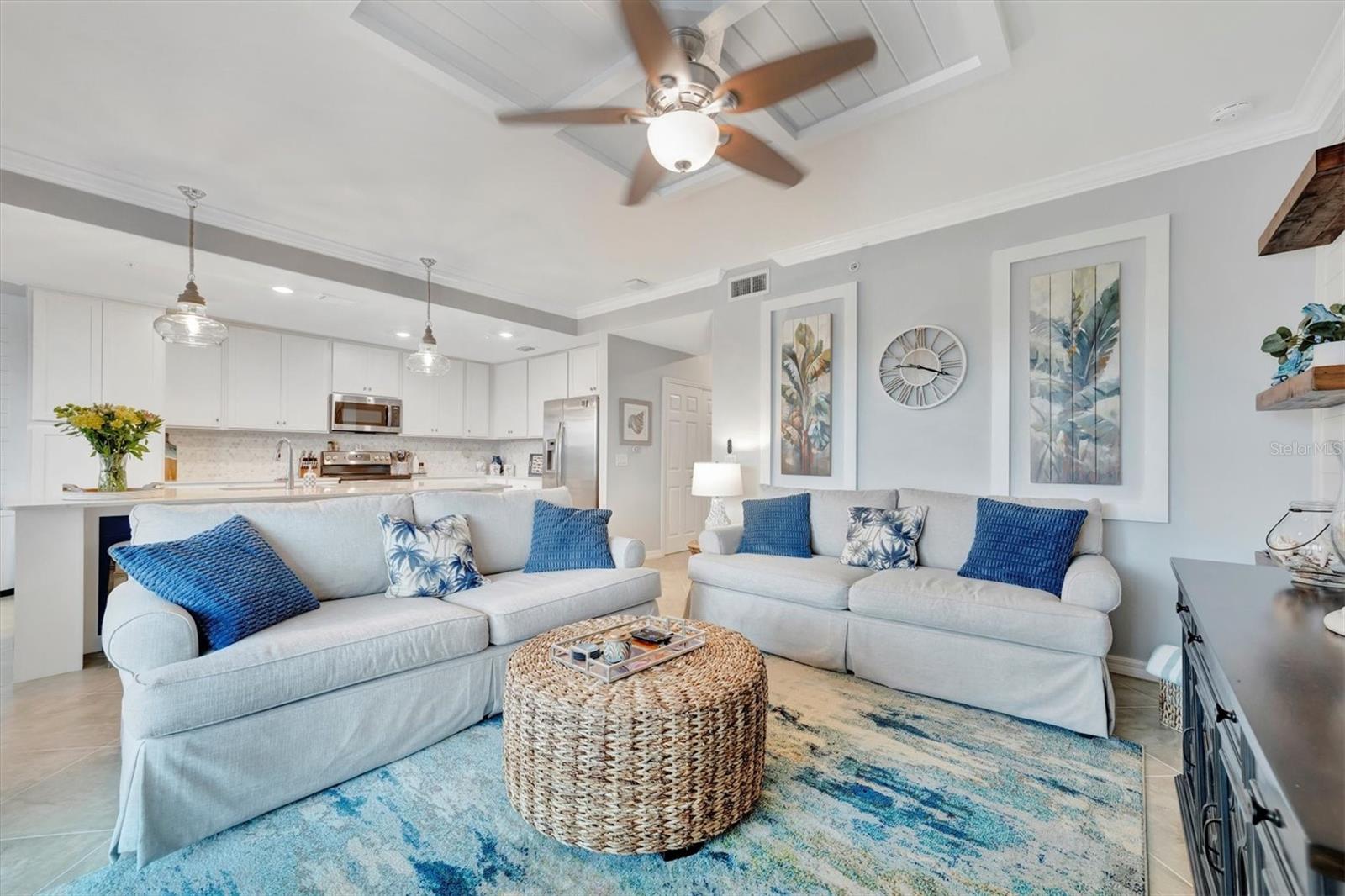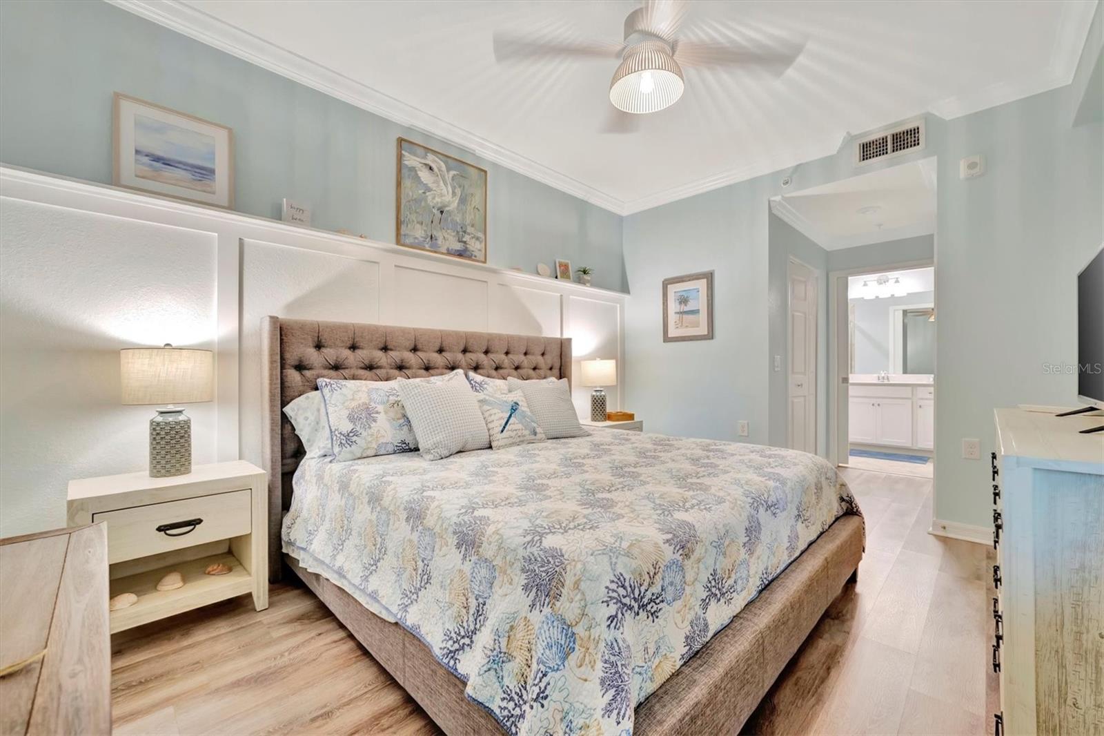 Welcome to paradise! Live in luxury at Lakewood National Golf Club, where residents enjoy membership to the 36-hole Arnold Palmer designed golf community. One of the most beautiful and upgraded units in the community, this custom first floor turnkey home offers a front row seat to the expansive views of hole #16 on the Piper Course. This 2 bedroom/2 bathroom, Birkdale Model features many stylish upgrades including beautiful Board and Batten accented walls, accented living room ceiling, luxury vinyl flooring throughout, custom cupboards and closets, open shelving in living room, upgraded fans in all bedrooms including the lanai, a stunning chandelier, as well as custom shiplap accenting in the living and dining rooms. The kitchen boasts a new full sink and faucet, artfully accented backsplash, beverage cooler, as well as new pendant lighting. The primary suite includes 2 walk-in closets, an en suite bath with a spacious walk-in shower, and granite vanity. This home comes with an assigned covered parking spot and custom shelving in the storage closet for your convenience. With one of the better water views in the community, you will experience wildlife and golf up close and personal from the comfort of your screened-in lanai that is completely sealed, so no visits from geckos or other critters. The brand-new A/C compressor will leave you comfortable, cool and worry free for years to come. Membership boasts access to 36 holes of golf, 24-hour gated security with nightly patrol, a state-of-the-art fitness center with 24-hour access, an onsite fitness director, a TPI certified personal trainer, and a variety of group fitness classes to choose from, saunas in the men’s and women’s locker rooms, 8 lighted Har-Tru tennis courts, 4 pickleball courts, 2 Har-Tru bocce courts, full-service salon/spa, resort-style pool with waterfall features, a spa, and a lap pool. Enjoy dining at the community's 2 restaurants - the poolside Tiki Bar & Grill, and the full service on-site dining experience at Deke’s Grill & Palmer Room located inside the newly finished clubhouse. You will find everything you need within this beautiful gated community.