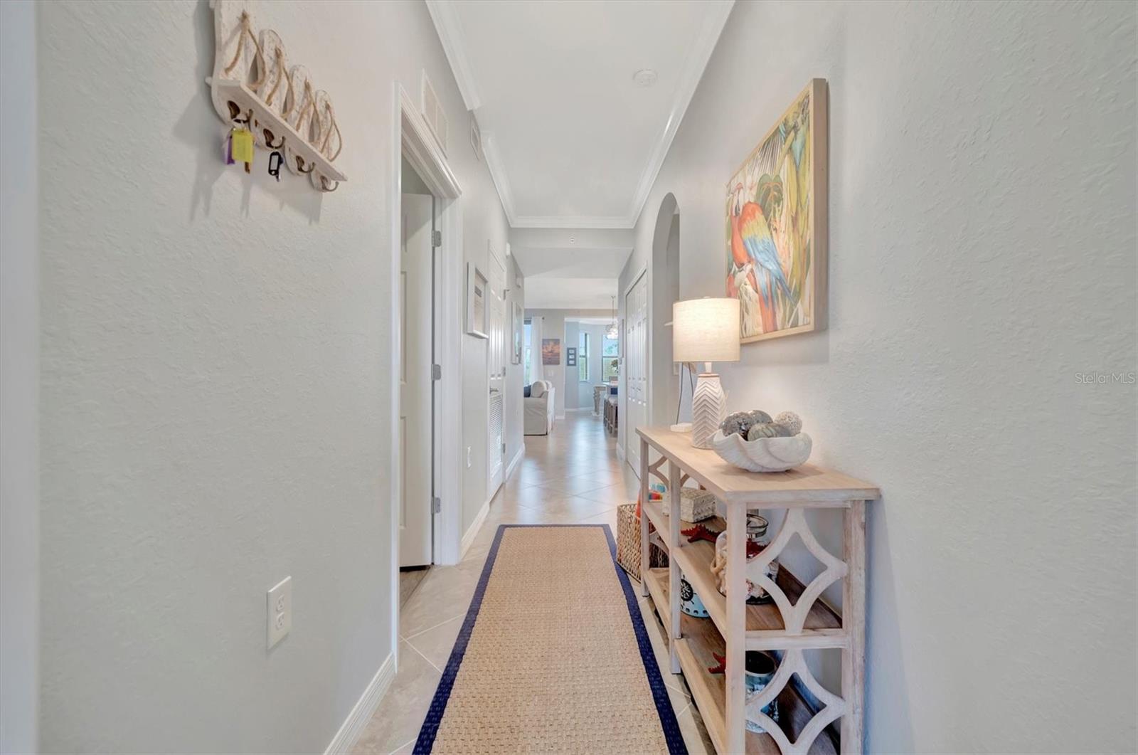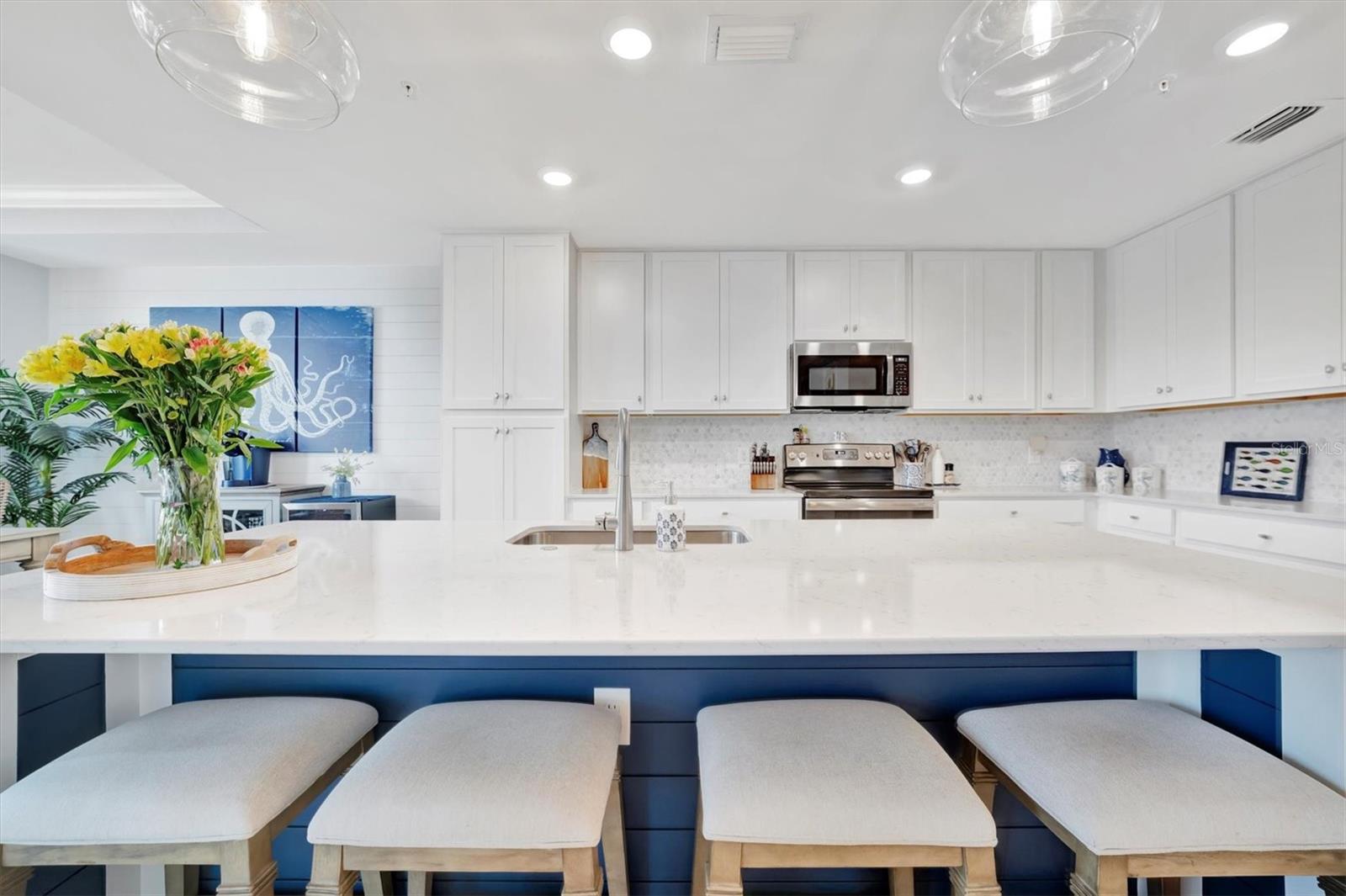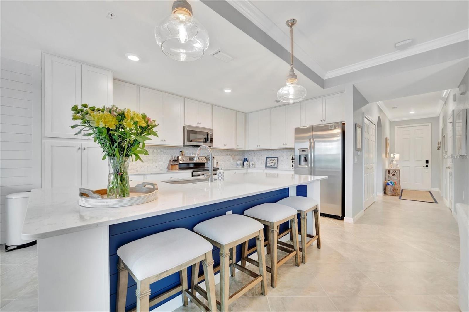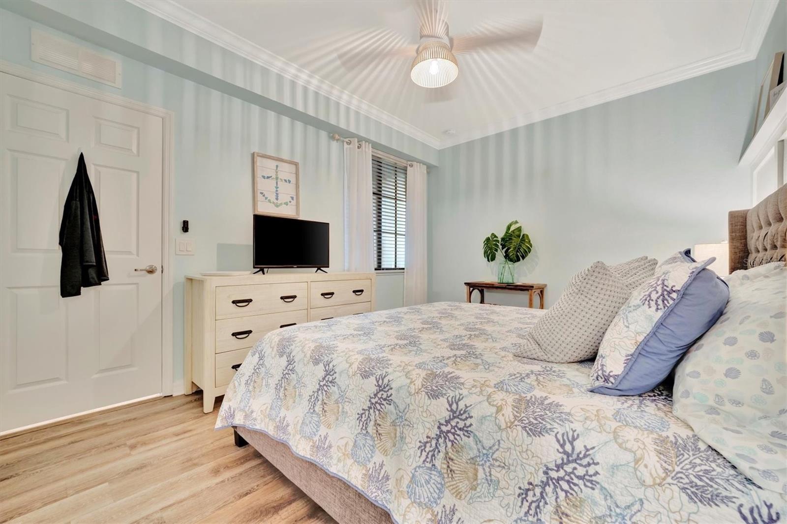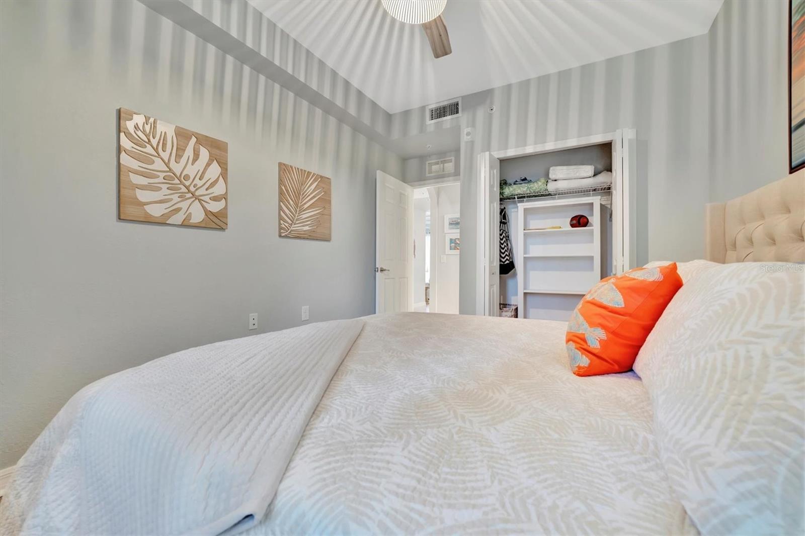 Welcome to paradise! Live in luxury at Lakewood National Golf Club, where residents enjoy membership to the 36-hole Arnold Palmer designed golf community. One of the most beautiful and upgraded units in the community, this custom first floor turnkey home offers a front row seat to the expansive views of hole #16 on the Piper Course. This 2 bedroom/2 bathroom, Birkdale Model features many stylish upgrades including beautiful Board and Batten accented walls, accented living room ceiling, luxury vinyl flooring throughout, custom cupboards and closets, open shelving in living room, upgraded fans in all bedrooms including the lanai, a stunning chandelier, as well as custom shiplap accenting in the living and dining rooms. The kitchen boasts a new full sink and faucet, artfully accented backsplash, beverage cooler, as well as new pendant lighting. The primary suite includes 2 walk-in closets, an en suite bath with a spacious walk-in shower, and granite vanity. This home comes with an assigned covered parking spot and custom shelving in the storage closet for your convenience. With one of the better water views in the community, you will experience wildlife and golf up close and personal from the comfort of your screened-in lanai that is completely sealed, so no visits from geckos or other critters. The brand-new A/C compressor will leave you comfortable, cool and worry free for years to come. Membership boasts access to 36 holes of golf, 24-hour gated security with nightly patrol, a state-of-the-art fitness center with 24-hour access, an onsite fitness director, a TPI certified personal trainer, and a variety of group fitness classes to choose from, saunas in the men’s and women’s locker rooms, 8 lighted Har-Tru tennis courts, 4 pickleball courts, 2 Har-Tru bocce courts, full-service salon/spa, resort-style pool with waterfall features, a spa, and a lap pool. Enjoy dining at the community's 2 restaurants - the poolside Tiki Bar & Grill, and the full service on-site dining experience at Deke’s Grill & Palmer Room located inside the newly finished clubhouse. You will find everything you need within this beautiful gated community.