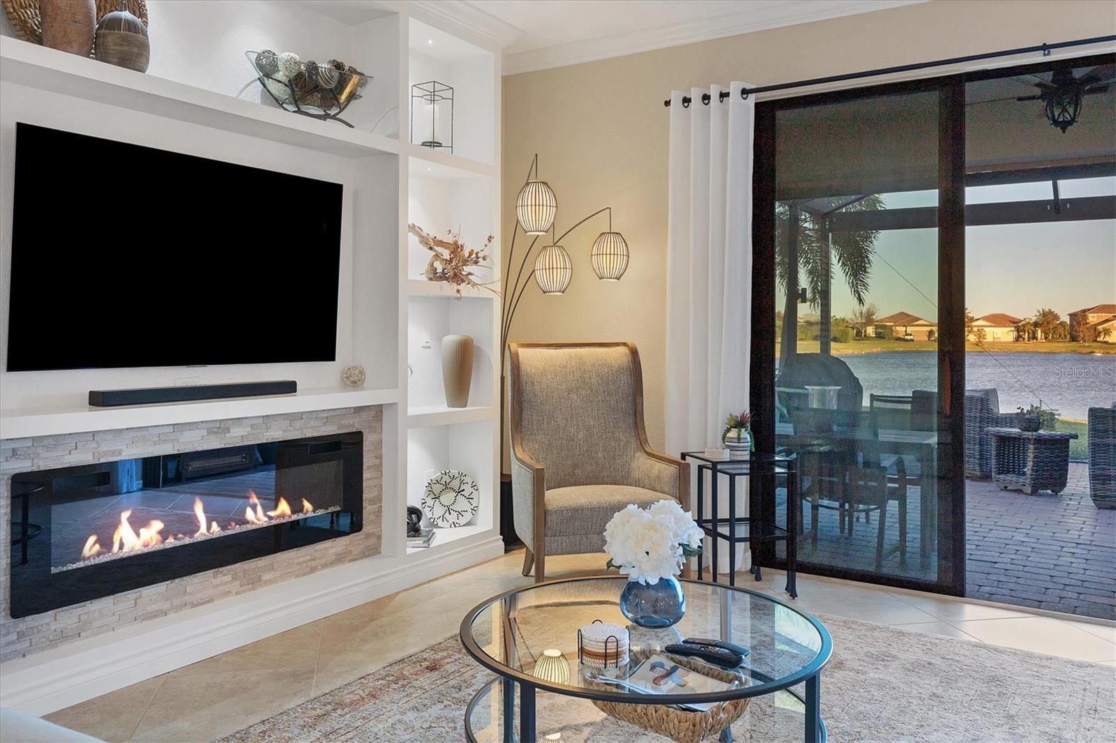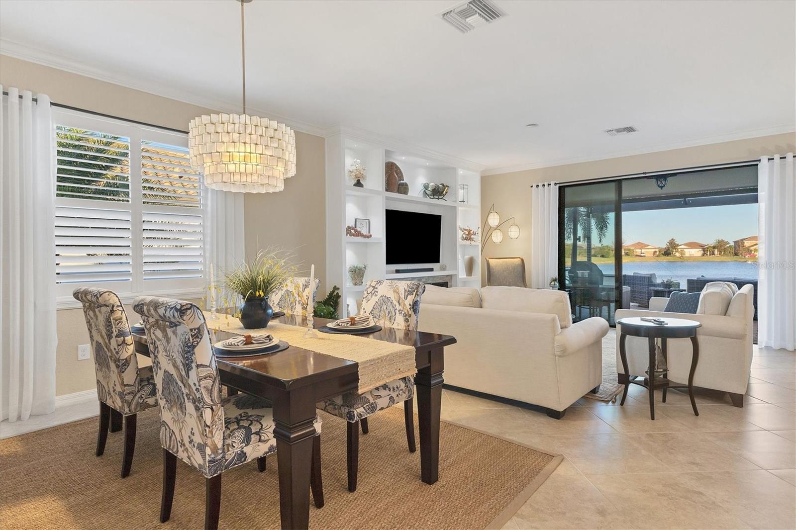 Welcome to The Sanctuary at River Strand Golf & Country Club, where resort-style living meets Florida elegance! Located on one of the best lots in the community featuring a breathtaking lake views, this stunning 4-bedroom, 3-bathroom Trevi model home offers a thoughtfully designed open floor plan, perfect for entertaining and everyday living. The heart of the home is a central living space that combines the kitchen, dining, and great room, creating a warm and inviting environment. The kitchen boasts quartz counters, upgraded appliances, and a spacious island, while each bedroom features unique accent walls for an added touch of style. The master retreat offers a custom-designed closet and an ensuite bath with dual vanities, quartz counters, and a walk-in shower. Step outside to the enlarged lanai, complete with Clearview screening, accent lighting, and reinforced hurricane screens, where you can relax and soak in the magnificent lake views. The beautifully landscaped exterior, Wi-Fi-enabled landscape lighting, and expanded driveway enhance the home’s curb appeal. This home is packed with upgrades, including plantation shutters, custom closet organizers, wainscoting, updated light fixtures, and a built-in wall unit in the great room. With a maintenance-free lifestyle and access to River Strand’s exceptional amenities, you’ll feel like you’re on vacation every day. Your social membership includes access to resort-style pools, a resistance pool, a clubhouse with fine and casual dining, a poolside tiki bar, and more. Enjoy 9 Har-Tru tennis courts, 8 pickleball courts, fitness centers, and a variety of social events and clubs. River Strand also offers a pay-to-play 27-hole Arthur Hills golf course and optional membership to the recently updated private Heritage Harbour Golf Course. Conveniently located near the world-renowned beaches of Anna Maria Island and Siesta Key, Downtown Sarasota, Lakewood Ranch, shopping, dining, and major airports. HOA fees include 24-hour security, lawn maintenance, irrigation water, cable, and internet. This home offers the perfect combination of luxury living and an active Florida lifestyle. Schedule your private showing today and experience all that River Strand Golf & Country Club has to offer!
