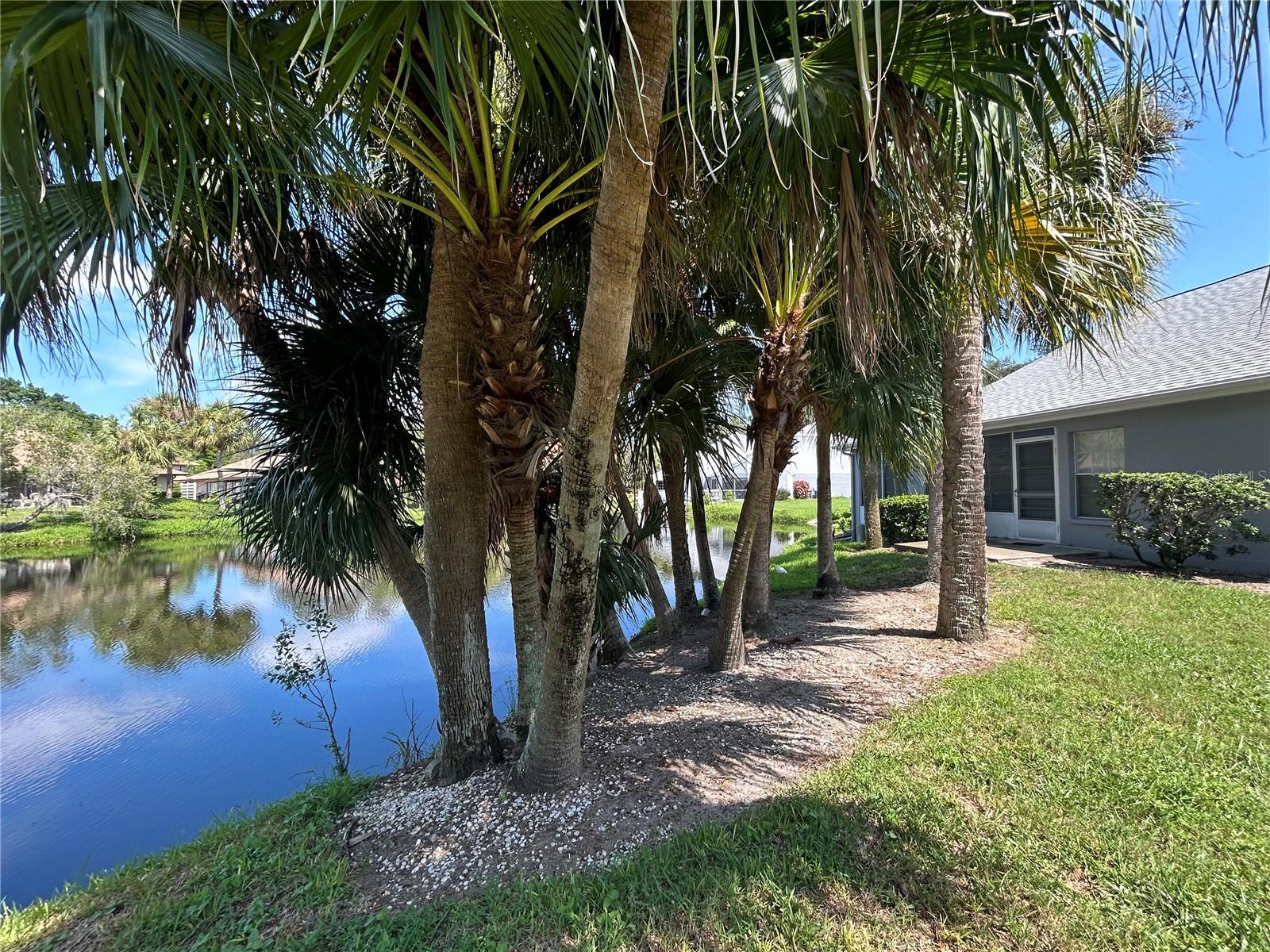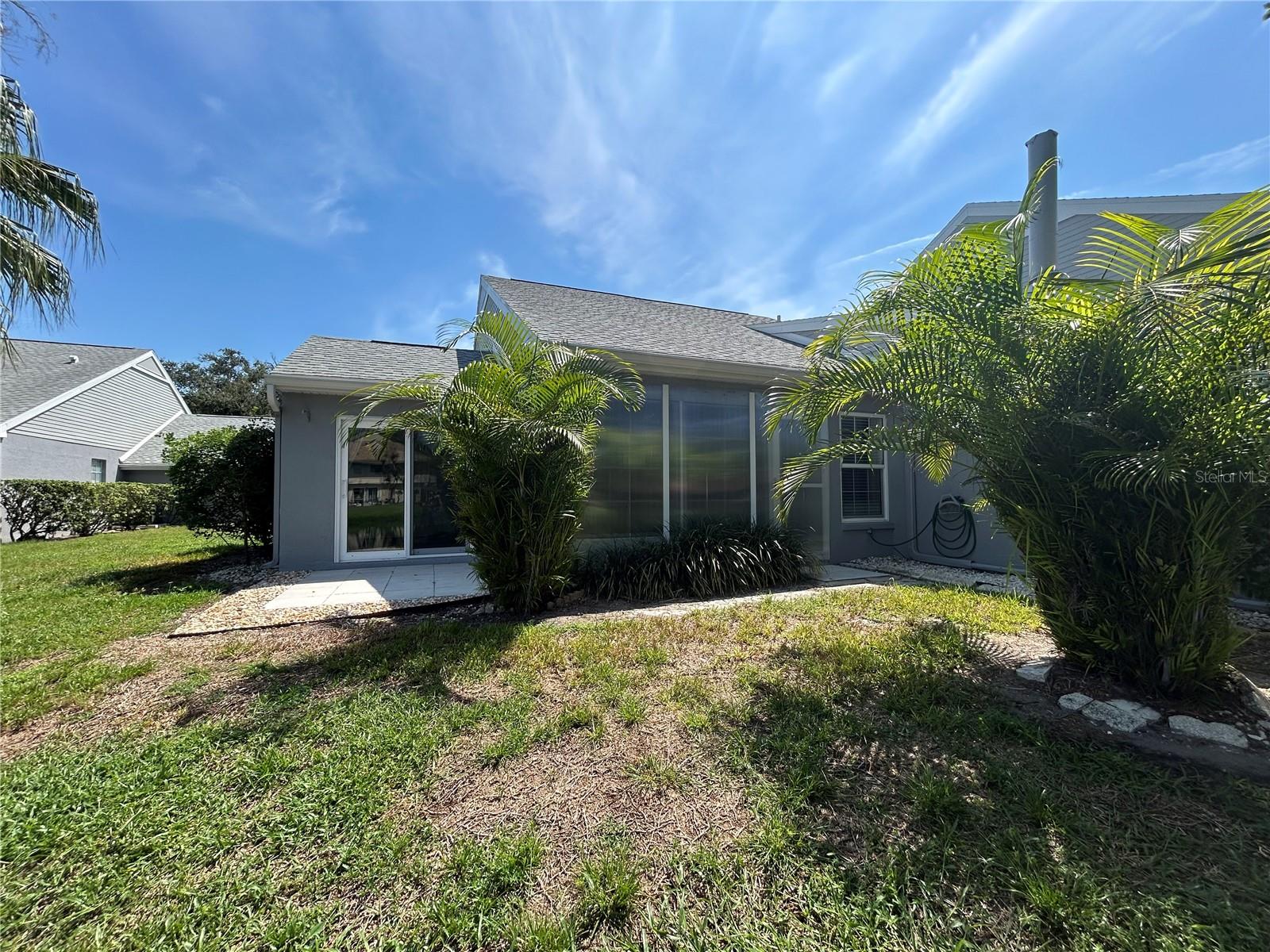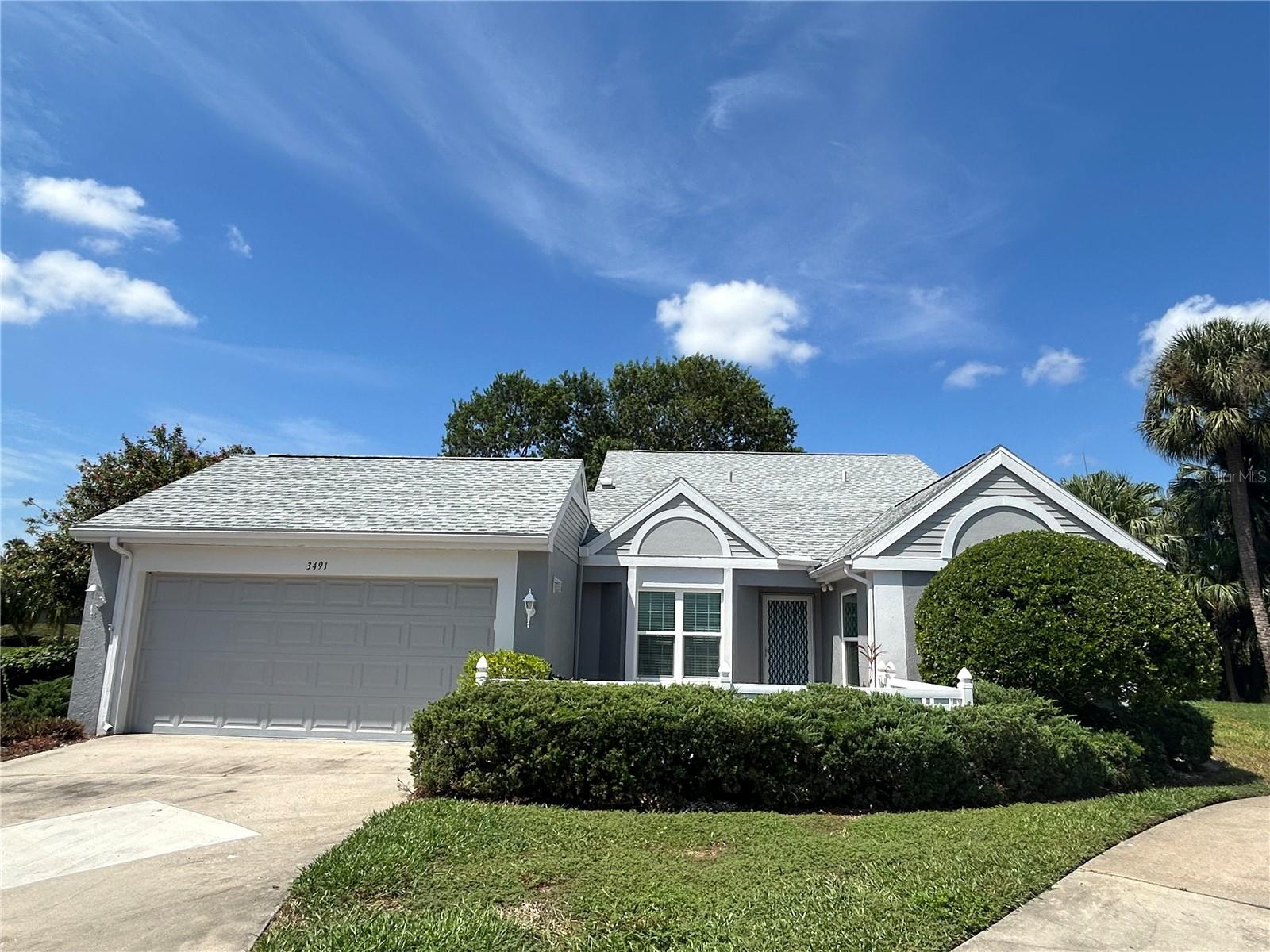 Lakefront condo in Sounthwinds at Five Lakes! This spacious villa gives you the feeling of a free standing home with two car garage even though a shared wall with neighbor, no one living above. Split bedroom floor plan layout with huge great room, vaulted ceiling with recessed lighting in living and dining area of this spacious 2 bedroom, 2 bath +den and Florida room. Lots of natural light. Upgraded eat-in kitchen cabinets, counter tops (2022) and stainless steel appliances. Master suite complete with walk-in closet, en suite with upgraded cabinet/vanity and counter top, dual sinks and shower. Bonus room off of living room with pocket doors for privacy and could easily be used as an office/den or for guest to sleep. Rear papered patio with lake view and papered front courtyard. AC (2022). New wind rated garage door 8/2024. PGT hurricane windows throughout villa with exception of sliders at Florida room which has removable shutters. You are allowed 1 pet 20# or less and annual rental allowed. Enjoy the community pool, tennis courts and clubhouse. Gulf beaches are 15 minutes away and minutes to restaurants, shopping, public transportation.