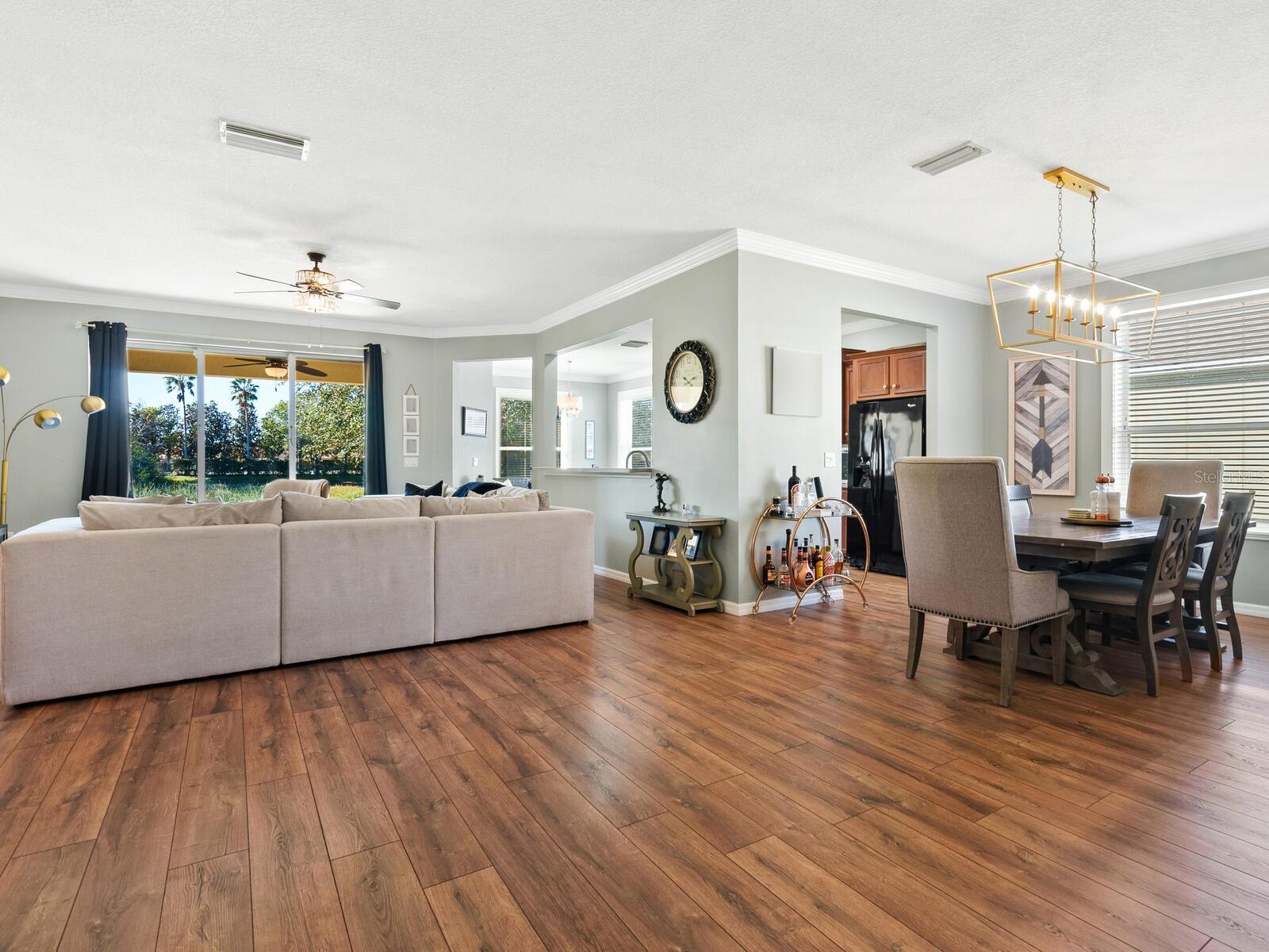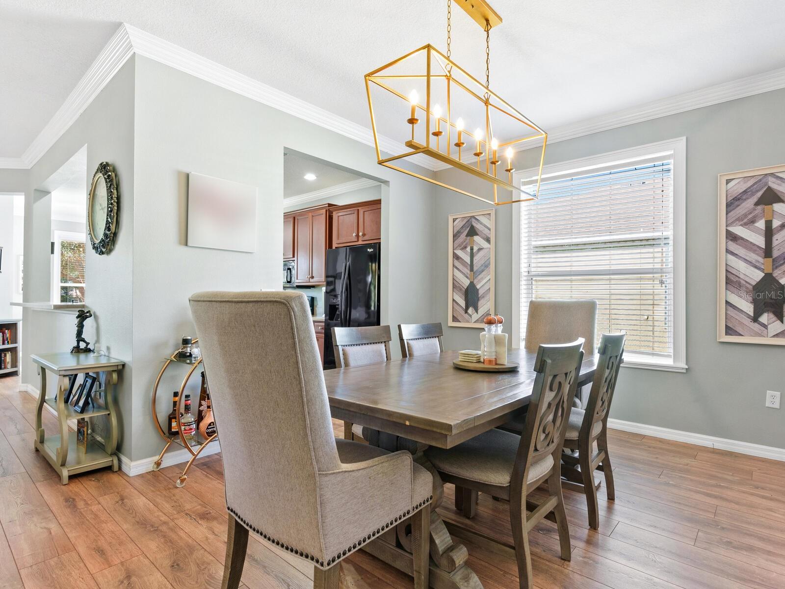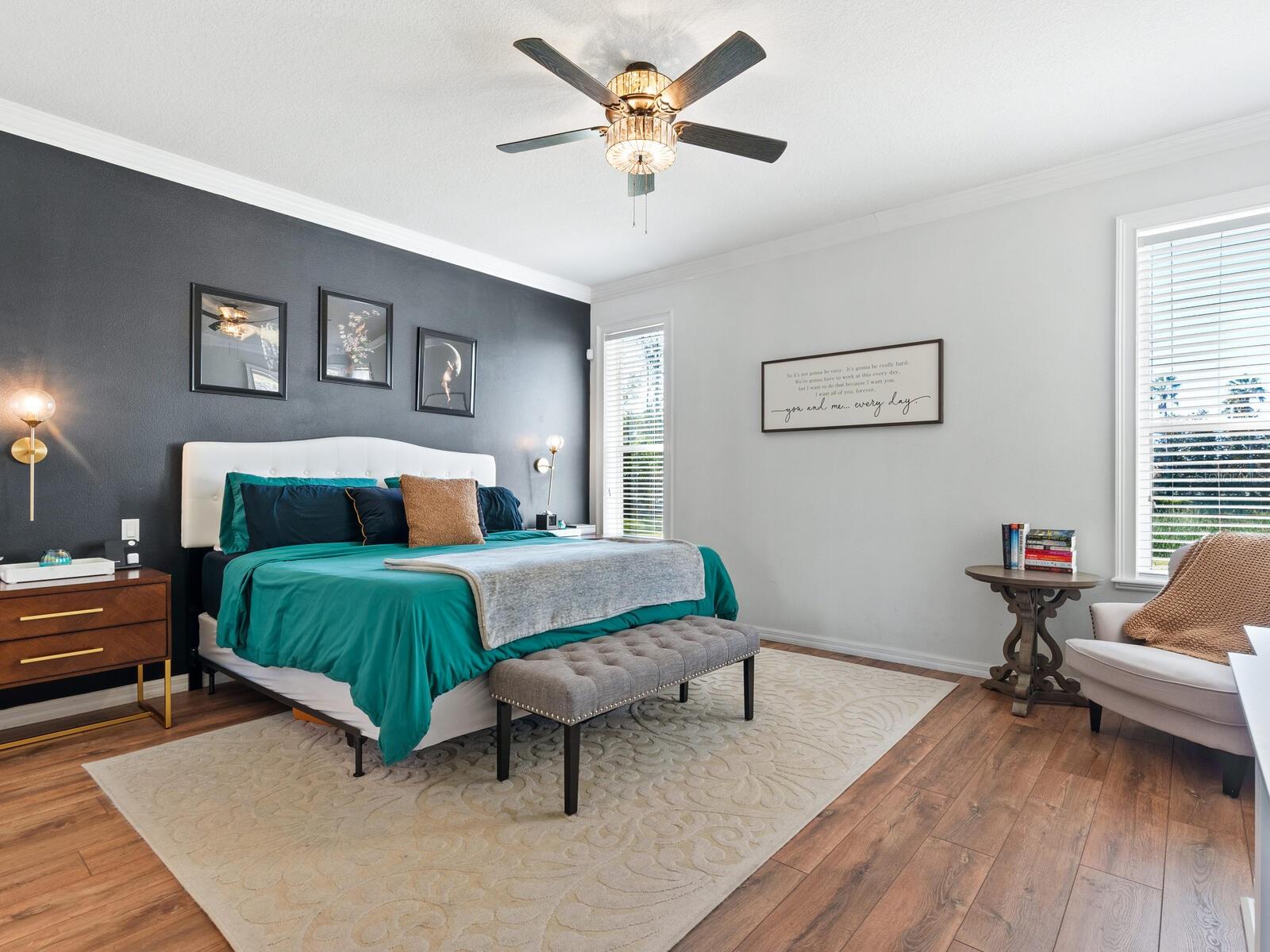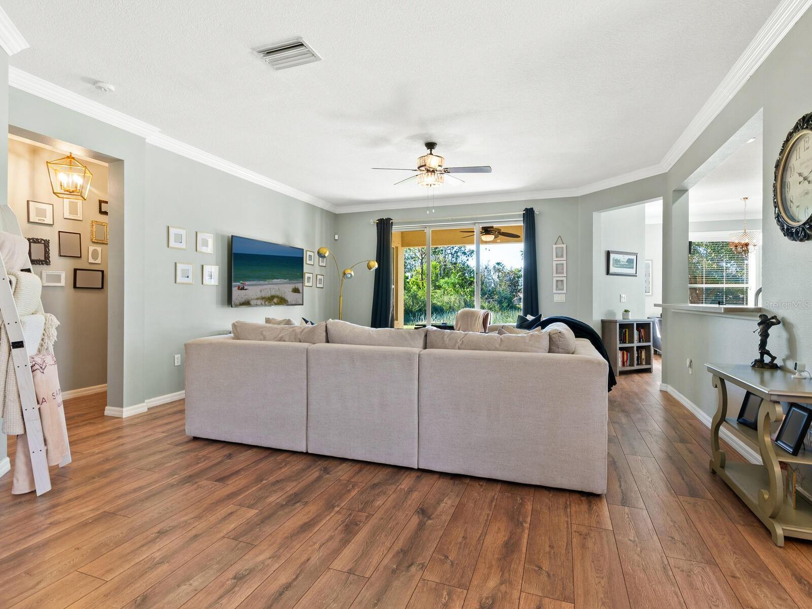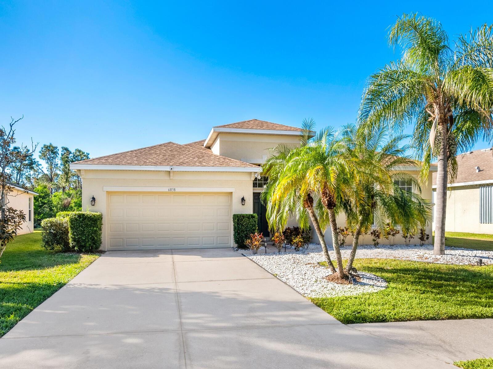 Located near the heart of Lakewood Ranch, this sought-after home in The Reserve at Crossing Creek is thoughtfully crafted for effortless living. Boasting an open and inviting split-floor plan, the residence encompasses 2,052 sq. ft. with 3 spacious bedrooms and 2 well-appointed bathrooms, offering a perfect blend of comfort and style. A true gem, this casually elegant home combines comfort, convenience and livability. A lovely pond view in back and no neighboring house views in front provide added privacy. In a quiet cul-de-sac setting, sidewalks and street lights give the neighborhood a welcoming feel. Enter through a gallery-style foyer with a transom window and arched doorway, where high ceilings enhance the great room and formal dining room. The adjacent kitchen offers a sit-down barstool counter area, Corian counters, European style wood cabinetry, and a pantry. In the extended kitchen is a sunny breakfast café with glass sliders opening to a covered lanai, perfect for relaxing and enjoying incredible weather year-round. Separated from the other bedrooms, the secluded primary suite is wonderful with 2 roomy walk-in closets, a generous glass shower, dual sink vanity and garden tub. Other highlights are gorgeous hybird floors throughout, a laundry room, a 2-car garage with epoxy finished floor, a newer shingle roof in 2021, hurricane shutters, custom trim window molding, recessed can lighting, crown molding, blinds, ceiling fans, and new fixtures. Just a mile from your front door is Creekwood Park with one of the largest dog parks in the county, an expansive grassy area, picnic facilities, a gazebo and plenty of nature trails. This home is ideally located near several golf courses, the UTC Mall, and I-75, offering convenience for shopping, commuting, and recreation. Nearby amenities include Creekwood Crossing Shopping Center, the revitalized downtown Bradenton area, and the esteemed IMG Sports Academy. The property is also in close proximity to three major hospitals and airports, including SRQ and Tampa International Airport, ensuring accessibility for both local and out-of-town needs. For sports enthusiasts, there are numerous golf, tennis, and pickleball club options nearby. Just a short drive away, you’ll find a variety of recreational attractions, arts and cultural venues, and the stunning white-sand beaches that line Florida’s beautiful coast. Built in 2008 by Centex Homes, the company has been dedicated to quality in home building for over 70 years and strives to exceed customer expectations each and every time. Immerse yourself in a beautifully crafted treasure meant to be enjoyed for years to come.