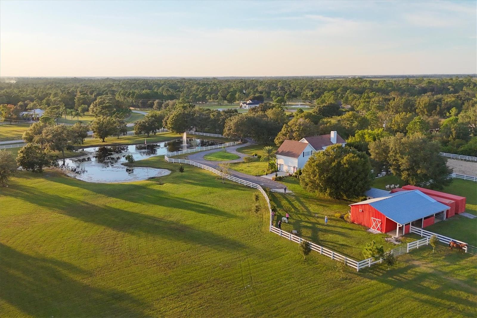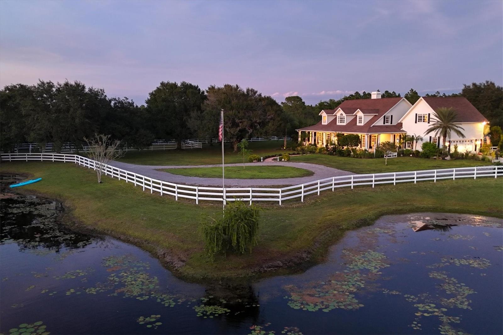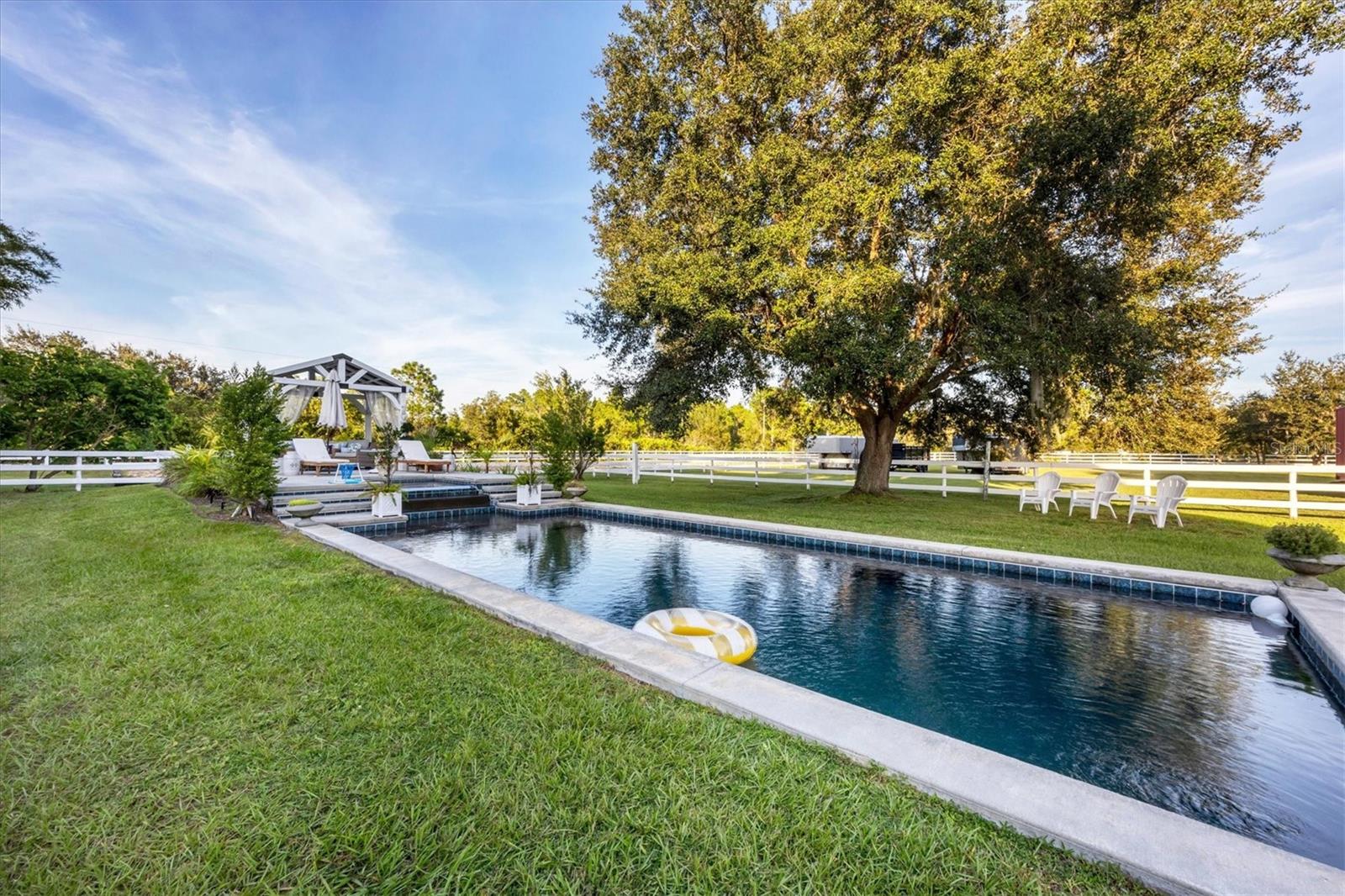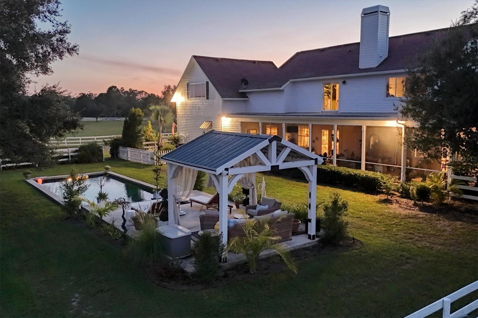Through an elegant gated entrance and beneath the sprawling canopy of century-old oak trees lining the driveway, you'll discover the epitome of charm. A meticulously renovated farmhouse on a picturesque 10-acre fenced ranch. Approach the wrap-around porch adorned with Chicago brick and bespoke columns, inviting you into the freshly painted interior. Revel in the timeless allure of hardwood floors, intricate custom moldings and a captivating wood-burning fireplace, showcasing meticulous architectural craftsmanship. The open layout seamlessly connects the living spaces, revealing a state-of-the-art kitchen boasting a standalone commercial refrigerator and freezer, dual-range stove, exquisite wood cabinetry, and a remarkable butler pantry/coffee all complemented by quartz countertops. Additionally, a unique copper sink for vegetables and a convenient pot filler enhance the functionality of this culinary haven. Venture into the newly expanded primary suite, featuring an expansive walk-in closet, a comforting fireplace and a main bath adorned with marble countertops, a walk-in shower and making it an idyllic retreat. Ascend the stairs to discover three additional bedrooms, two recently renovated baths, and a generously proportioned bonus room with a dedicated bar area. Outside, a resort-style lagoon heated and cooled pool with a black bottom and all new pool equiptment while a charming gazebo beckons relaxation. The property also includes a separate four-stall barn with a climate-controlled tack room, a cutting-edge chicken coop with concrete support, and a professional-grade 20-meter by 60-meter dressage area, adjacent to extensive riding trails spanning 25 miles throughout the community. Noteworthy upgrades abound, including refurbished windows, a roof installed in 2016, a new air-conditioning system in 2022, a freshly aerated lake with 3,500 stocked fish such as bass, bluegill and carp in 2023, replumbing of the entire house in 2021, a whole-house reverse osmosis system, brand new septic and drainage field, an additional air-conditioned storage unit and a newly drilled deep well. Also featured in your home is a state-of-the-art security system equipped with 14 cameras strategically placed around your property, glass break detectors, motion sensors, carbon monoxide detectors and secure locks all controllable from your smartphone, no matter where you are in the world. This exceptional equestrian property, in Panther Ridge, stands as a testament to unparalleled luxury and functionality.