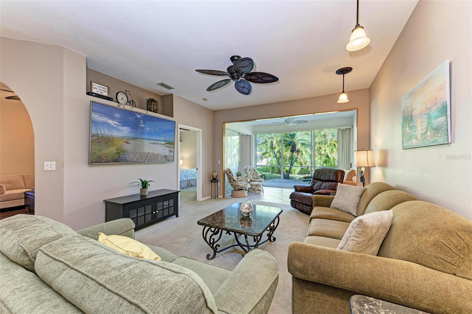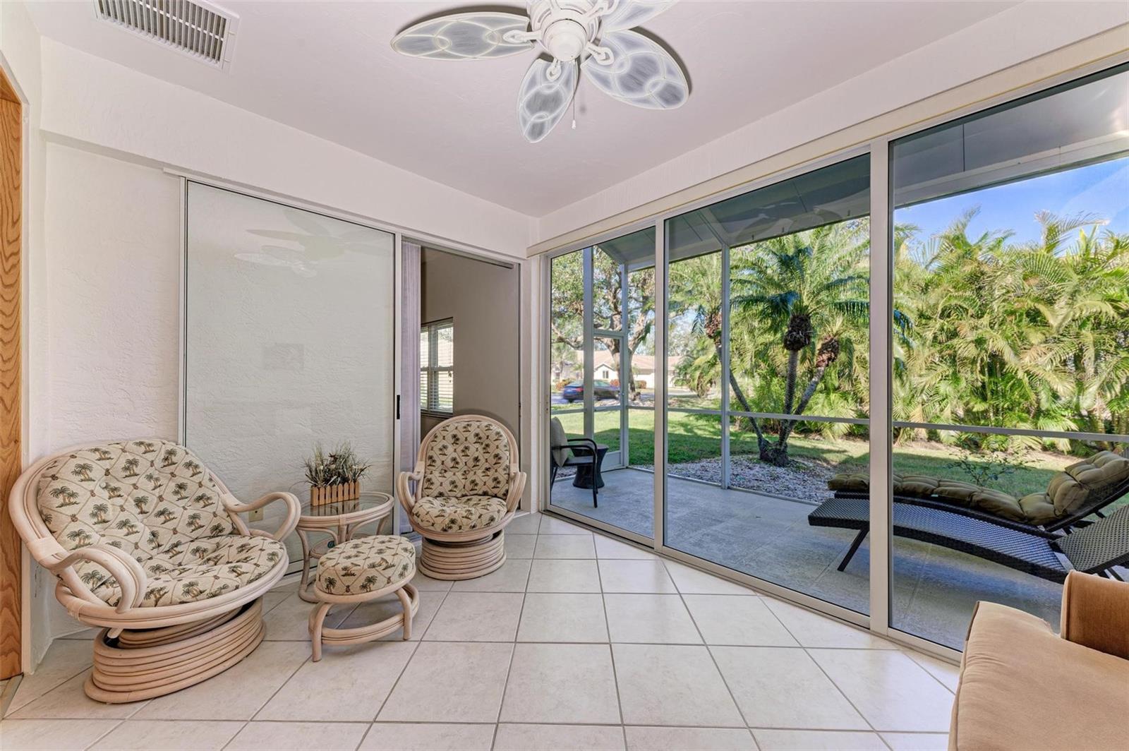 A must-see! Gorgeous TURNKEY FURNISHED villa with exquisite taste and a rare excellence in design in the maintenance-free community of Twelve Oaks II of Tara. Countless amenities and the ideal location mean this villa is the Florida lifestyle you have dreamed of finding. NEW ROOF just installed in March 2025. This move-in ready villa with a split floor plan provides 1,701 square feet of living space, two bedrooms, two baths and a two-car garage with shelving, a designated den/family room that could easily be transformed into a separate guest space, interior laundry room, Florida room, a screened lanai and includes a Class A golf membership. Tastefully designed and beautifully updated, you won’t have to do more than bring your clothes and toothbrush. All furniture and contents are included. When you first enter this home, you’ll be greeted by open living that welcomes you into the kitchen and main living space. This villa’s open floor plan and spacious living area means you’ll never miss out on the conversation. The large updated kitchen is outfitted with stainless steel appliances, Corian counters, solid wood cabinets and drawers for an abundance of storage space and a breakfast nook area to drink your morning coffee. The dining, living area and Florida room all flow together, providing open living with all modern comforts of home. Strong natural lighting floods the living area while giving a heightened sense of space and airy ambiance. Plush sofas and a smart TV set the stage for family entertainment. The spacious primary bedroom includes an en-suite bath with walk-in closet, dual sinks and Roman walk-in shower. Off the living space, you’ll find the guest bedroom, bath and extra living space, providing privacy for family and visitors. Additionally, you will also find a quaint office/bonus room that allows for privacy for business or fun hobbies. Step through the extra-large sliding glass doors to enjoy the cool breeze on your screened patio while being surrounded by beautiful tropical landscaping. Twelve Oaks is a pet-friendly community allowing one pet and has no age restrictions. The community offers a lifestyle to enjoy every day, including access to golf, pickleball, tennis, bocce ball, yoga, water aerobics, resort-style heated pools, spa, fitness center, steam room, clubhouse events, dining, beverages, and snack bar, and numerous social activities. Tara Golf & Country Club Class A membership allows you to play unlimited golf for a monthly membership fee of $526.56, plus a $60 monthly fee used toward a food minimum that will roll to the following month if not used. The condo fee is $1,200 quarterly and covers the exterior maintenance, community pool and grounds. Tara Master Association annual fee is $1,094.17, which includes Comcast high-speed internet and cable TV, HBO and DVR. Most convenient location for shopping, dining, Publix and banking you can access by golf cart. Public boat ramp close by Braden River, easy access to shopping, Interstate 75 and gulf beaches. Click on the 3D virtual tour link to virtually walk through the house. Make your appointment to view this amazing home today.