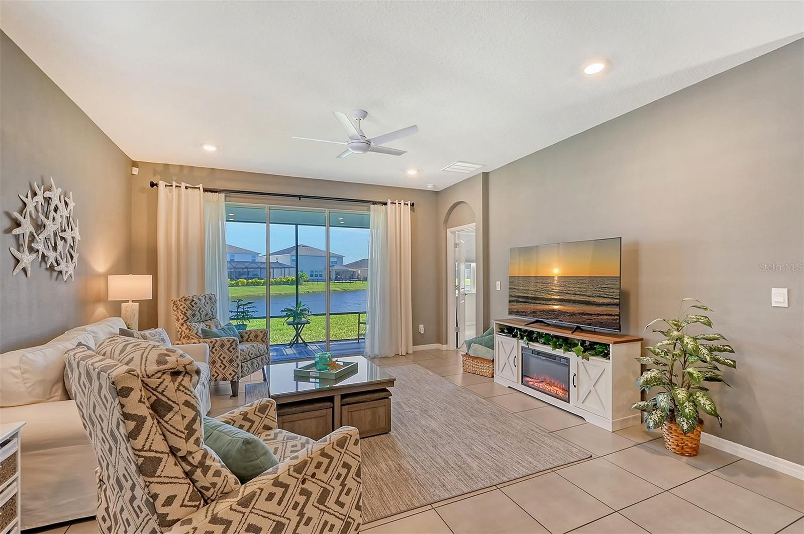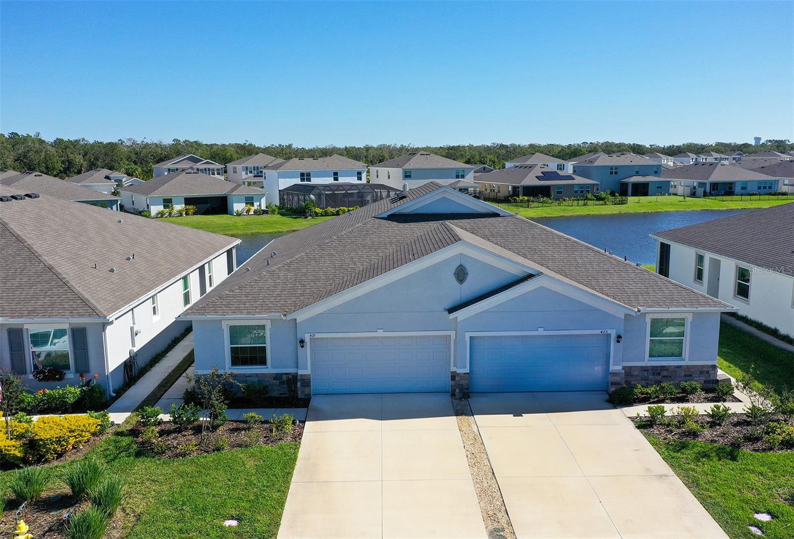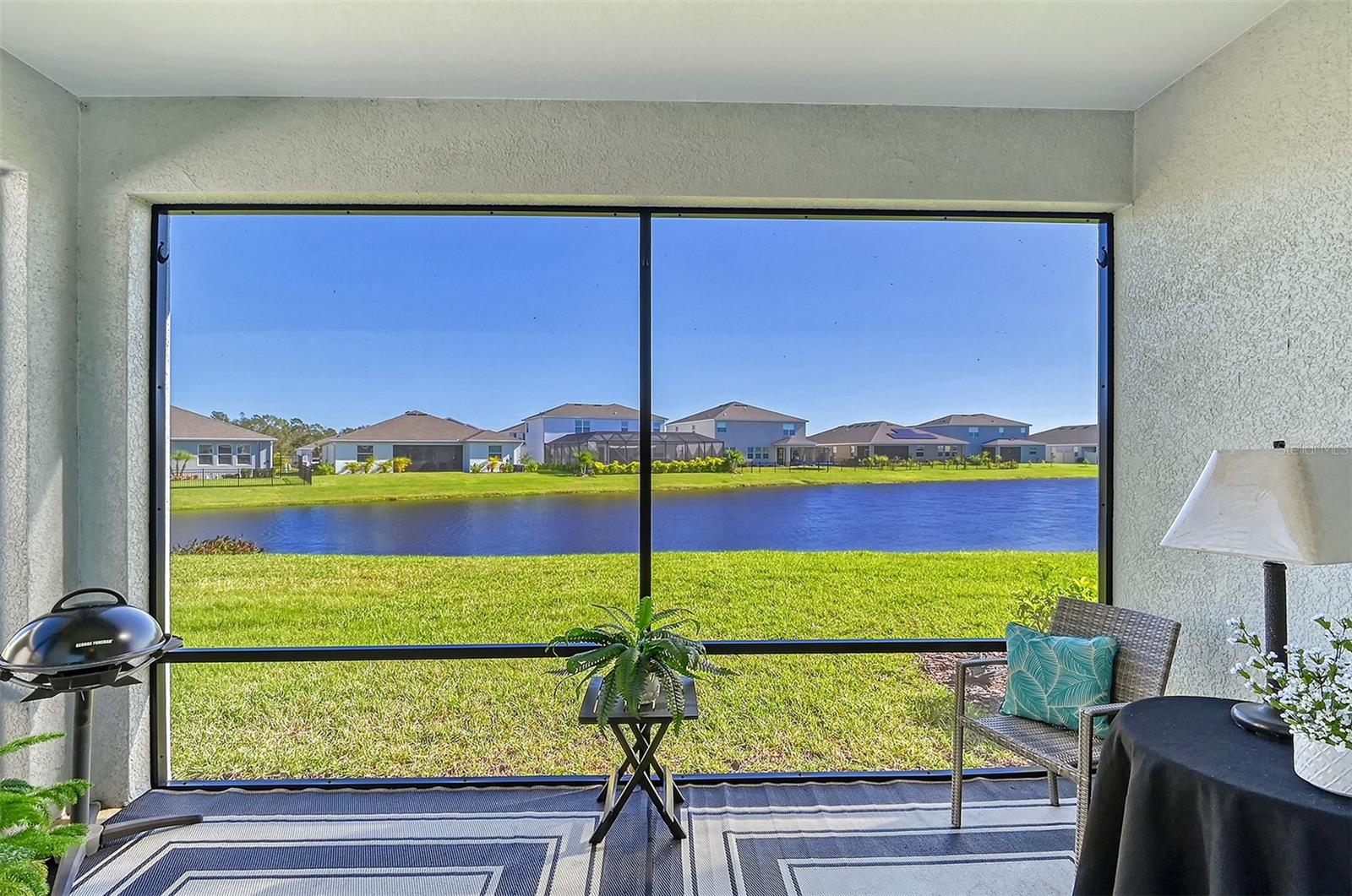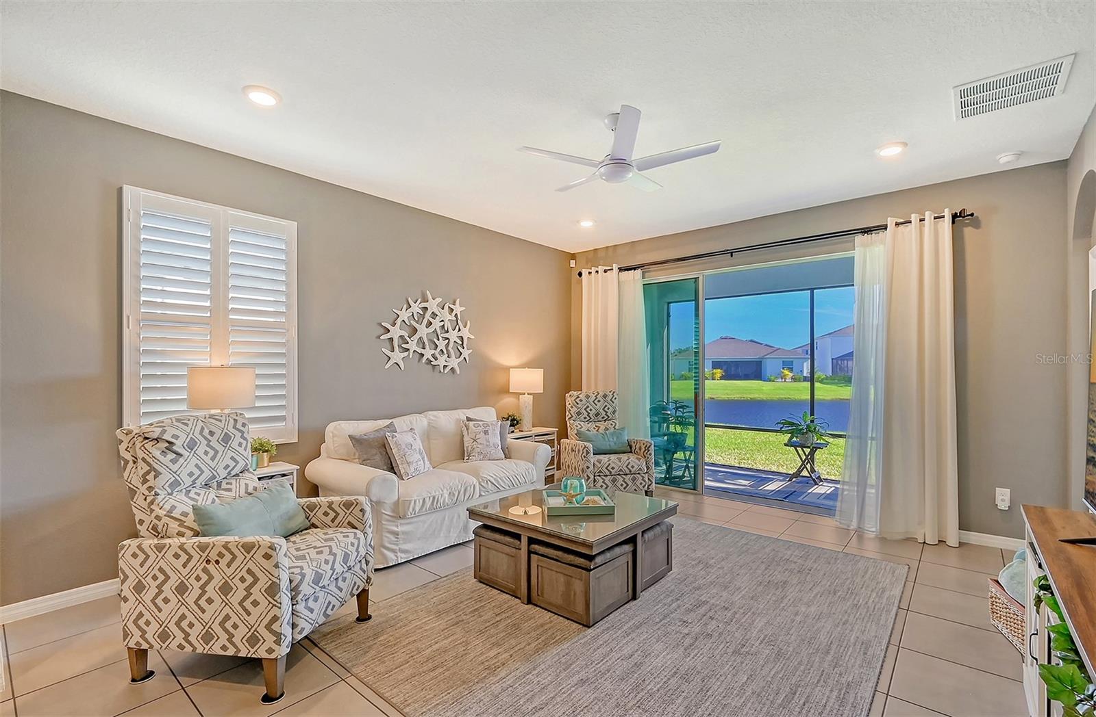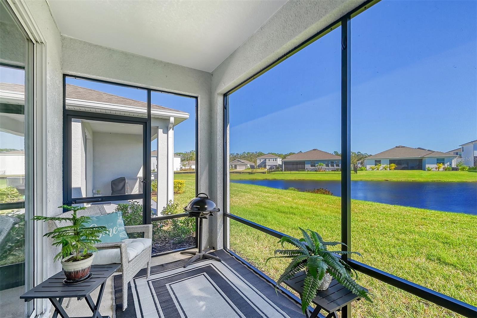 This beautifully detailed, waterfront villa is in the Coddington community, just north of Lakewood Ranch. Built in 2023, the villa offers three bedrooms, two full baths and approximately 1,565 square feet of living space. Some of the upgrades included in this home, features not found in newly constructed villas, are a mirror wall detail in the dining area, custom wall treatment in the primary suite, a screened-in lanai, epoxy flooring in the garage, a convection range with a double oven, plantation shutters and more. Smart home technology is also integrated throughout the home. As you enter, you are immediately captivated by the stunning water views, visible from the great room, screened lanai and primary suite. The lush nature preserve across the street can be viewed from the second bedroom. The living areas flow effortlessly, with large sliding doors that flood the home with natural light. The spacious open-concept floor plan and oversized kitchen make it easy to entertain guests. The chef’s kitchen features a large island and 36-inch designer shaker-style cabinetry in a neutral gray tone, complemented by granite countertops. A large stainless-steel, single-bowl drop-in sink with a chrome faucet and stainless steel appliances complete the modern look. The primary suite, just off the great room, includes a large picturesque window, a spacious walk-in closet, and an en-suite bath with gray-toned cabinetry, granite countertops and a walk-in tiled shower with a bench. Two additional bedrooms, one used as an office, offer ample space for guests. The villa also features a spacious secondary bath, a laundry closet and a two-car garage. You’ll also enjoy the community amenities, including a pool, cabana, flex lawn and playground. This community is ideally near many shopping centers and restaurants and is approximately 30 minutes from Florida’s beautiful Gulf Coast beaches. Furniture can also be purchased, so you can move in and enjoy this home in the new year.