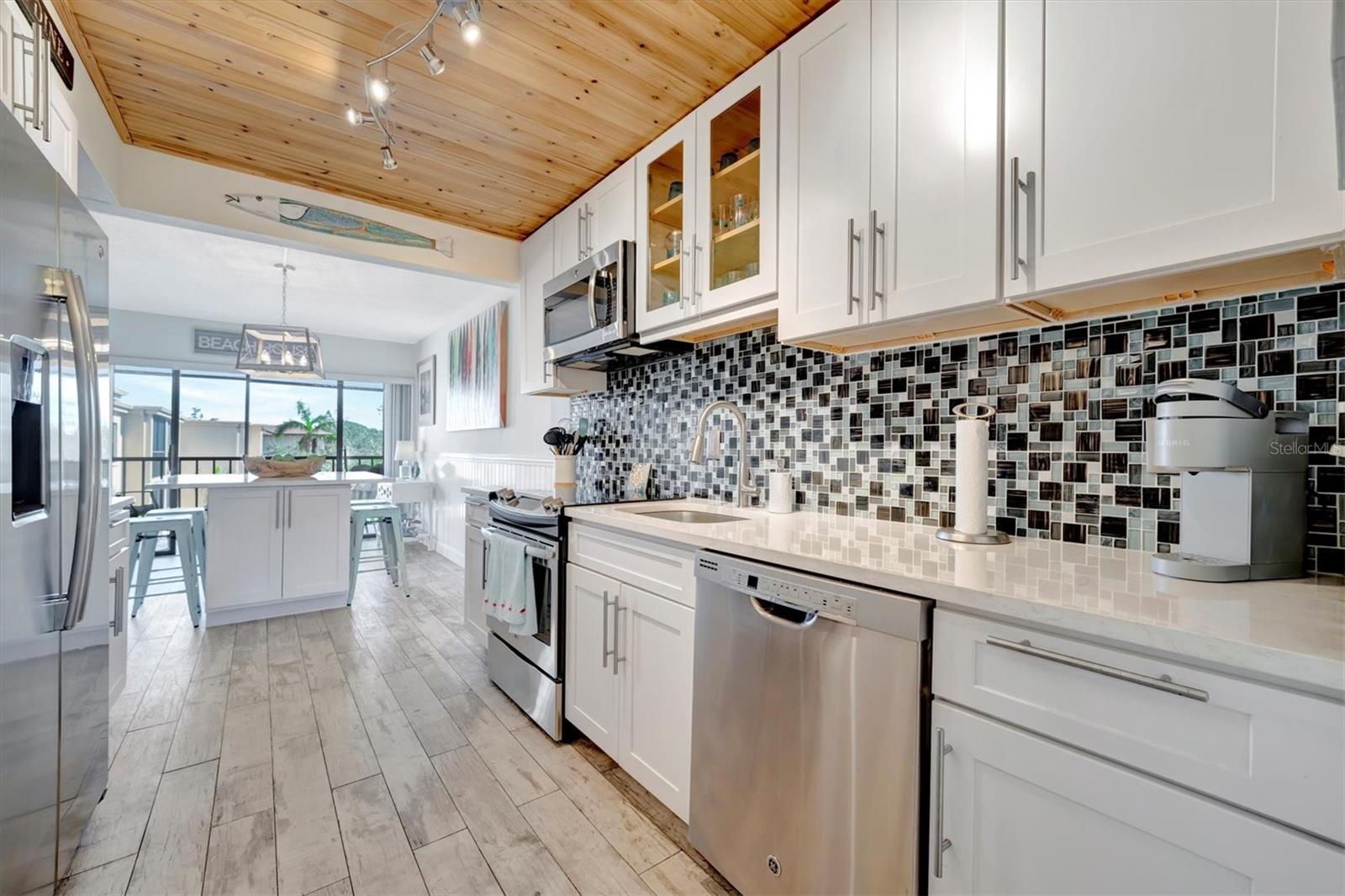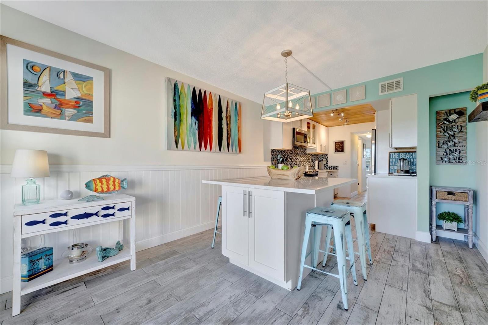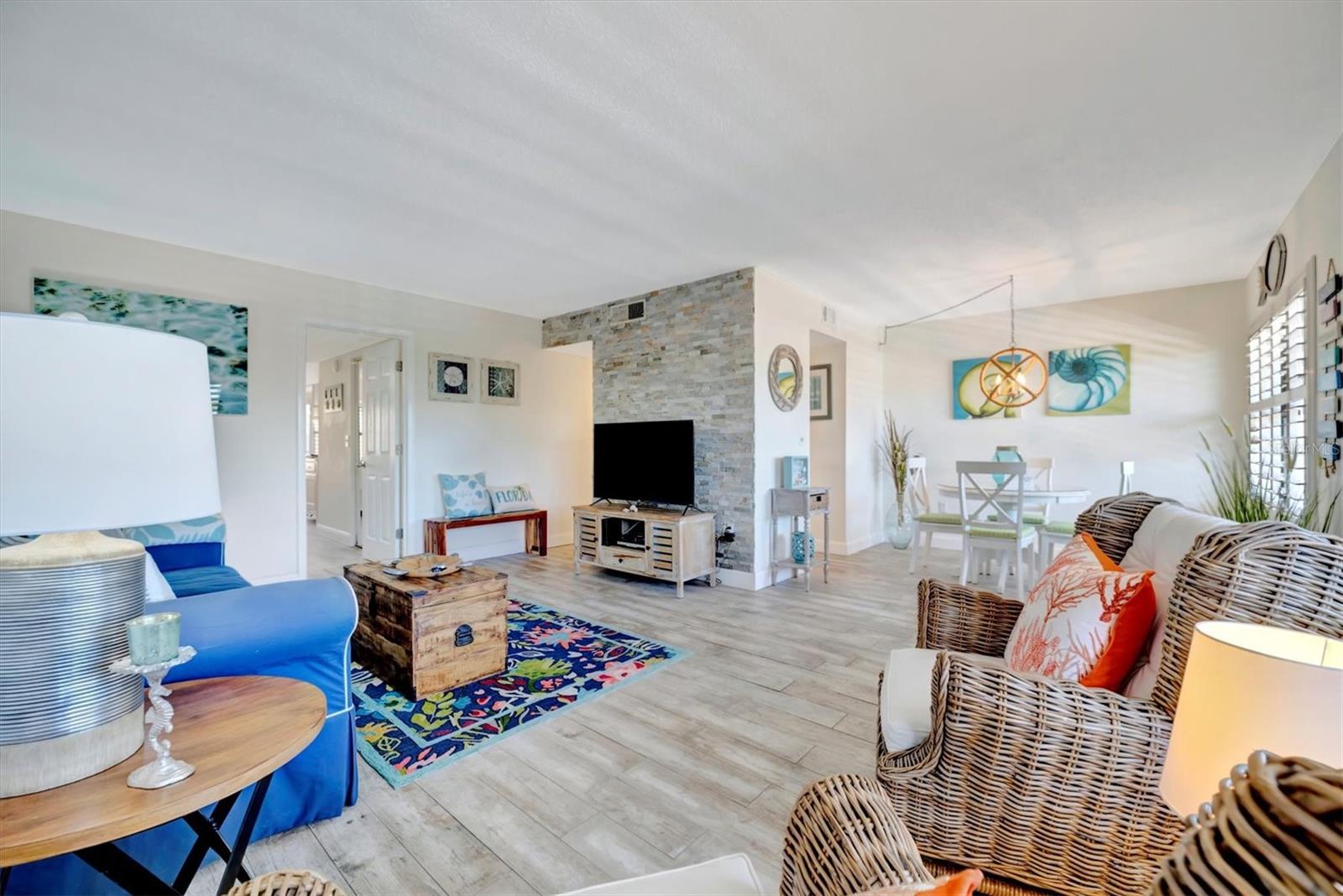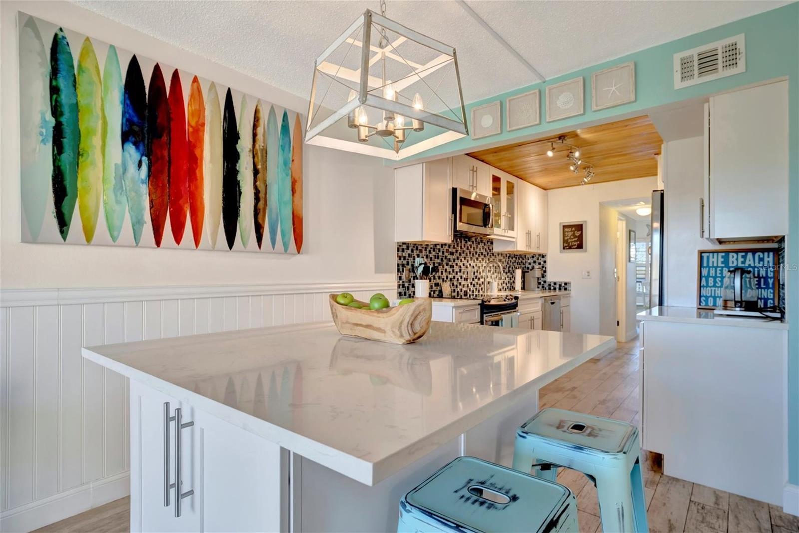 This beautifully renovated, turn-key furnished condo is a hidden oasis in the heart of Bradenton, with location as a standout feature. It offers easy access to Sarasota, Anna Maria Island, Gulf beaches, Bradenton’s keys, I-75, and downtown. This spacious 1-bedroom, 1.5-bath home, just under 1,000 square feet, is filled with high-end upgrades and comes completely furnished, including all Coastal décor, linens, and kitchenware—making it truly move-in ready. Quality tile plank flooring flows throughout, enhancing the clean, modern design. The extended kitchen is a showstopper, featuring an expansive quartz-topped island that blends style and function—perfect for meal prep, casual dining, or entertaining. Additional upgrades include a designer backsplash, soft-close drawers, raised soffits, and stainless steel appliances, offering both elegance and practicality. Stylish plantation shutters on the front and back windows, along with center-opening textured vertical blinds, add to the long list of extras. Upgraded lighting, outlets, and fans elevate the contemporary ambiance, while a front-door sliding screen allows for refreshing cross breezes. This top-floor unit with no neighbors above enjoys peaceful living with an abundance of natural light and serene water views, accompanied by the soothing sounds of a fountain. The lanai, finished with matching wood plank tile, overlooks lush landscaping, creating a peaceful retreat. Situated in Woodpark at DeSoto Square, a gated 55+ community, residents can enjoy amenities like a heated pool, spa, and scenic walking paths around the ponds. The building is pet-friendly and includes designated parking plus a storage space for beach gear. With its unbeatable location and tasteful Coastal-inspired design, this home is the ideal Florida getaway, close to Sarasota’s cultural offerings, Bradenton’s Riverwalk, and Tampa’s vibrant attractions.