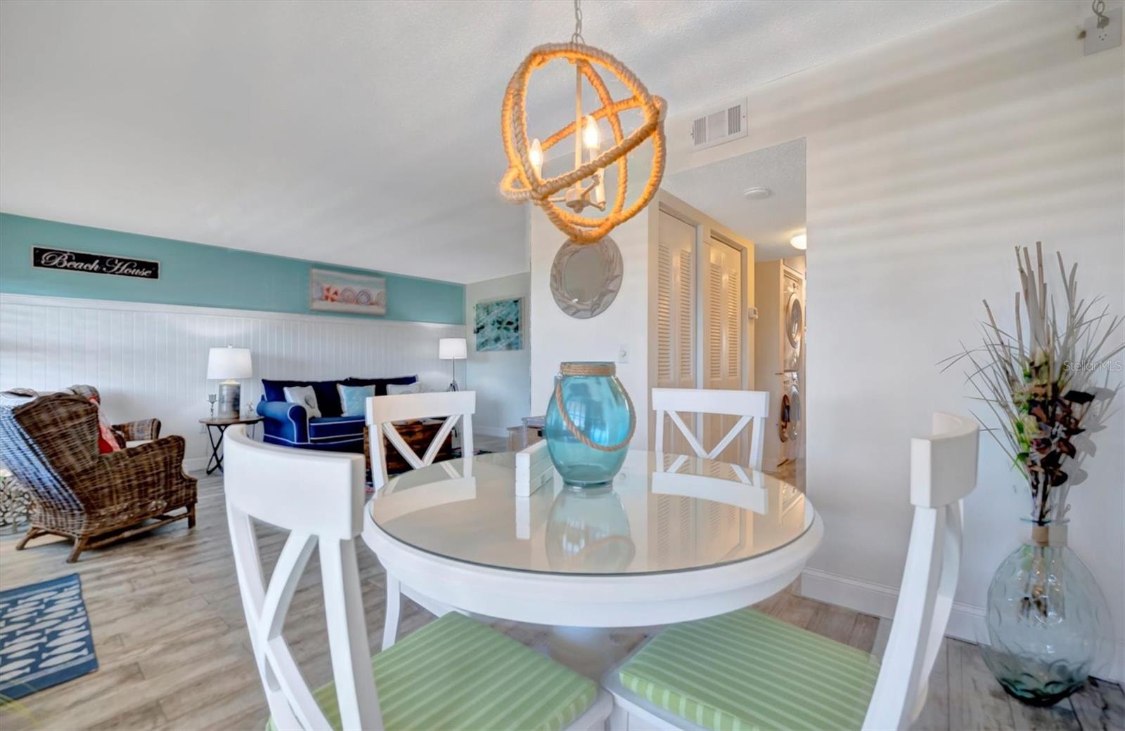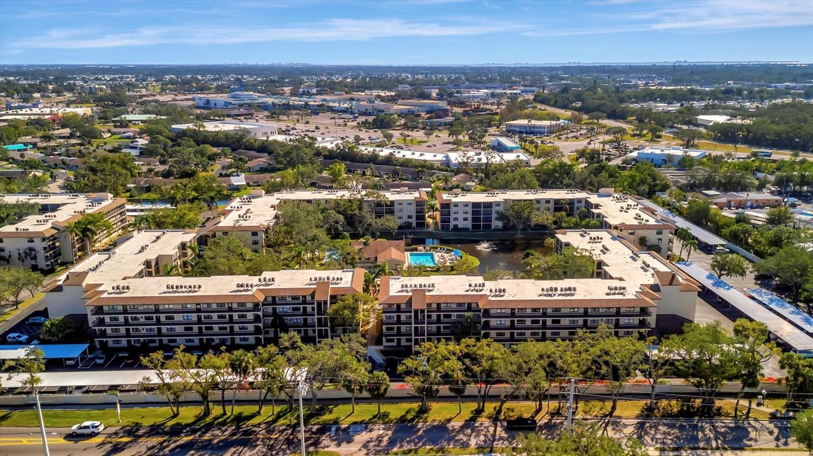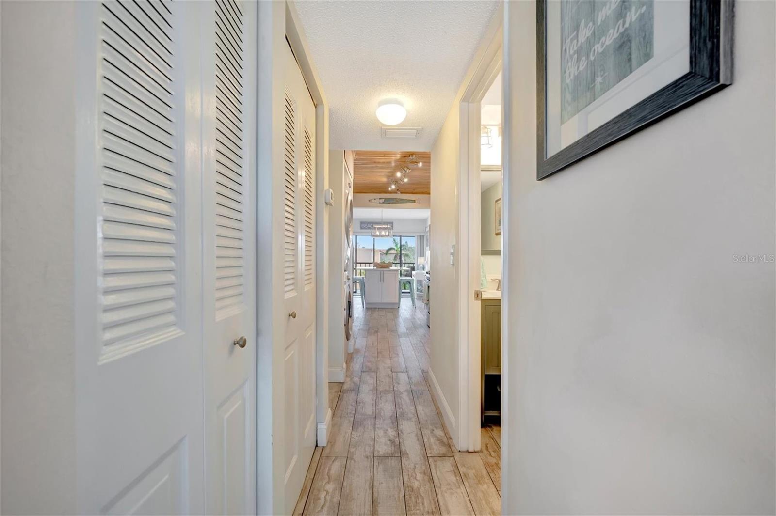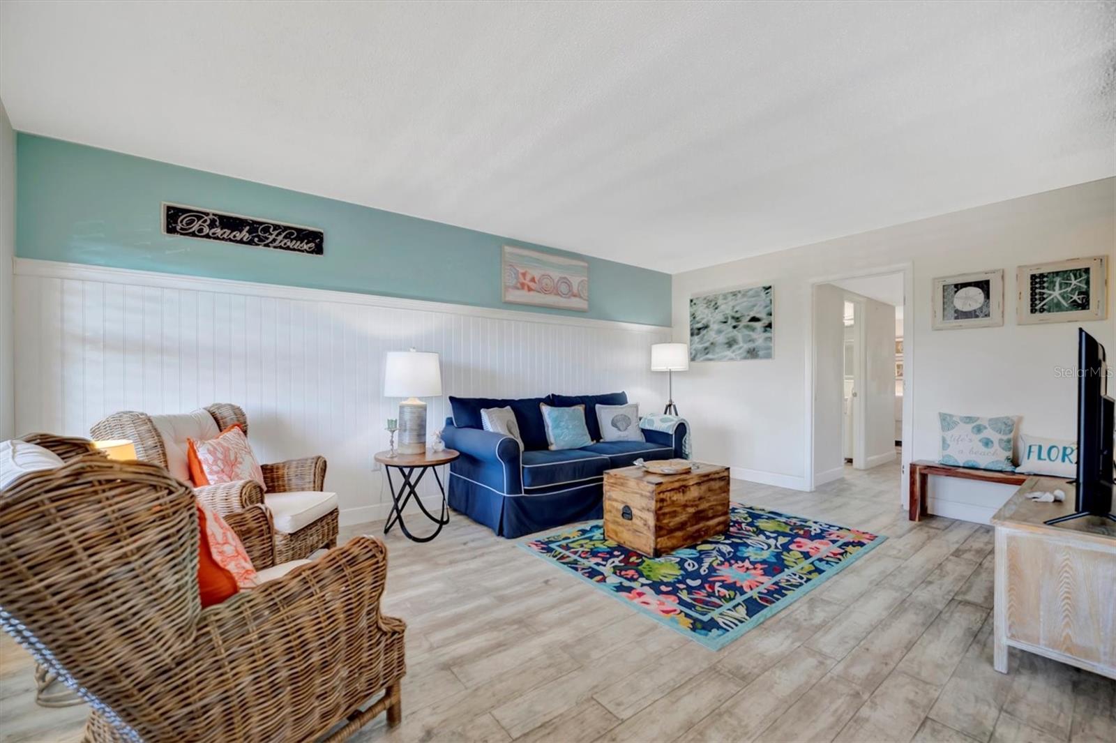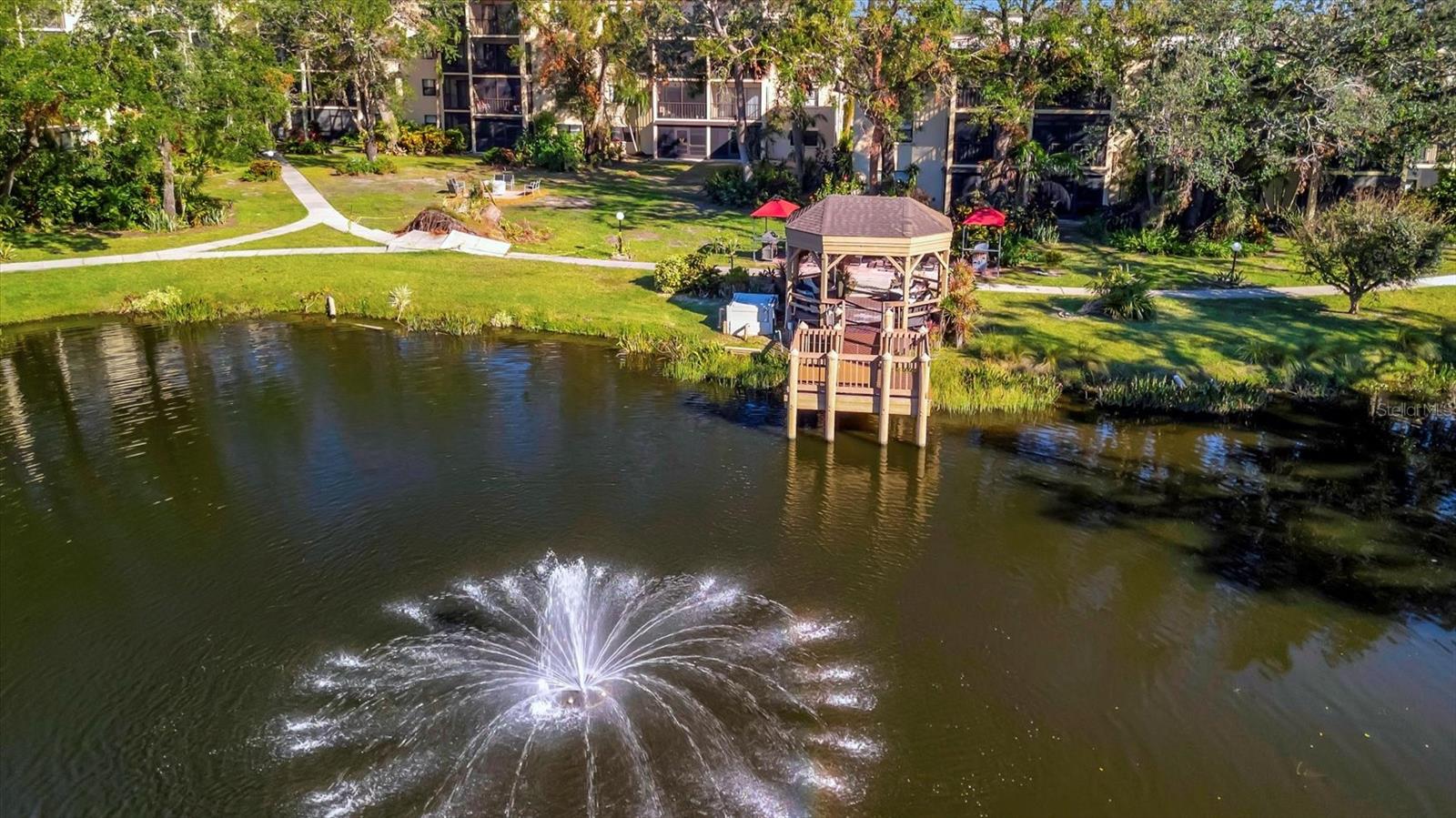 This beautifully renovated, turn-key furnished condo is a hidden oasis in the heart of Bradenton, with location as a standout feature. It offers easy access to Sarasota, Anna Maria Island, Gulf beaches, Bradenton’s keys, I-75, and downtown. This spacious 1-bedroom, 1.5-bath home, just under 1,000 square feet, is filled with high-end upgrades and comes completely furnished, including all Coastal décor, linens, and kitchenware—making it truly move-in ready. Quality tile plank flooring flows throughout, enhancing the clean, modern design. The extended kitchen is a showstopper, featuring an expansive quartz-topped island that blends style and function—perfect for meal prep, casual dining, or entertaining. Additional upgrades include a designer backsplash, soft-close drawers, raised soffits, and stainless steel appliances, offering both elegance and practicality. Stylish plantation shutters on the front and back windows, along with center-opening textured vertical blinds, add to the long list of extras. Upgraded lighting, outlets, and fans elevate the contemporary ambiance, while a front-door sliding screen allows for refreshing cross breezes. This top-floor unit with no neighbors above enjoys peaceful living with an abundance of natural light and serene water views, accompanied by the soothing sounds of a fountain. The lanai, finished with matching wood plank tile, overlooks lush landscaping, creating a peaceful retreat. Situated in Woodpark at DeSoto Square, a gated 55+ community, residents can enjoy amenities like a heated pool, spa, and scenic walking paths around the ponds. The building is pet-friendly and includes designated parking plus a storage space for beach gear. With its unbeatable location and tasteful Coastal-inspired design, this home is the ideal Florida getaway, close to Sarasota’s cultural offerings, Bradenton’s Riverwalk, and Tampa’s vibrant attractions.