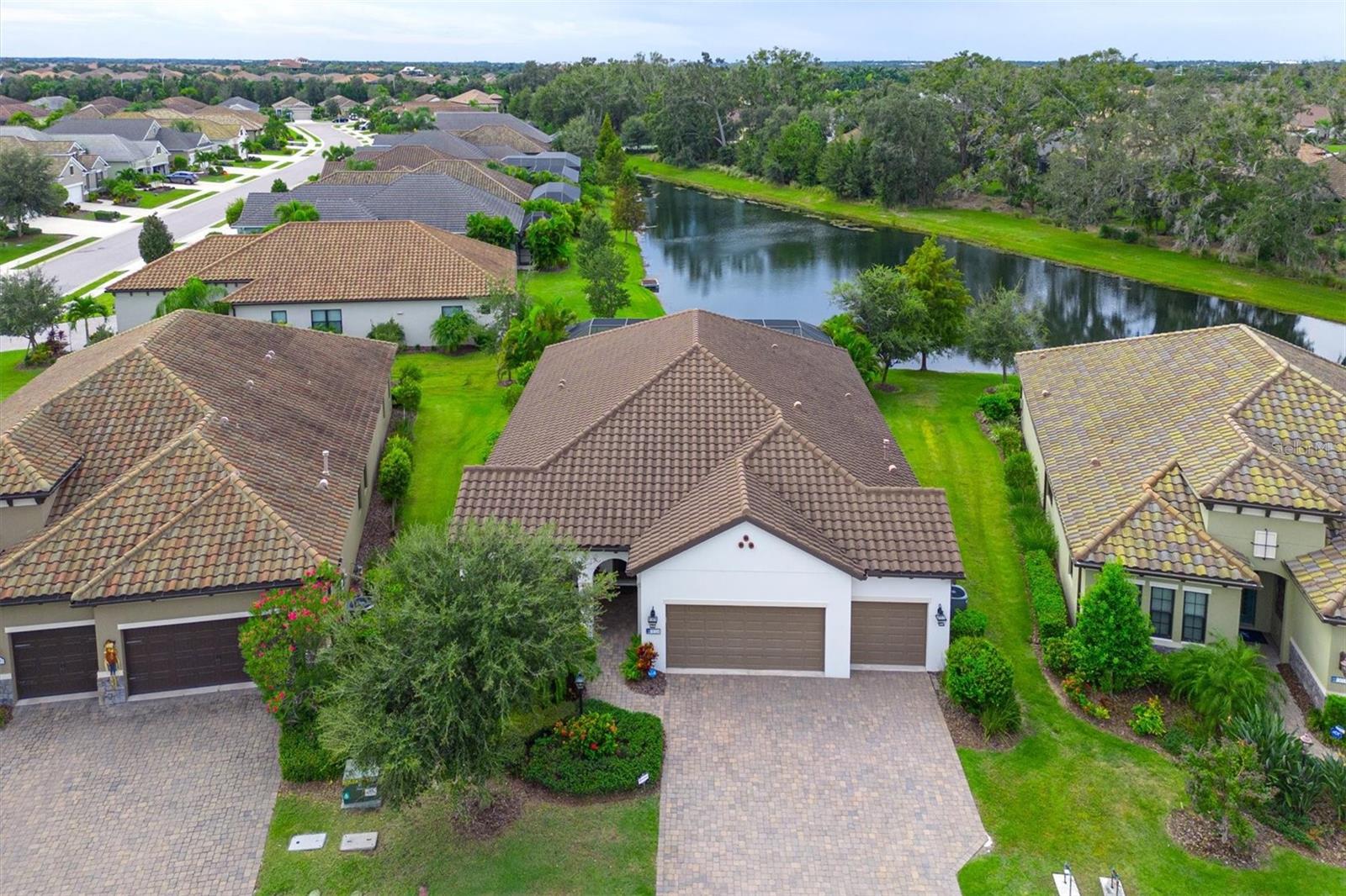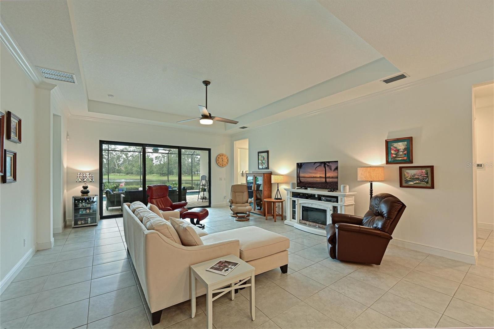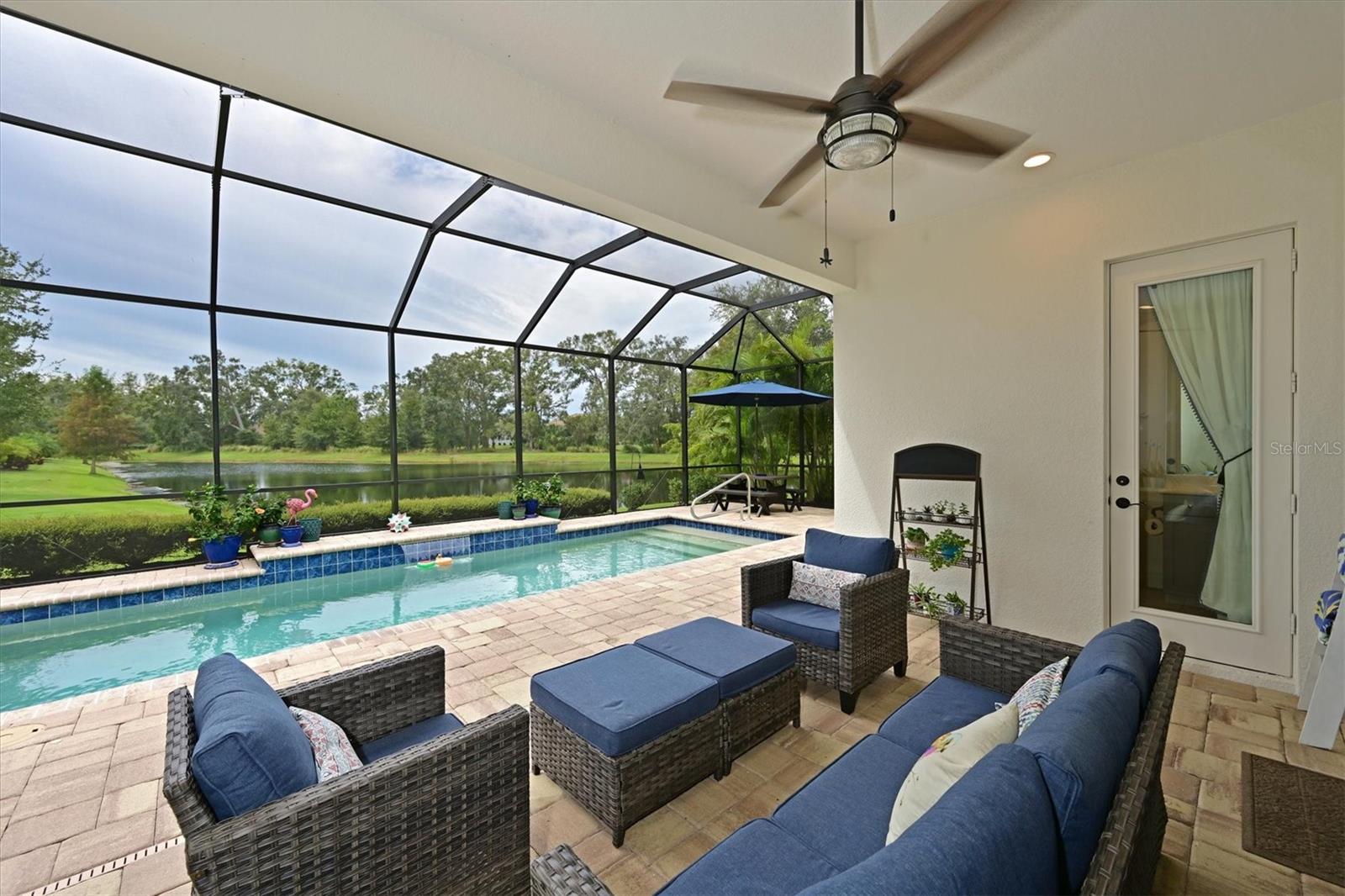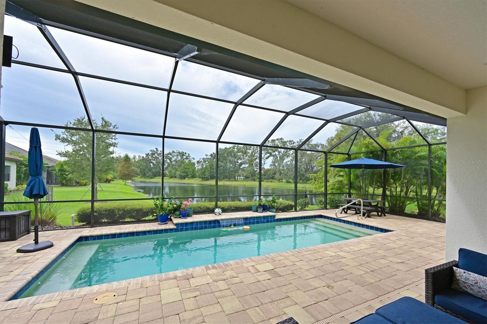 One or more photo(s) has been virtually staged. Exceptional Pool Home in Indigo, Lakewood Ranch! Peace of mind meets luxury living with impact-resistant windows and doors throughout this stunning 2018 Neal Communities "Daybreak" floor plan. Designed for both comfort and durability, this home also offers a 3-car garage extended by four feet, complete with insulated doors and prewiring for an electric car charger, providing ample storage and modern convenience. Located in the heart of Lakewood Ranch’s sought-after Indigo community, this home spans over 2,400 sq. ft. of thoughtfully designed living space on a premium lake/preserve lot. Featuring 4 bedrooms, 3 full bathrooms, and an oversized garage, it combines elegance, functionality, and peace of mind. The Spanish Revival elevation with designer colors, barrel tile roof, and paver driveway creates an inviting curb appeal. Step inside to discover an open floor plan with a great room, dining room, and living room, ideal for hosting gatherings. The interior features neutral tones and no carpet, with 18” x 18” tile throughout for a clean, modern look. The gourmet kitchen is a chef’s dream, offering quartz countertops, a designer backsplash, GE Profile appliances including a gas cooktop, 42” upper cabinets, lower cabinet drawers, roll-out shelving, and a walk-in pantry. A whole-house Culligan reverse osmosis filtration system ensures pristine water, connected to both the sink and refrigerator. The screened lanai is your private retreat, overlooking the tranquil lake and preserve. A heated saltwater pool adds to the Florida lifestyle, while a gas stub on the lanai allows for seamless outdoor grilling. Additional features include plantation shutters, crown molding, coffered ceilings in the great room and master suite, and a Trane 17 SEER HVAC system with a whole-house media air cleaner. The home’s neutral palette is a perfect canvas for your personal touch. With its exceptional design, premium upgrades, and unbeatable location, this home offers the perfect blend of luxury and lifestyle. Schedule your showing today and experience the best of Indigo, one of Lakewood Ranch’s most desirable communities!