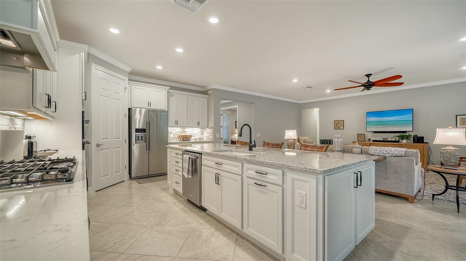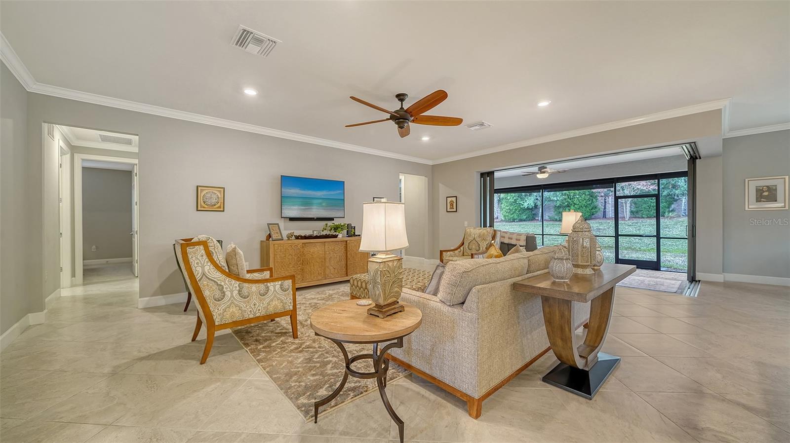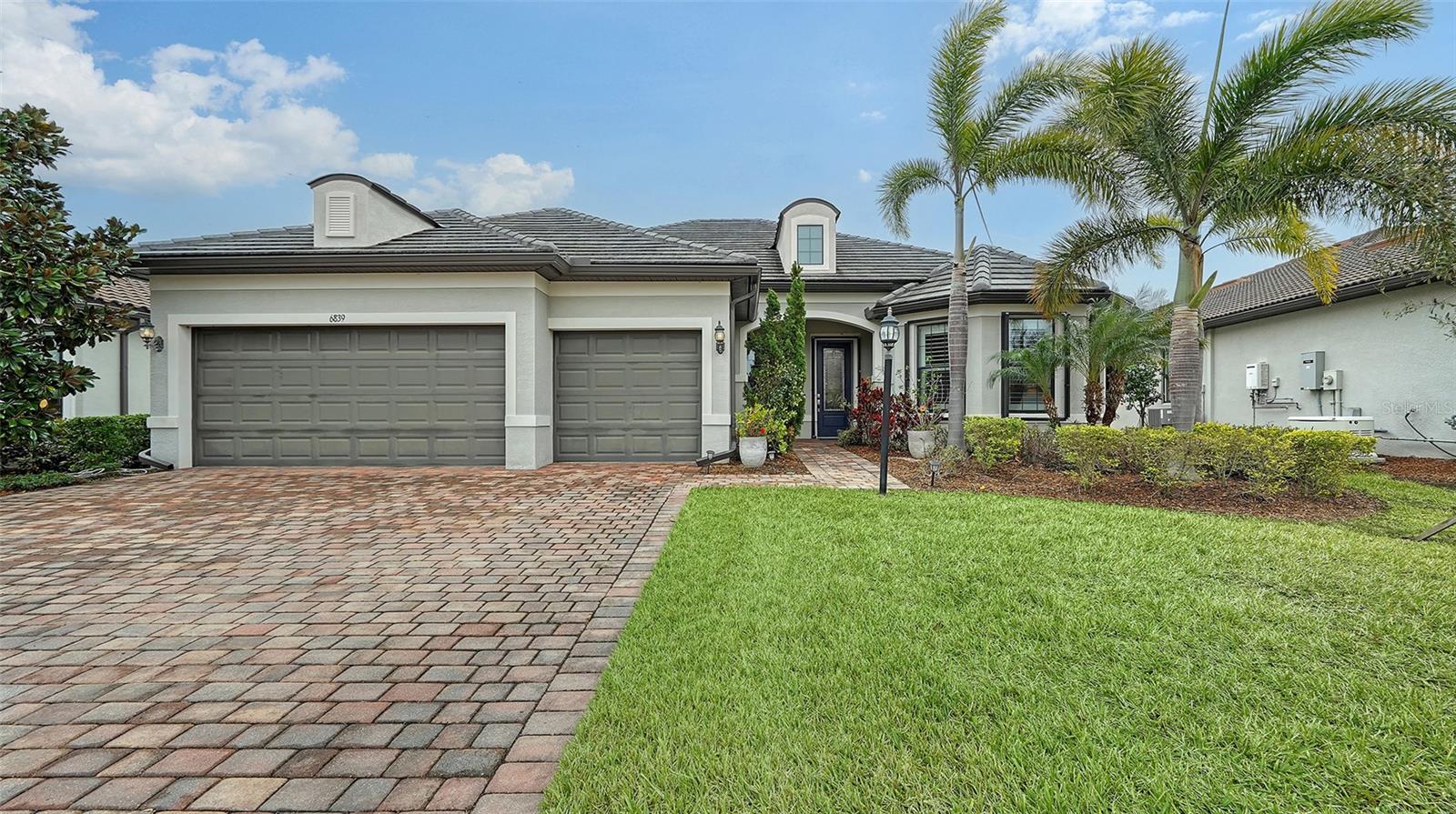 Significant Price Reduction!! Come see this lovely home located in the gated 55+ Del Webb community in Lakewood Ranch. This popular Pinnacle model offers 3 bedrooms, 3 baths, a den, and gourmet kitchen with many built-ins. The zero corner slider leads to the screened lanai -- a great place where you can enjoy your morning coffee, relax, and entertain guests. The home offers 2488 square feet of living space along with a three-car garage (2 cars plus golf cart). The living areas have tiled floors and crown molding. Bedrooms have carpet. The spacious primary bedroom and ensuite bath has a spacious walk-in closet, large shower, and vanity with dual sinks. The open floor plan has a large gathering area adjacent to the spacious gourmet kitchen, and dinette. The kitchen countertops are quartz with white cabinetry and stainless steel appliances. There is a spacious walk-in pantry. A large island with sink, work space, breakfast bar separate the kitchen from the great room. At one end of the kitchen the dining area has easy access to the lanai. The laundry room has a utility sink and cabinetry along one wall. The home has plantation shutters throughout and hurricane shutters on the windows and doors. The 28,000 square foot Clubhouse is located within walking distance or a short drive. The Clubhouse offers numerous amenities, including, but not limited to a resort-style pool, state-of-the-art fitness center, pickleball and tennis courts, and game rooms. The Sailfish Bar and Grill restaurant offers indoor-outdoor waterfront dining. Del Webb at Lakewood Ranch is located within minutes of Lakewood Ranch Main Street and I-75 for easy access to Benderson Park, UTC shopping, restaurants, and entertainment. It is also just a short distance to Downtown Sarasota, St. Armands, and the beaches.
