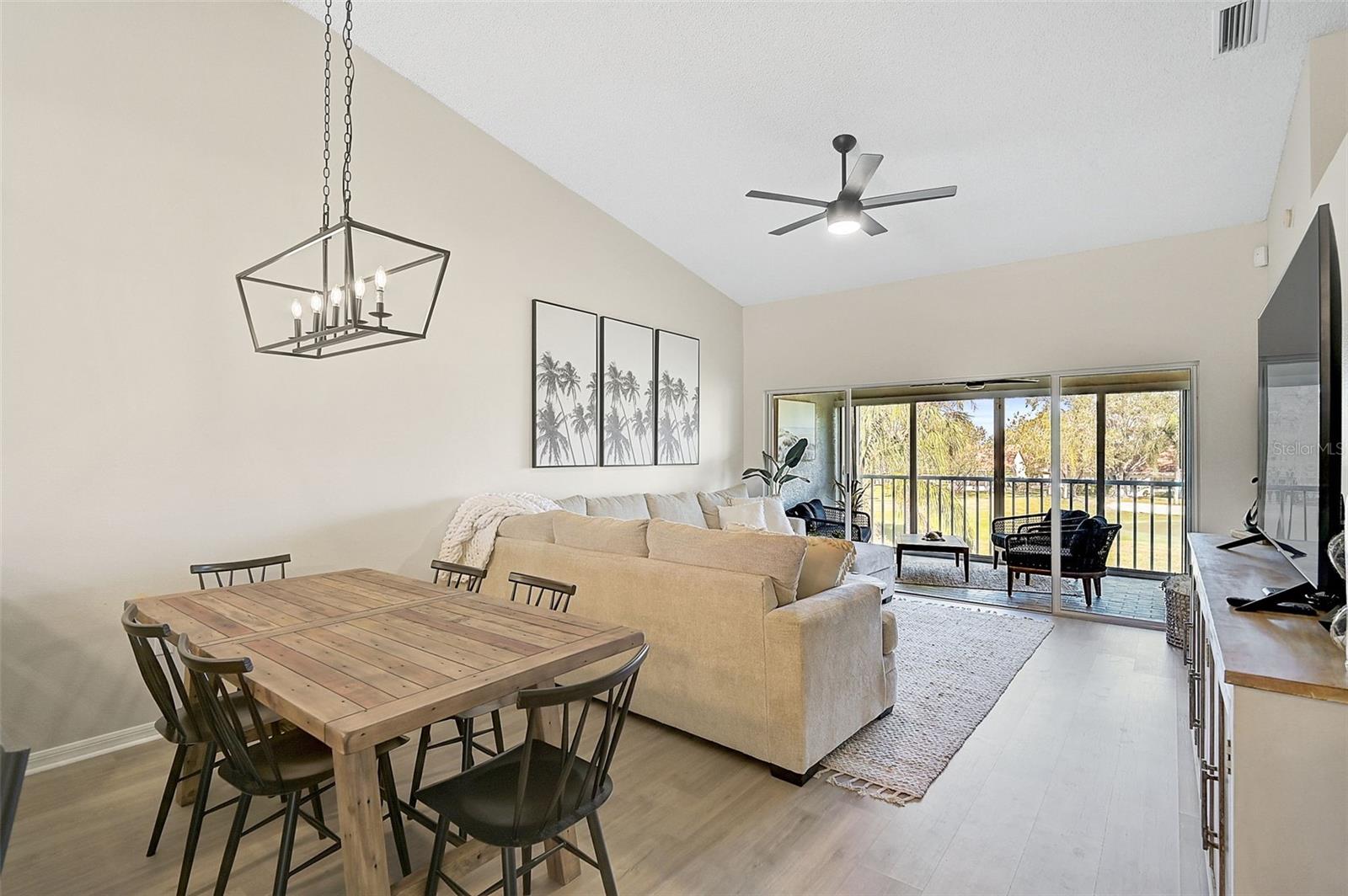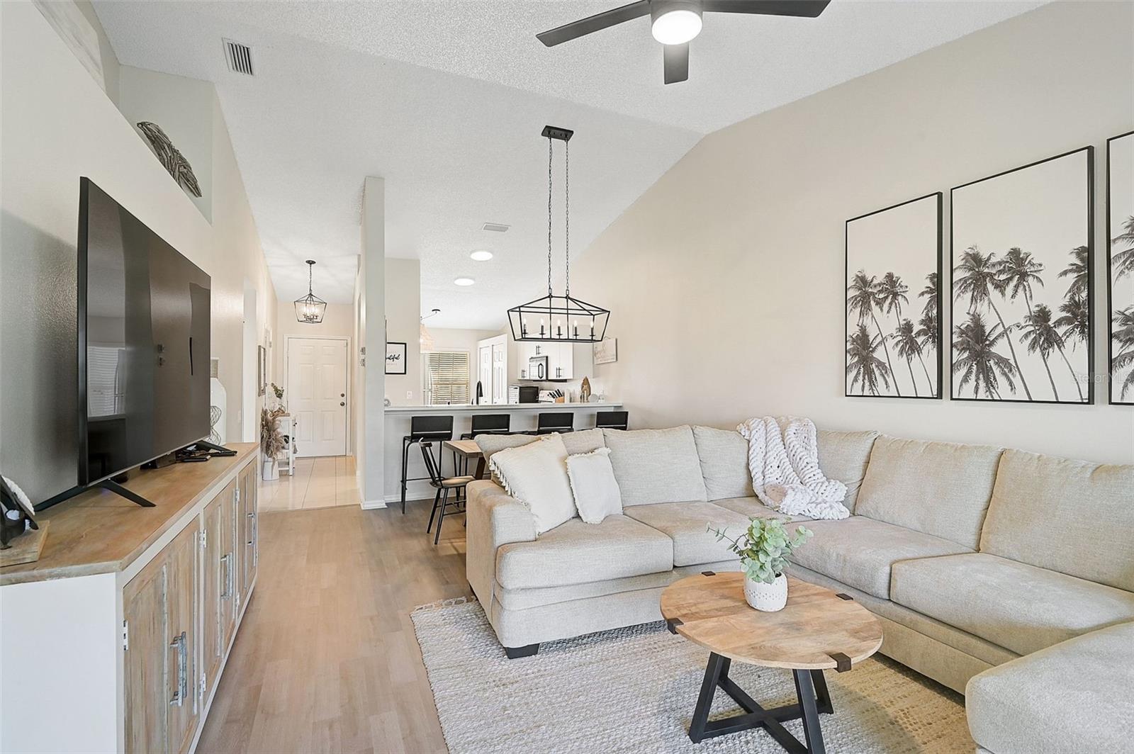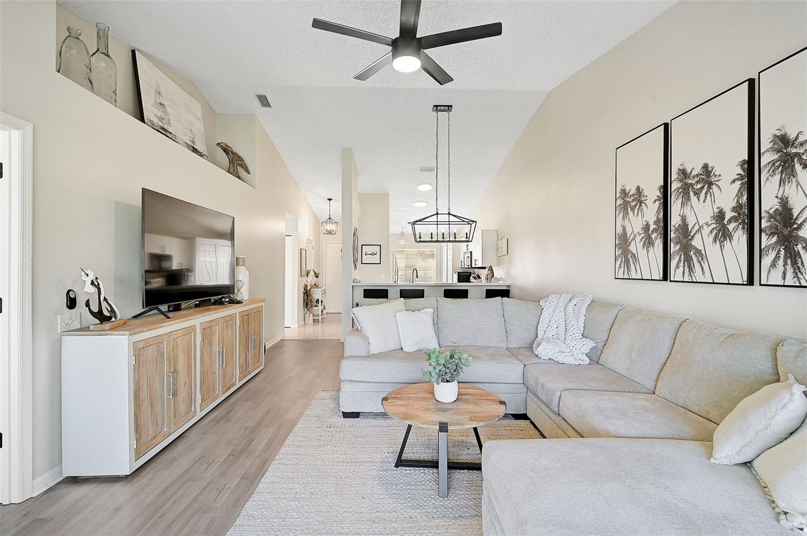 Discover this STUNNING 2-bedroom, 2-bathroom Second-floor condo, offering a perfect blend of comfort and style with a view of the golf course from the enclosed lanai and a serene lake from the front porch. Freshly painted throughout, the interior offers a bright and modern feel complemented by stylish updates, including luxury vinyl plank flooring, new fans, new faucets, elegant light fixtures, and an updated kitchen. The thoughtfully designed living spaces are perfect for entertaining, with plenty of seating for friends and family. Enjoy gatherings in the eat-in kitchen area, at the bar stools along the counter, or around the beautiful dining table. Thoughtfully FURNISHED and designed for ease, this condo is ideal for seasonal or year-round living. This home is a true retreat! Just unpack and start enjoying your perfect home in paradise. Located in Peridia Golf & Country Club, residents can enjoy a vibrant community with an executive 18-hole golf course, a sparkling swimming pool, Tiki Bar, tennis courts, pickleball, and water aerobics. Social activities abound, including bar poker, Mahjong, book clubs, and more. Participate in exclusive member-only events, Friday night dances at the clubhouse, or the monthly Saturday night Supper Club. Fairway Trace residents also have access to a private second pool, adding to the resort-style living experience. Whether you’re looking to be highly involved in the community or simply relax, this home offers the best of both worlds. Don’t miss this opportunity—schedule your private showing today!