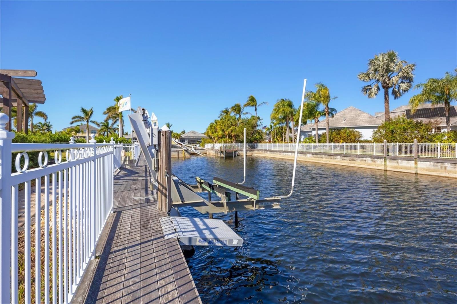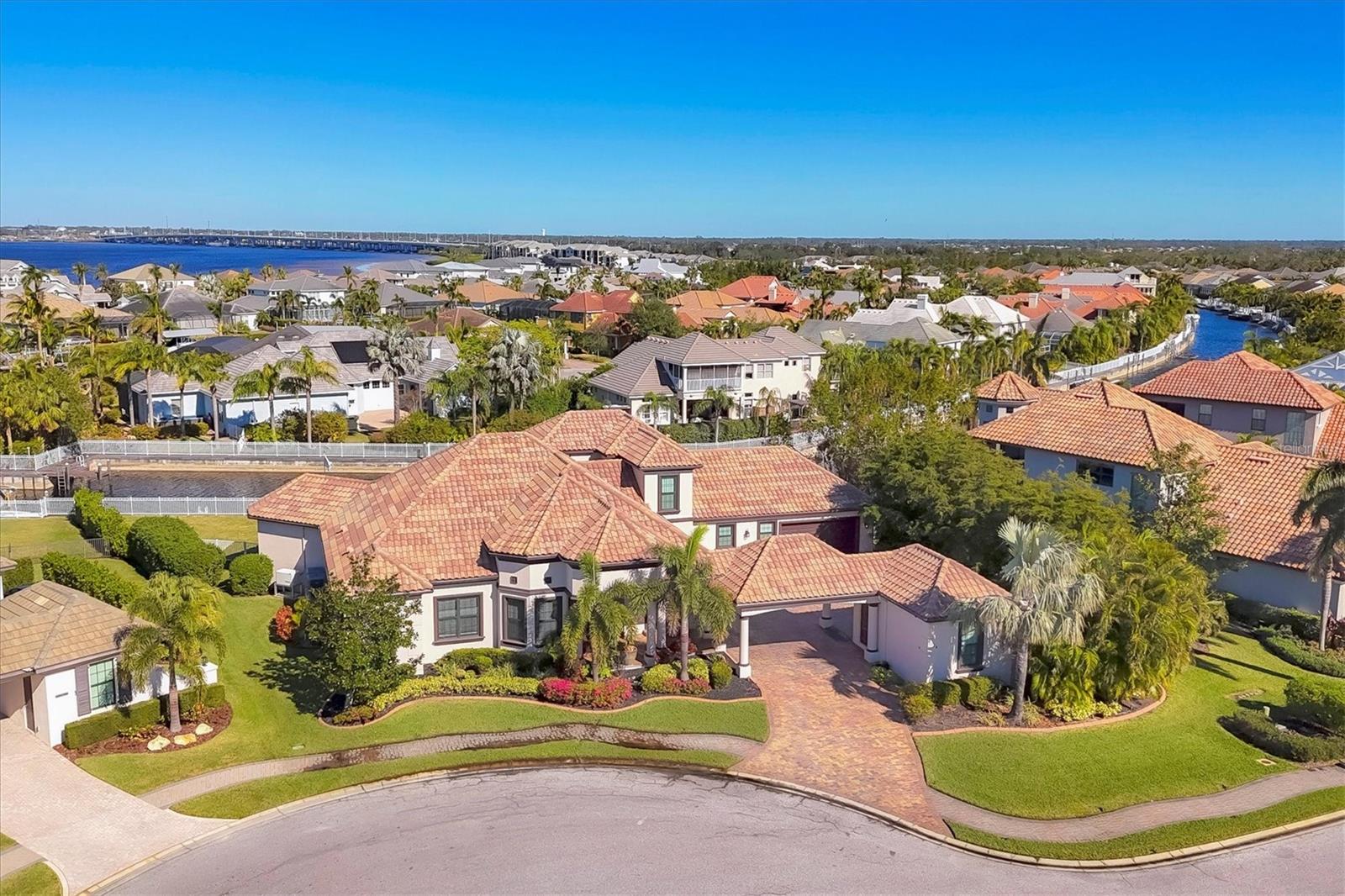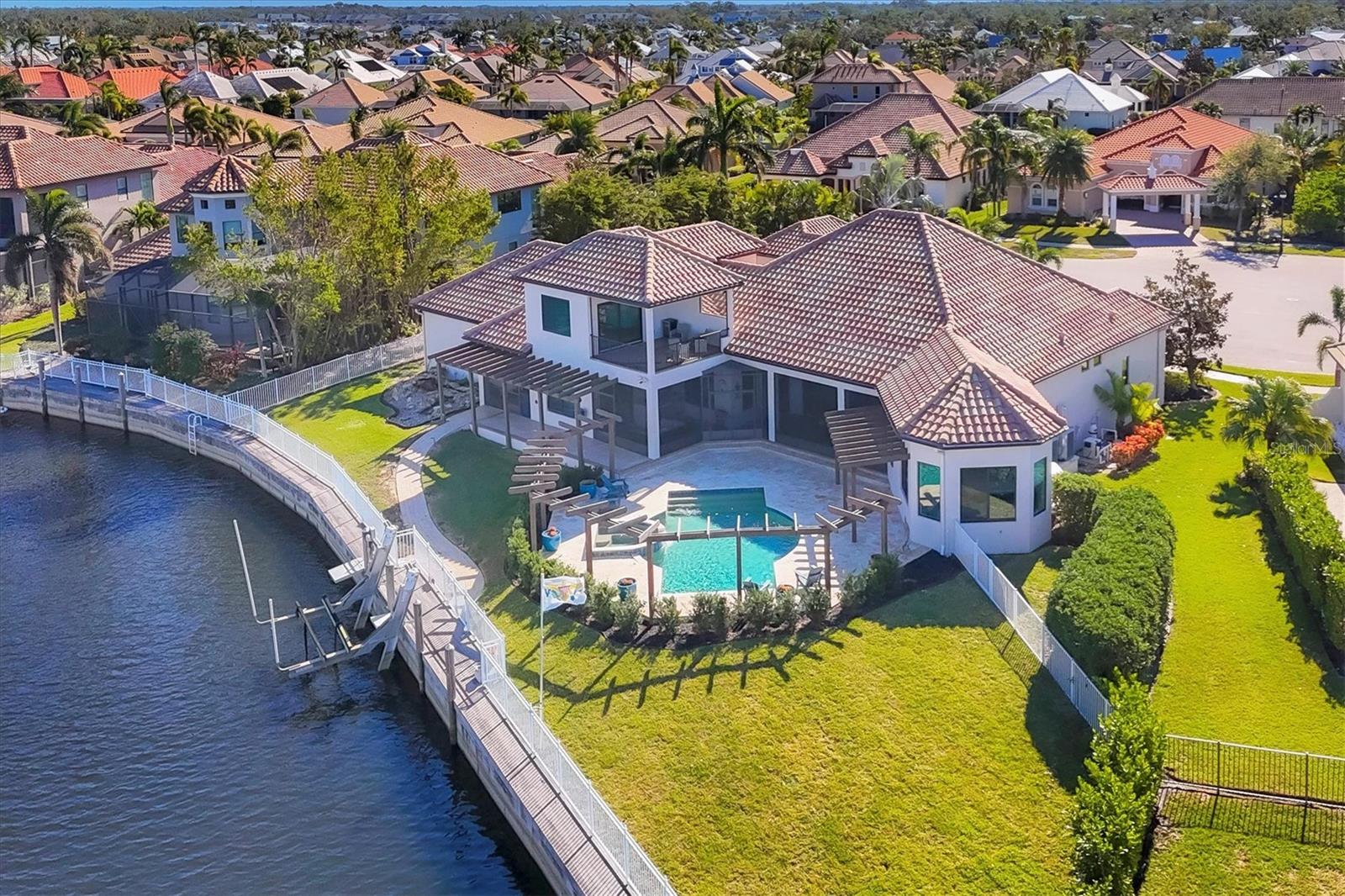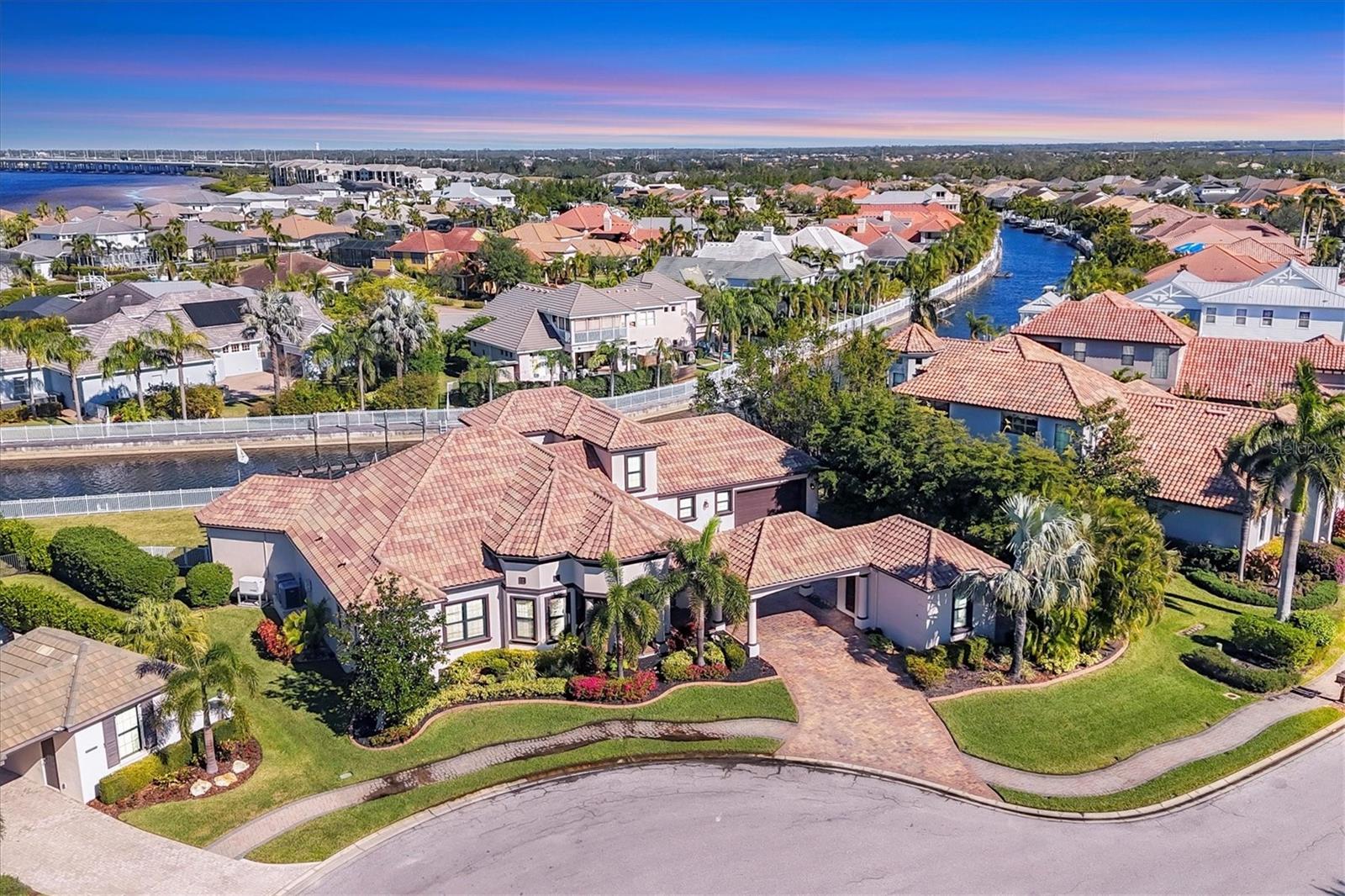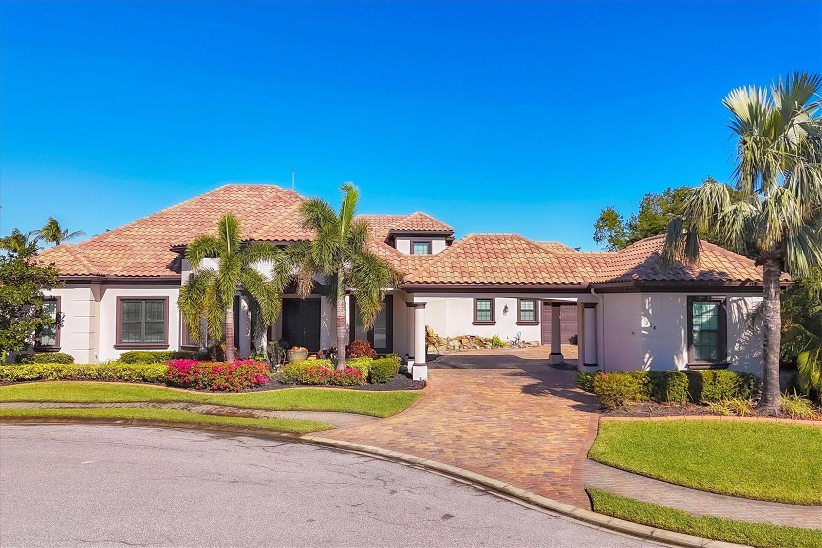 STOP!!! with that curb appeal! This beautiful custom built home situated on a double lot, boasts top craftsmanship and high standards with an impressive 180' sea wall frontage and 12' elevation can accommodate a large vessel. This property is located along the banks of the Manatee River and minutes to the Gulf beaches. This estate is on a half acre on a private cul-de-sac. The Mediterranean elevations and stately columns provide curb appeal that keeps your gaze prolonged. Stepping into this 3,763 sf of luxury living, starting with the 16' ceiling foyer, to the 12' coffered tray ceilings throughout the main living area. This well equipped epicurean kitchen with a 5-burner gas cooktop with all stainless steel appliances. With 5 bedrooms and 4 baths, plenty of space for family or friends. Second floor hosts a small retreat for one of your guests with a private balcony to enjoy the sunset. Out your back door and into a private oasis pool, spa, and private 14,000 lb boat lift. After a day of fishing, come home to a private fish cleaning area and outdoor shower and an equipped outdoor kitchen area. This property was furnished with all impact windows and doors and an oversized generator which will run the entire home and its functions. From lush tropical landscaping to fully fenced yard for any furry friends as well. This home is someone's waterfront dream. Let's make it your reality.
