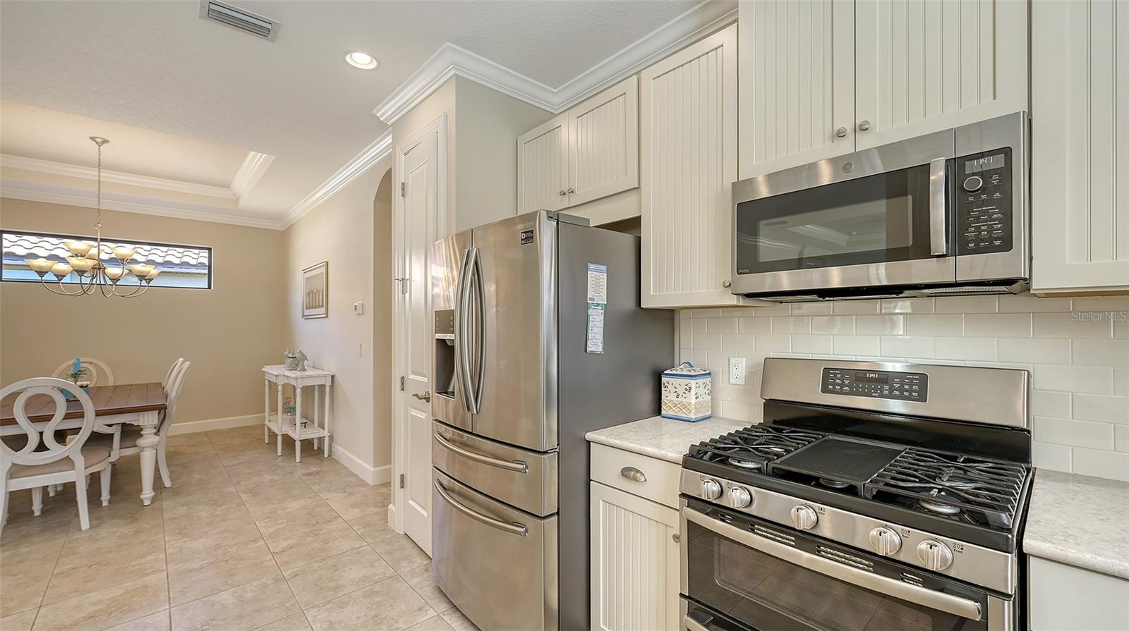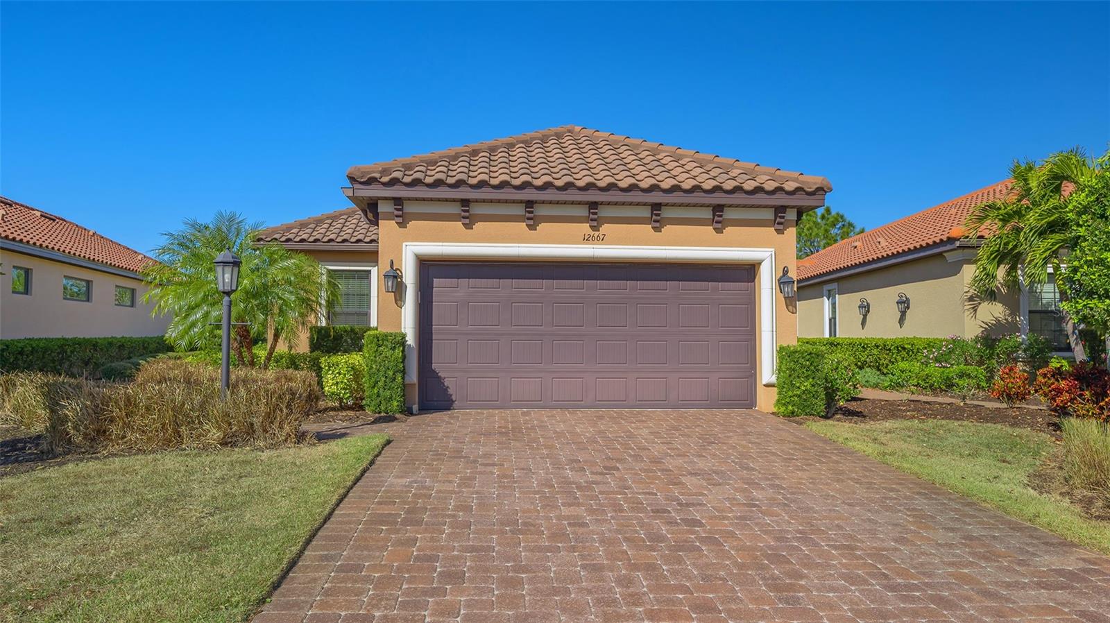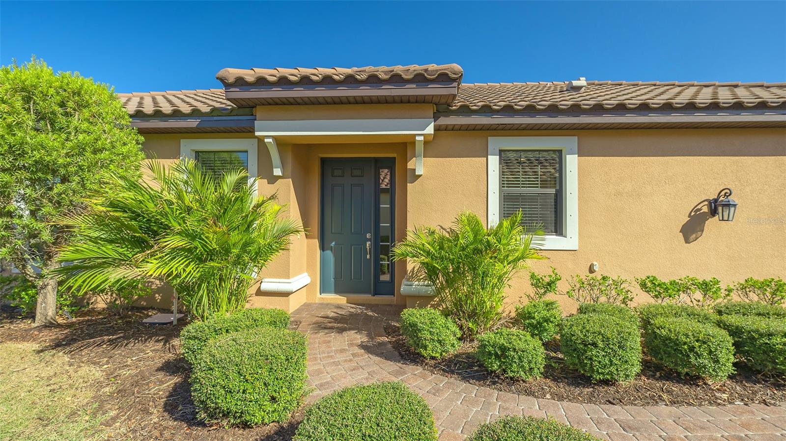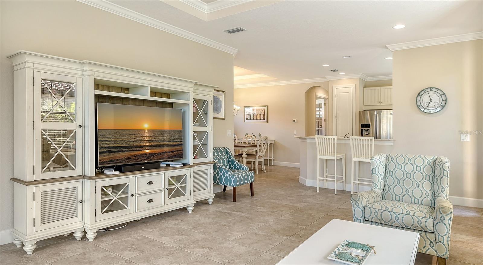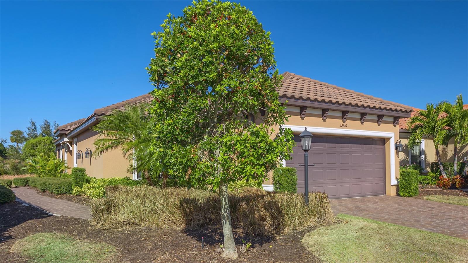New Price and furnishings are included. (Furniture from Matter Bros.) Take advantage of a fantastic opportunity to own a single family furnished, deeded golf home in Esplanade at this price point. Built in 2018 , never rented and only used a few months of the year, this newer version of the single-family Roma model features 8 foot tall doors throughout, tray ceilings in all the main areas, two spacious bedrooms, two full baths, a versatile den/study with glass French doors, and separate dining area. The open floor plan, filled with sparkling indirect natural light, is spacious and perfect for relaxing and entertaining. A chef's delight, the large kitchen provides an abundance of 42" off-white cabinetry, quartz countertops, and trendy subway tile backsplash. A closet pantry, breakfast bar, and stainless steel appliances are additional features of this well-designed, spacious kitchen. Crown moldings add beautiful interior design elements to the tray ceilings in the great room, primary bedroom and dining room. A pair of French doors are an elegant touch in the study/den which easily accommodates additional over-night guests. The primary bedroom, with a picturesque three -window bay, provides ample room for a king bed and pair of night stands. The en-suite bath has a dual-sink vanity, private commode and large shower with rimless glass wall and door. A walk-in closet provides generous space. The guest room, located across the home, also accommodates a king bed and boasts a spacious walk-in closet. Relax in the extended screened paver lanai which is plumbed for natural gas for a future outdoor kitchen. Take in the expansive views of the natural Florida landscape which gradually transitions to the manicured fairway. Window blinds and ceiling fans are in place in the main living areas. The driveway and curving walkway to the front door are brick paved and a two-car garage also offers attic storage. Yard maintenance and irrigation are provided. Esplanade offers resort-style living where residents can select from a myriad of activities such as golf, tennis, and pickleball, and a calendar of social events as well as many resident-run clubs and activities. Two clubhouses within walking distance each with a large, resort-style pool, wellness classes, a salon, the Koquina Spa, Bahama Bar, Culinary Center with the Barrel House Bistro, and much more, add to the reasons why this amenity-rich community is the perfect place for a seasonal destination or year-round home. As a Troon managed community, Esplanade offers golf members the opportunity to enjoy other Troon courses in the US. Experience exciting Sarasota and discover its cultural richness as well as the beautiful Gulf beaches.