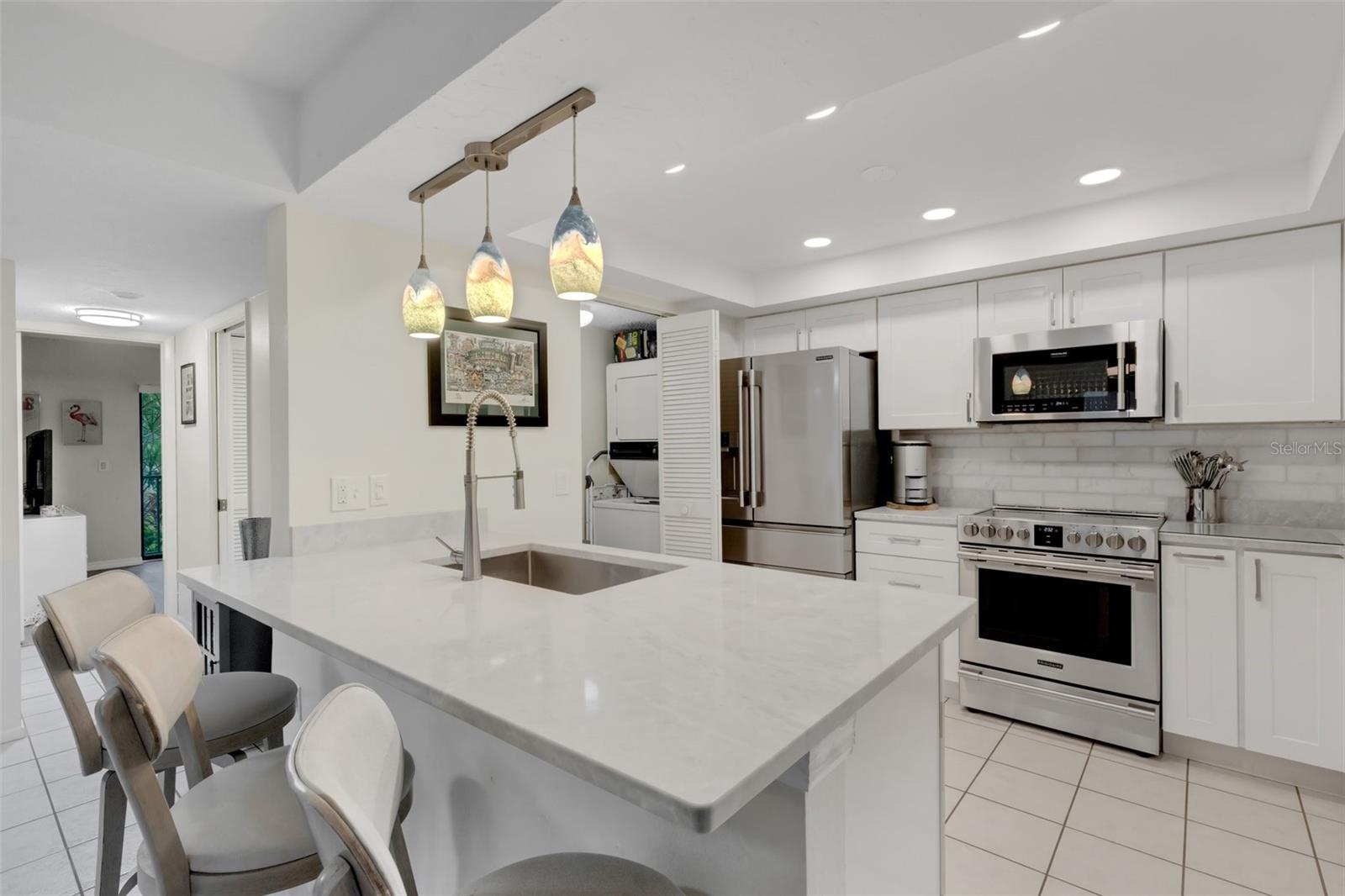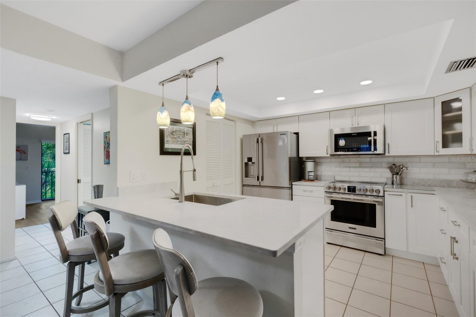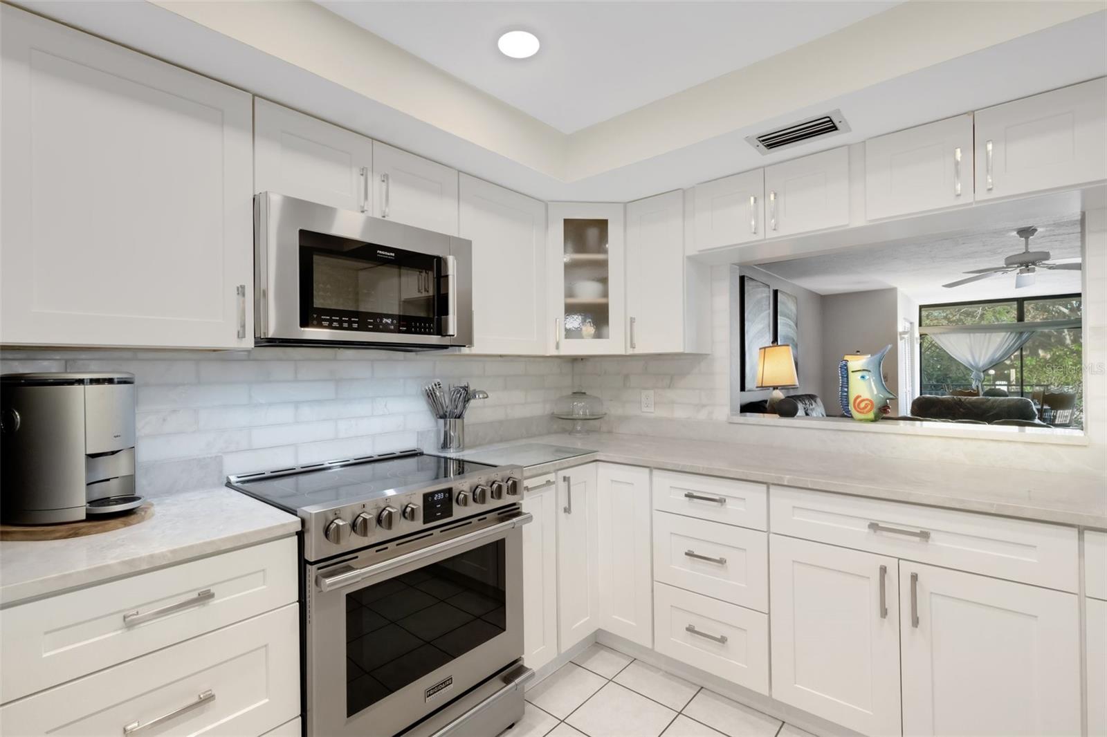 Welcome to Terraces at Wild Oak Bay! This COMPLETELY RENOVATED STUNNING 3BR / 2BA CONDO IS NESTLED ON THE FIRST FLOOR CORNER UNIT. The owner has completely renovated this condo and is visibly well maintained with fresh paint, HVAC replaced 2022, and all the Popcorn Ceilings have been replaced with New Smooth Ceilings. A completely new and remodeled kitchen, featuring stunning all Top-of-the-line stainless steel appliances, new Custom cabinets with convenient pull-out drawers, soft close, a lazy Susan, and sleek hardware. Gorgeous Dolomite countertops complemented by a stone-tiled backsplash and recess lighting above the kitchen. The spa-like primary bedroom has a new modern ceiling fan, walk-in closet with an additional closet, and the bathroom has been completely redone, redesigned to feel like you’re at a 5-Star resort with granite top sinks, frameless glass shower doors, and modern shower tiles with recessed lighting. The Two remaining bedrooms are stunning, each has a sliding glass door leading to an extended balcony. The guest bathroom has been elegantly updated with a new granite vanity, paint, and a brand-new Kohler toilet. The outdoor Florida room has been enclosed and incorporated into the interior condo adding extra square footage. Enjoy the very spacious living room and enclosed lanai combo for all of your family gatherings with tiled flooring and luxury vinyl plank flooring throughout all the bedrooms and living room. This large living room is Amazing and leads out to the Florida room with sliding doors that open to an oversized balcony overlooking the community pool. The community swimming pool and hot tub/jacuzzi are only a few steps from your condo. A detached carport is at your front door and plenty of guest parking. Wild Oak Bay is located in a bird sanctuary with walking trails, the complex is conveniently located to shopping, restaurants, libraries, parks, State College of Florida and Sarasota/Bradenton (SRQ) airport. Twenty minutes to downtown Sarasota and Gulf beaches of Anna Maria Island, Longboat Key and Siesta Key. For the golf and tennis enthusiasts, world famous IMG Sports Academy is five minutes away offering a pristine golf course and a tennis club. This exquisite 3BR, 2BA condo is a hidden gem that offers the perfect blend of style, convenience, and coastal living. To further enhance your confidence in your new Florida Condo. Come and experience this modern elegant condo and start living the Florida lifestyle from day one. Come see for yourself why this Condo is #1.