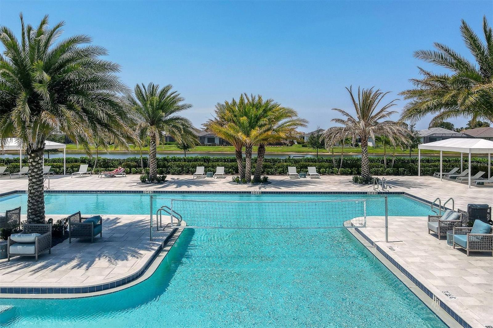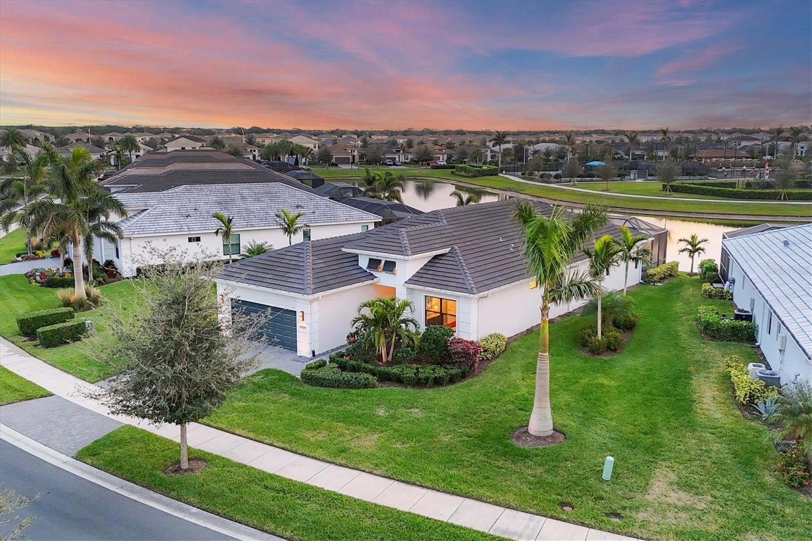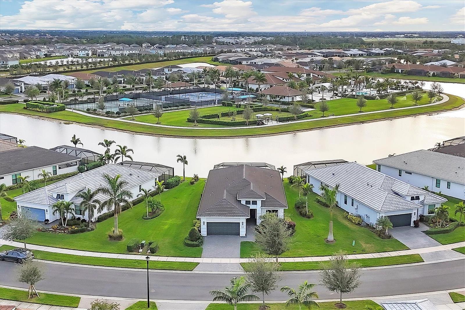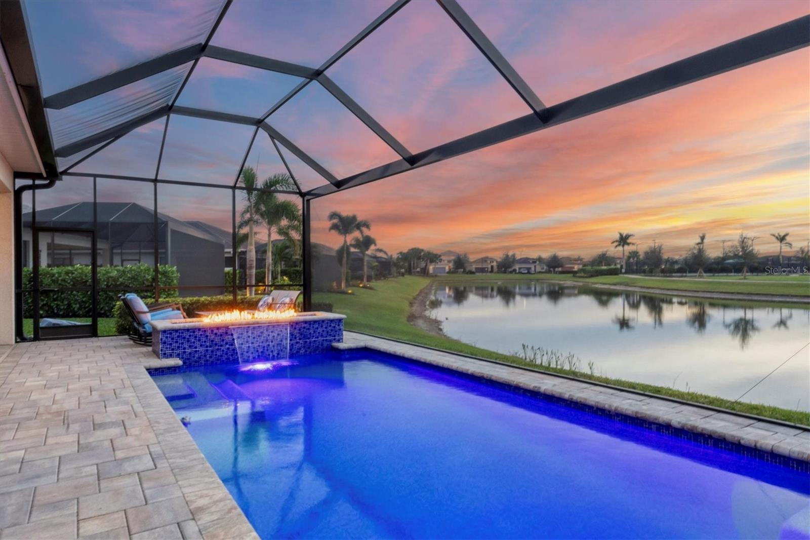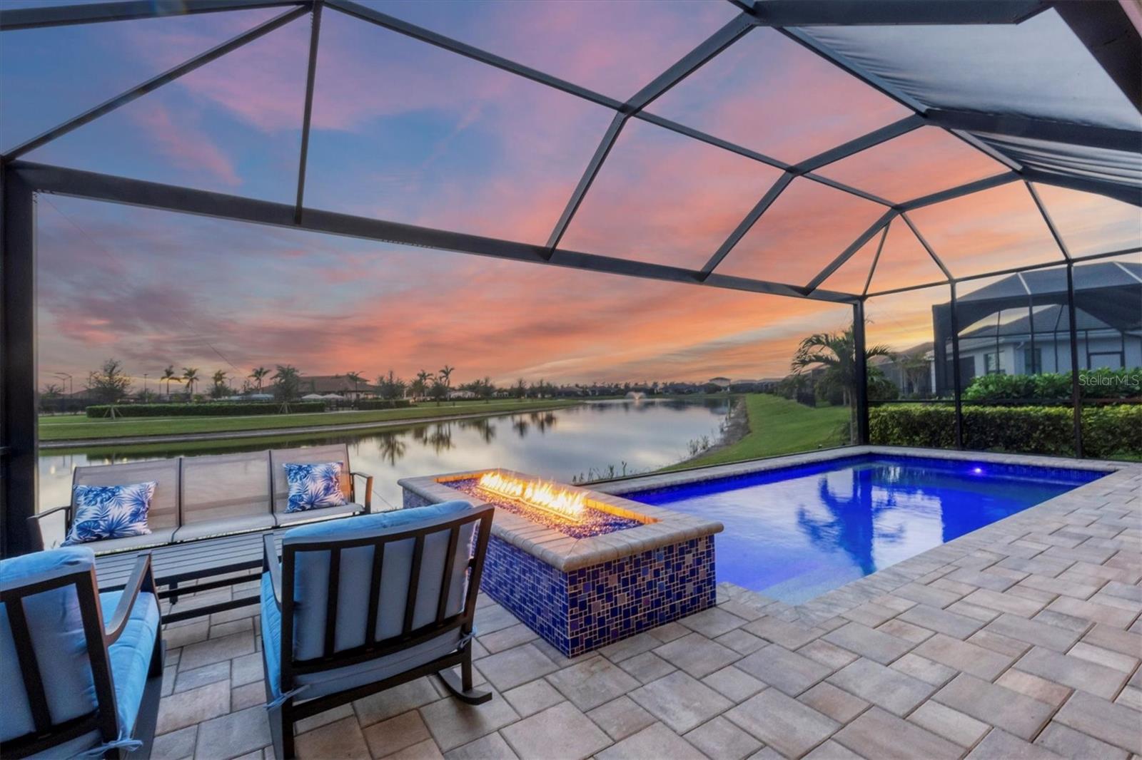 Pristinely upgraded and lightly lived in this gorgeous 3 bedroom, 3 bath, plus custom built-in executive office Fiesta floor plan by Kolter Homes offers a truly luxurious, yet functional home in the award winning, 55+ community of Cresswind in Lakewood Ranch! What makes this home special and different from the rest...it's perfectly situated on one of the largest homesites with spectacular panoramic lake views, and gorgeous sunsets. Key unique elements of this fabulous home include a WHOLE HOUSE GENERATOR for your peace of mind and comfort, beautiful resort style pool with waterfall feature, an 8-foot fire pit for ambiance, panoramic screening and paver decking on the lanai. Throughout the home you will find upgraded quartz and granite counters, upgraded cabinetry and hardware, upgraded flooring in all areas, solid wood custom built-in closets in every room including the pantry, and audio and video security cameras with central control panel. The spacious kitchen boasts upgraded GE Profile stainless steel appliances and Cambria quartz countertops with an extra-large island for entertaining and cooking ease! In addition, the kitchen features full-height backsplash, soft close drawers and cabinets with pull-out drawers. The spa like master suite boasts elegant granite countertops with contrasting cabinetry and granite countertops in secondary baths and laundry room. Other notable upgrades and features include a 4-foot extended garage with custom shelving for more storage space, epoxy floor coating and in the yard additional landscape and lush palms were added with lovely landscape lighting. Cresswind is an amenity rich, luxurious 55+ community situated on 250+ acres that offers an amazing lifestyle with endless possibilities. Engage in a multitude of activities tailored to suit your active lifestyle, from invigorating fitness classes to engaging social events. Outdoor amenities include pickleball & tennis courts, walking trails, resort-style pool and hot tub, resistance pool, event lawn with food trucks and band gazebo, bocce courts, outdoor social areas, dog park and more. This pet-friendly community features a resident-exclusive clubhouse overseen by a full-time lifestyle director with a multi-purpose event and social space, SmartFit/EGym training center, yoga studio, art studio with ceramics, card rooms, and various social clubs. Your best life awaits you in this amazing community and spectacular home!