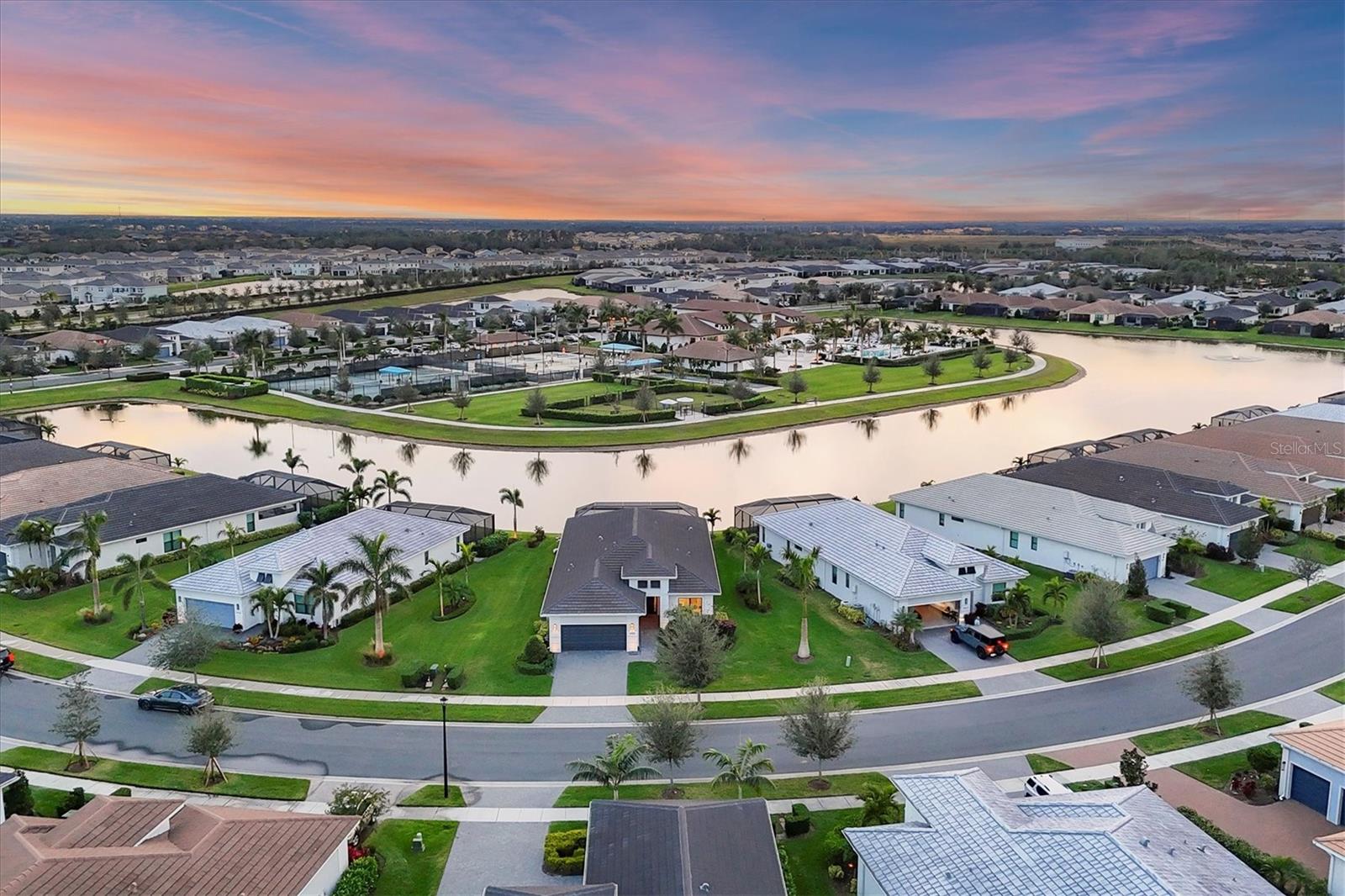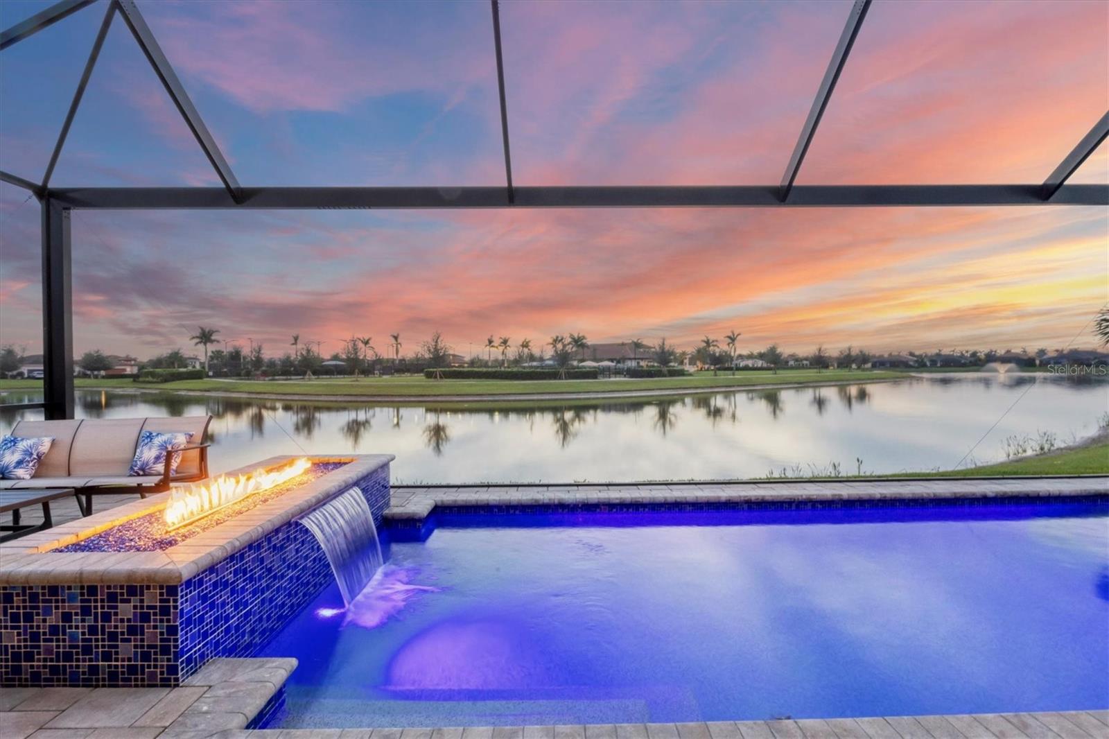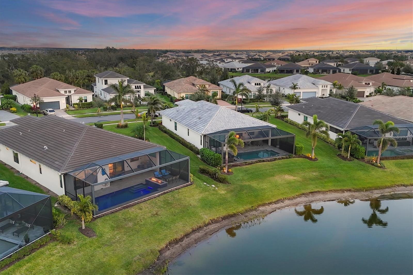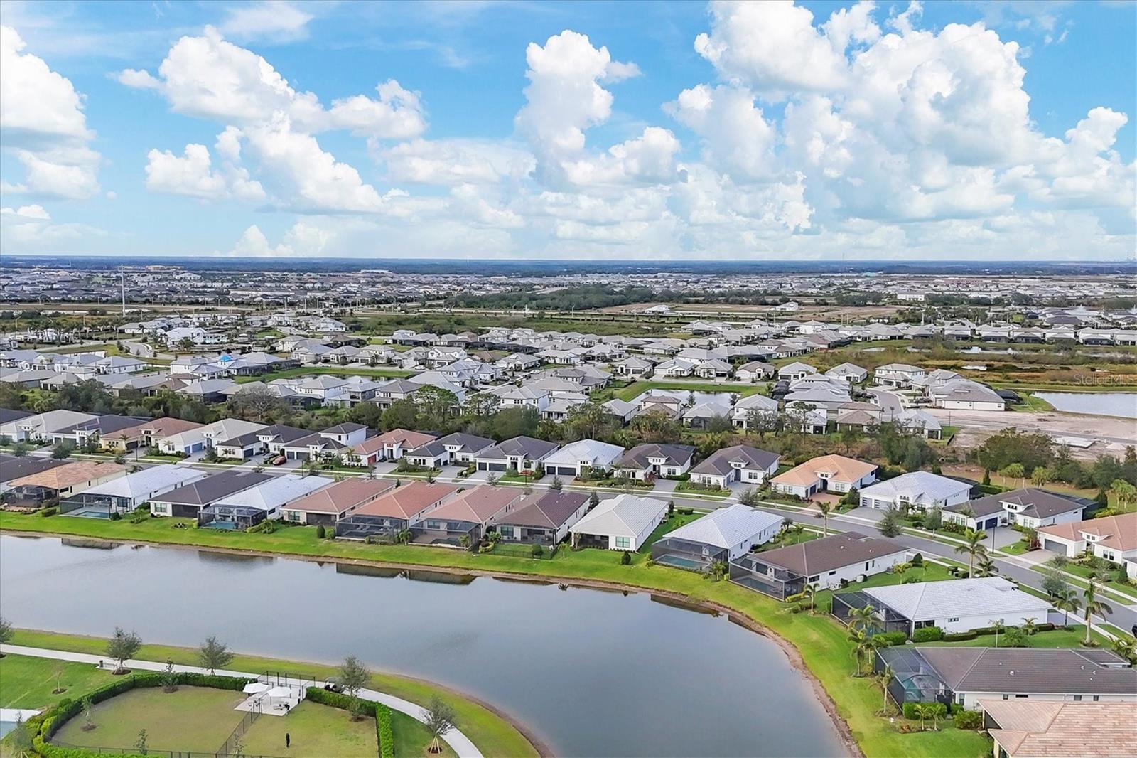 Pristinely upgraded and lightly lived in this gorgeous 3 bedroom, 3 bath, plus custom built-in executive office Fiesta floor plan by Kolter Homes offers a truly luxurious, yet functional home in the award winning, 55+ community of Cresswind in Lakewood Ranch! What makes this home special and different from the rest...it's perfectly situated on one of the largest homesites with spectacular panoramic lake views, and gorgeous sunsets. Key unique elements of this fabulous home include a WHOLE HOUSE GENERATOR for your peace of mind and comfort, beautiful resort style pool with waterfall feature, an 8-foot fire pit for ambiance, panoramic screening and paver decking on the lanai. Throughout the home you will find upgraded quartz and granite counters, upgraded cabinetry and hardware, upgraded flooring in all areas, solid wood custom built-in closets in every room including the pantry, and audio and video security cameras with central control panel. The spacious kitchen boasts upgraded GE Profile stainless steel appliances and Cambria quartz countertops with an extra-large island for entertaining and cooking ease! In addition, the kitchen features full-height backsplash, soft close drawers and cabinets with pull-out drawers. The spa like master suite boasts elegant granite countertops with contrasting cabinetry and granite countertops in secondary baths and laundry room. Other notable upgrades and features include a 4-foot extended garage with custom shelving for more storage space, epoxy floor coating and in the yard additional landscape and lush palms were added with lovely landscape lighting. Cresswind is an amenity rich, luxurious 55+ community situated on 250+ acres that offers an amazing lifestyle with endless possibilities. Engage in a multitude of activities tailored to suit your active lifestyle, from invigorating fitness classes to engaging social events. Outdoor amenities include pickleball & tennis courts, walking trails, resort-style pool and hot tub, resistance pool, event lawn with food trucks and band gazebo, bocce courts, outdoor social areas, dog park and more. This pet-friendly community features a resident-exclusive clubhouse overseen by a full-time lifestyle director with a multi-purpose event and social space, SmartFit/EGym training center, yoga studio, art studio with ceramics, card rooms, and various social clubs. Your best life awaits you in this amazing community and spectacular home!