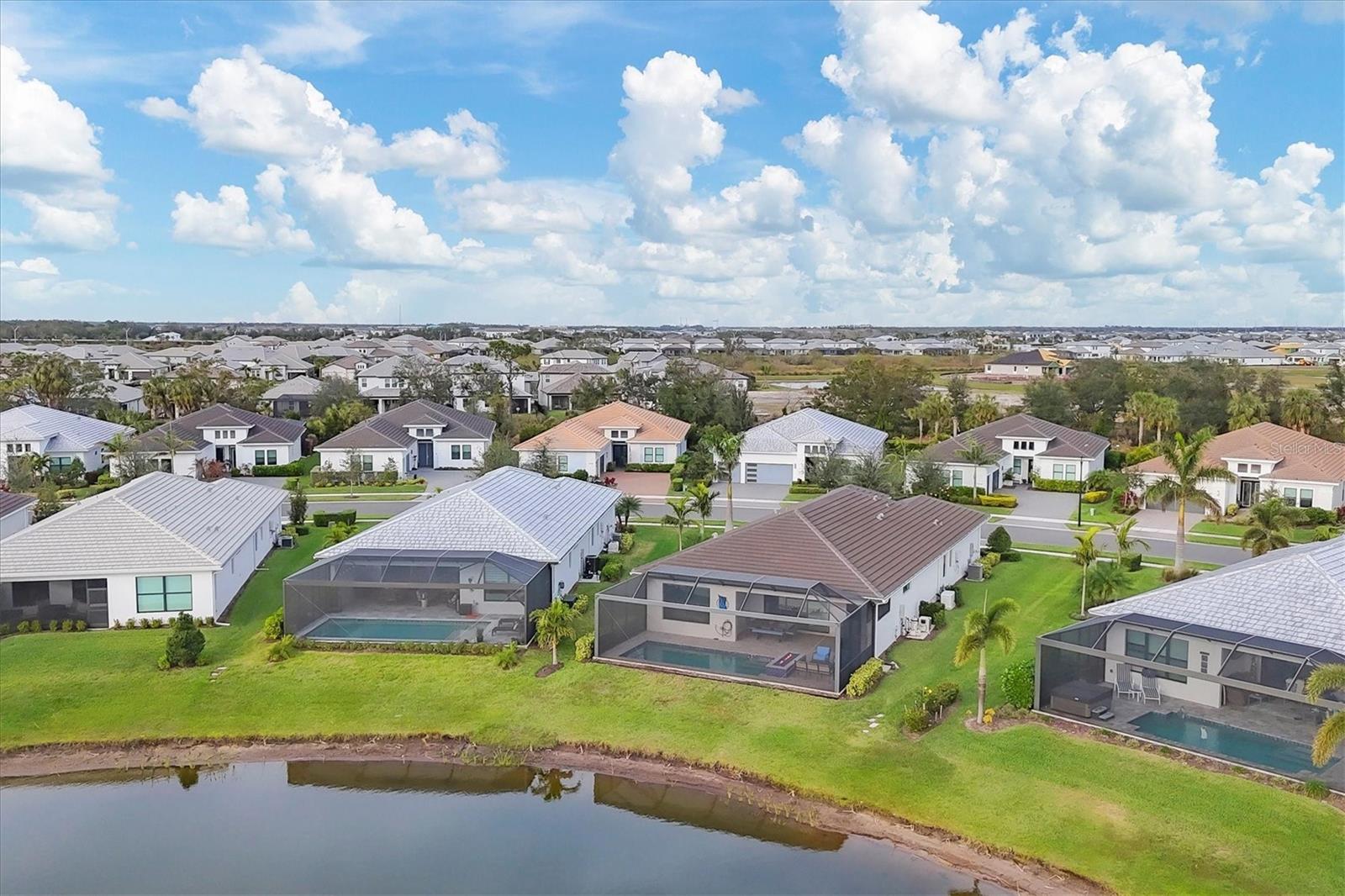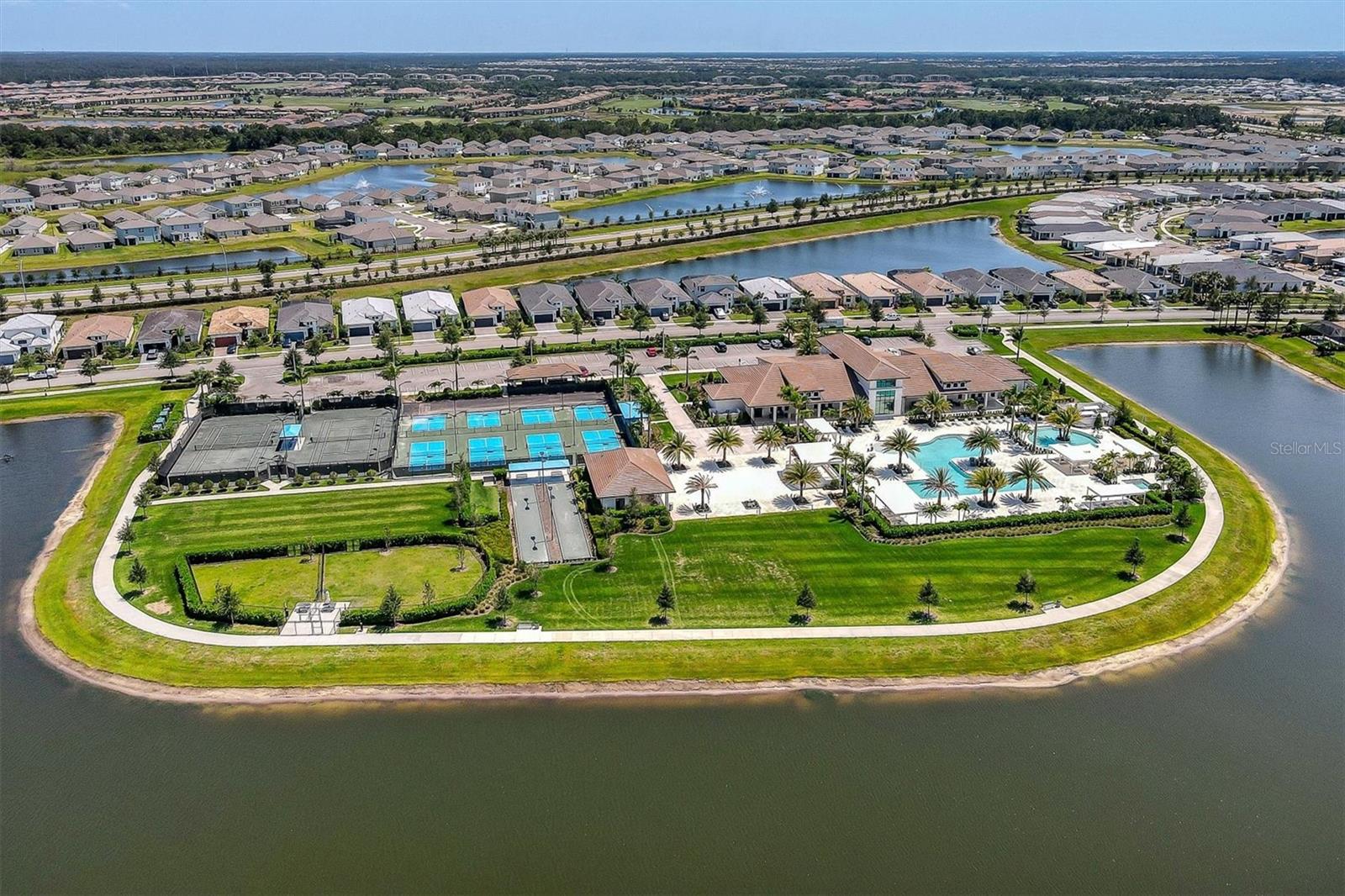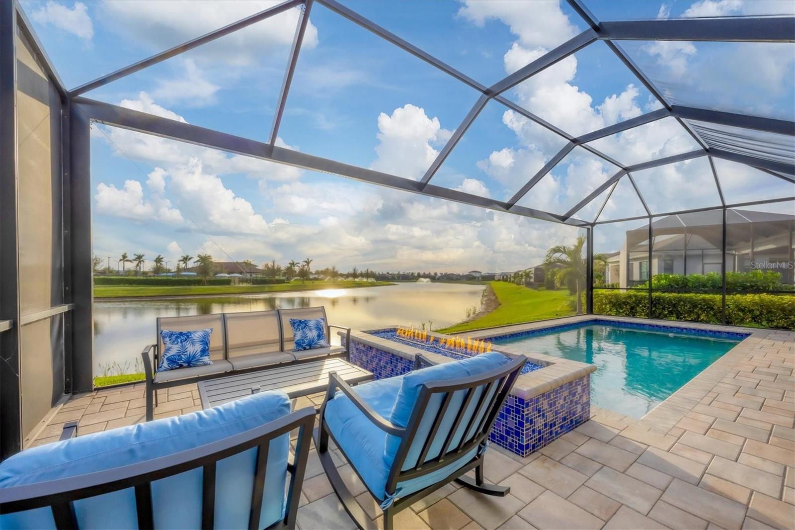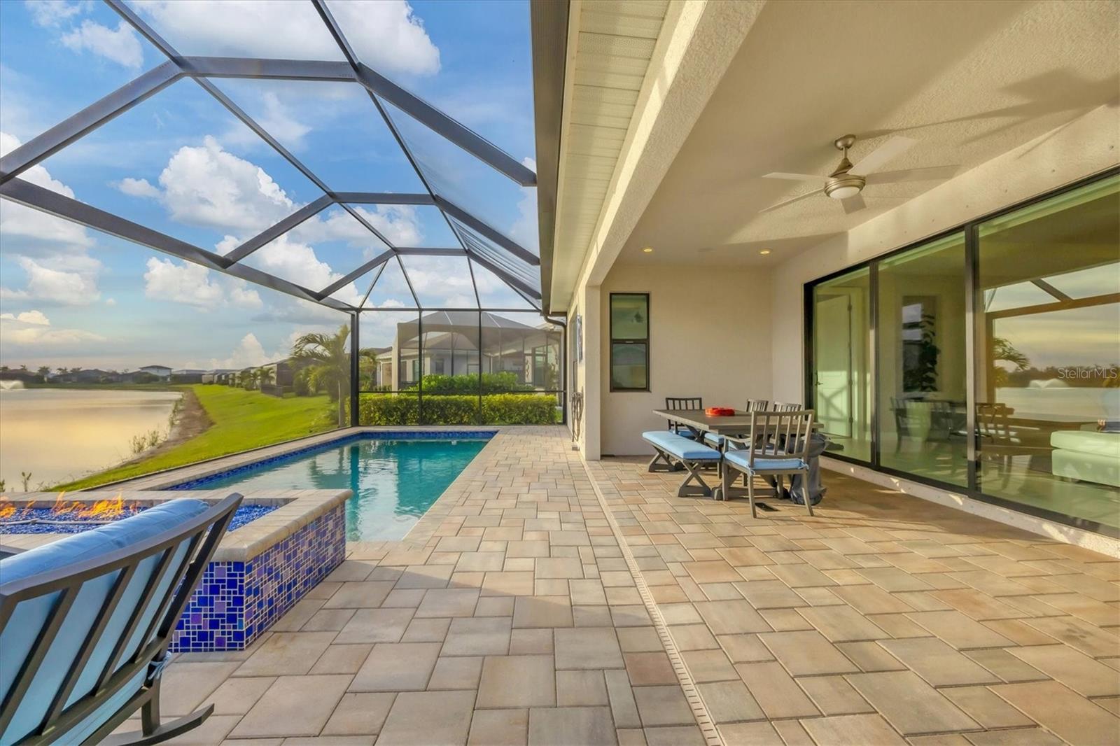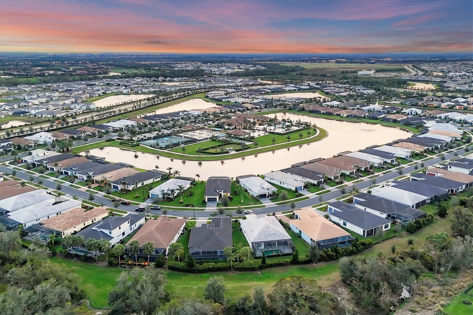 Pristinely upgraded and lightly lived in this gorgeous 3 bedroom, 3 bath, plus custom built-in executive office Fiesta floor plan by Kolter Homes offers a truly luxurious, yet functional home in the award winning, 55+ community of Cresswind in Lakewood Ranch! What makes this home special and different from the rest...it's perfectly situated on one of the largest homesites with spectacular panoramic lake views, and gorgeous sunsets. Key unique elements of this fabulous home include a WHOLE HOUSE GENERATOR for your peace of mind and comfort, beautiful resort style pool with waterfall feature, an 8-foot fire pit for ambiance, panoramic screening and paver decking on the lanai. Throughout the home you will find upgraded quartz and granite counters, upgraded cabinetry and hardware, upgraded flooring in all areas, solid wood custom built-in closets in every room including the pantry, and audio and video security cameras with central control panel. The spacious kitchen boasts upgraded GE Profile stainless steel appliances and Cambria quartz countertops with an extra-large island for entertaining and cooking ease! In addition, the kitchen features full-height backsplash, soft close drawers and cabinets with pull-out drawers. The spa like master suite boasts elegant granite countertops with contrasting cabinetry and granite countertops in secondary baths and laundry room. Other notable upgrades and features include a 4-foot extended garage with custom shelving for more storage space, epoxy floor coating and in the yard additional landscape and lush palms were added with lovely landscape lighting. Cresswind is an amenity rich, luxurious 55+ community situated on 250+ acres that offers an amazing lifestyle with endless possibilities. Engage in a multitude of activities tailored to suit your active lifestyle, from invigorating fitness classes to engaging social events. Outdoor amenities include pickleball & tennis courts, walking trails, resort-style pool and hot tub, resistance pool, event lawn with food trucks and band gazebo, bocce courts, outdoor social areas, dog park and more. This pet-friendly community features a resident-exclusive clubhouse overseen by a full-time lifestyle director with a multi-purpose event and social space, SmartFit/EGym training center, yoga studio, art studio with ceramics, card rooms, and various social clubs. Your best life awaits you in this amazing community and spectacular home!
