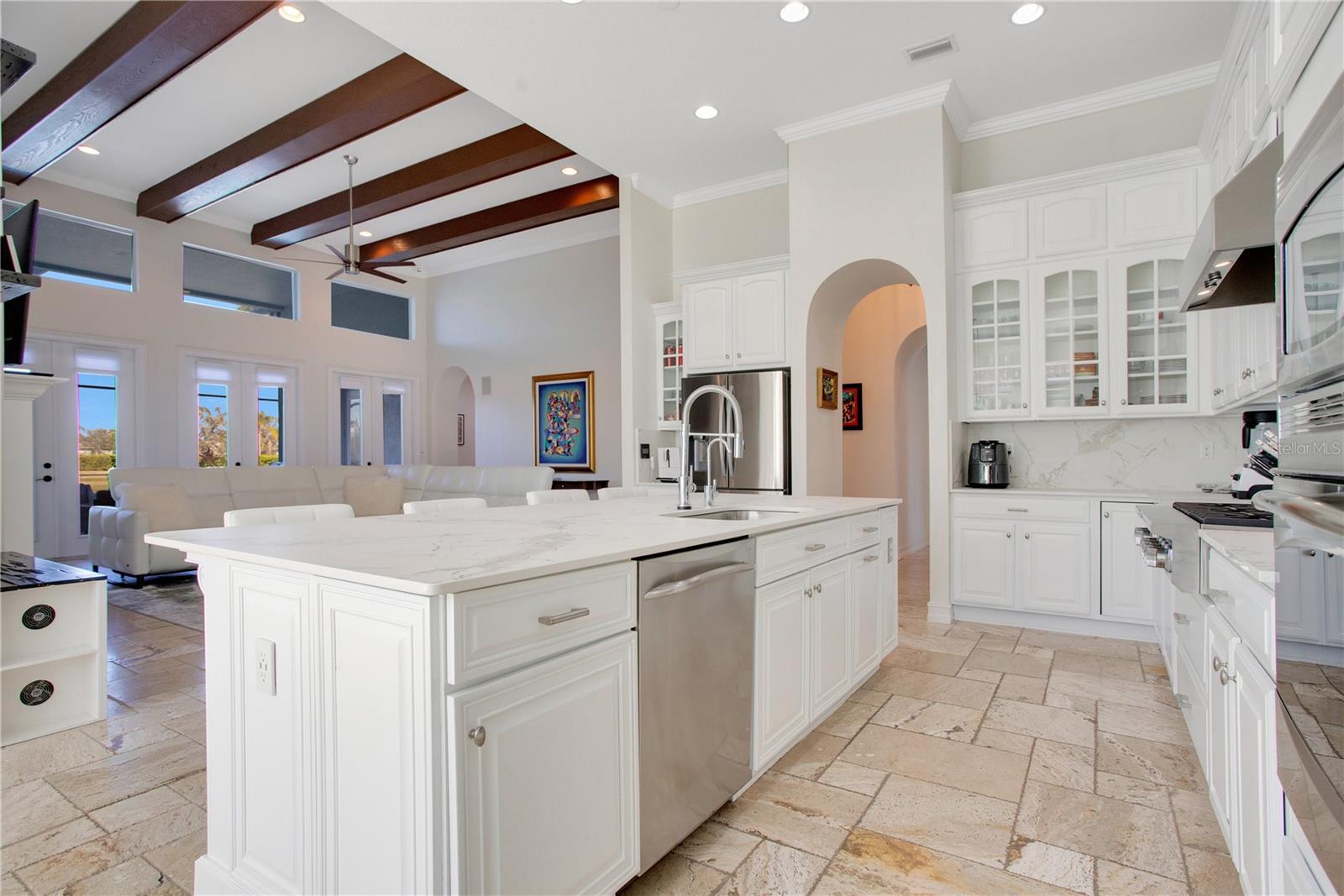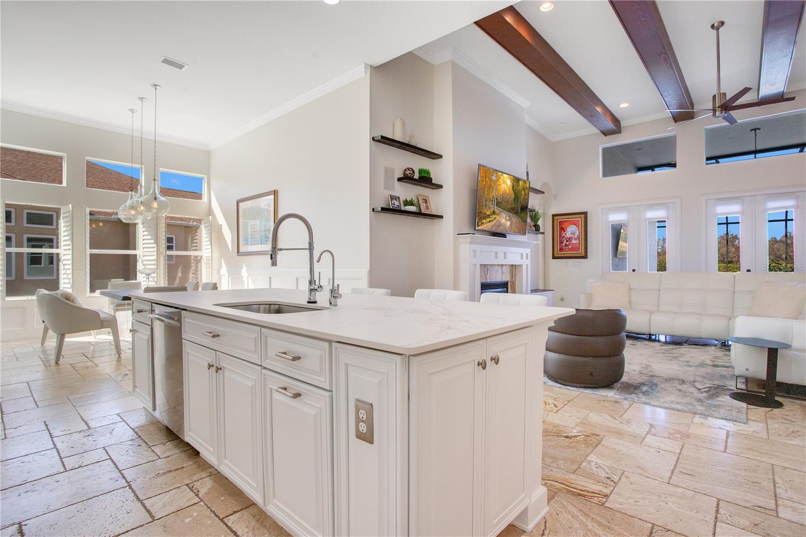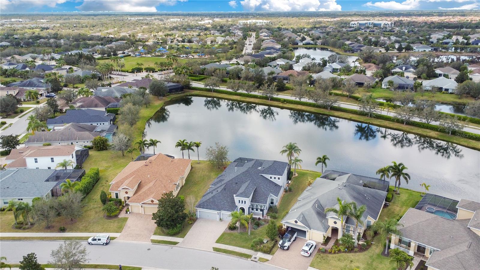 Set in Central Park, this Cardel Homes Dolcetto III model spans over 4,000 sq ft with pond views, this premium homesite features a bright residence overflowing with classic charm and updated beauty. The open floorplan includes four beds, four baths, great room, an office, flex space and an upstairs bonus room. It has an open floor plan, high ceilings, smart home technology, and exquisite finishes. The kitchen includes light cabinetry, quartz counters, a large island, built-in oven and microwave, Viking gas cooktop, and walk-in pantry. The primary suite (18'x25') has a gas fireplace, beamed ceiling, garden tub, private water closet, and spacious walk-in closet. Guest rooms have large closets. The Great room opens to a covered seating area, heated pool and pond views. Additional features include quartz counters, pool bath, tray and coffered ceilings, and tankless water heater. The exterior is freshly painted, a new roof was installed in 2003, there is an oversized three-car garage EV charger ready. Flooring is travertine and new engineered hardwood throughout. Community amenities are abundant, close to airports, shopping, and activities. Central Park is part of Lakewood Ranch, a top-selling community near shopping, dining, entertainment, I-75, beaches, schools, and medical facilities.
