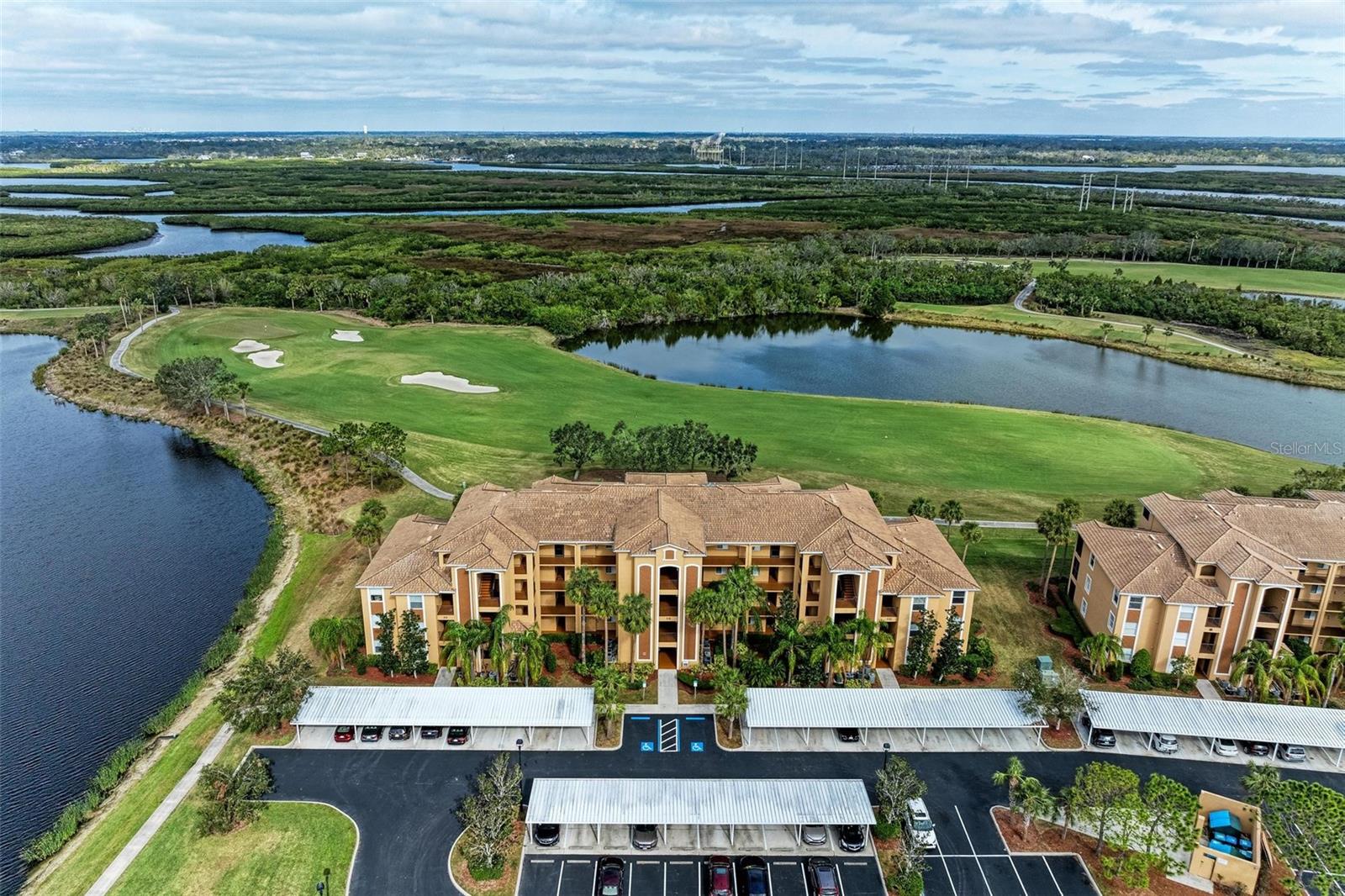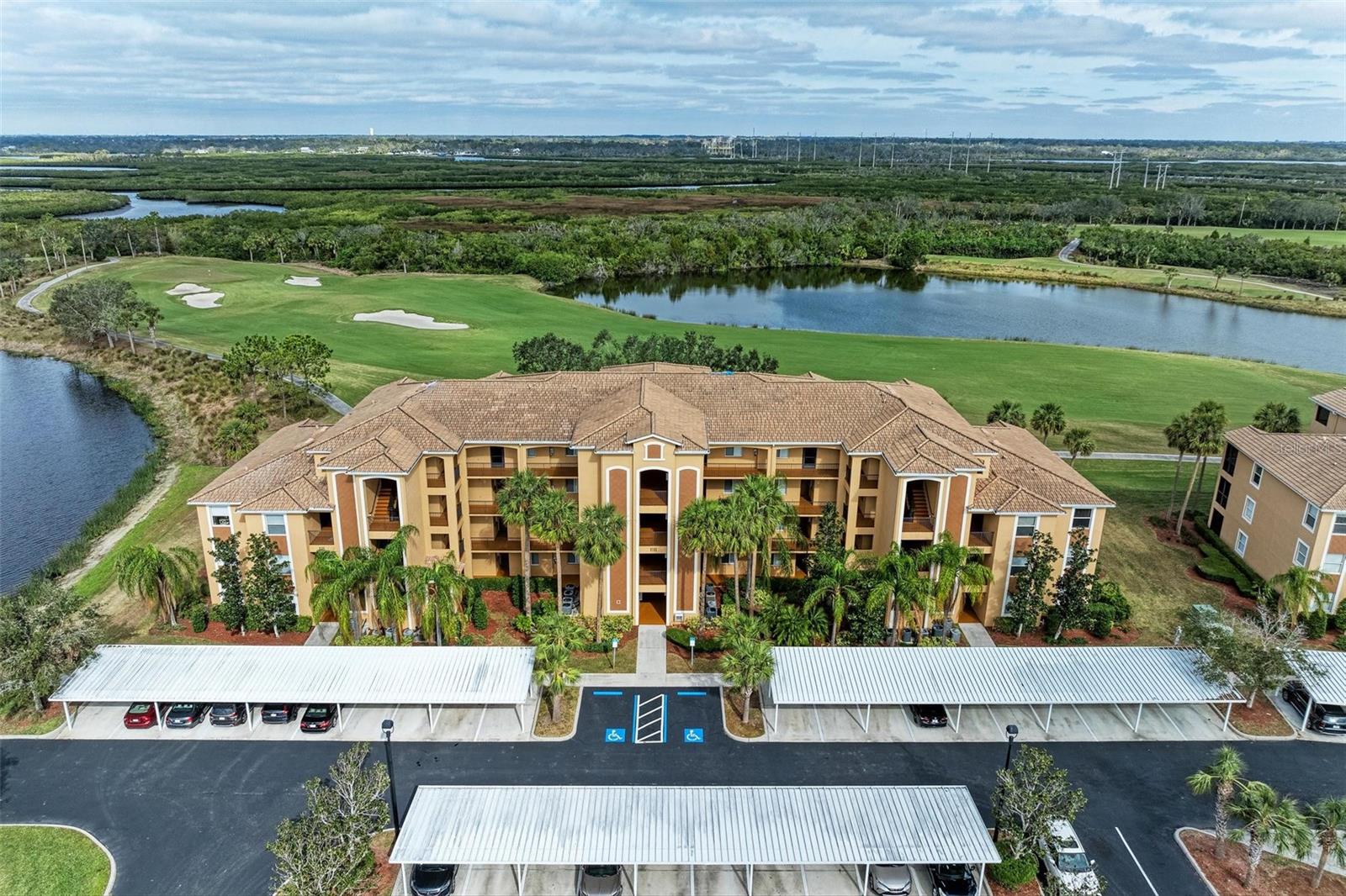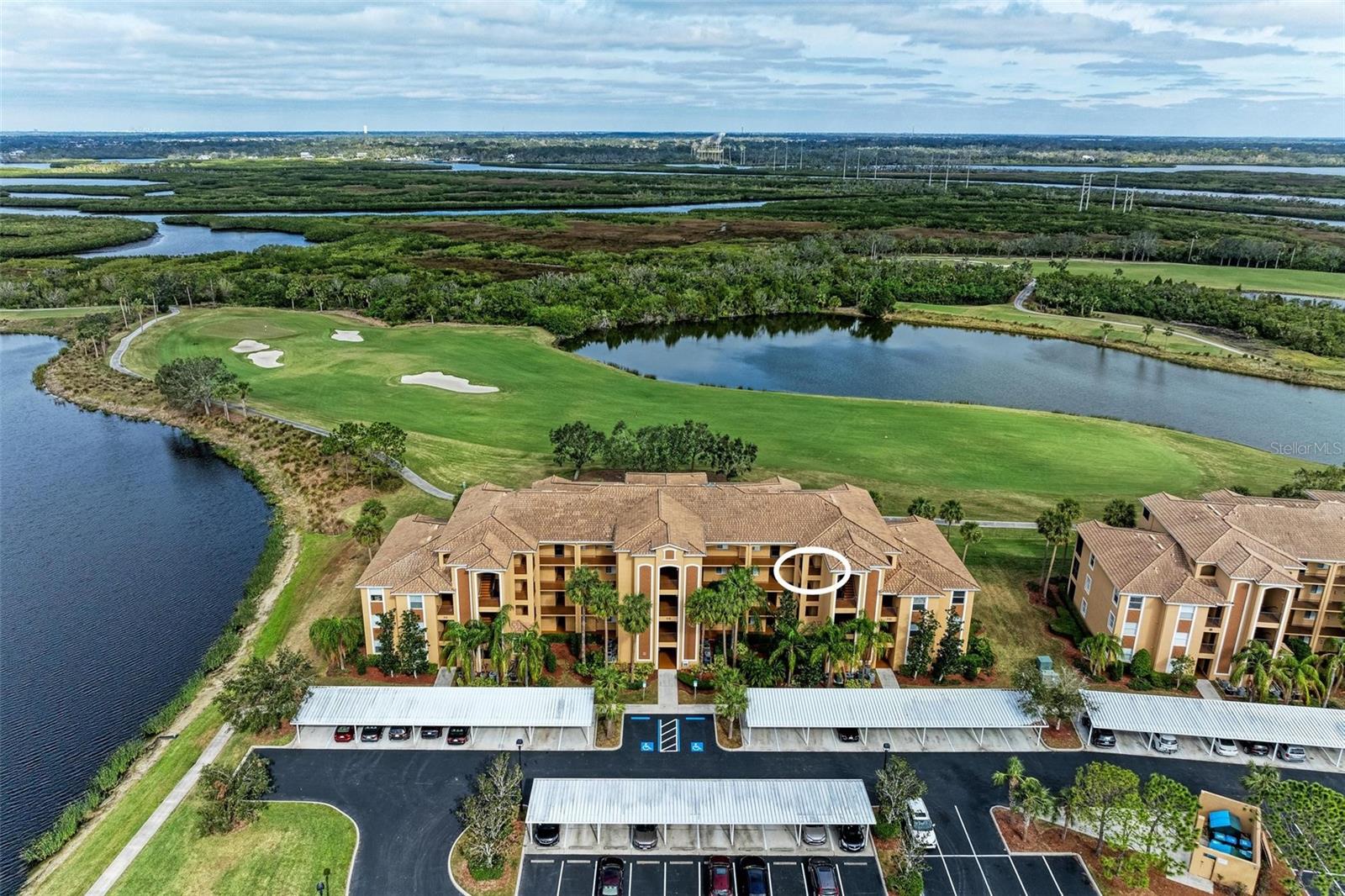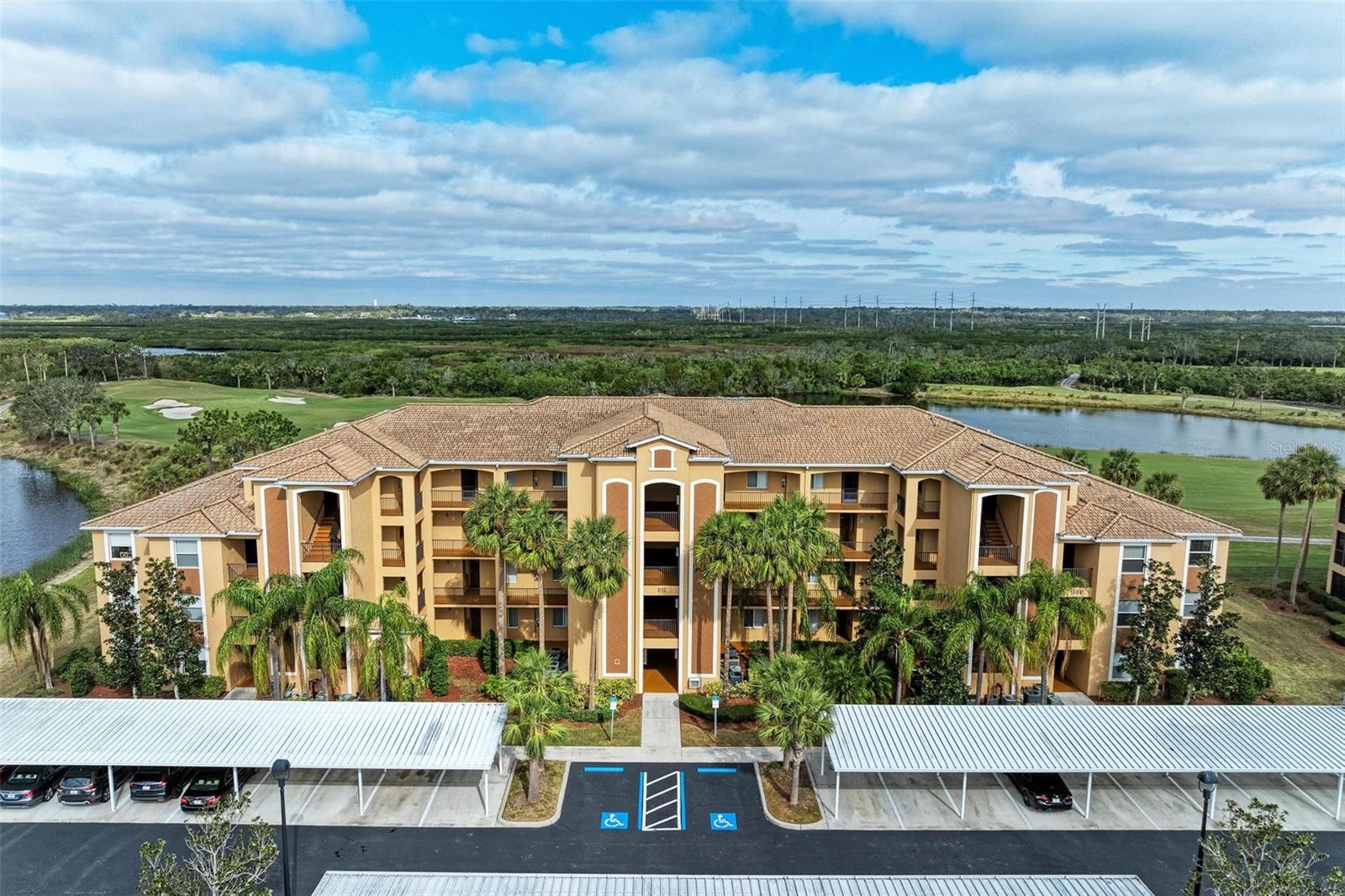 NEW PRICE REDUCTION!! SELLER MOTIVATED!! BRING OFFERS!! START YOUR FLORIDA LIFE in this THIRD FLOOR, TURNKEY FURNISHED Condominium home in the gated resort community of River Strand Golf & Country Club! Decorated in bright and vibrant custom paint and furnishings, this residence will make you smile each time you walk in the door! MOVE IN READY and GOLF DEEDED, this is the one you can make your primary residence, or second home AND it has great rental potential as well! Featuring FANTASTIC WATER, PRESERVE and GOLF VIEWS off of the private screened lanai, sit back, relax and take in the vistas and pristine golf course views that River Strand is known for! With an OPEN FLOOR PLAN, and a design that is both versatile and functional this model is a favorite. The eat-in kitchen overlooks the great room with fireplace and a flex/dining space adjacent is perfect for a desk, additional dining area or additional guests. The primary offers a large walk-in and en suite and guests and family will enjoy their own guest room with a guest bath adjacent. A generous storage room and a designated covered carport complete the property. River Strand truly has it all with 27 holes of recently redesigned Arthur Hills golf, clubhouse with RESTAURANT and grille room, 2 community pools and spas, 6 satellite pools, tennis and pickle ball courts, 2 fitness centers and social and fitness events and activities year round! Perfectly located minutes to I-75 and the new Marketplace and close to the beautiful beaches of the Gulf Coast! So make this year your best yet and come and experience River Strand at it's best, you may never want to leave!