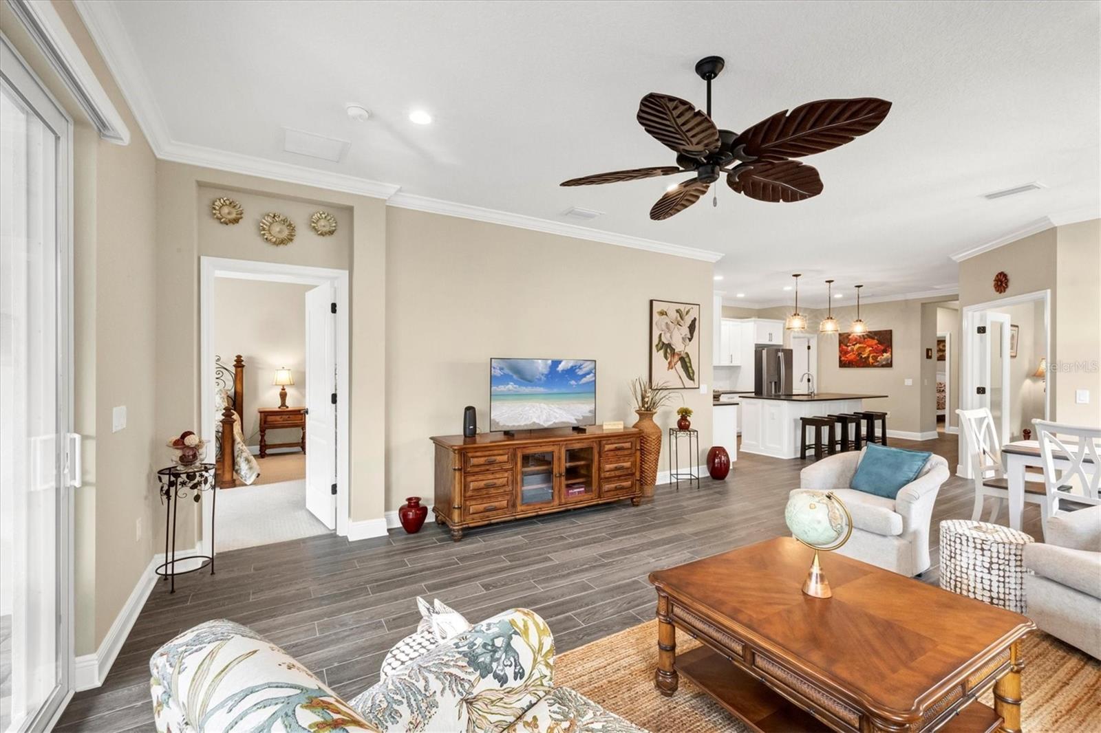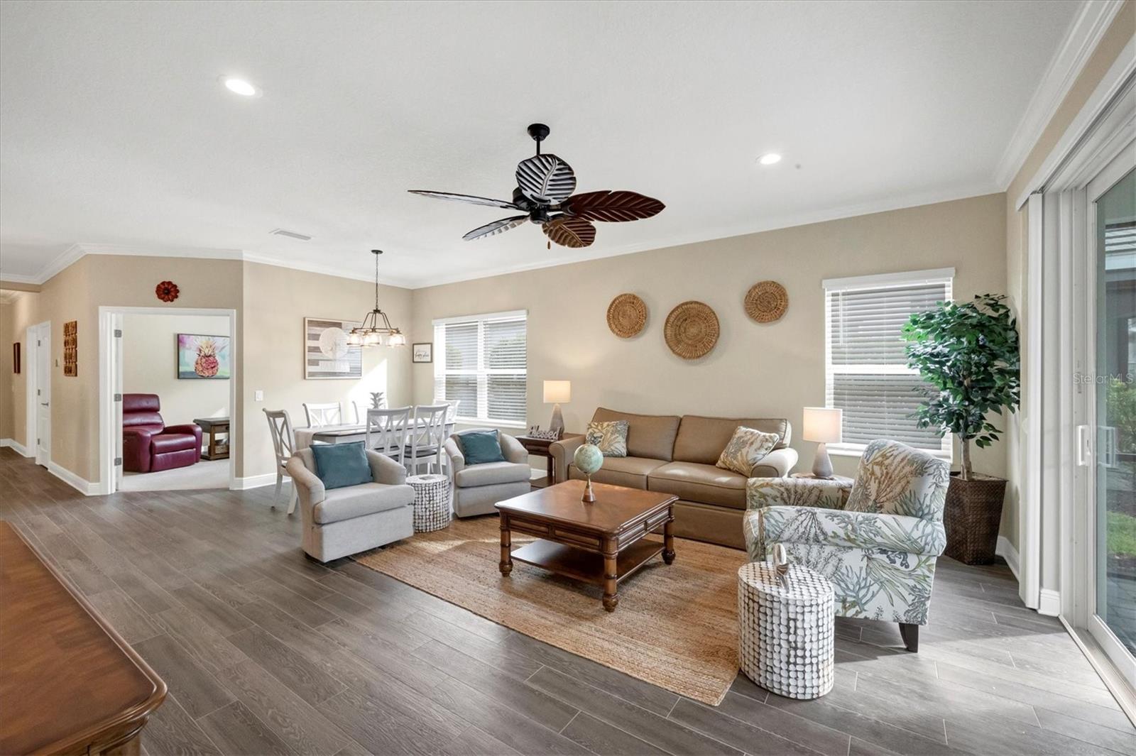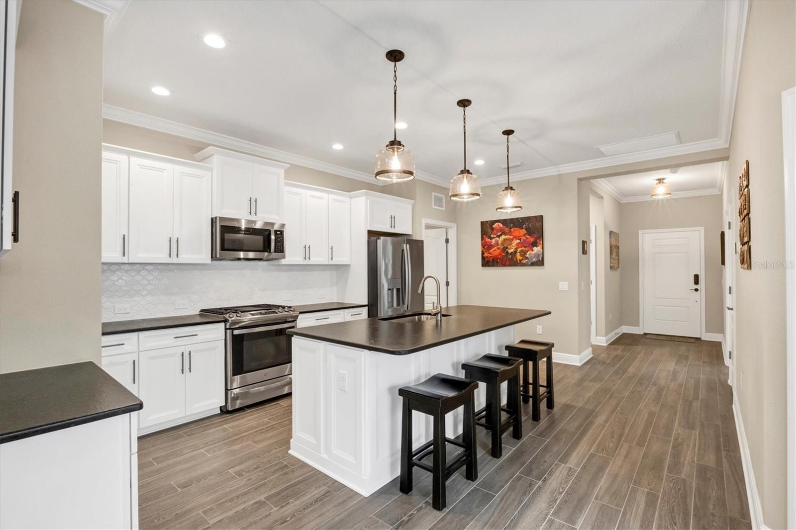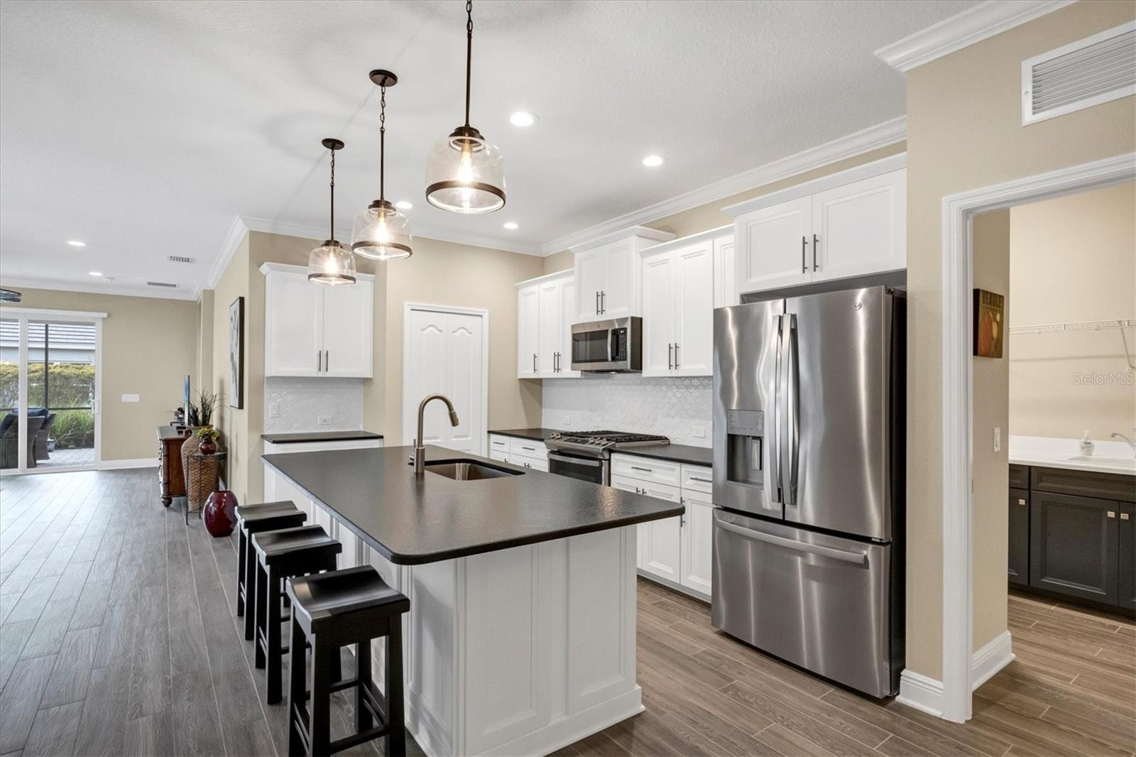 Feast your eyes on this stunning ''Sandcastle'' 2021 built villa that was constructed to the most recent HURRICANE building codes! This meticulously cared for villa boasts 3 bedrooms, 2 bathrooms, a generous sized study/den, indoor laundry room, large two-car garage and extended lanai with premium pavers! This home is situated next to a cul-de-sac AND an emergency only gate which makes this one of the quietest streets in the community. Your new villa also has ''smart home'' capabilities which allows you to remotely adjust your thermostat, open and close your garage as well as lock and unlock the front door! Rest assured your new villa is built strong and safe with its Insulated cinder block construction, concrete tile roof, HURRICANE IMPACT WINDOWS throughout AND desirable "X'' floodzone. Throughout the home you will find 5 1/4" deco baseboards, LED recessed lighting, 16-seer rated TRANE HVAC, crown molding, upgraded ceramic tile and much more! The luxurious master suite offers TWO oversized walk-in closets, separate his and hers vanities with quartz countertops AND a large walk-in shower with upgraded tile all the way up to the ceiling. The kitchen boasts a large Island with breakfast bar, custom pullouts for convenient storage, 5-burner natural gas stove, matching stainless steel appliances, custom porcelain backsplash and upgraded shaker cabinets that complement the premium granite countertops. The great room with its expansive tall ceilings with crown molding showcases a spacious environment with more than enough room to entertain guests. Open the large three paneled HURRICANE IMPACT sliders and be amazed at the amount of room the paver rich extended screened lanai provides which is truly a peaceful, undisturbed Florida retreat. Your new lanai also comes equipped with a builder grade gas line for a direct connection to your favorite grill OR your own new kitchenette. Indigo is an active community that features a full time on-site manager as well as a full time activities director that manages an extensive calendar of activities for all ages. A-Rated Gullett Elementary AND Mona Jain Middle School are right outside our gates too! You can also expect sidewalks on both sides of the street, ''Oasis'' pool/spa, resort style heated community pool/spa at the main clubhouse where you will find 5 cabanas with an abundance of seating, 4 pickleball courts, 2 bocce ball courts, 24-hour exercise gym, meeting room/banquet room and playground. Indigo is not only a community that takes care of all ground maintenance to include mowing, fertilizing, irrigation, shrubs and mulch but is right around the corner to a plethora of dining, banking, entertainment, public transportation and MORE!