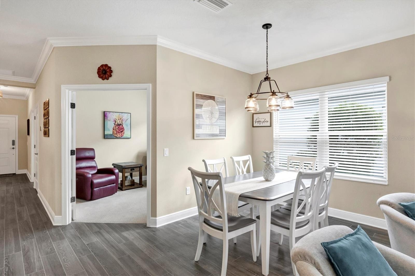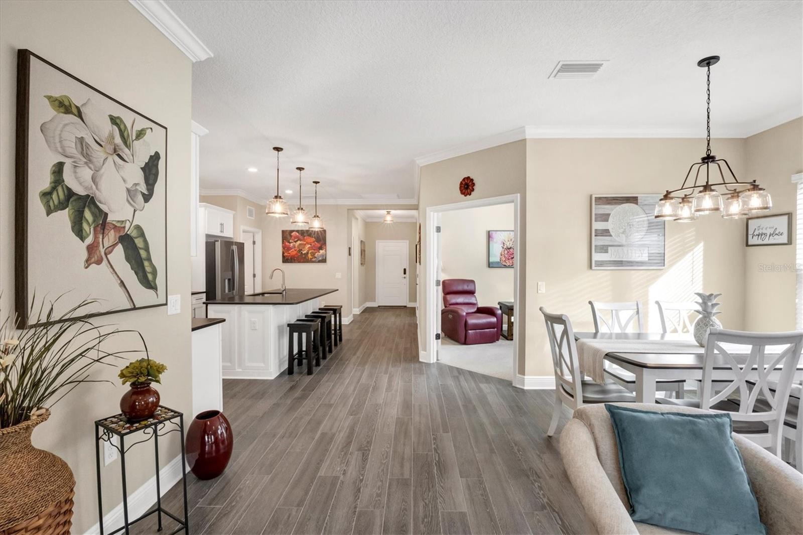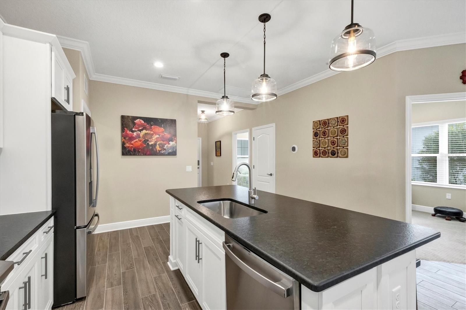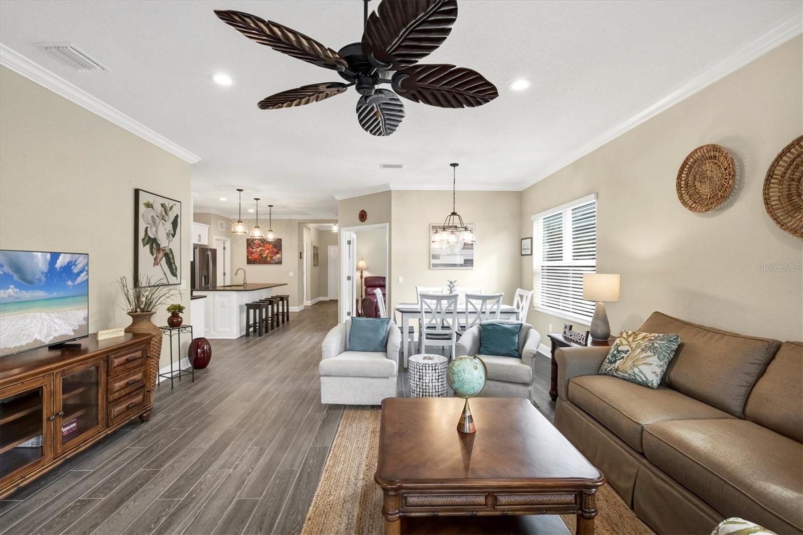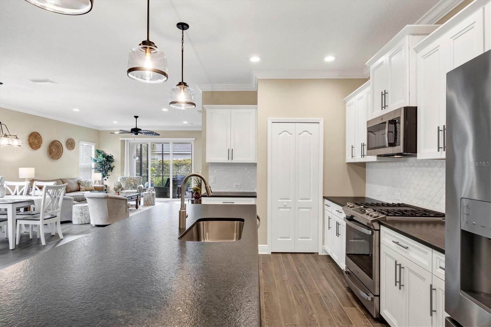 Feast your eyes on this stunning ''Sandcastle'' 2021 built villa that was constructed to the most recent HURRICANE building codes! This meticulously cared for villa boasts 3 bedrooms, 2 bathrooms, a generous sized study/den, indoor laundry room, large two-car garage and extended lanai with premium pavers! This home is situated next to a cul-de-sac AND an emergency only gate which makes this one of the quietest streets in the community. Your new villa also has ''smart home'' capabilities which allows you to remotely adjust your thermostat, open and close your garage as well as lock and unlock the front door! Rest assured your new villa is built strong and safe with its Insulated cinder block construction, concrete tile roof, HURRICANE IMPACT WINDOWS throughout AND desirable "X'' floodzone. Throughout the home you will find 5 1/4" deco baseboards, LED recessed lighting, 16-seer rated TRANE HVAC, crown molding, upgraded ceramic tile and much more! The luxurious master suite offers TWO oversized walk-in closets, separate his and hers vanities with quartz countertops AND a large walk-in shower with upgraded tile all the way up to the ceiling. The kitchen boasts a large Island with breakfast bar, custom pullouts for convenient storage, 5-burner natural gas stove, matching stainless steel appliances, custom porcelain backsplash and upgraded shaker cabinets that complement the premium granite countertops. The great room with its expansive tall ceilings with crown molding showcases a spacious environment with more than enough room to entertain guests. Open the large three paneled HURRICANE IMPACT sliders and be amazed at the amount of room the paver rich extended screened lanai provides which is truly a peaceful, undisturbed Florida retreat. Your new lanai also comes equipped with a builder grade gas line for a direct connection to your favorite grill OR your own new kitchenette. Indigo is an active community that features a full time on-site manager as well as a full time activities director that manages an extensive calendar of activities for all ages. A-Rated Gullett Elementary AND Mona Jain Middle School are right outside our gates too! You can also expect sidewalks on both sides of the street, ''Oasis'' pool/spa, resort style heated community pool/spa at the main clubhouse where you will find 5 cabanas with an abundance of seating, 4 pickleball courts, 2 bocce ball courts, 24-hour exercise gym, meeting room/banquet room and playground. Indigo is not only a community that takes care of all ground maintenance to include mowing, fertilizing, irrigation, shrubs and mulch but is right around the corner to a plethora of dining, banking, entertainment, public transportation and MORE!