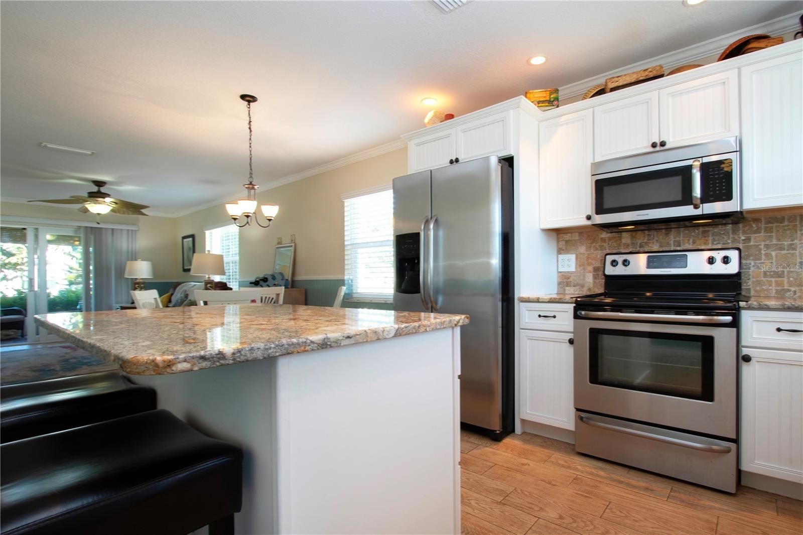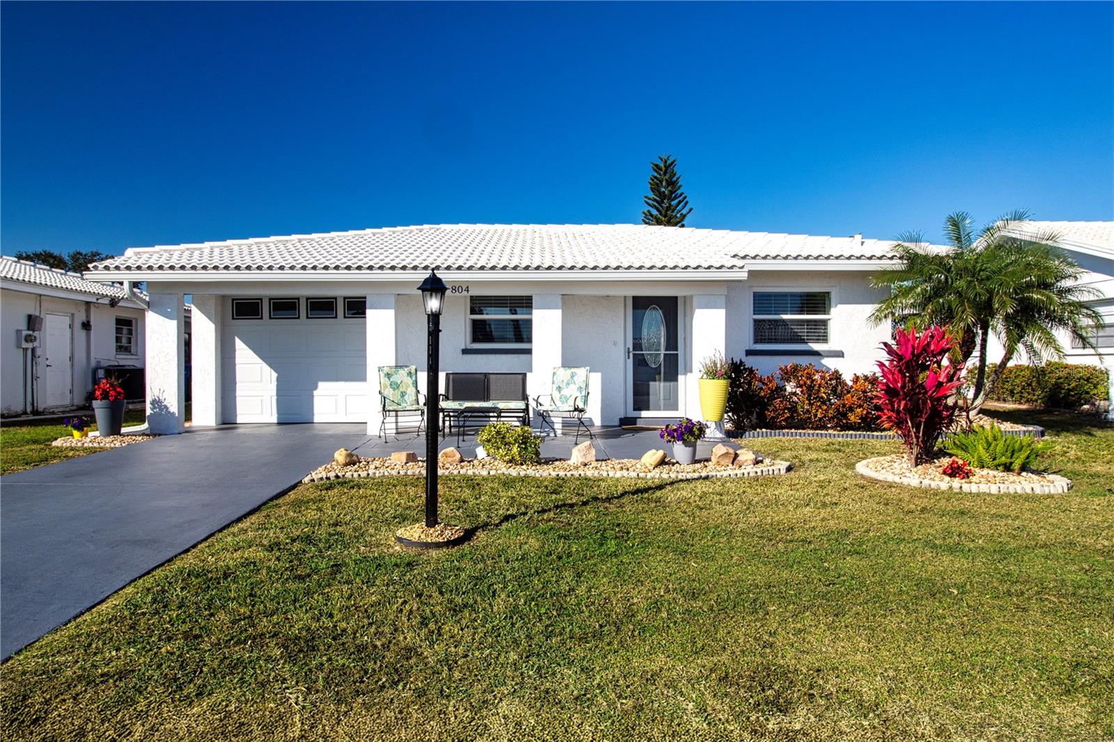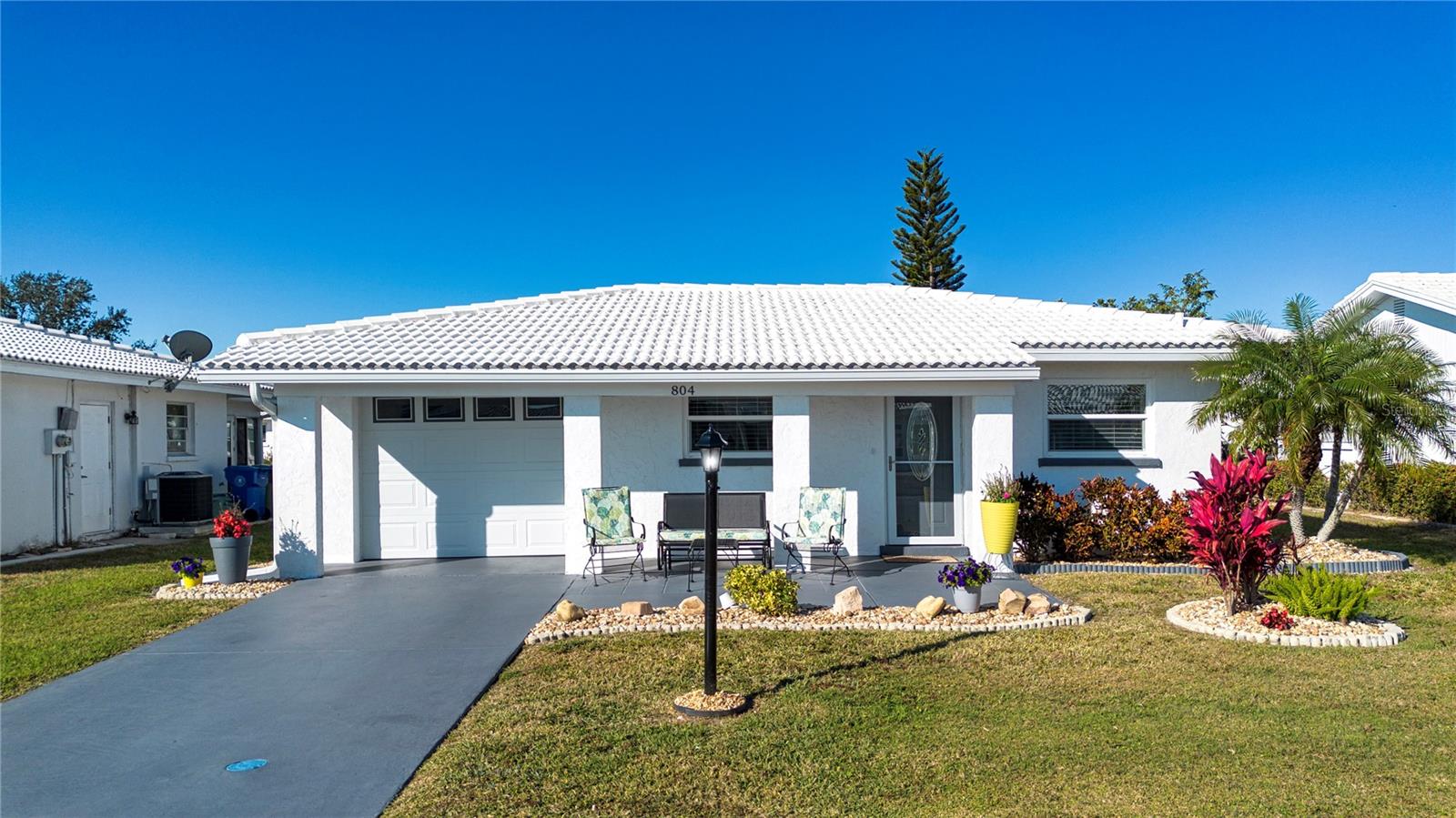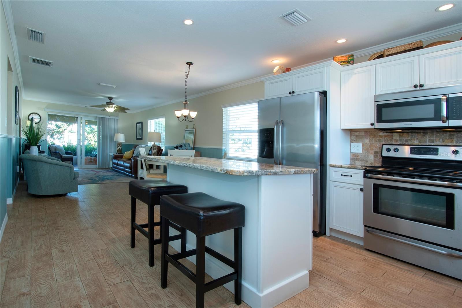 Looking for a vibrant community? River Isles is a highly desirable 55+, pet friendly, deed restricted, golf course community. Monthly HOA fees are $60. This is a charming turn key with 2 bedroom, 2 full bath home with open concept kitchen and living area. You will appreciate this well maintained and completely renovated home. Features include: ceramic plank flooring throughout, hurricane rated windows plus two 8' reversible sliding doors, upgraded electrical panel, newer HVAC ductwork, ceiling fans, upgraded lighting, beautiful granite counter tops throughout, travertine kitchen backsplash, light and bright solid wood cabinetry, island seating, New Samsung French door, bottom freezer refrigerator, and dishwasher. In addition, both full baths provide comfort height commodes and vanities, complimented by large framed mirrors. Lovely crown molding and fresh coastal paint colors throughout. Relax and admire the beautiful surroundings from the screened Lanai with roll down hurricane shutters. Also, an attached golf cart garage with pull down garage door and the 48 volt golf cart is included. The landscape provides both privacy and tranquility. Imagine sipping a sunrise cup of coffee on the front porch patio and/or grilling on the backyard patio. River Isles offers amenities such as clubhouse, shuffle board, library, billiards, fitness room, heated pool, and much more. River Isles Golf Club is a favorite spot for the golf enthusiasts - with a 9-hole executive golf course and an option to join a yearly membership with unlimited golf, making it an accessible and affordable option. In addition to the wonderful amenities offered in this community, River Isles is conveniently located with easy access to bus line, interstate 75, shopping centers, entertainment hubs, restaurants, airports, and medical facilities. If you are seeking a community that offers both a peaceful environment with amenities and activities, River Isles is the perfect place for you.