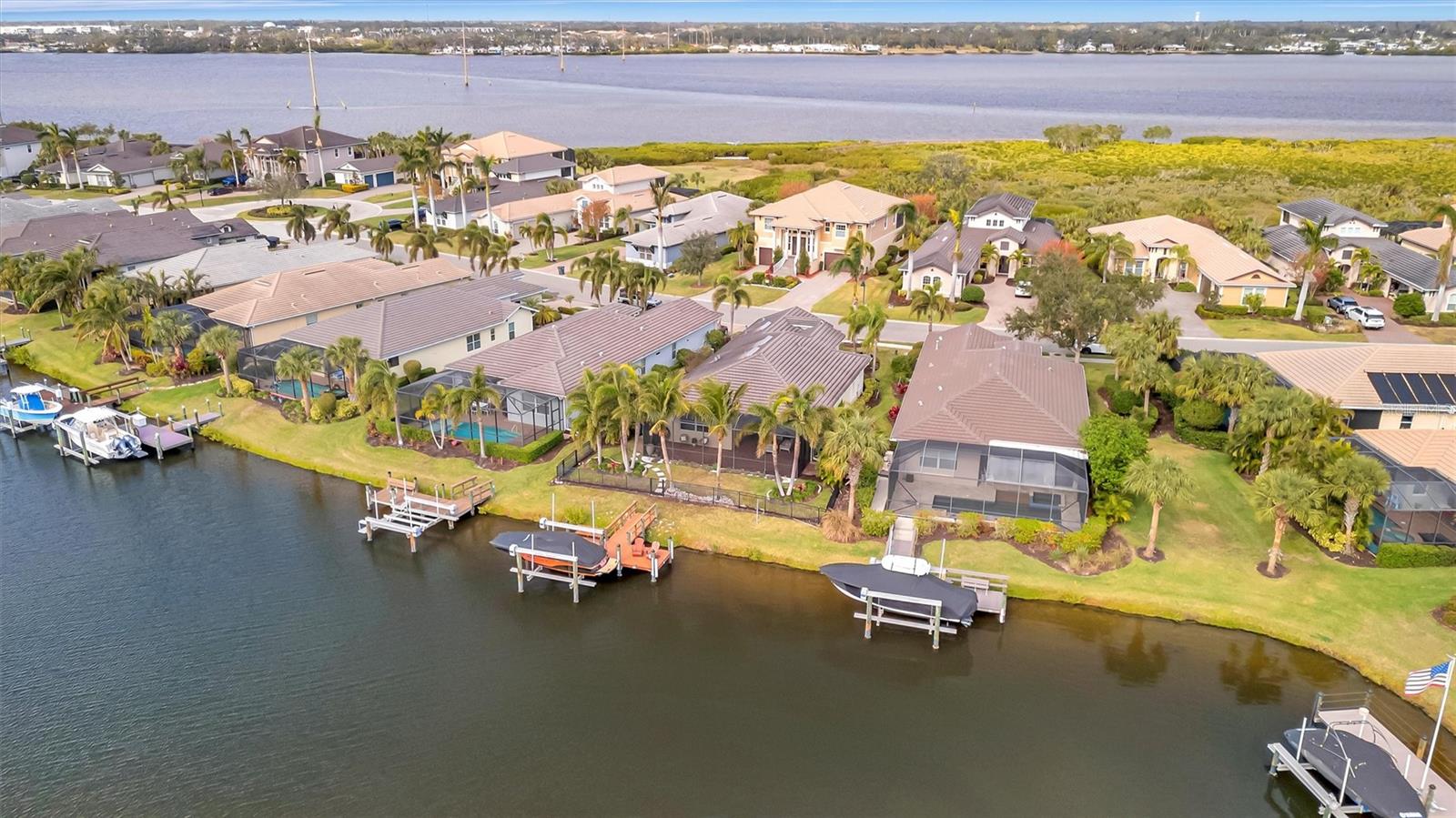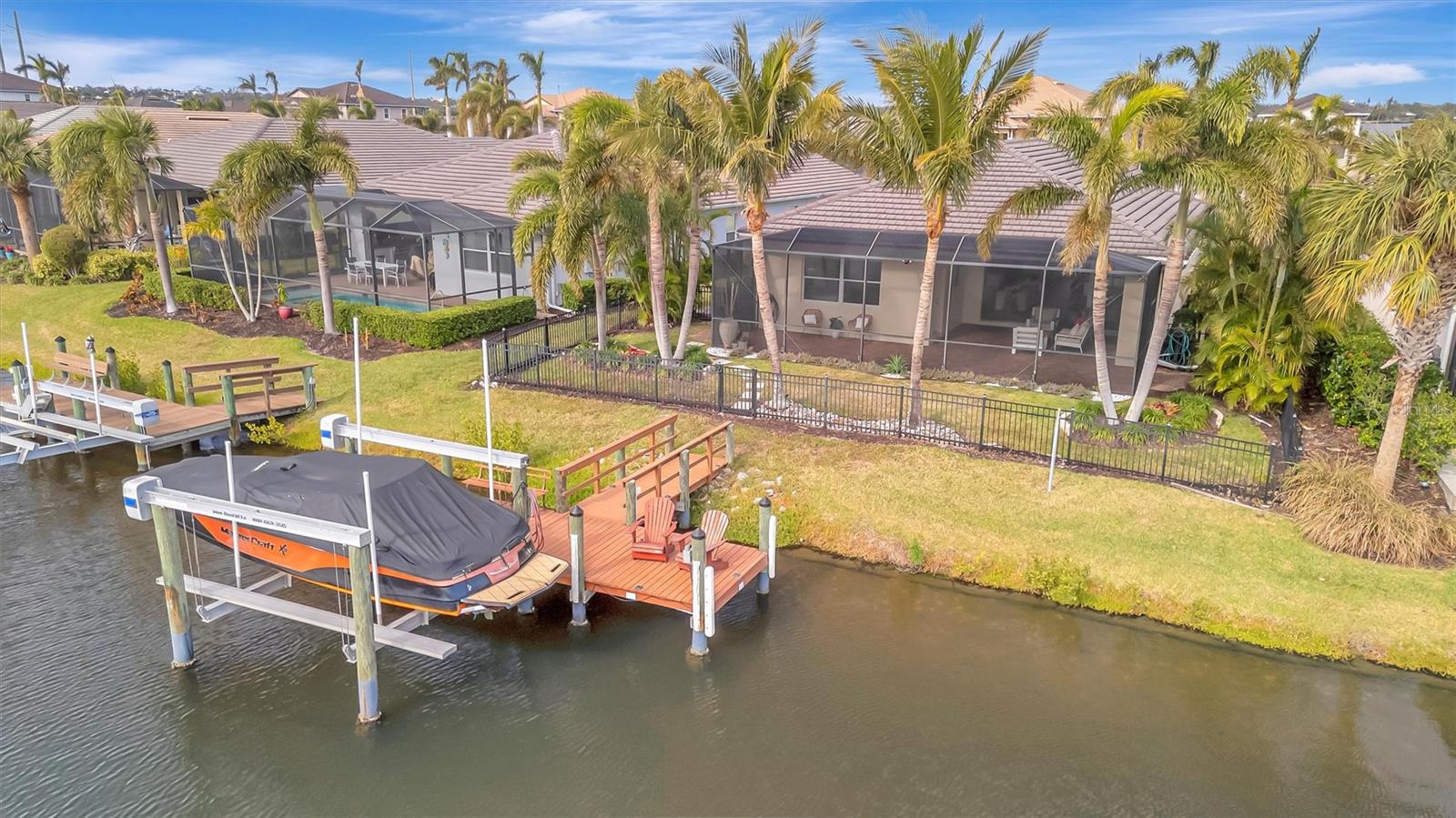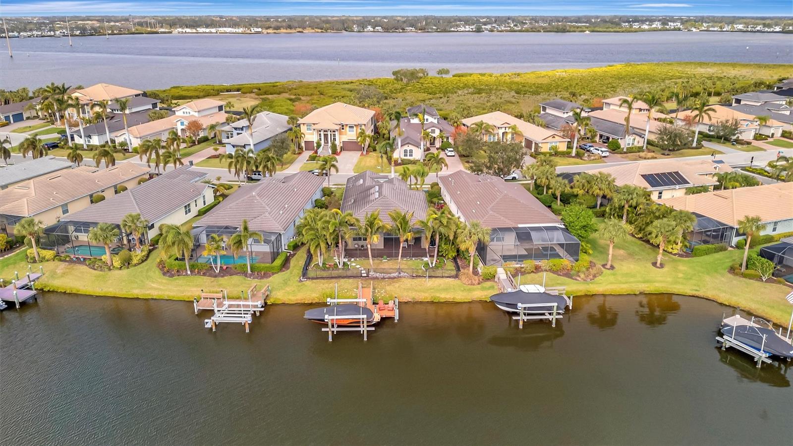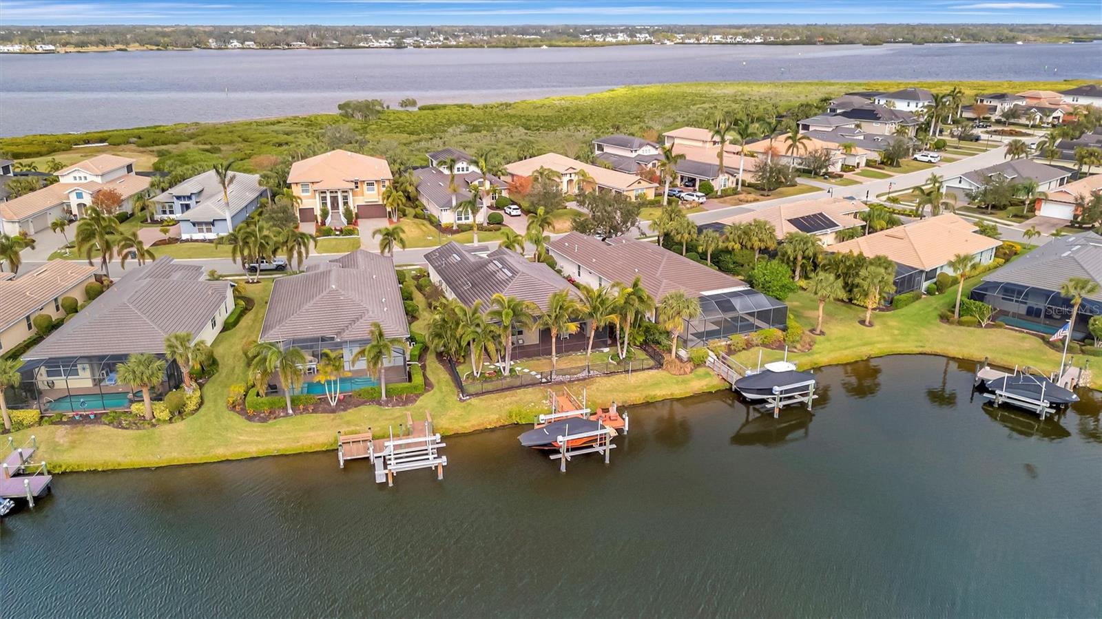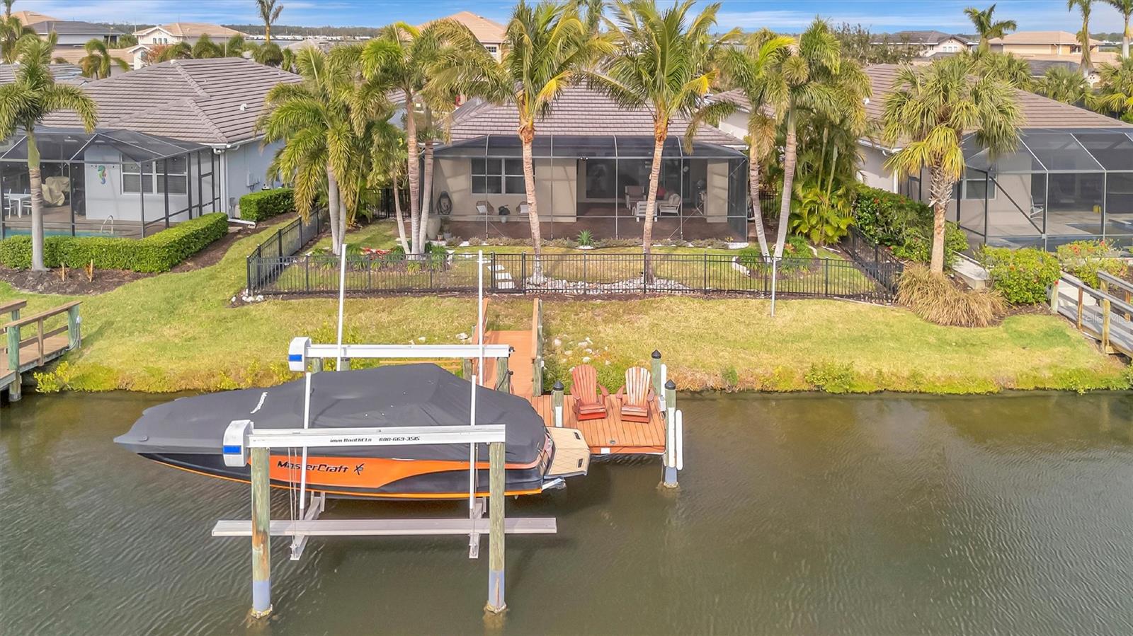 Come and tour this stunning 3-bedroom + den, 2-bath, 2-car garage Tidewater Preserve home, complete with a private boat dock and 10,000 lb lift, offering direct river access! This beautifully upgraded residence features luxury vinyl flooring, soaring 10+ foot ceilings, elegant crown molding, remote-controlled blinds, and dimmable lighting throughout. The open-concept kitchen boasts custom cabinetry, white subway tile backsplash, granite countertops, and a spacious island with a counter bar overlooking the great room. Four sliding glass doors seamlessly blend indoor and outdoor living, leading to an expansive outdoor retreat with a built-in grill—perfect for entertaining or unwinding in the evening breeze. A stylish office off the entry, enhanced with French doors and a sliding glass pocket door, provides both privacy and versatility. The luxurious primary suite showcases tray ceilings, two closets, an en-suite bath, and private access to the outdoor living space. The spa-like primary bathroom features a garden tub, dual vanities, a custom shower enclosure, and a private water closet. The 58.8 x 24 extended covered paver patio is an outdoor oasis, featuring custom hardwood ceilings, outdoor grill and an outdoor fan. It adjoins a screened lanai with a walkout to the fenced rear yard—perfect for pets or play. For boating enthusiasts, the community boat lift provides easy access to the Manatee River, allowing you to arrive at your favorite waterfront restaurant in style or embark on a scenic adventure to Anna Maria Island or Egmont Key. Located in the gated boating community of Tidewater Preserve, this home offers 24-hour guard security for peace of mind. Residents enjoy top-tier amenities, including a 3 resort-style pool, clubhouse, 2 fitness center, tennis courts, riverfront nature trails, dog park, playground, kayak launch, and marina. Best of all—No CDD fees! End each day with breathtaking sunsets from your private dock, embracing the ultimate waterfront lifestyle. An exceptional home in a premier waterfront community—don’t miss your opportunity to make it yours!
