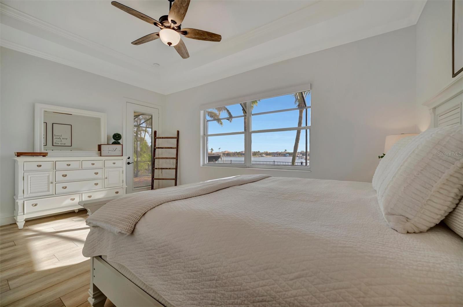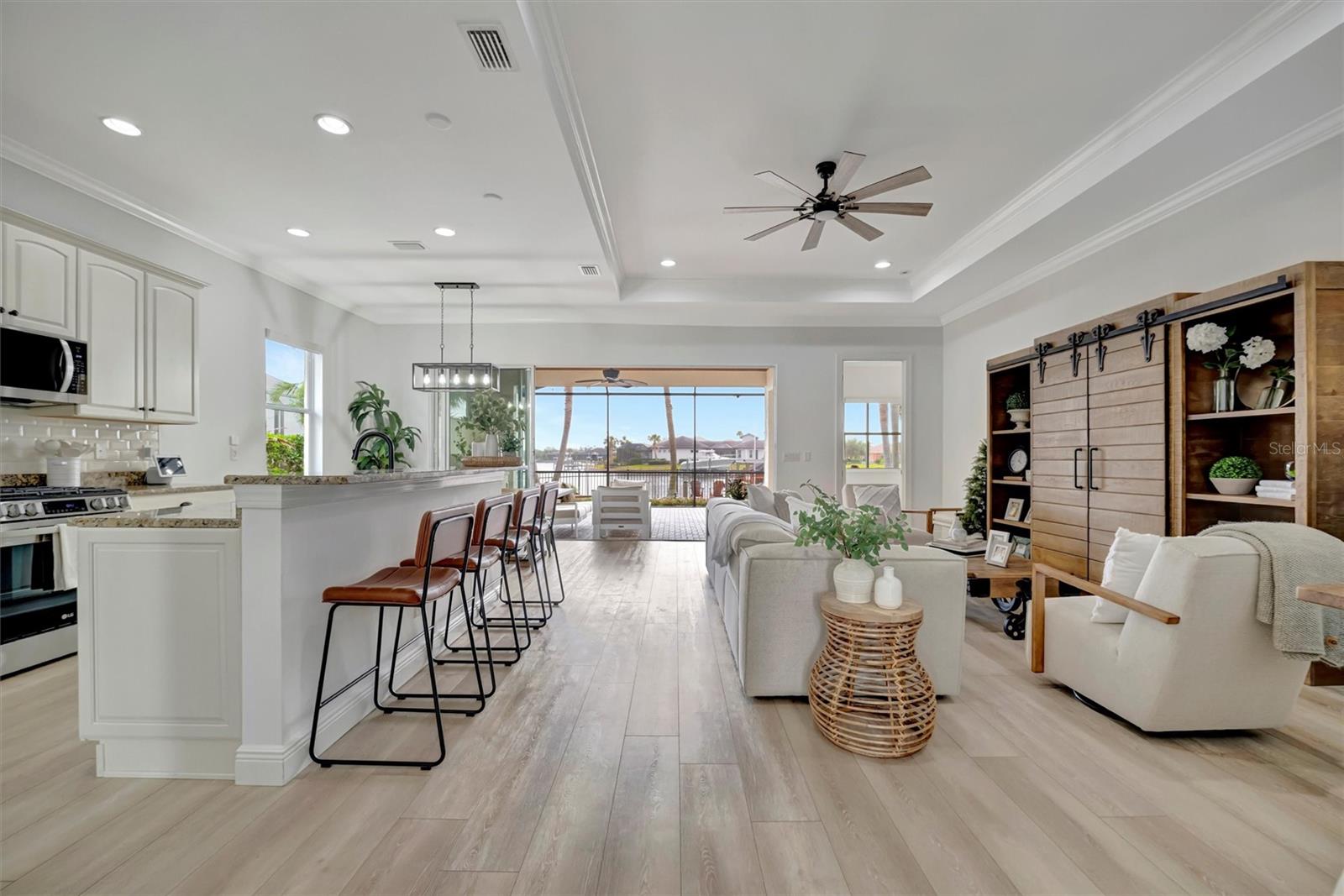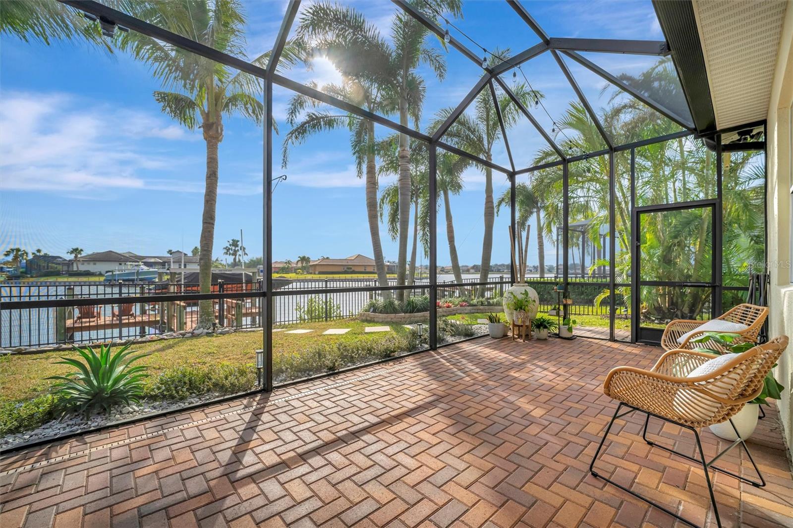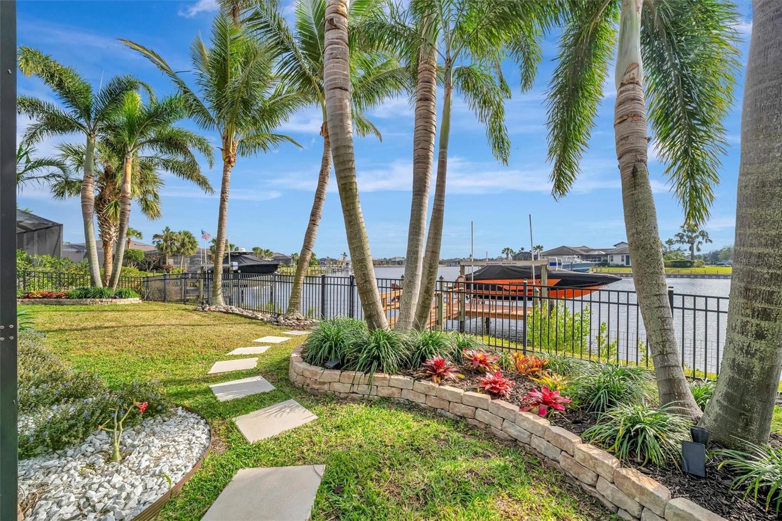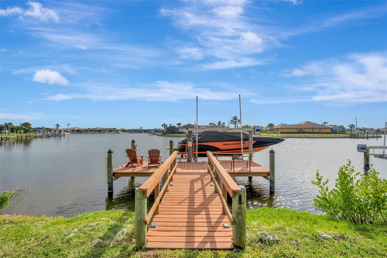 Come and tour this stunning 3-bedroom + den, 2-bath, 2-car garage Tidewater Preserve home, complete with a private boat dock and 10,000 lb lift, offering direct river access! This beautifully upgraded residence features luxury vinyl flooring, soaring 10+ foot ceilings, elegant crown molding, remote-controlled blinds, and dimmable lighting throughout. The open-concept kitchen boasts custom cabinetry, white subway tile backsplash, granite countertops, and a spacious island with a counter bar overlooking the great room. Four sliding glass doors seamlessly blend indoor and outdoor living, leading to an expansive outdoor retreat with a built-in grill—perfect for entertaining or unwinding in the evening breeze. A stylish office off the entry, enhanced with French doors and a sliding glass pocket door, provides both privacy and versatility. The luxurious primary suite showcases tray ceilings, two closets, an en-suite bath, and private access to the outdoor living space. The spa-like primary bathroom features a garden tub, dual vanities, a custom shower enclosure, and a private water closet. The 58.8 x 24 extended covered paver patio is an outdoor oasis, featuring custom hardwood ceilings, outdoor grill and an outdoor fan. It adjoins a screened lanai with a walkout to the fenced rear yard—perfect for pets or play. For boating enthusiasts, the community boat lift provides easy access to the Manatee River, allowing you to arrive at your favorite waterfront restaurant in style or embark on a scenic adventure to Anna Maria Island or Egmont Key. Located in the gated boating community of Tidewater Preserve, this home offers 24-hour guard security for peace of mind. Residents enjoy top-tier amenities, including a 3 resort-style pool, clubhouse, 2 fitness center, tennis courts, riverfront nature trails, dog park, playground, kayak launch, and marina. Best of all—No CDD fees! End each day with breathtaking sunsets from your private dock, embracing the ultimate waterfront lifestyle. An exceptional home in a premier waterfront community—don’t miss your opportunity to make it yours!