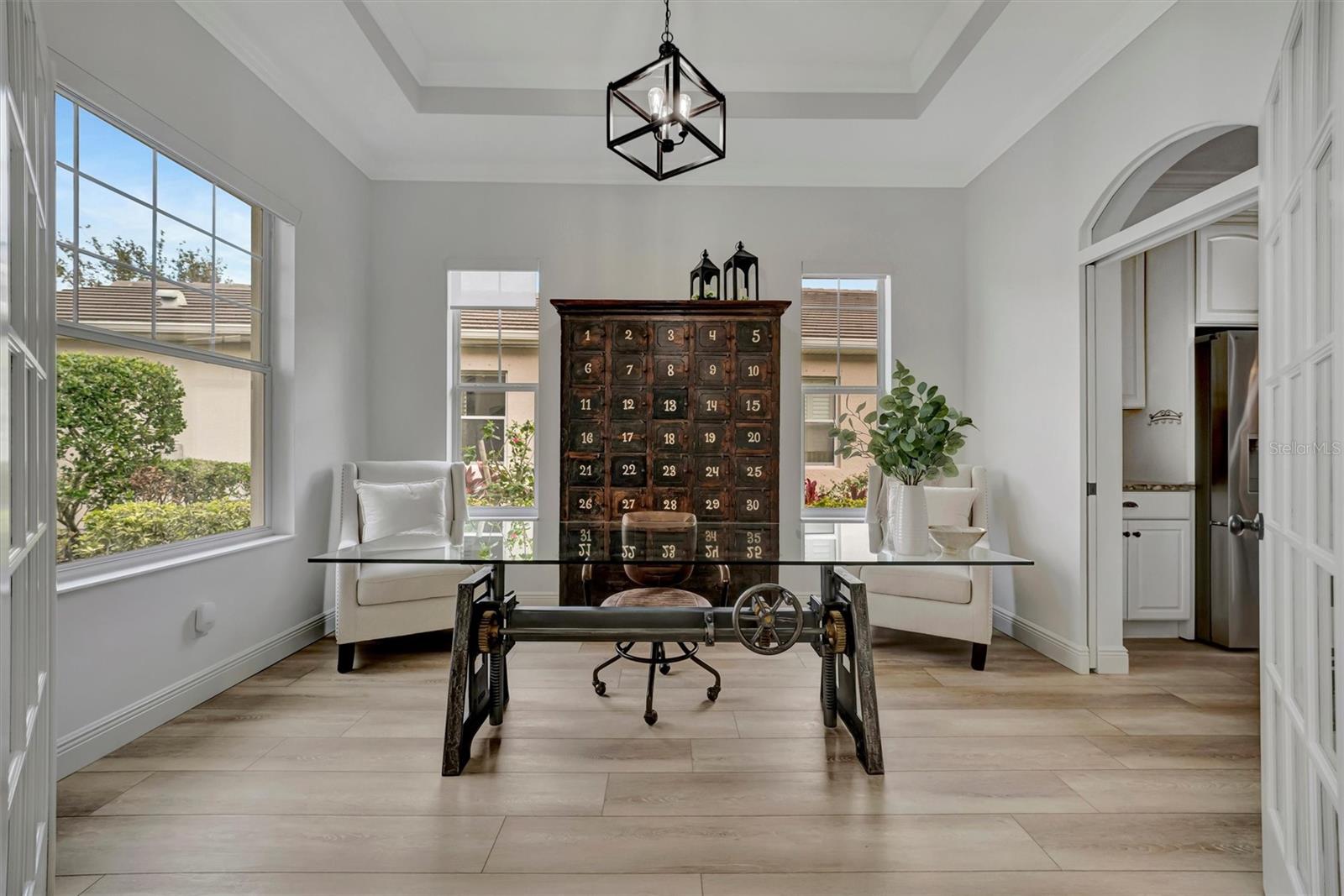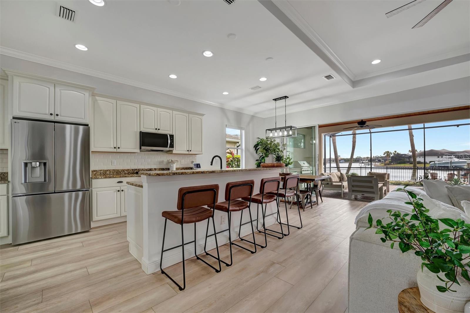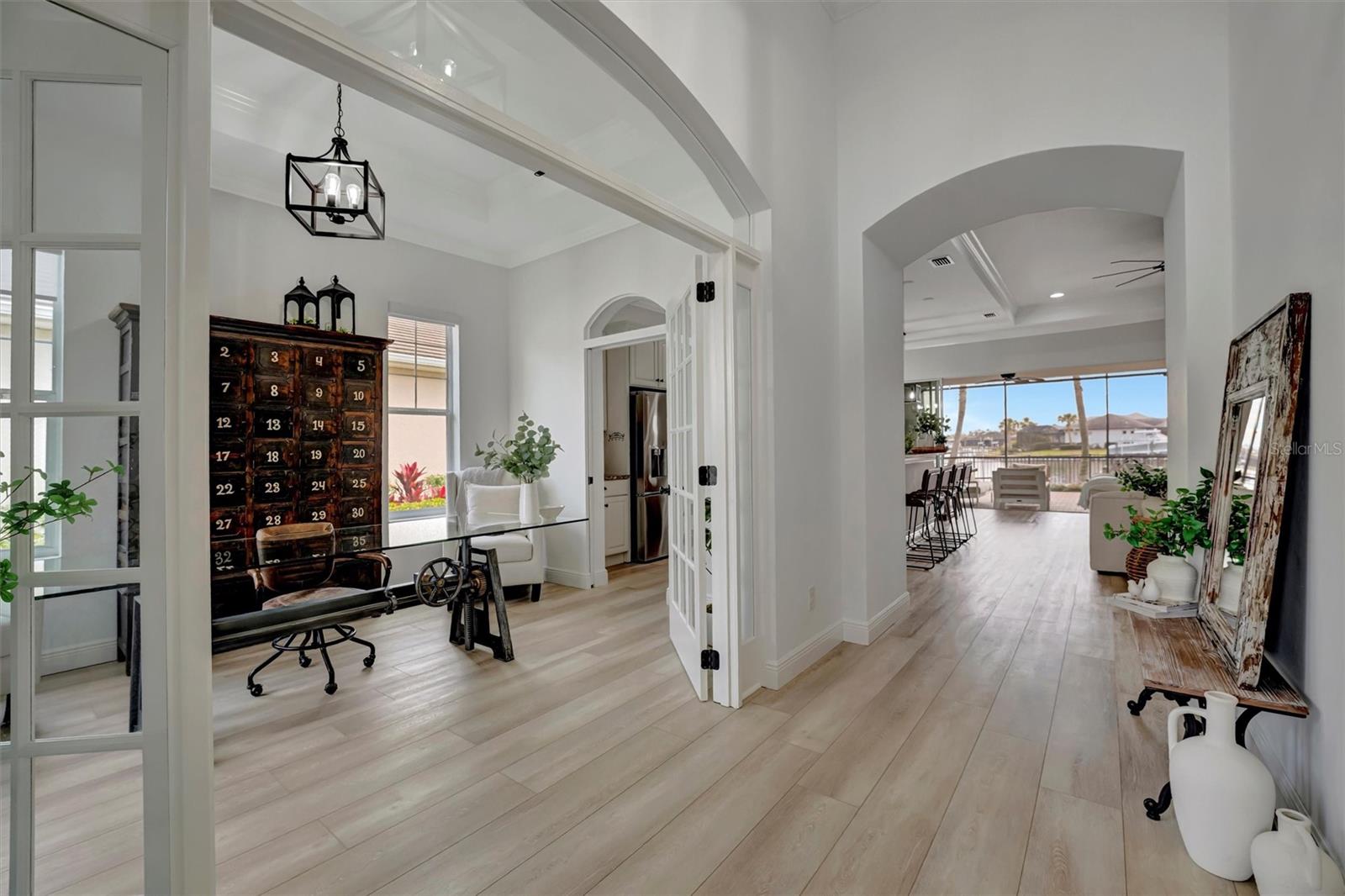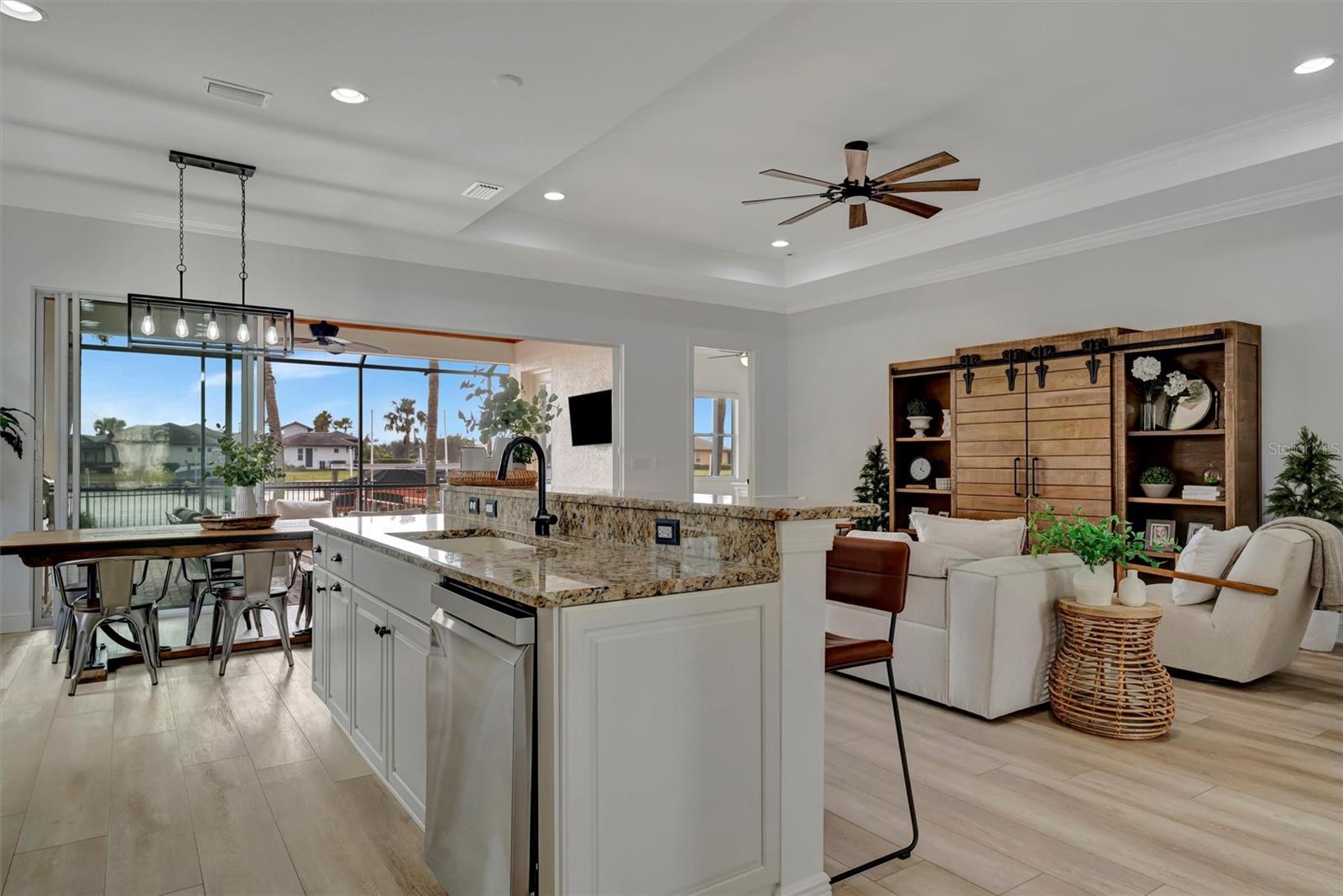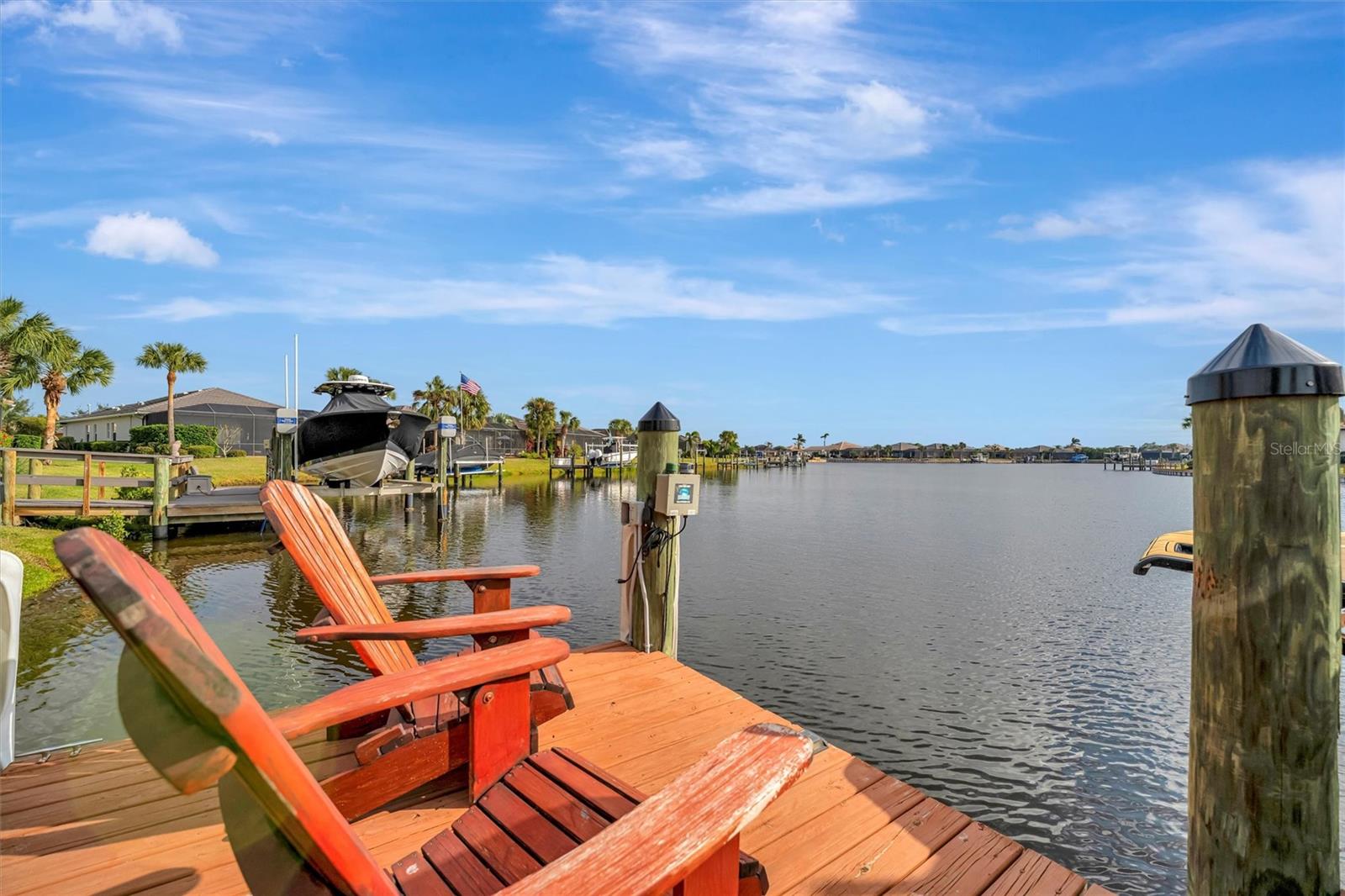 Come and tour this stunning 3-bedroom + den, 2-bath, 2-car garage Tidewater Preserve home, complete with a private boat dock and 10,000 lb lift, offering direct river access! This beautifully upgraded residence features luxury vinyl flooring, soaring 10+ foot ceilings, elegant crown molding, remote-controlled blinds, and dimmable lighting throughout. The open-concept kitchen boasts custom cabinetry, white subway tile backsplash, granite countertops, and a spacious island with a counter bar overlooking the great room. Four sliding glass doors seamlessly blend indoor and outdoor living, leading to an expansive outdoor retreat with a built-in grill—perfect for entertaining or unwinding in the evening breeze. A stylish office off the entry, enhanced with French doors and a sliding glass pocket door, provides both privacy and versatility. The luxurious primary suite showcases tray ceilings, two closets, an en-suite bath, and private access to the outdoor living space. The spa-like primary bathroom features a garden tub, dual vanities, a custom shower enclosure, and a private water closet. The 58.8 x 24 extended covered paver patio is an outdoor oasis, featuring custom hardwood ceilings, outdoor grill and an outdoor fan. It adjoins a screened lanai with a walkout to the fenced rear yard—perfect for pets or play. For boating enthusiasts, the community boat lift provides easy access to the Manatee River, allowing you to arrive at your favorite waterfront restaurant in style or embark on a scenic adventure to Anna Maria Island or Egmont Key. Located in the gated boating community of Tidewater Preserve, this home offers 24-hour guard security for peace of mind. Residents enjoy top-tier amenities, including a 3 resort-style pool, clubhouse, 2 fitness center, tennis courts, riverfront nature trails, dog park, playground, kayak launch, and marina. Best of all—No CDD fees! End each day with breathtaking sunsets from your private dock, embracing the ultimate waterfront lifestyle. An exceptional home in a premier waterfront community—don’t miss your opportunity to make it yours!