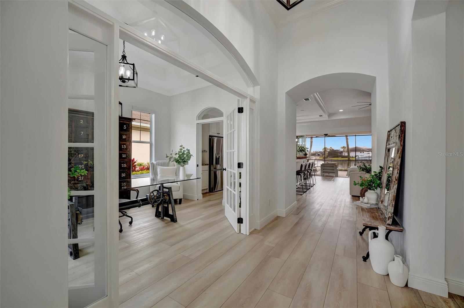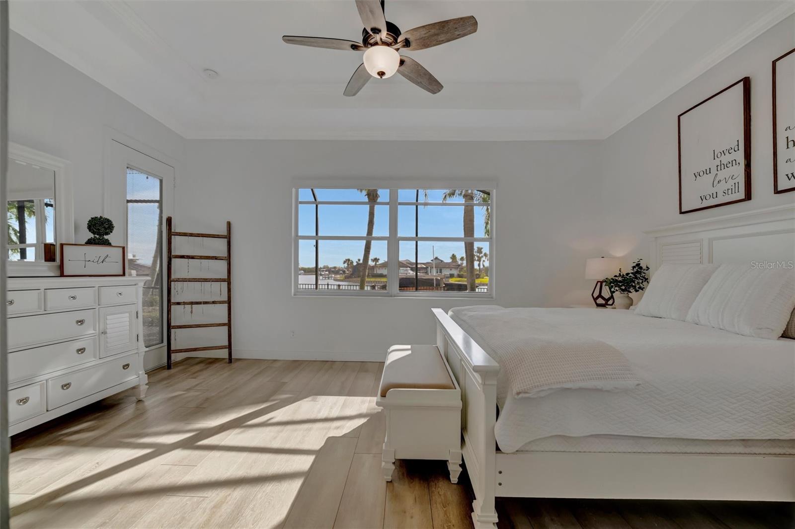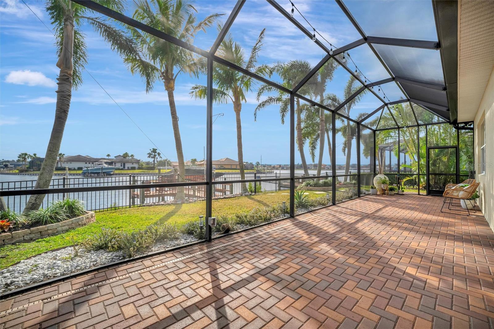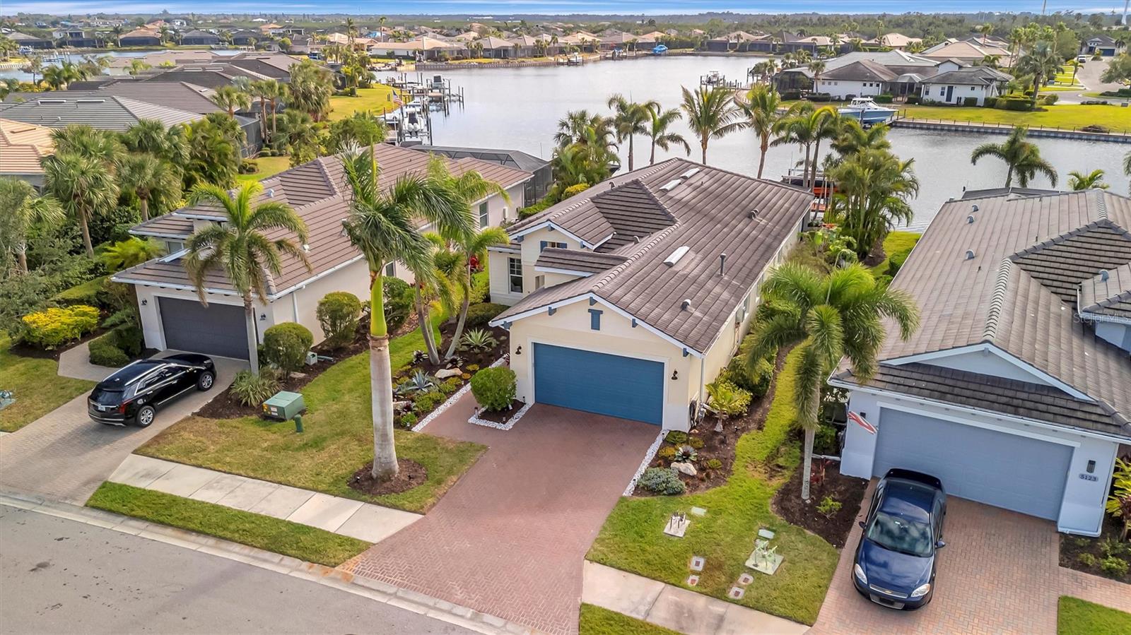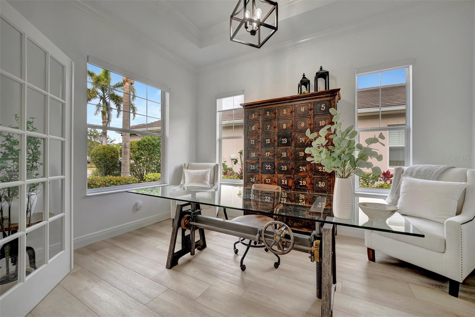 Come and tour this stunning 3-bedroom + den, 2-bath, 2-car garage Tidewater Preserve home, complete with a private boat dock and 10,000 lb lift, offering direct river access! This beautifully upgraded residence features luxury vinyl flooring, soaring 10+ foot ceilings, elegant crown molding, remote-controlled blinds, and dimmable lighting throughout. The open-concept kitchen boasts custom cabinetry, white subway tile backsplash, granite countertops, and a spacious island with a counter bar overlooking the great room. Four sliding glass doors seamlessly blend indoor and outdoor living, leading to an expansive outdoor retreat with a built-in grill—perfect for entertaining or unwinding in the evening breeze. A stylish office off the entry, enhanced with French doors and a sliding glass pocket door, provides both privacy and versatility. The luxurious primary suite showcases tray ceilings, two closets, an en-suite bath, and private access to the outdoor living space. The spa-like primary bathroom features a garden tub, dual vanities, a custom shower enclosure, and a private water closet. The 58.8 x 24 extended covered paver patio is an outdoor oasis, featuring custom hardwood ceilings, outdoor grill and an outdoor fan. It adjoins a screened lanai with a walkout to the fenced rear yard—perfect for pets or play. For boating enthusiasts, the community boat lift provides easy access to the Manatee River, allowing you to arrive at your favorite waterfront restaurant in style or embark on a scenic adventure to Anna Maria Island or Egmont Key. Located in the gated boating community of Tidewater Preserve, this home offers 24-hour guard security for peace of mind. Residents enjoy top-tier amenities, including a 3 resort-style pool, clubhouse, 2 fitness center, tennis courts, riverfront nature trails, dog park, playground, kayak launch, and marina. Best of all—No CDD fees! End each day with breathtaking sunsets from your private dock, embracing the ultimate waterfront lifestyle. An exceptional home in a premier waterfront community—don’t miss your opportunity to make it yours!