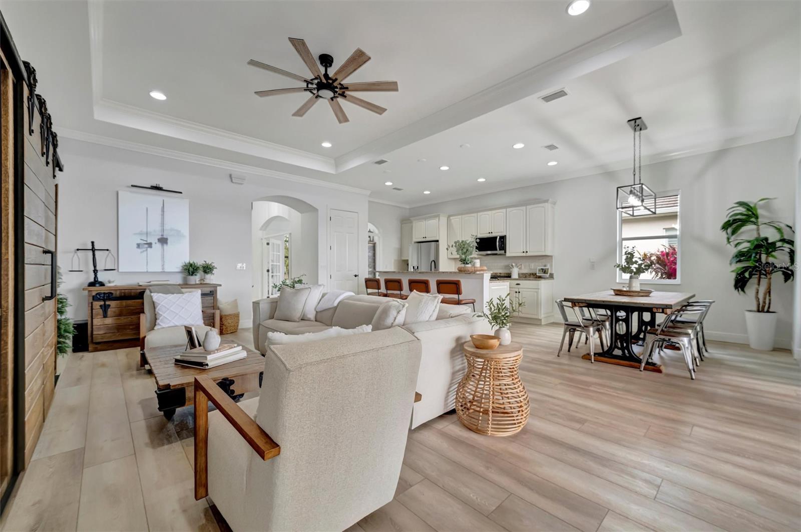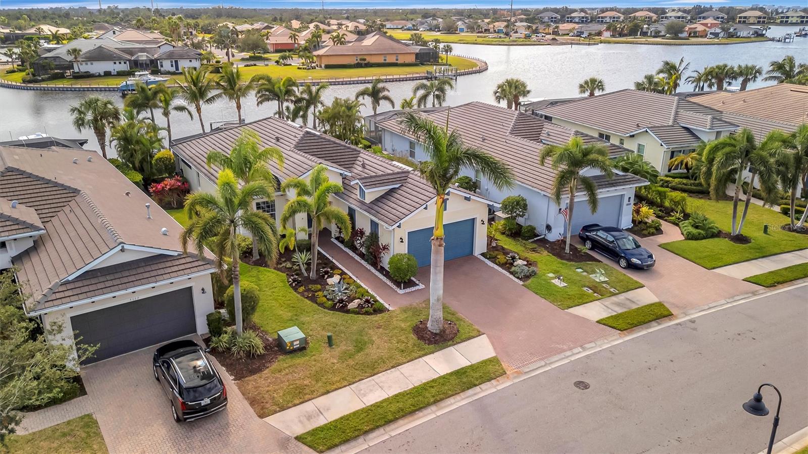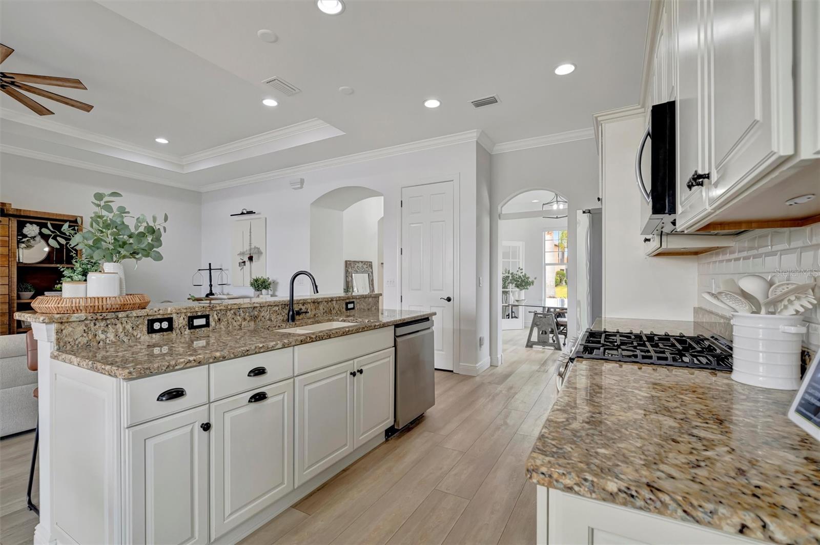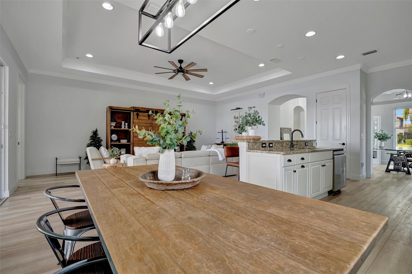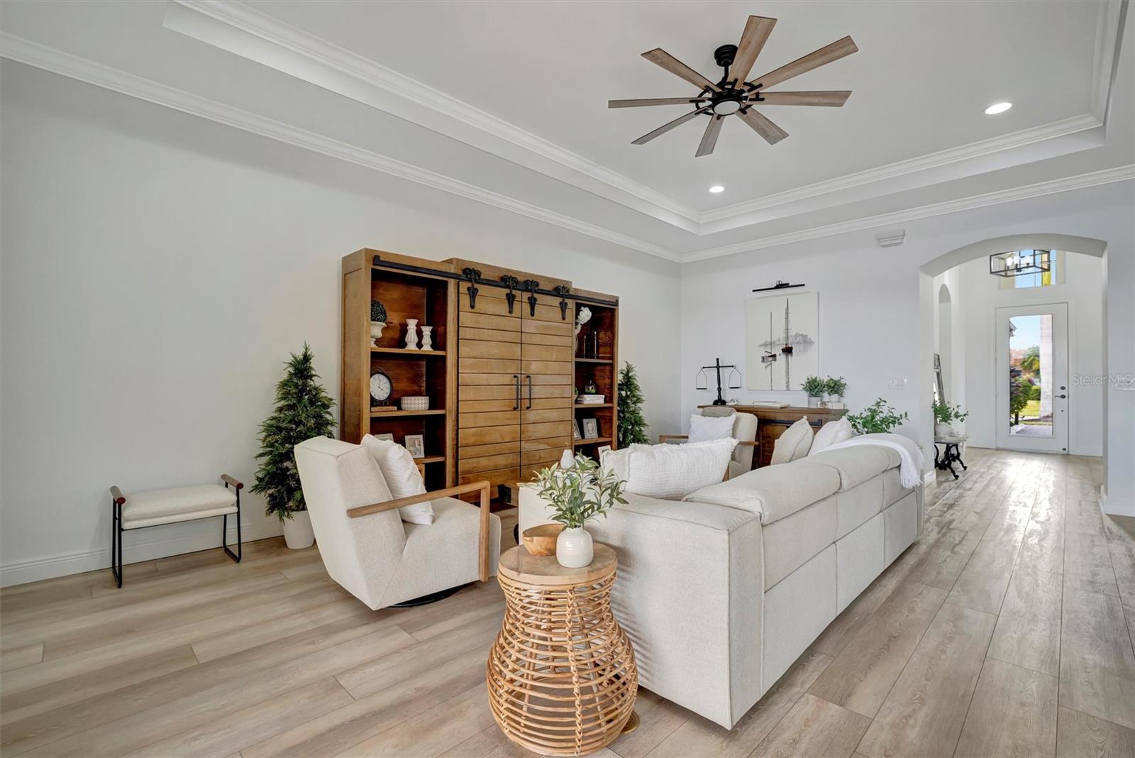 Come and tour this stunning 3-bedroom + den, 2-bath, 2-car garage Tidewater Preserve home, complete with a private boat dock and 10,000 lb lift, offering direct river access! This beautifully upgraded residence features luxury vinyl flooring, soaring 10+ foot ceilings, elegant crown molding, remote-controlled blinds, and dimmable lighting throughout. The open-concept kitchen boasts custom cabinetry, white subway tile backsplash, granite countertops, and a spacious island with a counter bar overlooking the great room. Four sliding glass doors seamlessly blend indoor and outdoor living, leading to an expansive outdoor retreat with a built-in grill—perfect for entertaining or unwinding in the evening breeze. A stylish office off the entry, enhanced with French doors and a sliding glass pocket door, provides both privacy and versatility. The luxurious primary suite showcases tray ceilings, two closets, an en-suite bath, and private access to the outdoor living space. The spa-like primary bathroom features a garden tub, dual vanities, a custom shower enclosure, and a private water closet. The 58.8 x 24 extended covered paver patio is an outdoor oasis, featuring custom hardwood ceilings, outdoor grill and an outdoor fan. It adjoins a screened lanai with a walkout to the fenced rear yard—perfect for pets or play. For boating enthusiasts, the community boat lift provides easy access to the Manatee River, allowing you to arrive at your favorite waterfront restaurant in style or embark on a scenic adventure to Anna Maria Island or Egmont Key. Located in the gated boating community of Tidewater Preserve, this home offers 24-hour guard security for peace of mind. Residents enjoy top-tier amenities, including a 3 resort-style pool, clubhouse, 2 fitness center, tennis courts, riverfront nature trails, dog park, playground, kayak launch, and marina. Best of all—No CDD fees! End each day with breathtaking sunsets from your private dock, embracing the ultimate waterfront lifestyle. An exceptional home in a premier waterfront community—don’t miss your opportunity to make it yours!