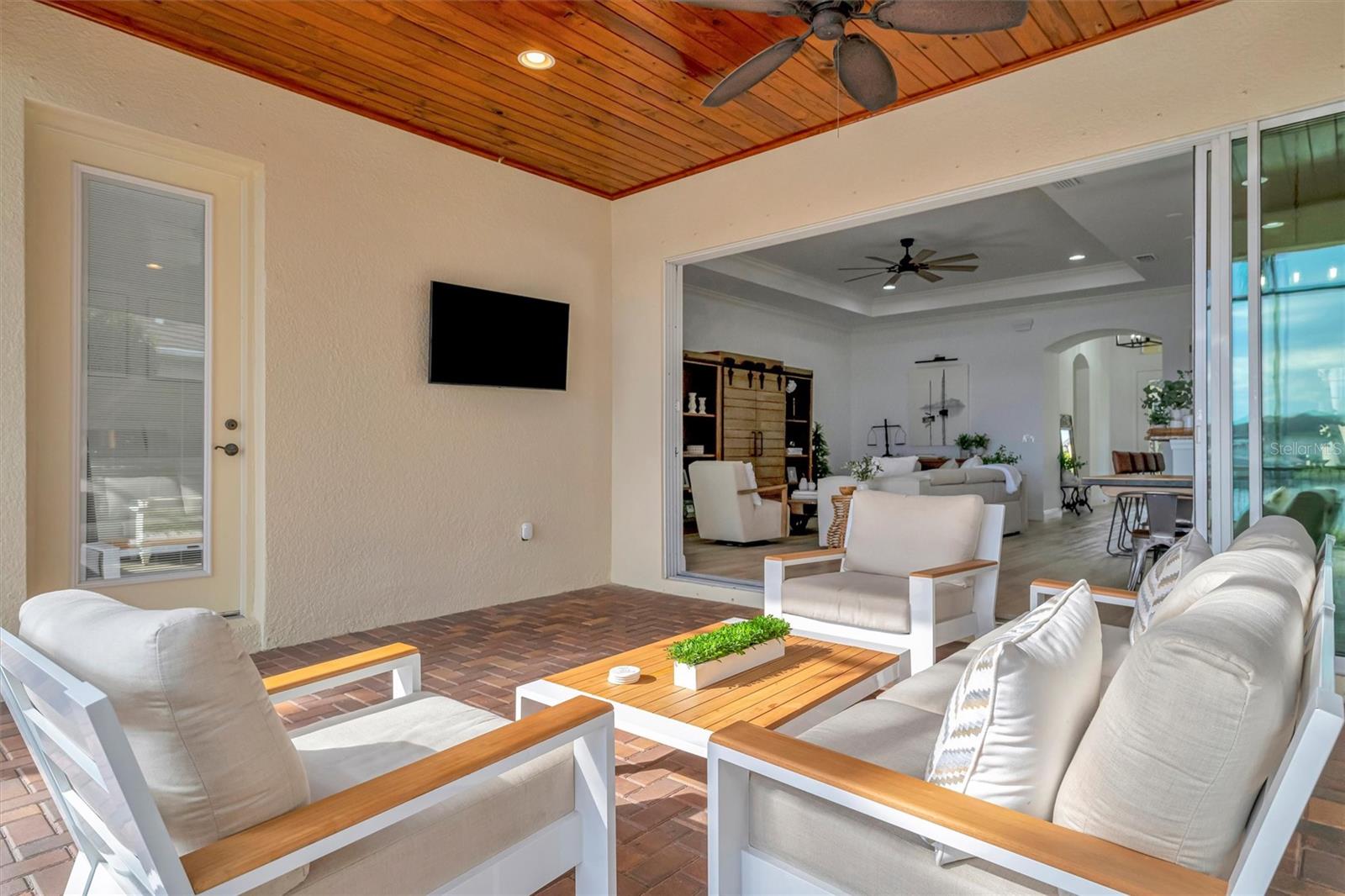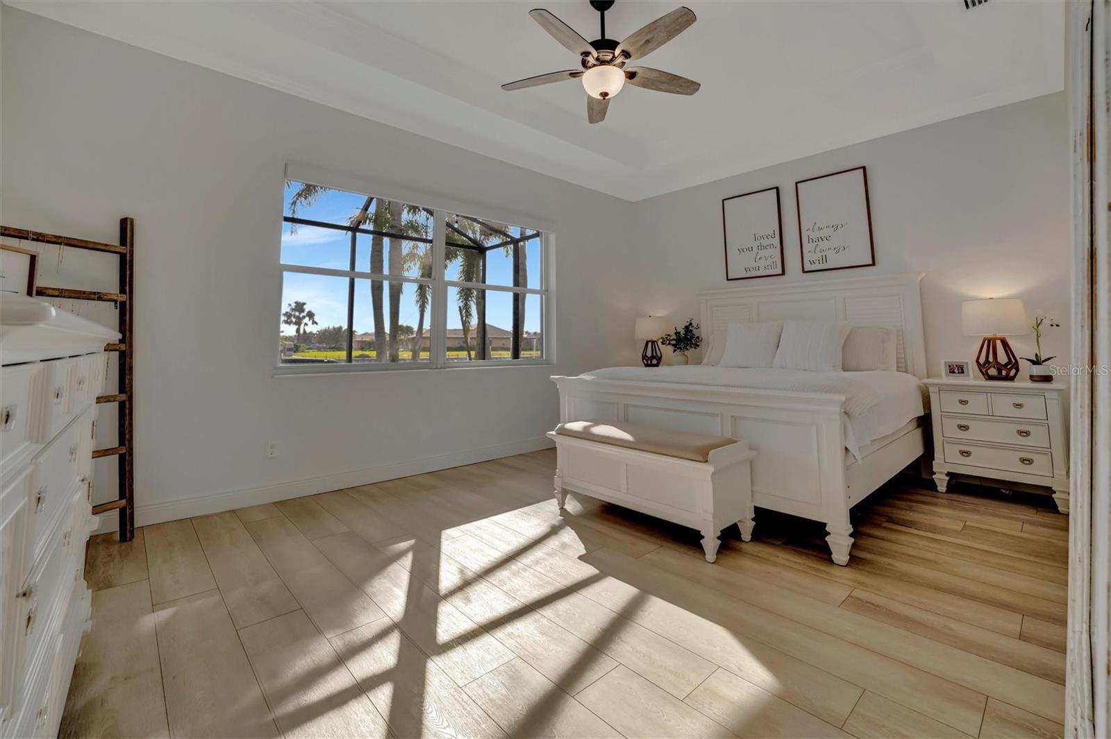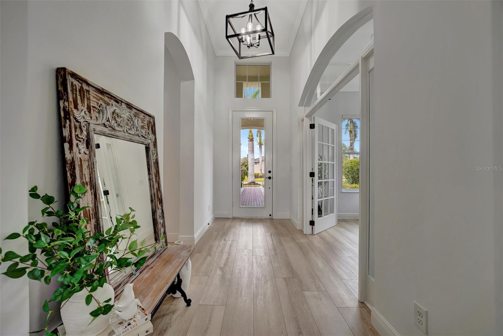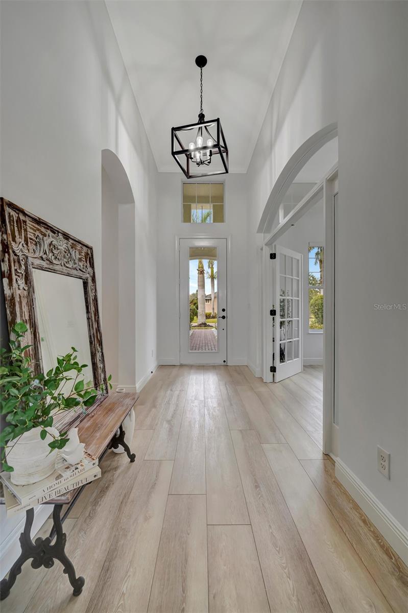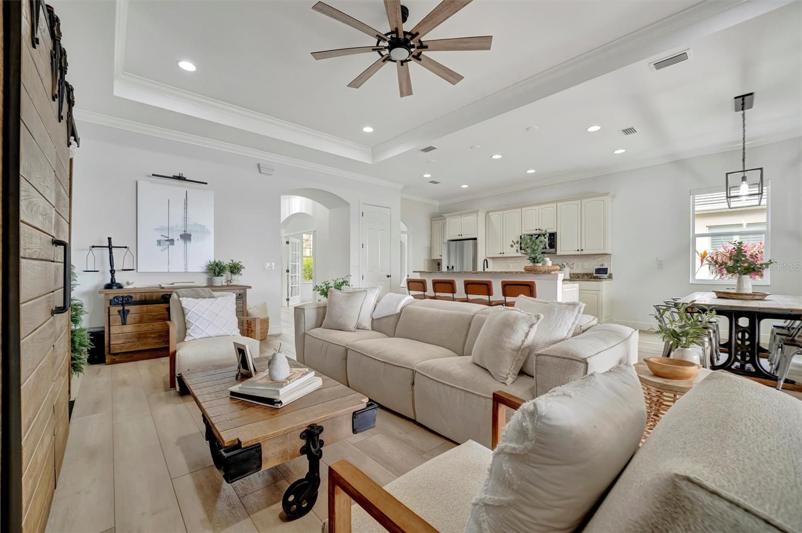 Come and tour this stunning 3-bedroom + den, 2-bath, 2-car garage Tidewater Preserve home, complete with a private boat dock and 10,000 lb lift, offering direct river access! This beautifully upgraded residence features luxury vinyl flooring, soaring 10+ foot ceilings, elegant crown molding, remote-controlled blinds, and dimmable lighting throughout. The open-concept kitchen boasts custom cabinetry, white subway tile backsplash, granite countertops, and a spacious island with a counter bar overlooking the great room. Four sliding glass doors seamlessly blend indoor and outdoor living, leading to an expansive outdoor retreat with a built-in grill—perfect for entertaining or unwinding in the evening breeze. A stylish office off the entry, enhanced with French doors and a sliding glass pocket door, provides both privacy and versatility. The luxurious primary suite showcases tray ceilings, two closets, an en-suite bath, and private access to the outdoor living space. The spa-like primary bathroom features a garden tub, dual vanities, a custom shower enclosure, and a private water closet. The 58.8 x 24 extended covered paver patio is an outdoor oasis, featuring custom hardwood ceilings, outdoor grill and an outdoor fan. It adjoins a screened lanai with a walkout to the fenced rear yard—perfect for pets or play. For boating enthusiasts, the community boat lift provides easy access to the Manatee River, allowing you to arrive at your favorite waterfront restaurant in style or embark on a scenic adventure to Anna Maria Island or Egmont Key. Located in the gated boating community of Tidewater Preserve, this home offers 24-hour guard security for peace of mind. Residents enjoy top-tier amenities, including a 3 resort-style pool, clubhouse, 2 fitness center, tennis courts, riverfront nature trails, dog park, playground, kayak launch, and marina. Best of all—No CDD fees! End each day with breathtaking sunsets from your private dock, embracing the ultimate waterfront lifestyle. An exceptional home in a premier waterfront community—don’t miss your opportunity to make it yours!