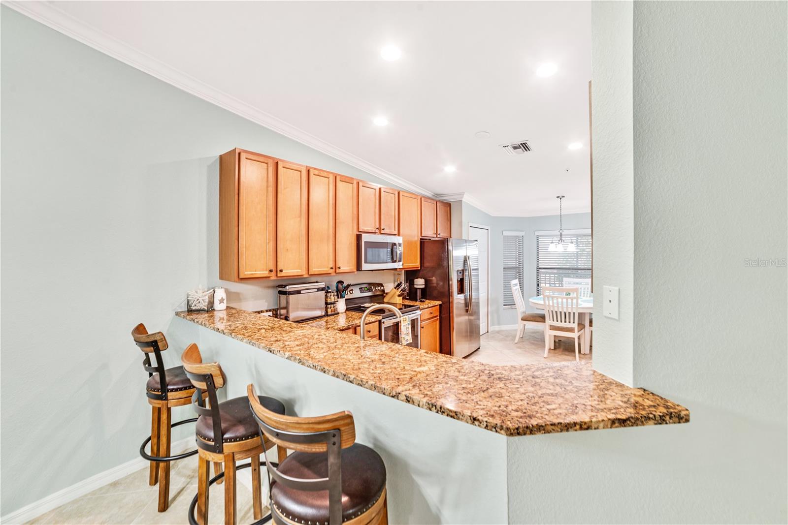 GOLF DEEDED END UNIT VERANDA W/ A GARAGE & PEACEFUL PRESERVE VIEWS! METICULOUSLY MAINTAINED! Welcome to the highly desired River Strand Golf & Country Club, the area's premier resort-style community. Offering endless amenities, a convenient location, and a lavish lifestyle. This bright and airy end unit veranda has the best of both worlds, enjoy the maintenance-free living of a condo while still having the size and conveniences of a typical residence. Largest Veranda floor plan! Offering an open layout with 2 bedrooms, a bonus room, and 2 full bathrooms. Cathedral ceilings and a dry bar complete the spacious living area. Freshly painted too! Not one, but two screened porch areas to extend your living space... one in the front and one in the back. Perfect spots for enjoying the beautiful sunset and sunrise vistas this community provides. The large primary suite offers a tranquil retreat positioned at the back of the unit for maximum privacy. Equipped with 2 walk-in closets and a spa-like en suite bath featuring dual sinks, a soaking tub, and a separate shower. Plenty of room to entertain with multiple dining areas and seating at the breakfast bar. Granite countertops and stainless steel appliances fit the kitchen. The bonus room is perfect for an office, game room, or even an extra bedroom. Just down the private stairwell you'll have a full-size one car garage and plenty of storage space. This building is one of the few with an updated exterior paint job, giving it a more modern look. Also included with this unit is a deeded golf membership, allowing for its owners to enjoy the newly renovated and now fully private, 27-hole, championship golf course designed by Arthur Hill. Just pay a cart fee! Bring your A-game... you won't be disappointed. There is a plethora of active opportunities within the River Strand gates. 8 pickle ball courts, 9 Har-Tru tennis courts, multiple satellite pools, a state of the art gym, bike groups, fitness classes, walking trails, and much more. Enjoy the privacy in your new home or get out and socialize in this vibrant community. After a long day you can unwind with a relaxing meal in the Grille Room or enjoy a beverage at the Tiki Bar. You'll never be bored in River Strand, there is always something to do. Just outside of the River Strand community is The Marketplace at Heritage Harbour, currently hosting a Costco, Miller's Ale House, and Academy Sports but soon to be home to a Target, Hobby Lobby and much more. Heritage Harbour even has baseball fields, disc golf, and a fishing pier that you can take advantage of too. Just minutes to I-75, SR-64, and not far to the white sands and crystal blue waters of our Gulf beaches. So close to everything but still as if you're a world away. This premier community and unique unit speak for themselves. Come see for yourself today!