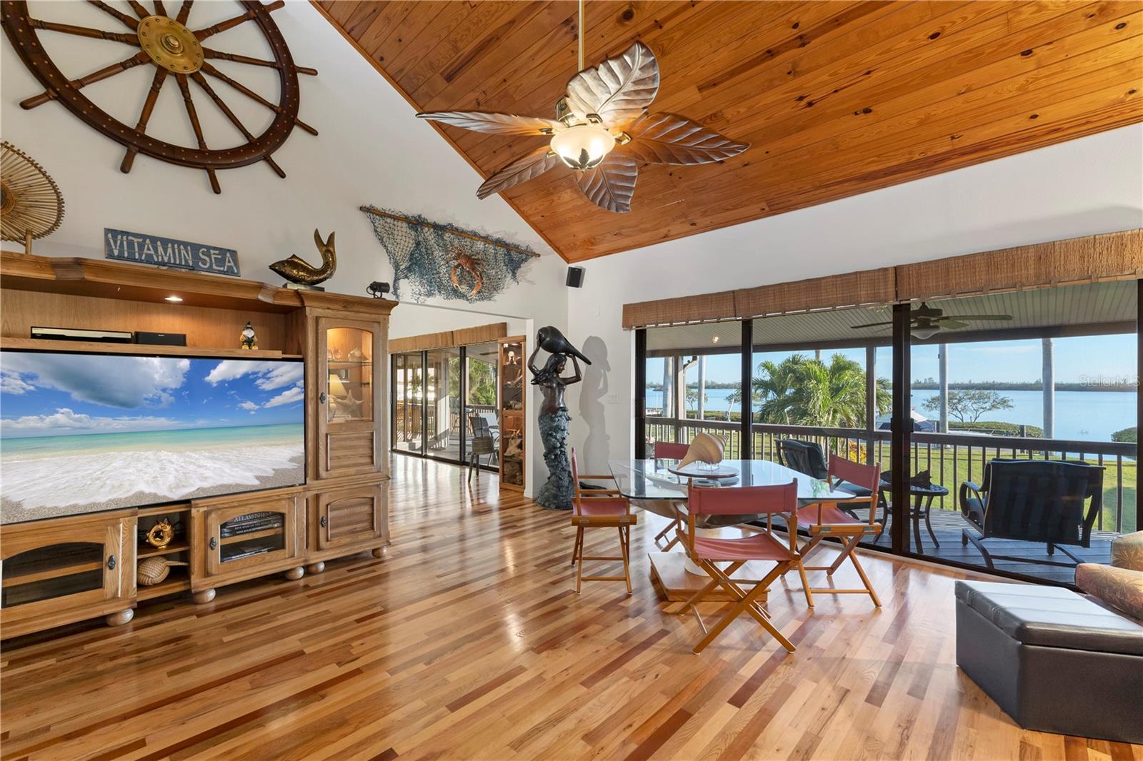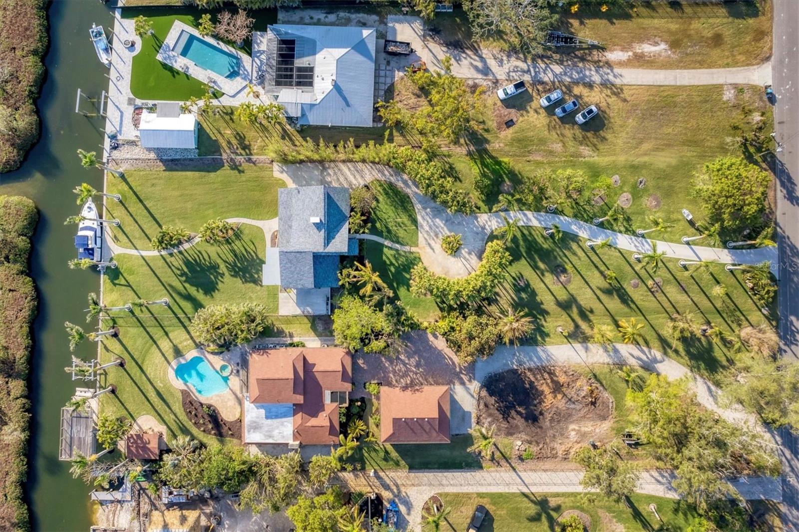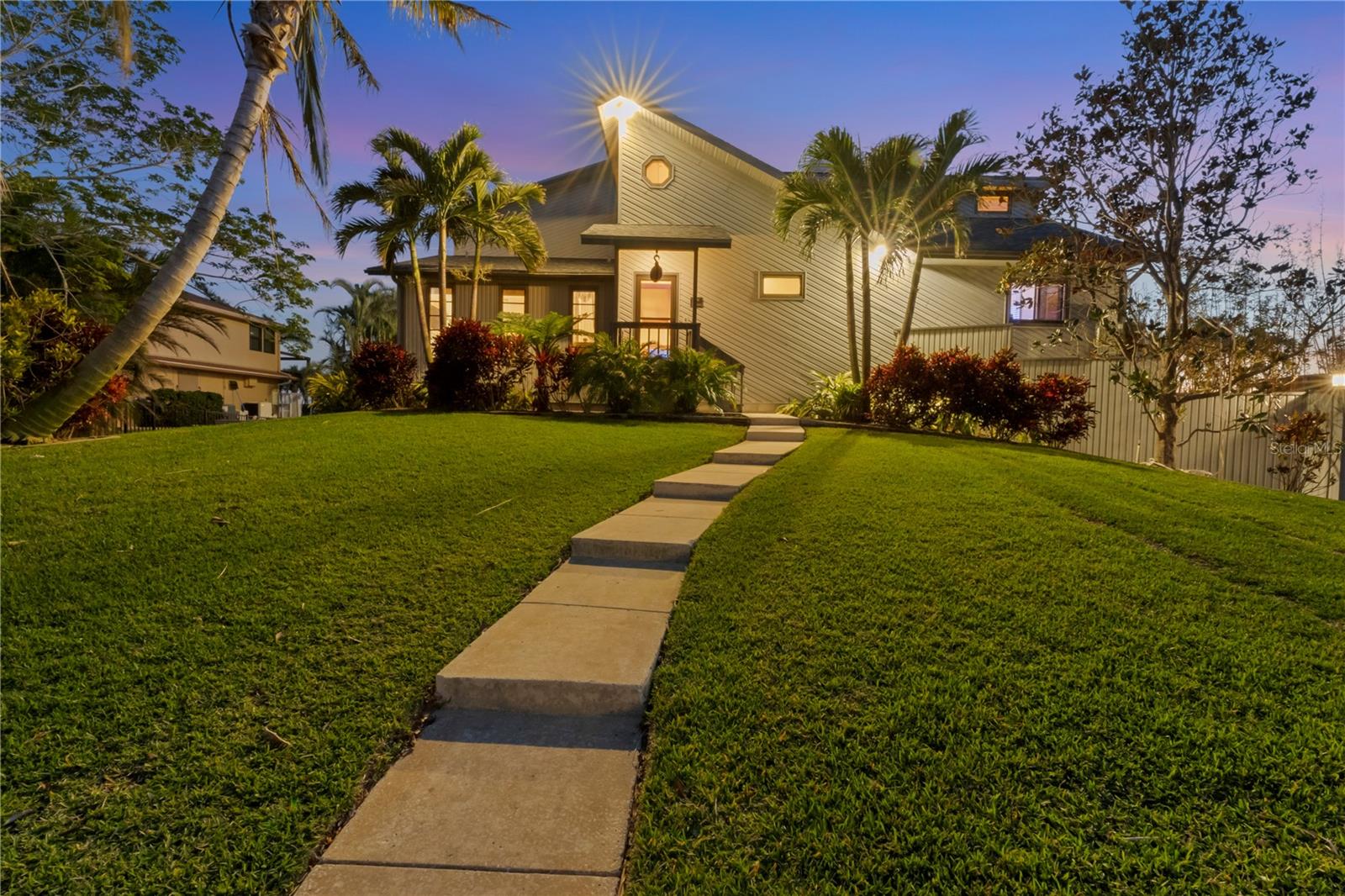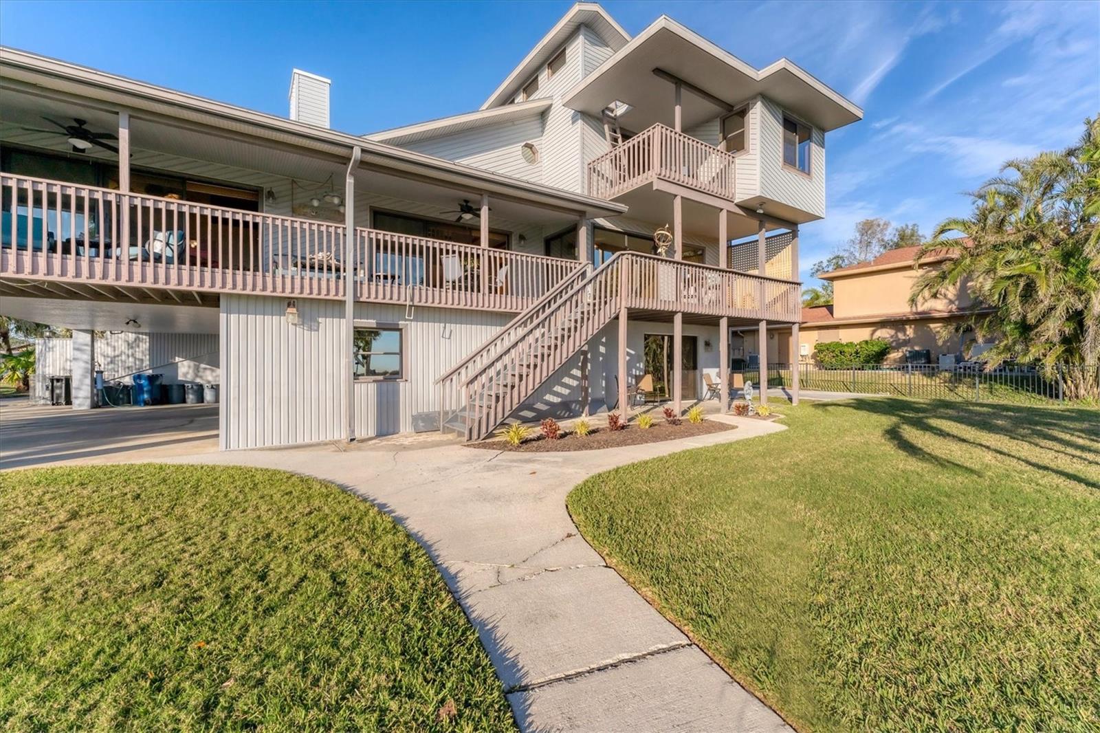 This exceptional 1-acre bayfront estate offers “Old Florida” charm with panoramic water views of Paradise Bay with direct boating access to Sarasota Bay and no fixed bridges to the Gulf. The winding drive, lined with majestic royal palms, welcomes you to a tropical haven, complete with beautifully landscaped grounds kept lush with a well irrigation system. Relish the natural beauty of palms, fruit trees, bamboo, a magnificent magnolia, and vibrant tree fern that surround this tranquil retreat. The coastal contemporary designed home boasts three spacious living levels, each with outdoor decks to take in breathtaking views. The ground level features an oversized garage, additional covered parking, storage space, and a concrete parking pad perfect for RV or boat storage. A grandfathered one bedroom, one bath in-law apartment with kitchenette offers privacy and comfort, along with a stair lift to access the second level. The second level offers a large living and dining area, a fully equipped kitchen, office/den, guest bedroom and guest bath with antique claw foot tub, bonus room/possible bedroom with built-in cabinets and sink. The kitchen has brass ceiling tiles, plentiful cabinet storage, granite countertops and a breakfast bar island with water views. A built-in saltwater aquarium framed in keystone adds a unique touch to the living room, while the adjoining dining room showcases a beautiful keystone-covered gas fireplace. Gorgeous tongue-and-groove hardwood flooring, combining cherry, red oak, white oak, maple, and walnut, creates warmth and elegance throughout. Vaulted ceilings with clerestory windows fill the space with natural light and highlight the home’s dramatic design. A spiral staircase with solid brass railing leads to the third level, where you'll find the spacious primary suite—complete with its own private balcony offering spectacular waterfront views. The ensuite bath features dual sinks, a separate shower, and a WC. The property boasts 100 feet of pristine waterfront, with a concrete seawall, boat davits, power/water, and a fish cleaning station. The natural mangrove barrier provides protection for the canal, and the location provides easy access for boating, fishing and watching dolphins, manatees, and a variety of birds, including the nearby osprey nest, from the comfort of your own backyard. Located just minutes from the beautiful beaches of Anna Maria Island and the charming Cortez Fishing Village, this estate is convenient to top-tier seafood restaurants and waterfront dining options. This is a rare opportunity to own a prime piece of Sarasota Bay waterfront—don’t miss your chance to make this exceptional property your own!