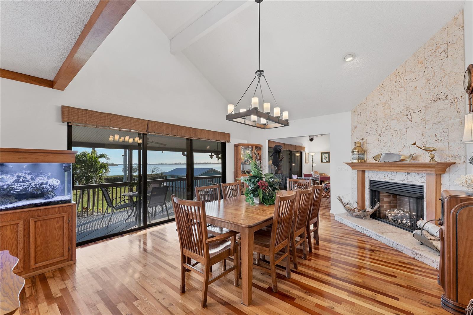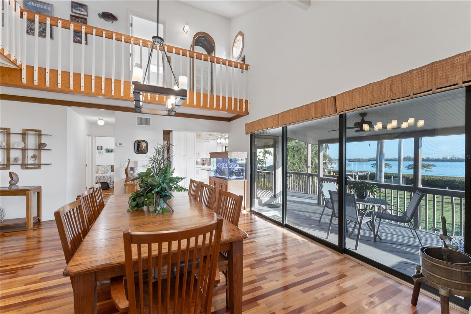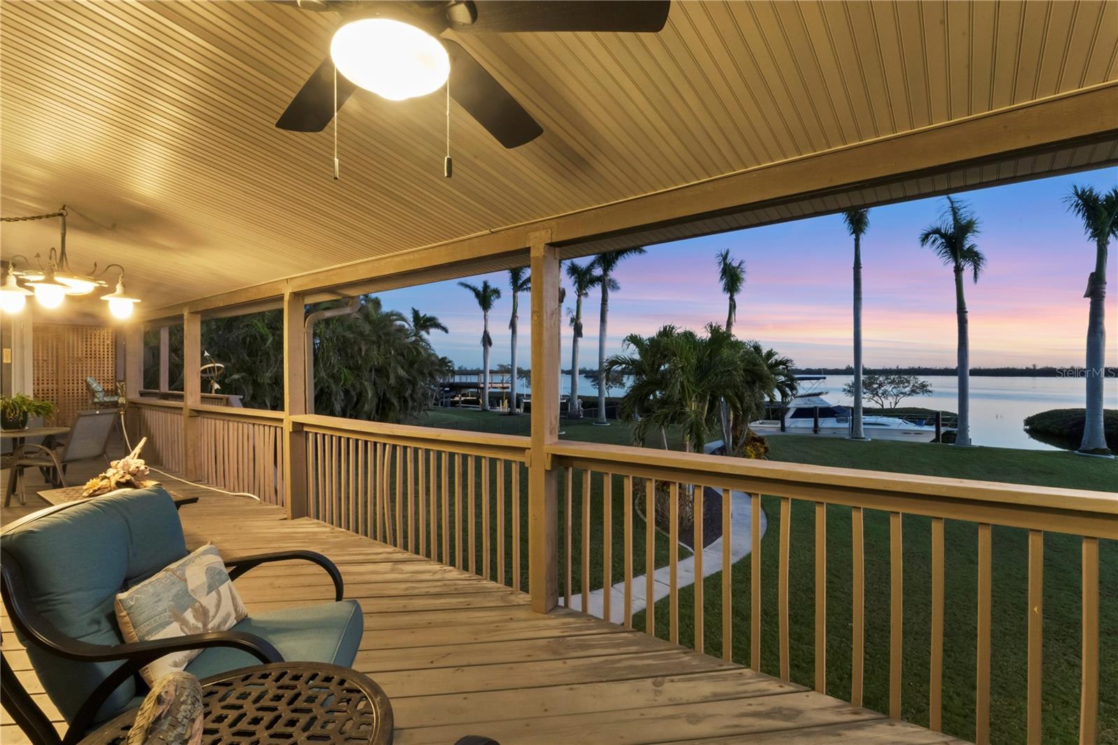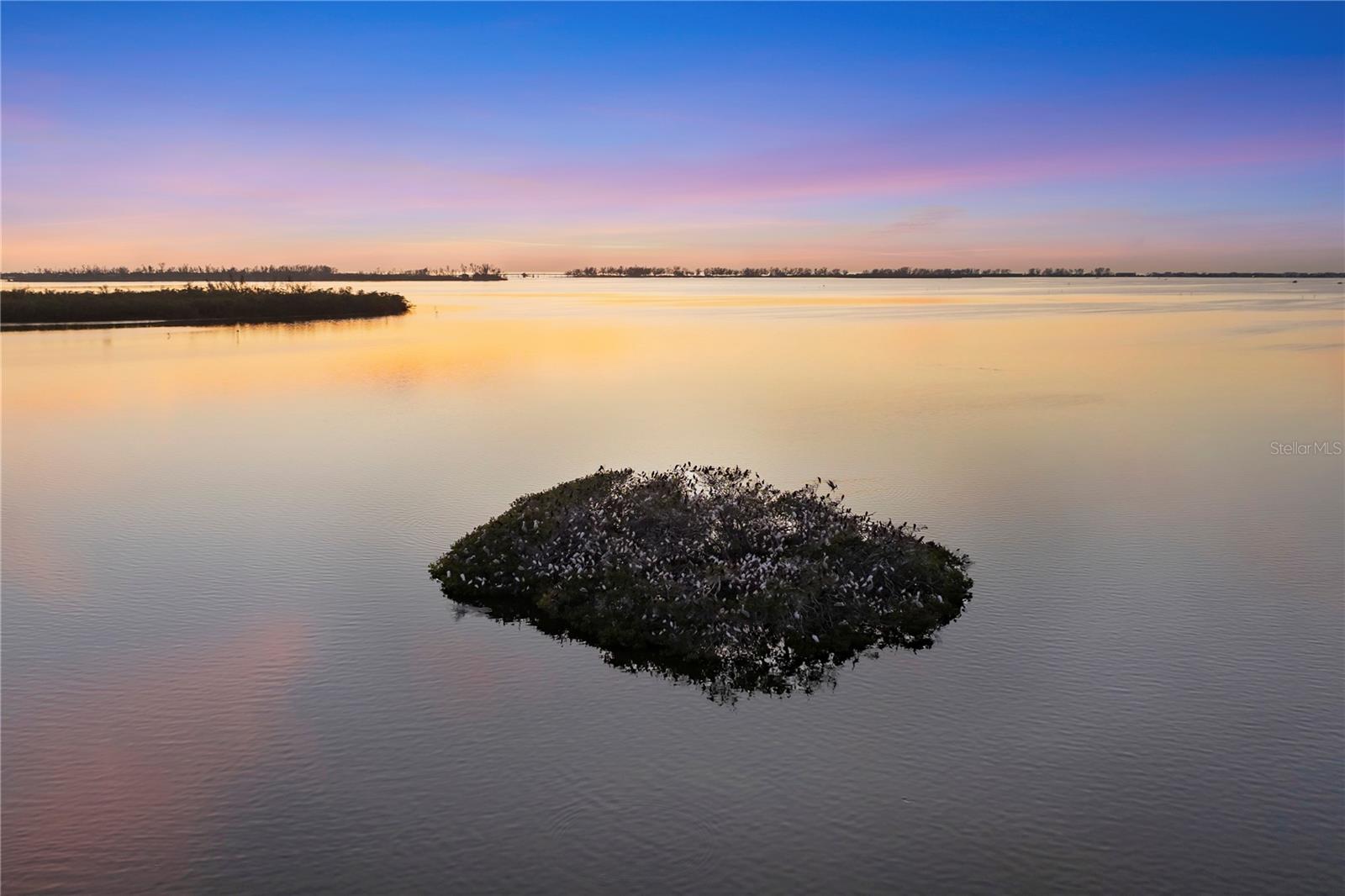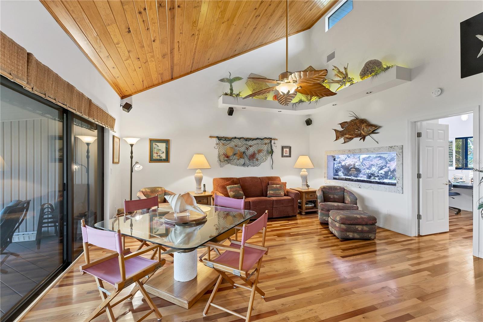 This exceptional 1-acre bayfront estate offers “Old Florida” charm with panoramic water views of Paradise Bay with direct boating access to Sarasota Bay and no fixed bridges to the Gulf. The winding drive, lined with majestic royal palms, welcomes you to a tropical haven, complete with beautifully landscaped grounds kept lush with a well irrigation system. Relish the natural beauty of palms, fruit trees, bamboo, a magnificent magnolia, and vibrant tree fern that surround this tranquil retreat. The coastal contemporary designed home boasts three spacious living levels, each with outdoor decks to take in breathtaking views. The ground level features an oversized garage, additional covered parking, storage space, and a concrete parking pad perfect for RV or boat storage. A grandfathered one bedroom, one bath in-law apartment with kitchenette offers privacy and comfort, along with a stair lift to access the second level. The second level offers a large living and dining area, a fully equipped kitchen, office/den, guest bedroom and guest bath with antique claw foot tub, bonus room/possible bedroom with built-in cabinets and sink. The kitchen has brass ceiling tiles, plentiful cabinet storage, granite countertops and a breakfast bar island with water views. A built-in saltwater aquarium framed in keystone adds a unique touch to the living room, while the adjoining dining room showcases a beautiful keystone-covered gas fireplace. Gorgeous tongue-and-groove hardwood flooring, combining cherry, red oak, white oak, maple, and walnut, creates warmth and elegance throughout. Vaulted ceilings with clerestory windows fill the space with natural light and highlight the home’s dramatic design. A spiral staircase with solid brass railing leads to the third level, where you'll find the spacious primary suite—complete with its own private balcony offering spectacular waterfront views. The ensuite bath features dual sinks, a separate shower, and a WC. The property boasts 100 feet of pristine waterfront, with a concrete seawall, boat davits, power/water, and a fish cleaning station. The natural mangrove barrier provides protection for the canal, and the location provides easy access for boating, fishing and watching dolphins, manatees, and a variety of birds, including the nearby osprey nest, from the comfort of your own backyard. Located just minutes from the beautiful beaches of Anna Maria Island and the charming Cortez Fishing Village, this estate is convenient to top-tier seafood restaurants and waterfront dining options. This is a rare opportunity to own a prime piece of Sarasota Bay waterfront—don’t miss your chance to make this exceptional property your own!