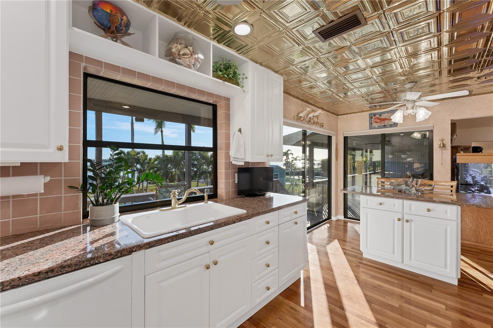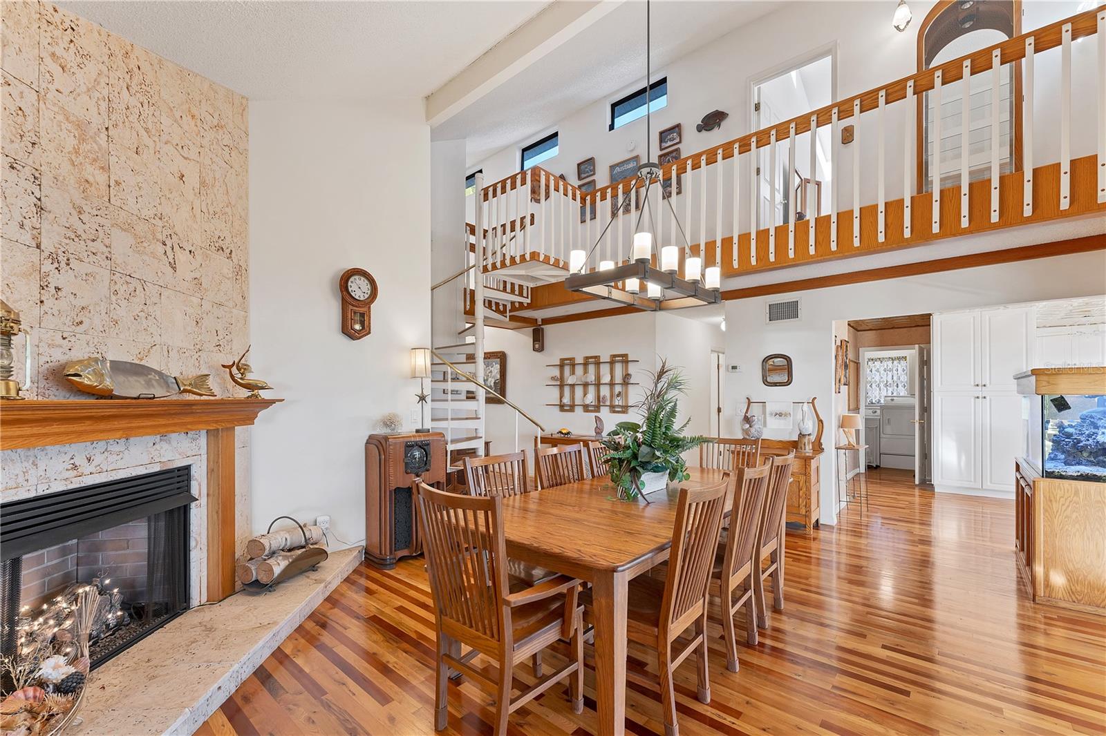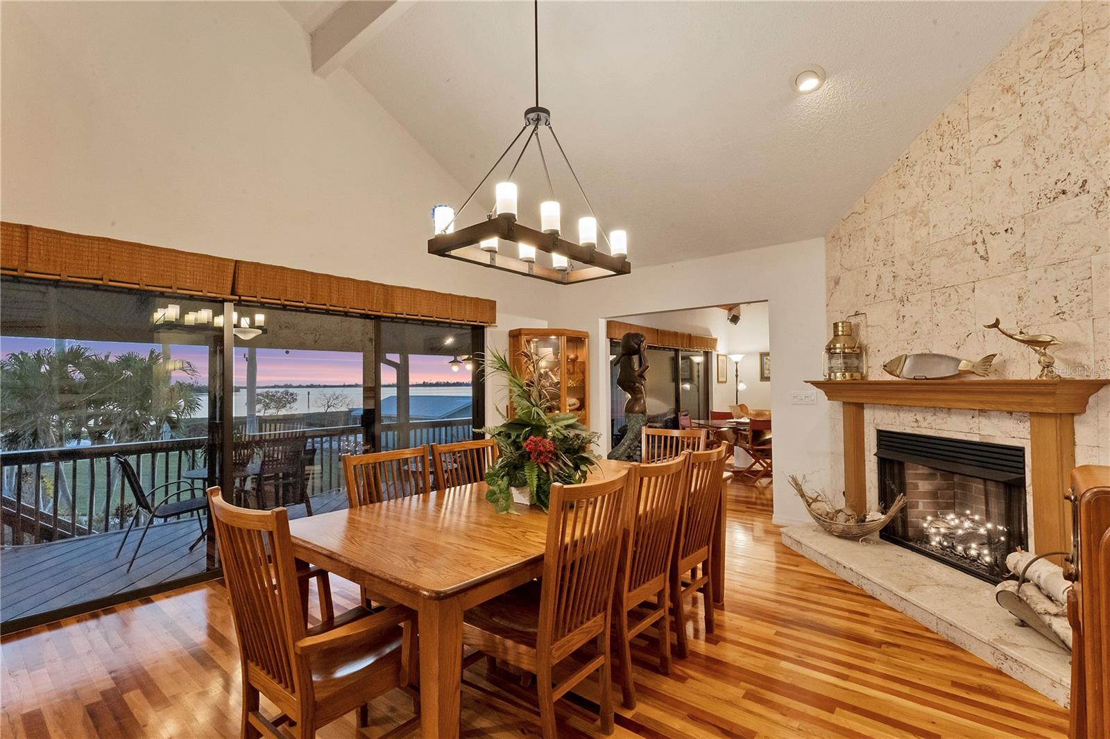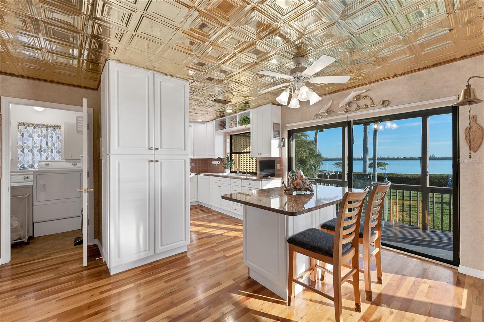 This exceptional 1-acre bayfront estate offers “Old Florida” charm with panoramic water views of Paradise Bay with direct boating access to Sarasota Bay and no fixed bridges to the Gulf. The winding drive, lined with majestic royal palms, welcomes you to a tropical haven, complete with beautifully landscaped grounds kept lush with a well irrigation system. Relish the natural beauty of palms, fruit trees, bamboo, a magnificent magnolia, and vibrant tree fern that surround this tranquil retreat. The coastal contemporary designed home boasts three spacious living levels, each with outdoor decks to take in breathtaking views. The ground level features an oversized garage, additional covered parking, storage space, and a concrete parking pad perfect for RV or boat storage. A grandfathered one bedroom, one bath in-law apartment with kitchenette offers privacy and comfort, along with a stair lift to access the second level. The second level offers a large living and dining area, a fully equipped kitchen, office/den, guest bedroom and guest bath with antique claw foot tub, bonus room/possible bedroom with built-in cabinets and sink. The kitchen has brass ceiling tiles, plentiful cabinet storage, granite countertops and a breakfast bar island with water views. A built-in saltwater aquarium framed in keystone adds a unique touch to the living room, while the adjoining dining room showcases a beautiful keystone-covered gas fireplace. Gorgeous tongue-and-groove hardwood flooring, combining cherry, red oak, white oak, maple, and walnut, creates warmth and elegance throughout. Vaulted ceilings with clerestory windows fill the space with natural light and highlight the home’s dramatic design. A spiral staircase with solid brass railing leads to the third level, where you'll find the spacious primary suite—complete with its own private balcony offering spectacular waterfront views. The ensuite bath features dual sinks, a separate shower, and a WC. The property boasts 100 feet of pristine waterfront, with a concrete seawall, boat davits, power/water, and a fish cleaning station. The natural mangrove barrier provides protection for the canal, and the location provides easy access for boating, fishing and watching dolphins, manatees, and a variety of birds, including the nearby osprey nest, from the comfort of your own backyard. Located just minutes from the beautiful beaches of Anna Maria Island and the charming Cortez Fishing Village, this estate is convenient to top-tier seafood restaurants and waterfront dining options. This is a rare opportunity to own a prime piece of Sarasota Bay waterfront—don’t miss your chance to make this exceptional property your own!