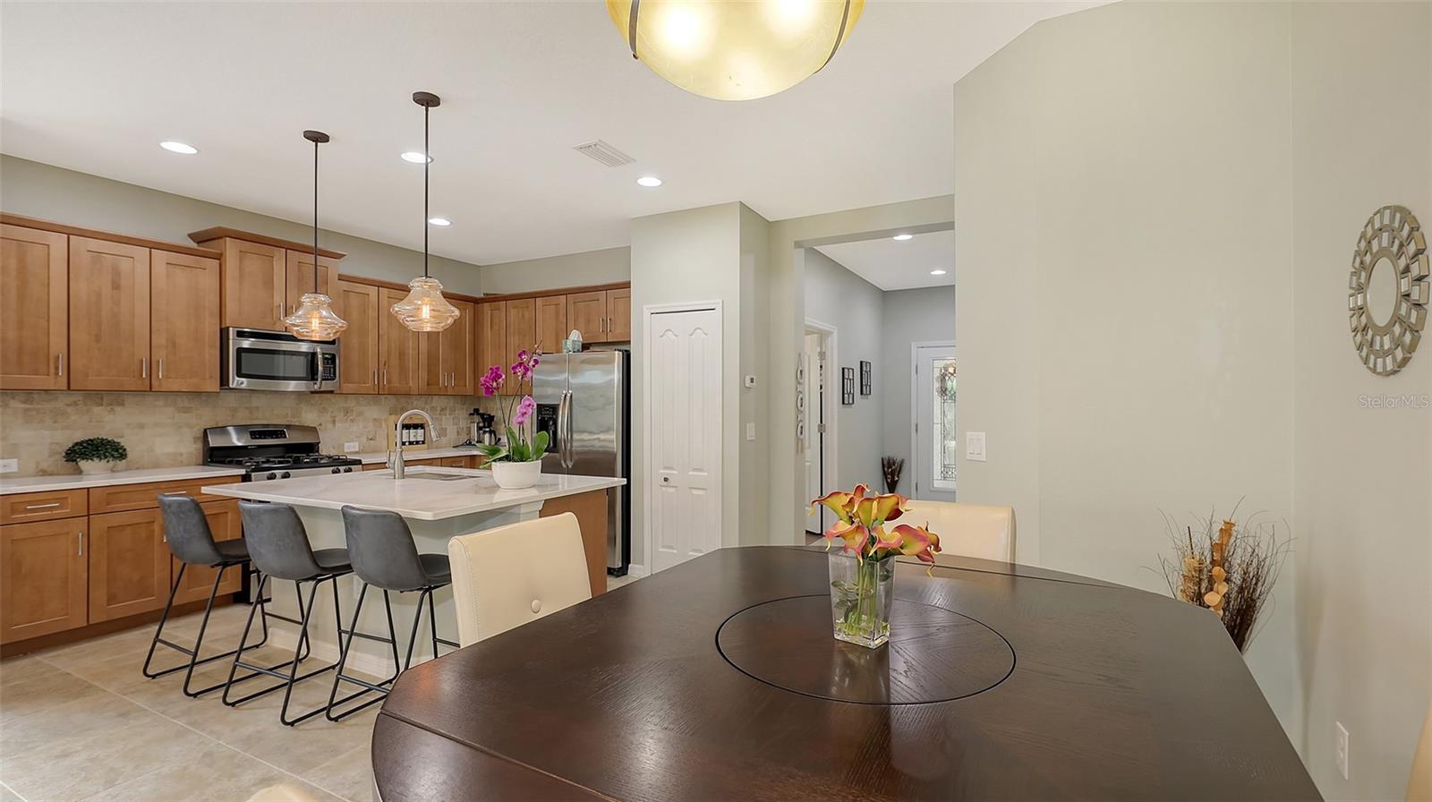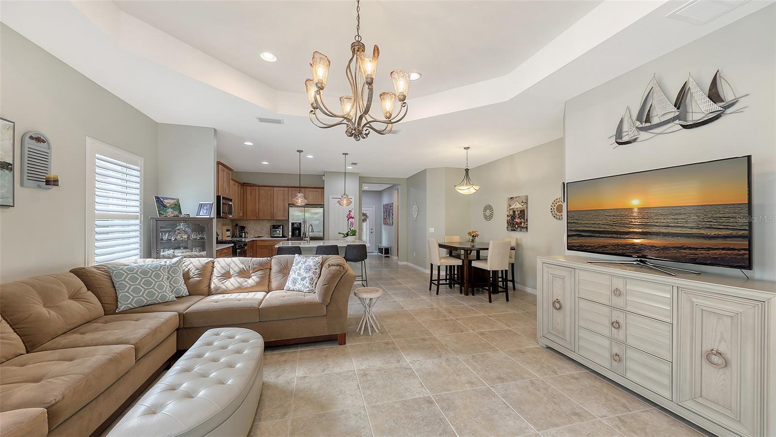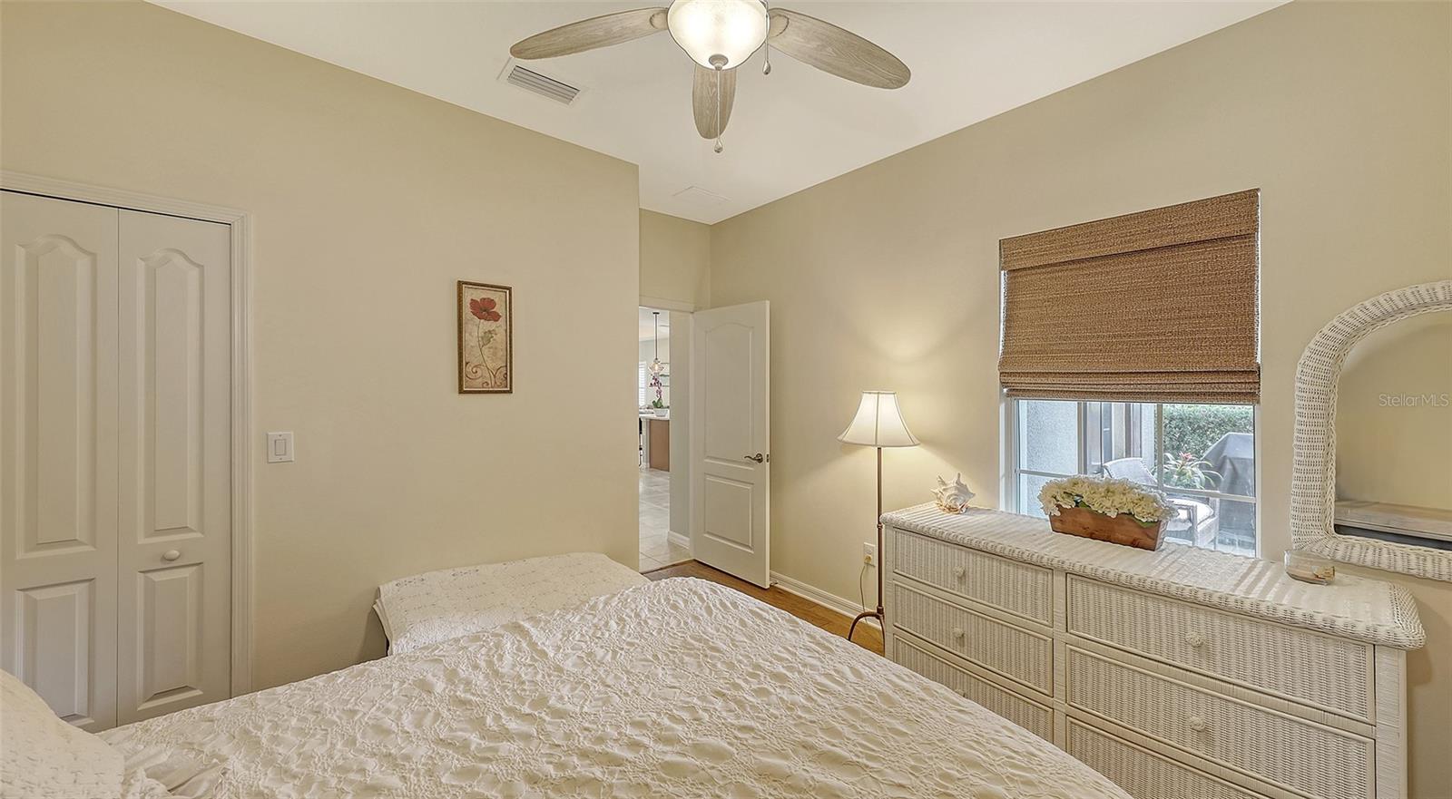 Immaculate paired 2-BEDROOM PLUS DEN VILLA located in the maintenance-free, gated community of FAIRFIELD. Popular TIDEWATER FLOORPLAN with dining nook and extended lanai, AC system replaced February 2025!! Bright and open living space that’s perfect for both easy living and entertaining. Inviting covered front porch welcomes you into this “like new” villa with a stylish decorative glass front door. The great room boasts 9’ tray ceiling and large sliding glass doors that lead to the extended lanai. The bronze-caged screened paver lanai with a covered area overlooks green space. The kitchen boasts custom contemporary solid wood shaker cabinets with crown molding, beautiful quartz countertops, chic backsplash, stainless steel appliances, gas range, pantry closet and large center island. The owner’s suite is a true retreat featuring an additional window for natural light, walk-in closet plus secondary closet and a pretty en-suite bath with split vanities, walk-in tiled shower with frameless glass surround and a separate water closet. The split floorplan offers privacy for the guest bedroom and bathroom. Located off the foyer with double doors, the den provides flexible space for a TV room, home office, or could even serve as a 3rd bedroom. A 2-car attached garage is easily accessible via a short breezeway. The interior laundry room comes with a Maytag washer and dryer. Fairfield is a beautifully landscaped, low-maintenance community offering access to resort-style amenities including a heated pool & spa, clubhouse, fitness center & many planned community activities. This is a very "pet" (and people) friendly community with low HOA fees. Convenient to the UTC Mall, dining, shopping, entertainment, numerous championship golf courses, Public Library, pristine Gulf Coast beaches, I-75, SRQ International Airport & Downtown Sarasota & Bradenton. Nothing to do but move in and enjoy life on the Gulf Coast!