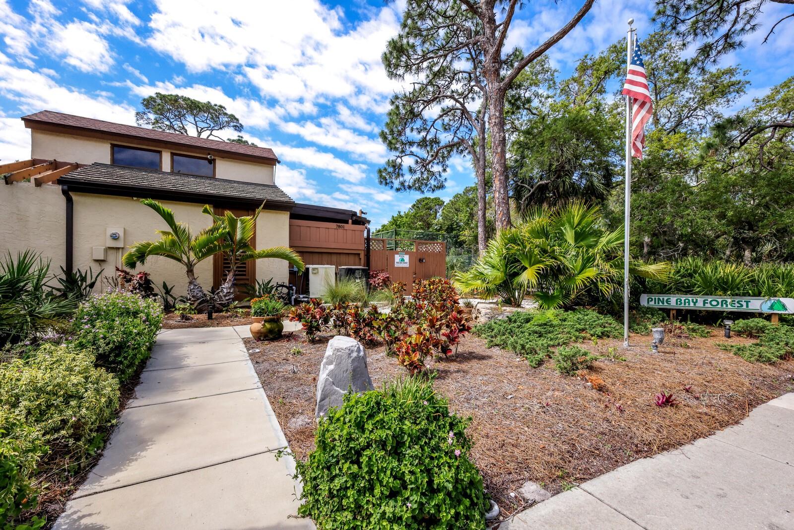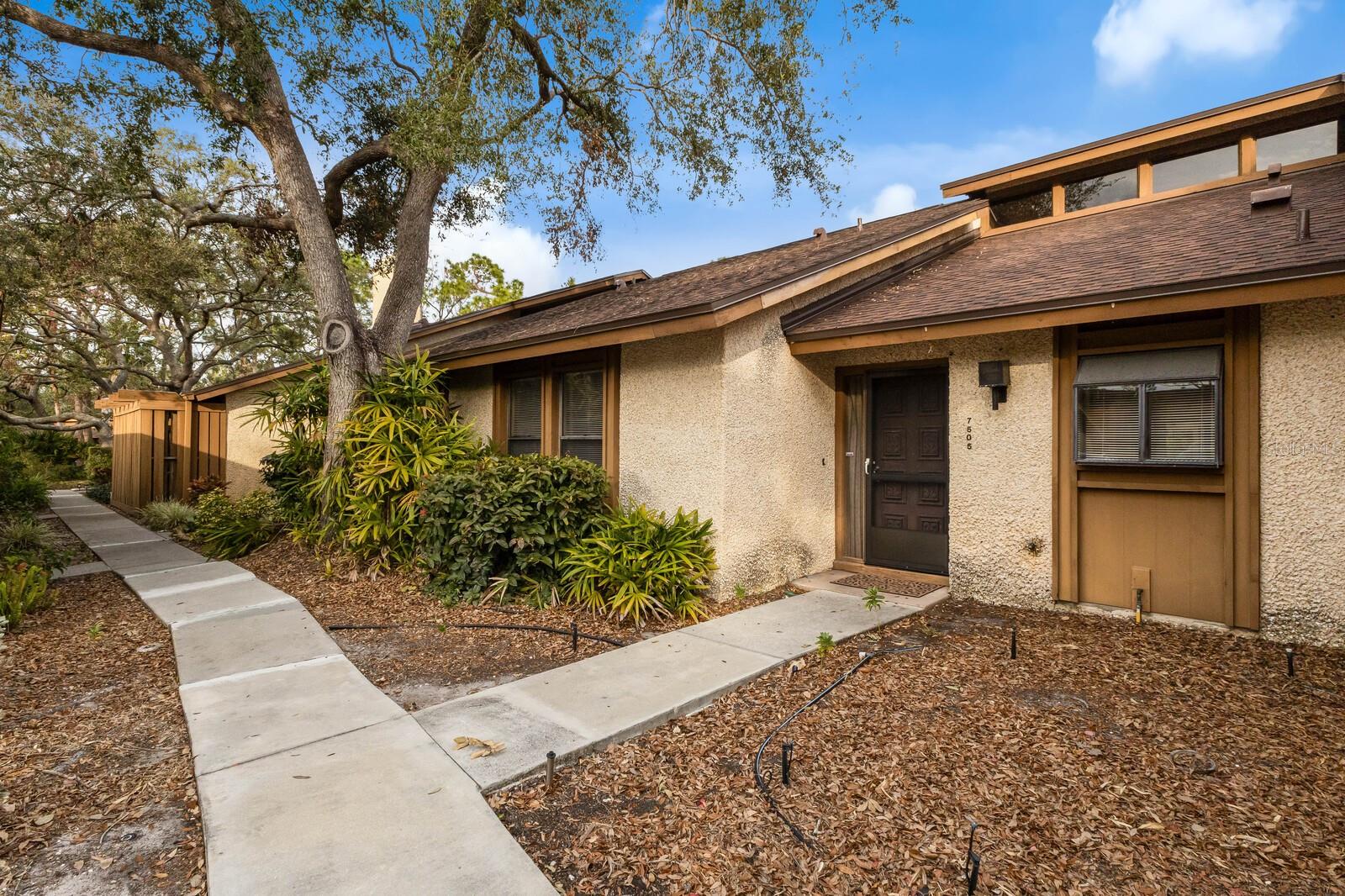 Great opportunity to own a 1300sf, 2 bedroom, 2 bath condo close to Anna Maria Island. Beautiful cedar, vaulted ceilings in Great Room. Tile throughout with exception of bedrooms. Oversized Primary bedroom with his and her walk-in closets and ensuite bathroom with double sinks and tile shower. Kitchen with loads of counter space, garden window and washer and dryer behind double doors. Condo fee includes everything except electric and extended cable channels. Walk to gated, heated pool, spa, sauna, tennis, pickleball, shuffleboard and deck over Palma Sola Bay. Bike to Anna Maria Island, Robinson Preserve and DeSoto Park. Only a short walk to shopping, restaurants and medical facilities. This is your chance to make this unit your own.