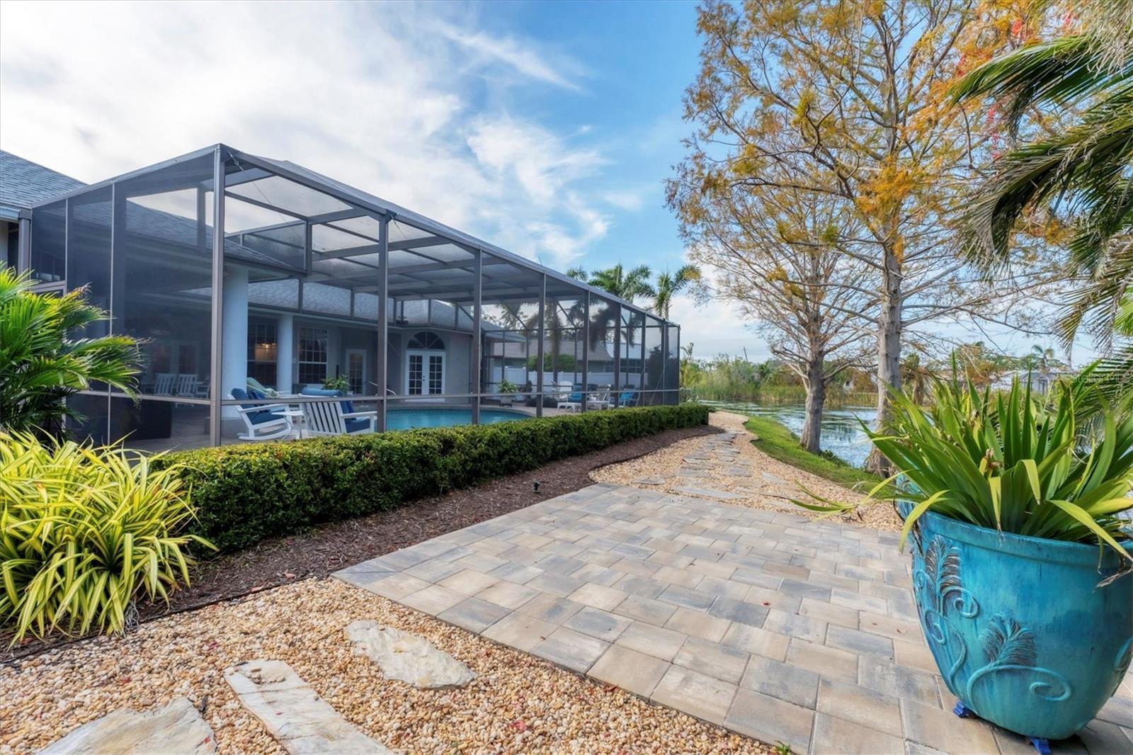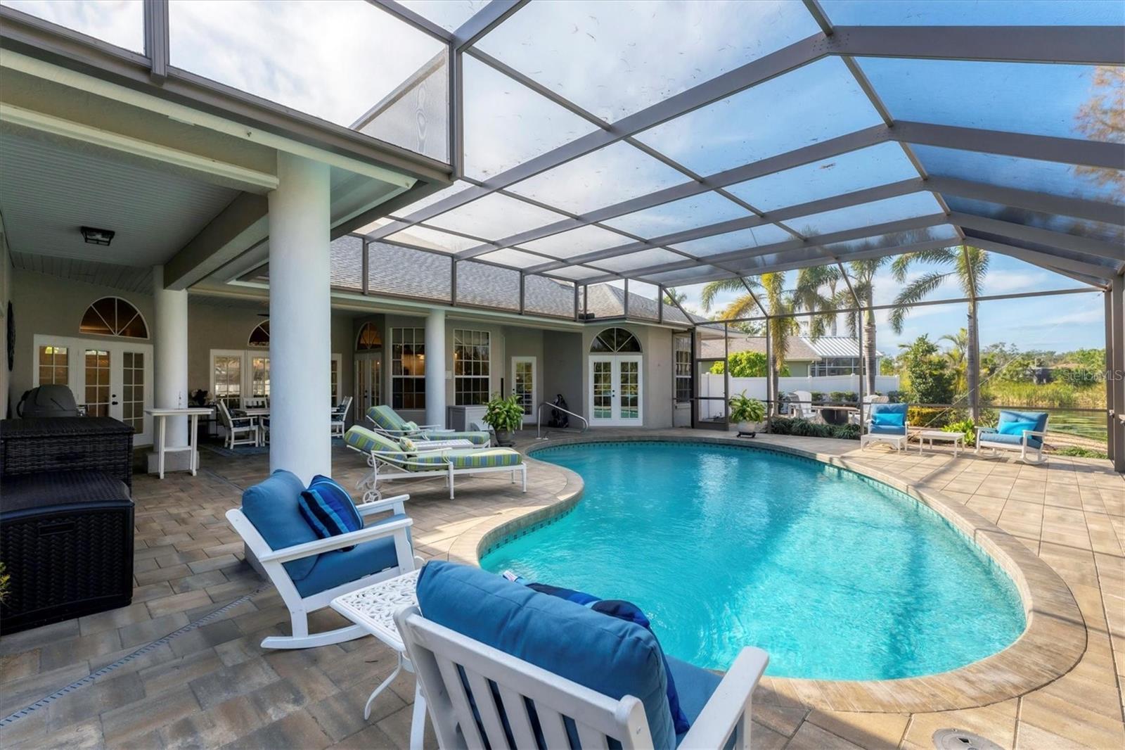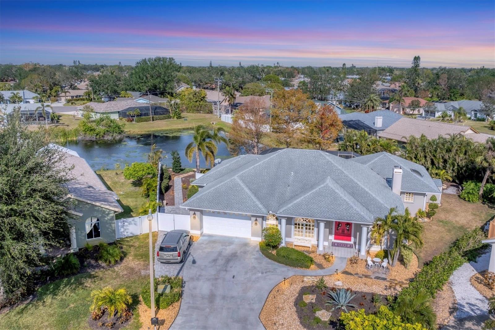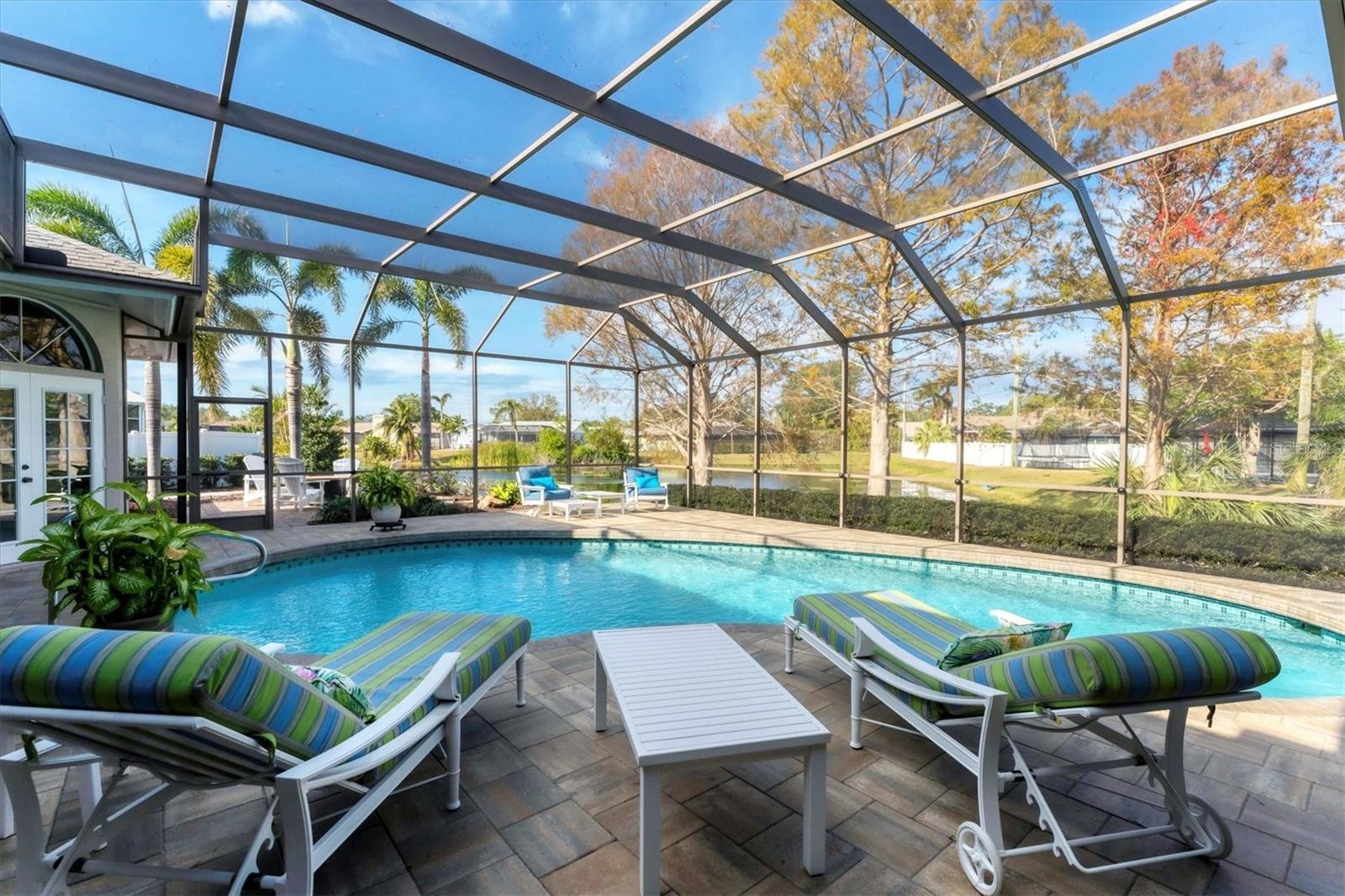 ~ NW BRADENTON LAKEFRONT HOME ~ There are so many amazing features to explore in this gorgeous cul-de-sac home! Enter the grand foyer that leads to the family room showcasing a newer $23K built-in housing a wine refrigerator and JennAire coffee system where you can indulge and delight your senses with specialty cappucinos, lattes and frothes. Higher ceilings, a wood burning fireplace and ample space for your furniture make this area incredibly cozy and inviting. You'll have over 3000 sf of living area featuring 3 bedrooms, 3 full bathrooms, a Study, a large breakfast nook and a formal dining room. Multiple sets of French doors lead to the caged saltwater heated pool and expansive covered patio and deck areas. Entertaining friends and family will be so effortless with all the inviting lounging areas surrounding the pool. Low maintenance native landscape has been enhanced with river rock, landscape lighting and slate pathways. Several private sitting areas can be found all around the perimeter of this home including a firepit seating area and table overlooking the natural lake creating a very charming ambiance. The captivating lakeviews that nature provides of the Rosetta Spoonbills, waterfowl and nesting turtles are absolutely absorbing. You'll also own a portion of the lake! The Primary Suite is a retreat all of its own with French doors and windows providing wonderful natural lighting inviting the outdoors in. The closet space is truly unbelievable with an incredible amount of room for all your items. Custom upgrades abound everywhere with upscale Lyteworks stunning chandeliers that come with dimmers. Enjoy the advantages of already having a $5K Halo Water Filtration System, Ring system, $50K kitchen makeover, $65K landscape upgrade, 2017 $27K roof, $30K A/C for two 2022 zones, $25K for appliances, $7k exterior paint, $5K interior paint job in 2023, $5k newer shed, 2022 sprinkler pump, irrigation system, $10K new pool cage with new screws and braces reinforced to hurricane standards and $18k for stunning primary suite bathroom cabinetry that includes a fluted glass shower door .... WOW .... no expense has been spared in maintaining this very special residence. Almost all the furnishings including artwork and the $6400 newer flat screen tv with a sound bar and Sonos sound system are available. This 1/2 acre property does not allow short term rentals, is deed restricted and has $290 annual fees and is in a non-flood zone. Be sure to view the Matterport Tour!