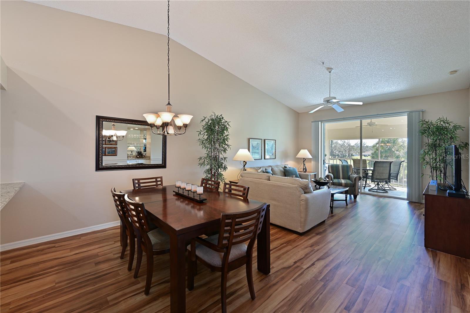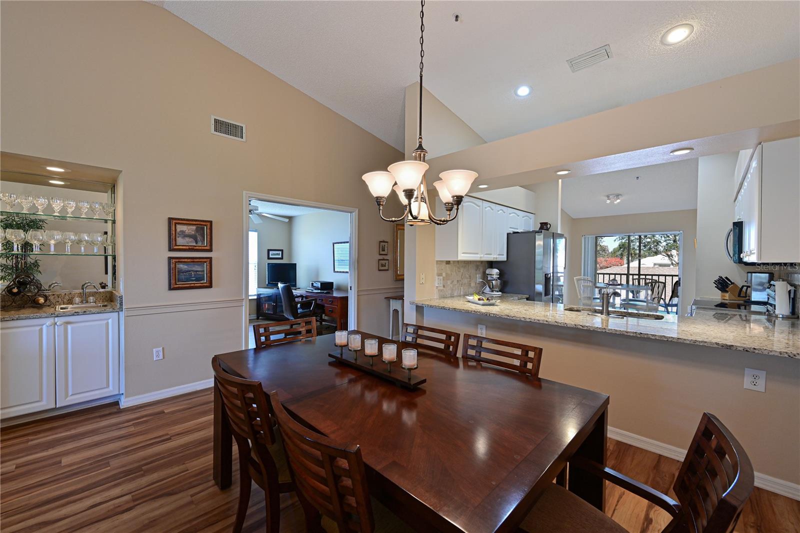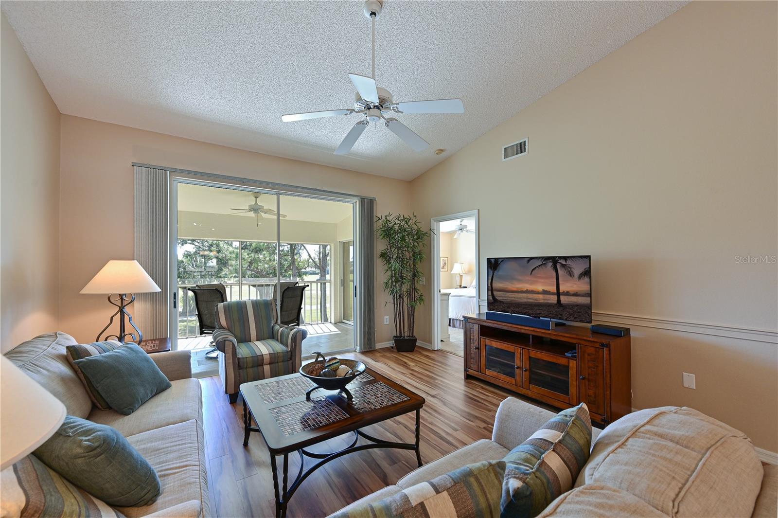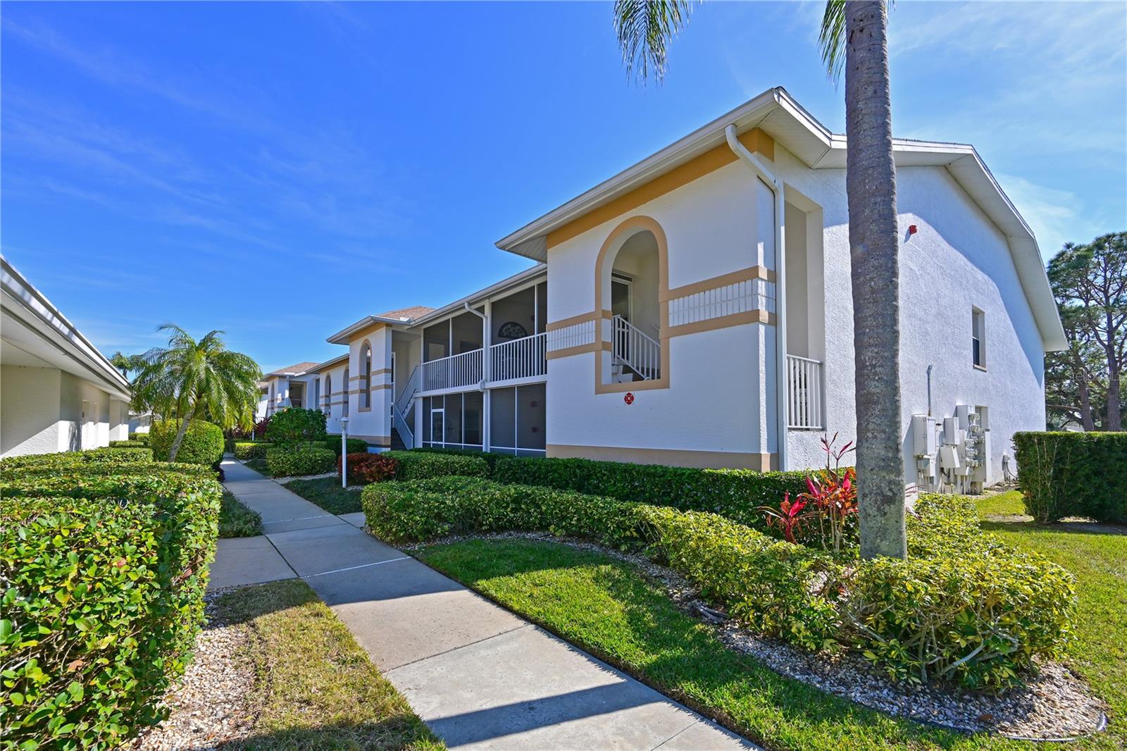 Truly one of the most fabulous turn-key furnished, end unit condos in the Village of Tara Golf and Country Club. Beautiful, updated kitchen, open floor plan, wood floors throughout the living area, wet bar for that extra area of entertaining needs, den with pocket doors, and a few of the features of this two bedroom, two bath home. Kitchen has stone counters and been opened up structurally between the dining room and kitchen to give a grand open feeling. Two full baths and convenient laundry closet. Two screened in lanais, the back Lanai looks out on the 10th and 11th hole of the championship golf course with southern exposure for great sunsets and inspiring sun rises. Class A membership is deeded to the property for the best golf community you can find. 18 hole golf course was renovated in 2023 with new greens, tee boxes and fairways. Pickleball Center presently being built with 5 new courts, to be completed Spring 2025. The community enjoys community pools, tennis, full fitness center, bocce, clubhouse dining and actives in the greatest location off State Rd 70. Close to highways, airports, super shopping and dining, and the best beaches in the Sarasota Bradenton area. Home comes with a 1 Year Home Warranty!!! Welcome to Taradise!