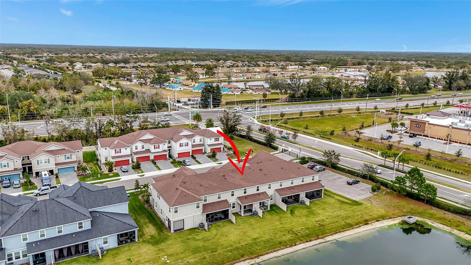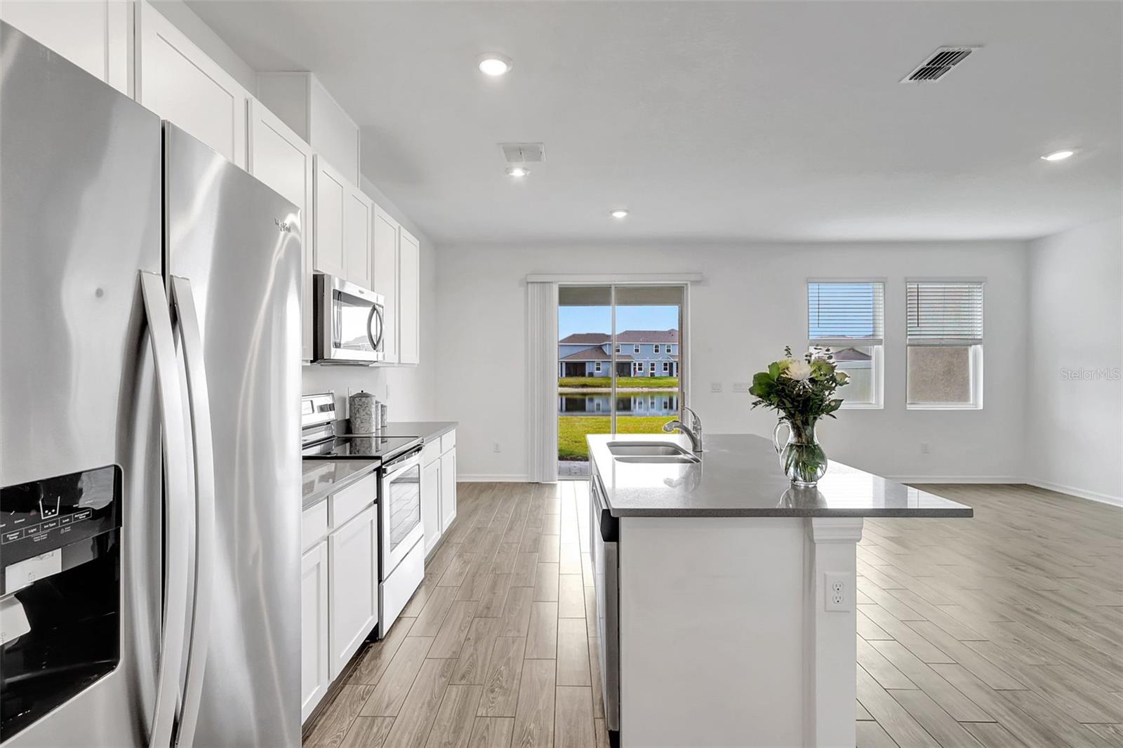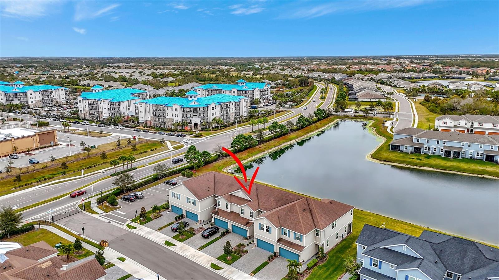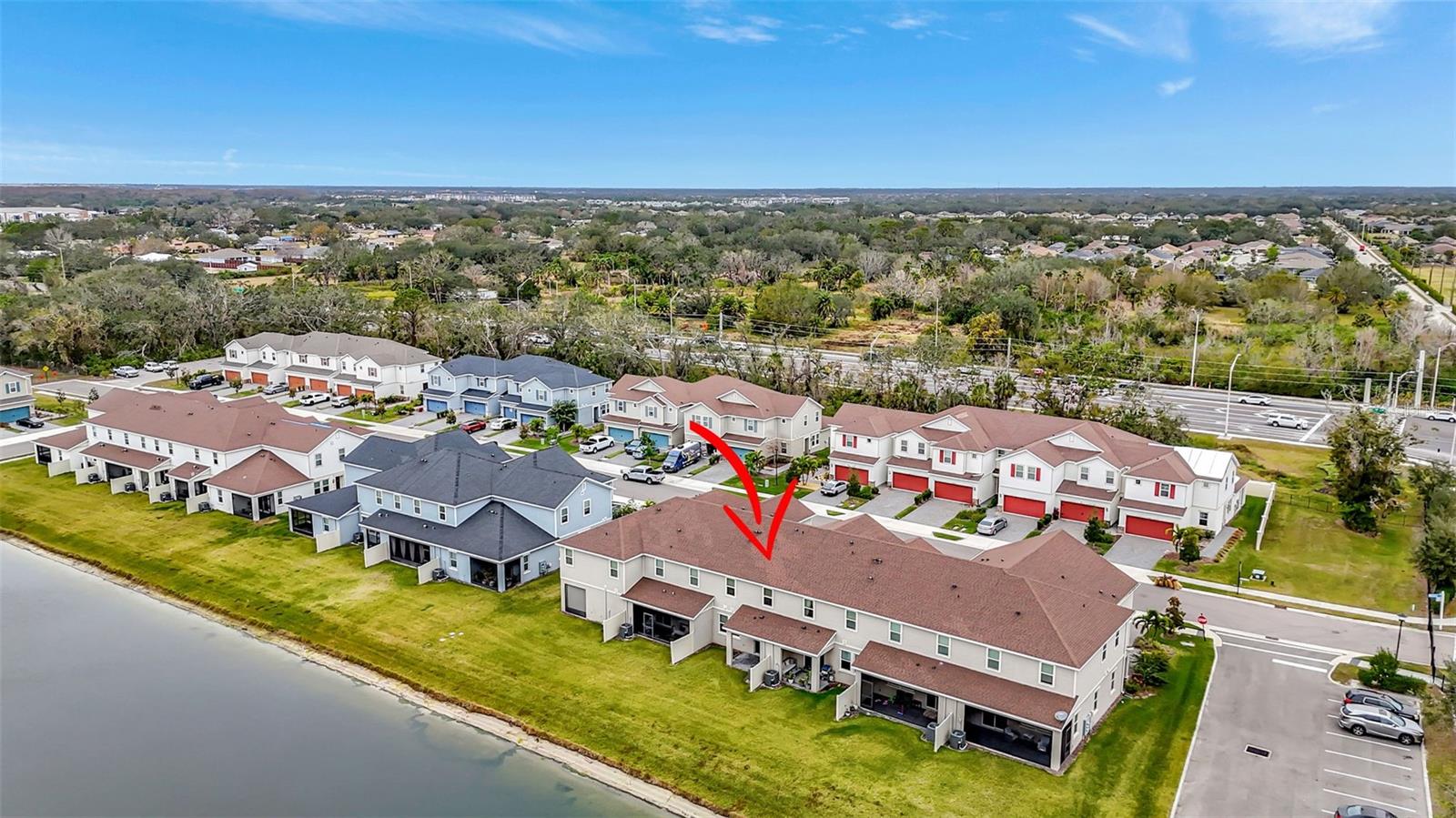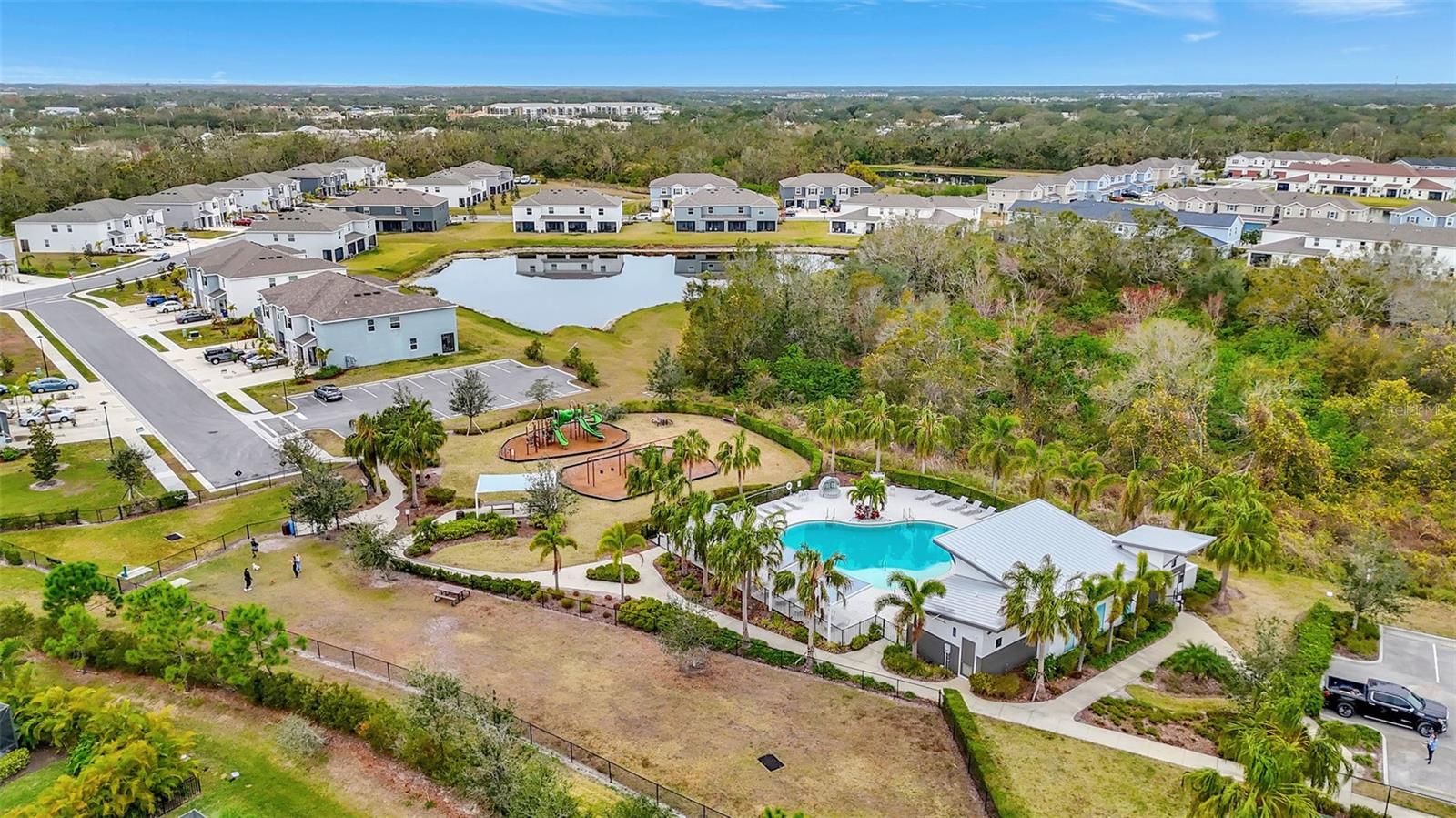 One or more photo(s) has been virtually staged. Placed in the center of everything. This fantastic townhouse is in the sought after gated community of Woodleaf Hammock. This incredible floor plan with three bedrooms, two and a half bathrooms with wood-like plank tile throughout the downstairs and the hallways of the upstairs of the unit. This spacious open floor plan offers flexibility and functionality, with a large island granite counter and amazing kitchen, with SS appliances a large pantry, white cabinets and additional storage under the stairs. The kitchen and flex space have great views of the pond behind. Up the stairs is a grand master suite is on the second floor with tray ceilings, two walk in closets, ensuite bathroom with double sinks and wonderfully sized shower. The second and third bedrooms share a bathroom. Each of the bedrooms are carpeted. This HOA includes lawn maintenance, a resort style pool, pickleball courts, two dog parks, playground and community pavilion with outdoor kitchen. Centrally located with St. Pete to the north, Sarasota to the southwest, Anna Maria Island the direct Gulf beach and Lakewood Ranches downtown areas close towards the south. A Costco five minutes away at the entrance to the highway.