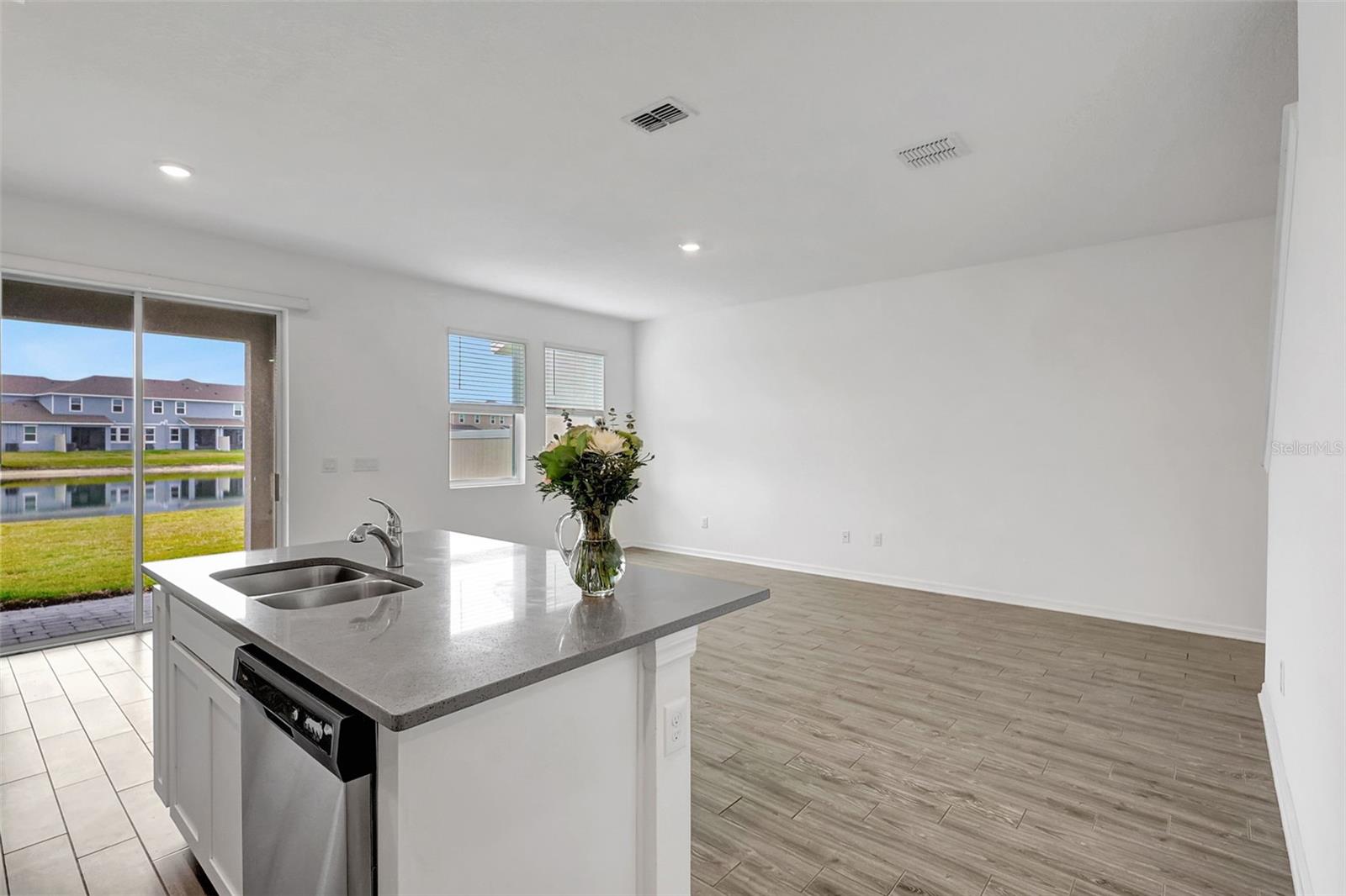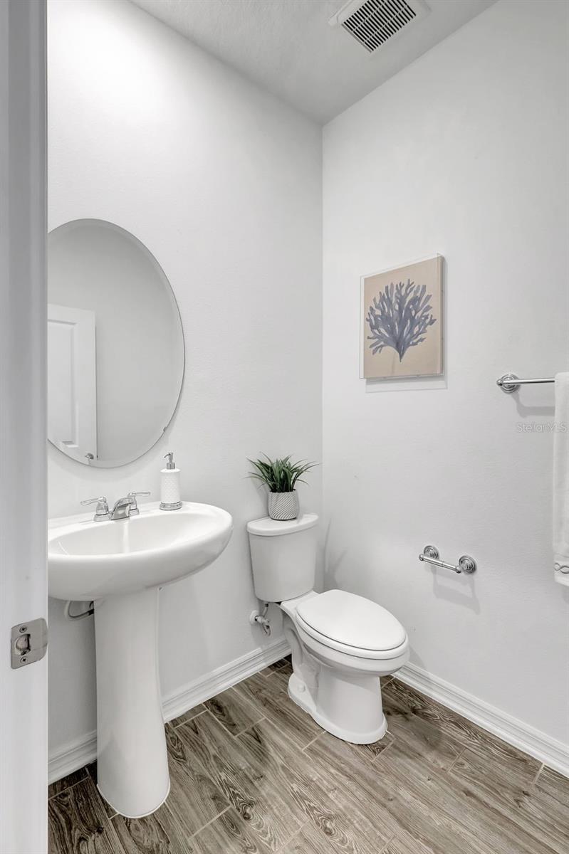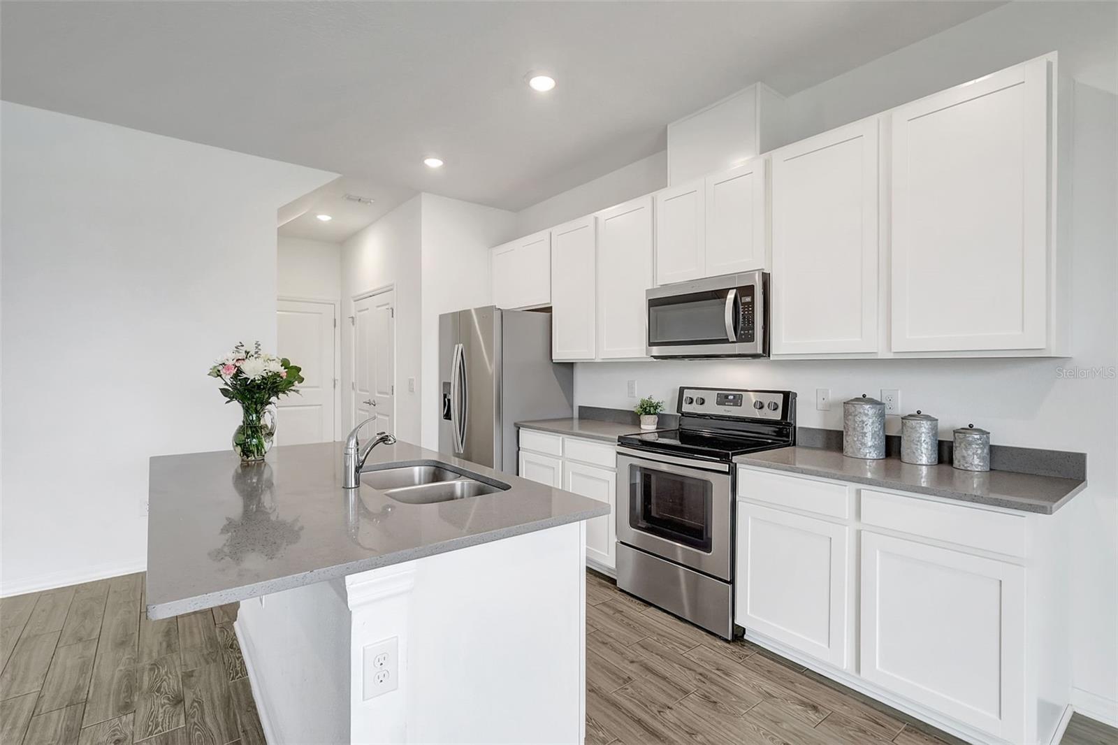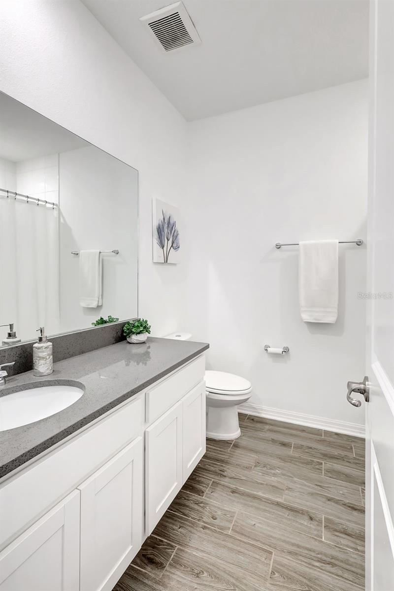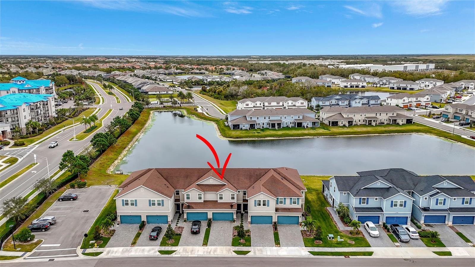 One or more photo(s) has been virtually staged. Placed in the center of everything. This fantastic townhouse is in the sought after gated community of Woodleaf Hammock. This incredible floor plan with three bedrooms, two and a half bathrooms with wood-like plank tile throughout the downstairs and the hallways of the upstairs of the unit. This spacious open floor plan offers flexibility and functionality, with a large island granite counter and amazing kitchen, with SS appliances a large pantry, white cabinets and additional storage under the stairs. The kitchen and flex space have great views of the pond behind. Up the stairs is a grand master suite is on the second floor with tray ceilings, two walk in closets, ensuite bathroom with double sinks and wonderfully sized shower. The second and third bedrooms share a bathroom. Each of the bedrooms are carpeted. This HOA includes lawn maintenance, a resort style pool, pickleball courts, two dog parks, playground and community pavilion with outdoor kitchen. Centrally located with St. Pete to the north, Sarasota to the southwest, Anna Maria Island the direct Gulf beach and Lakewood Ranches downtown areas close towards the south. A Costco five minutes away at the entrance to the highway.