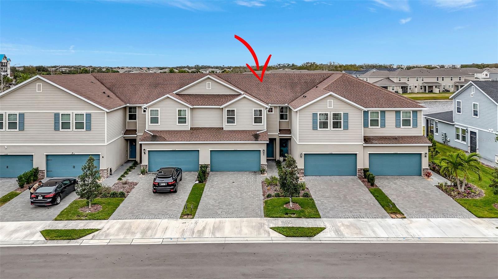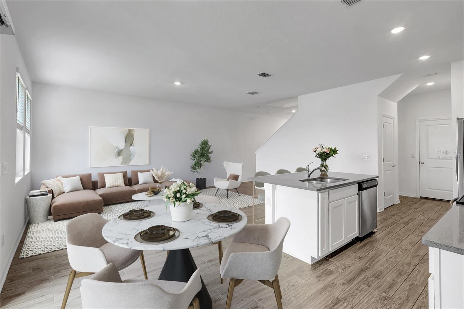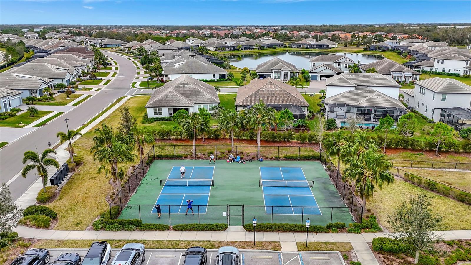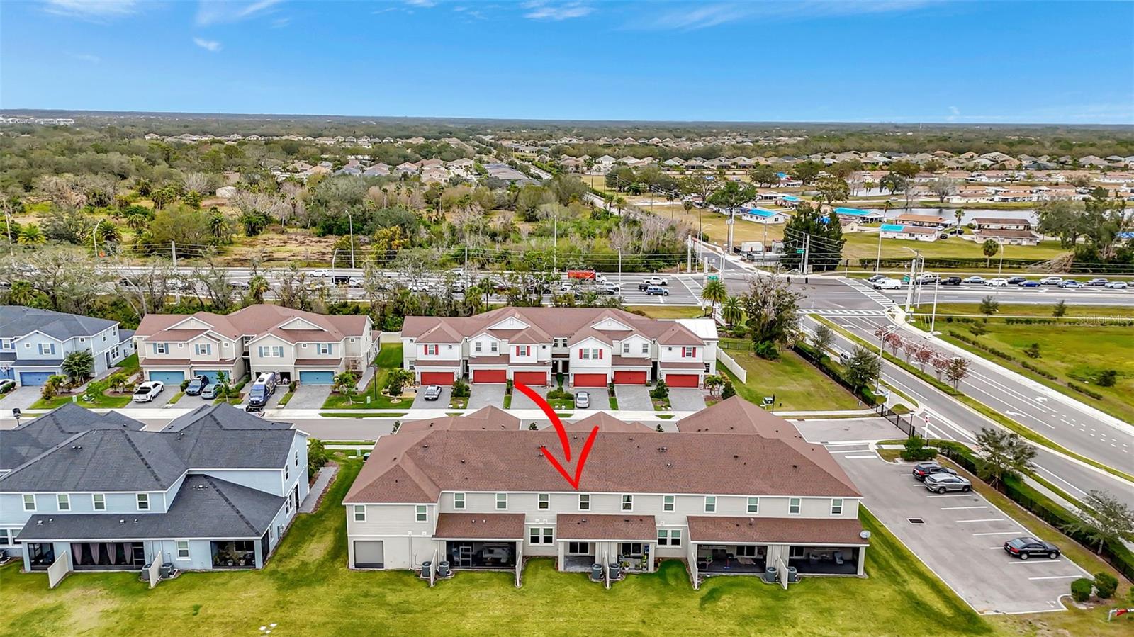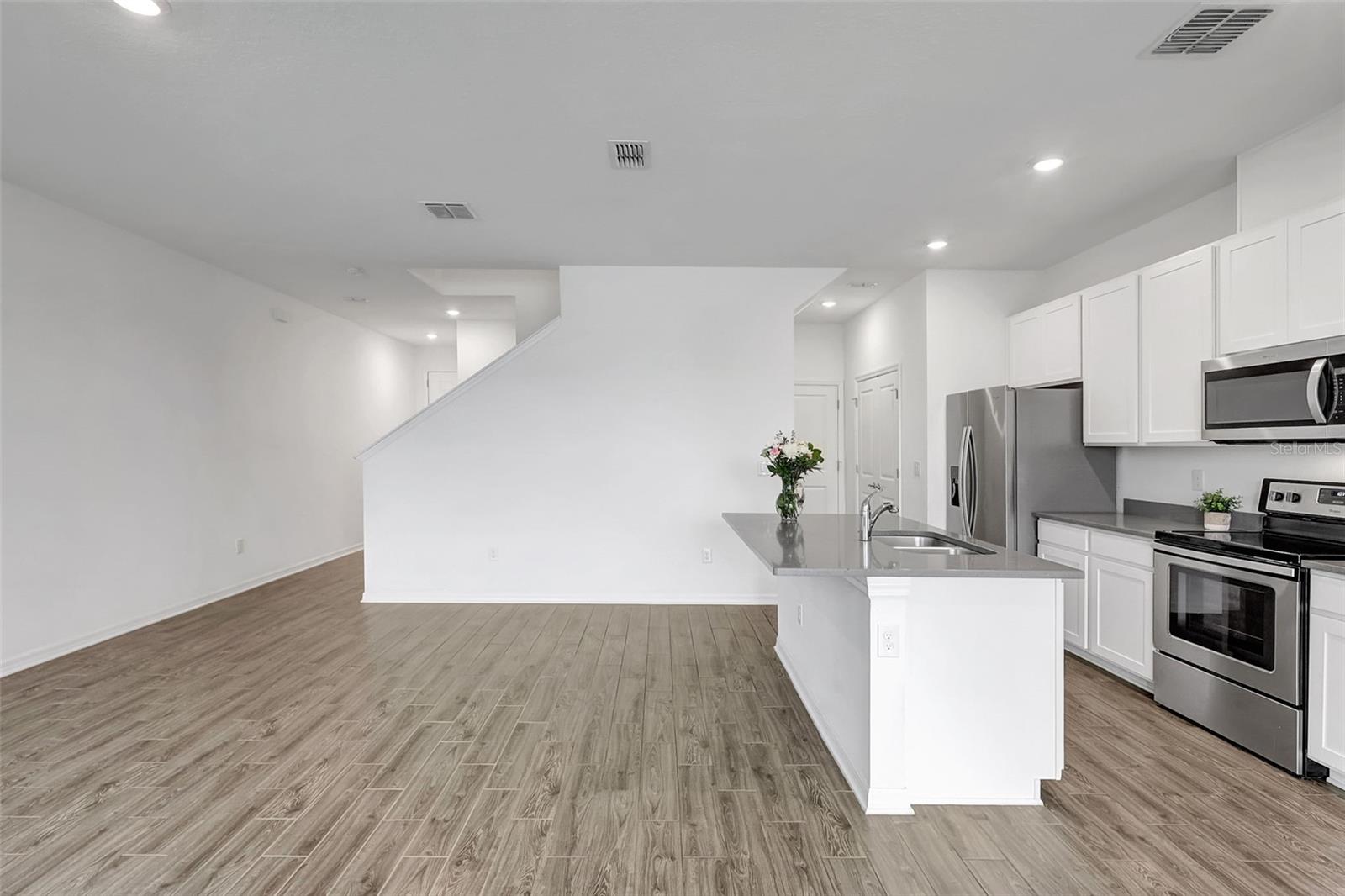 One or more photo(s) has been virtually staged. Placed in the center of everything. This fantastic townhouse is in the sought after gated community of Woodleaf Hammock. This incredible floor plan with three bedrooms, two and a half bathrooms with wood-like plank tile throughout the downstairs and the hallways of the upstairs of the unit. This spacious open floor plan offers flexibility and functionality, with a large island granite counter and amazing kitchen, with SS appliances a large pantry, white cabinets and additional storage under the stairs. The kitchen and flex space have great views of the pond behind. Up the stairs is a grand master suite is on the second floor with tray ceilings, two walk in closets, ensuite bathroom with double sinks and wonderfully sized shower. The second and third bedrooms share a bathroom. Each of the bedrooms are carpeted. This HOA includes lawn maintenance, a resort style pool, pickleball courts, two dog parks, playground and community pavilion with outdoor kitchen. Centrally located with St. Pete to the north, Sarasota to the southwest, Anna Maria Island the direct Gulf beach and Lakewood Ranches downtown areas close towards the south. A Costco five minutes away at the entrance to the highway.