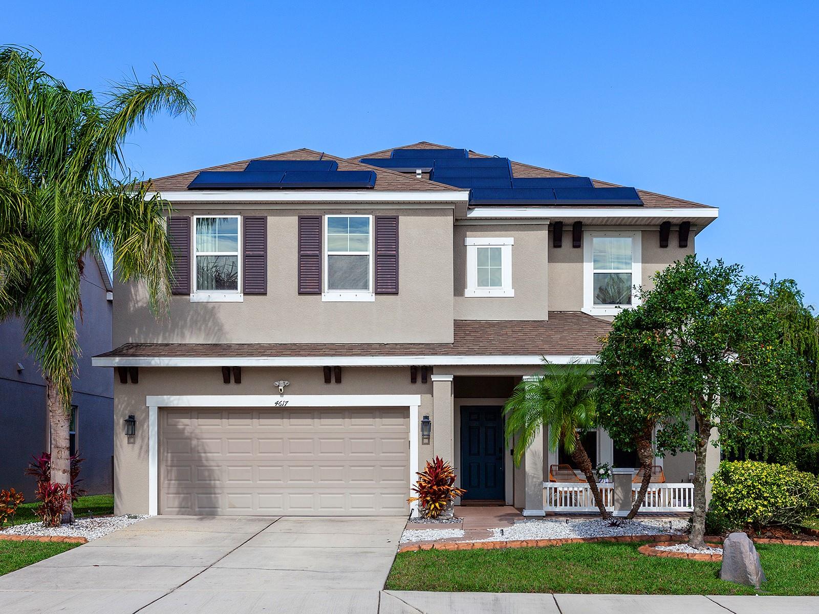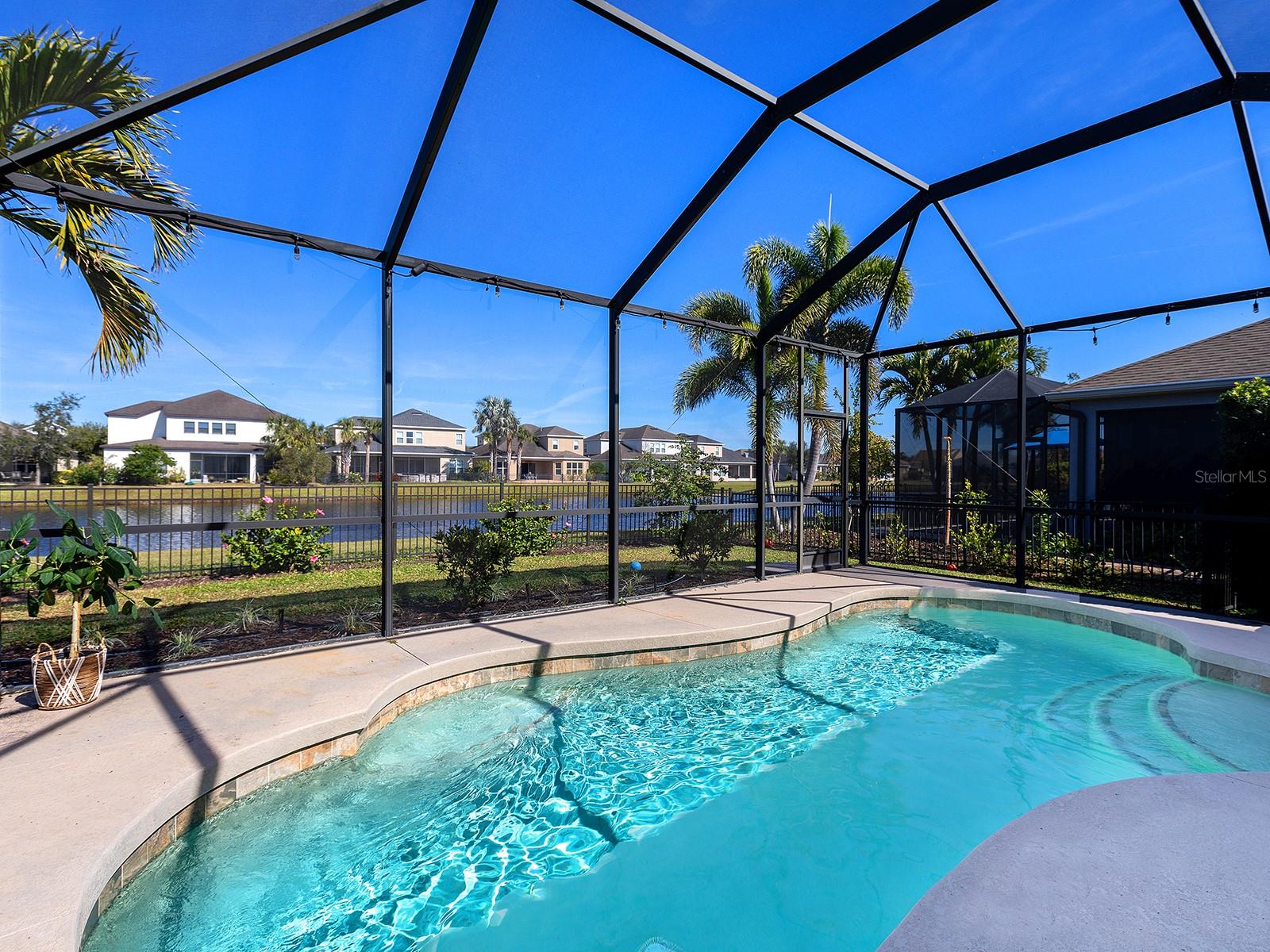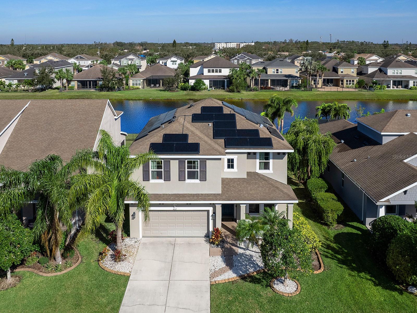 MOTIVATED SELLER! Move-in Ready Pool Home with Lake View in Gated Arbor Reserve. Discover the perfect blend of comfort, space, and efficiency in this beautifully upgraded 4-bedroom, 3-bathroom home with a private saltwater pool and 2-car garage, located in the sought-after gated community of Arbor Reserve. With nearly 2,600 sq. ft. of living space, this expansive two-story Miramar Model offers a versatile layout ideal for families, entertaining, and working from home. Step inside to find serene water views and designer finishes throughout—including granite countertops, crown molding, engineered hardwood floors, and an elegant color palette. The open-concept living area flows seamlessly into the oversized covered lanai, where you’ll enjoy relaxing by the sparkling pool with peaceful lake views. A wrought iron fence and fresh landscaping complete the outdoor oasis. The main floor includes a guest bedroom with a full bath, a dedicated home office, and a welcoming living area situated near the heart of the home- the kitchen. This vibrant kitchen boasts a large island and picturesque water views,- making it ideal for entertaining. Upstairs, you will find a generous bonus space offering endless possibilities for work, play, or relaxation. You'll fall in love with the spacious primary suite, featuring tranquil lake views, dual vanities, and walk in closets. Two additional bedrooms, a full bathroom, and a conveniently located laundry room complete the upstairs living space. This home is not just beautiful—it's also efficient. Equipped with a Tesla solar power system, plus two Carrier A/C units, you'll benefit from reduced electric bills and peace of mind during power outages. Community amenities include: Gated access, Community pool, Cabana with outdoor kitchen, Playground & basketball/sports court. Low HOA, no CDD fees, and no flood zone. Prime location just minutes to Lakewood Ranch, Sarasota, Bradenton, UTC Mall, I-75, SRQ Airport, and world-renowned beaches like Siesta Key and Lido Key. Schedule your private showing today! Experience Florida living at its best—Welcome Home!