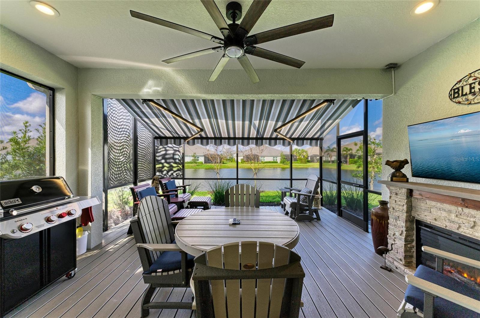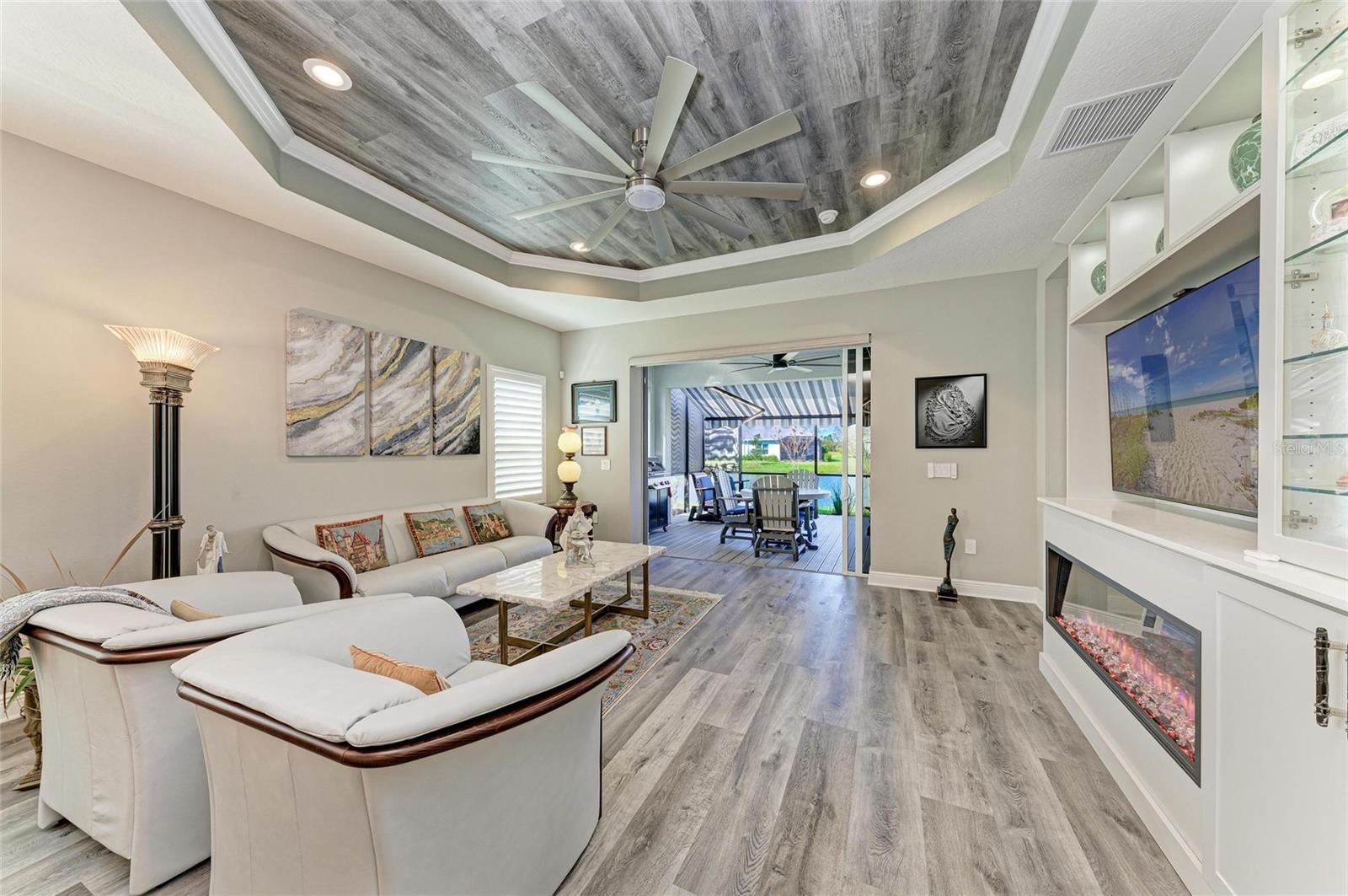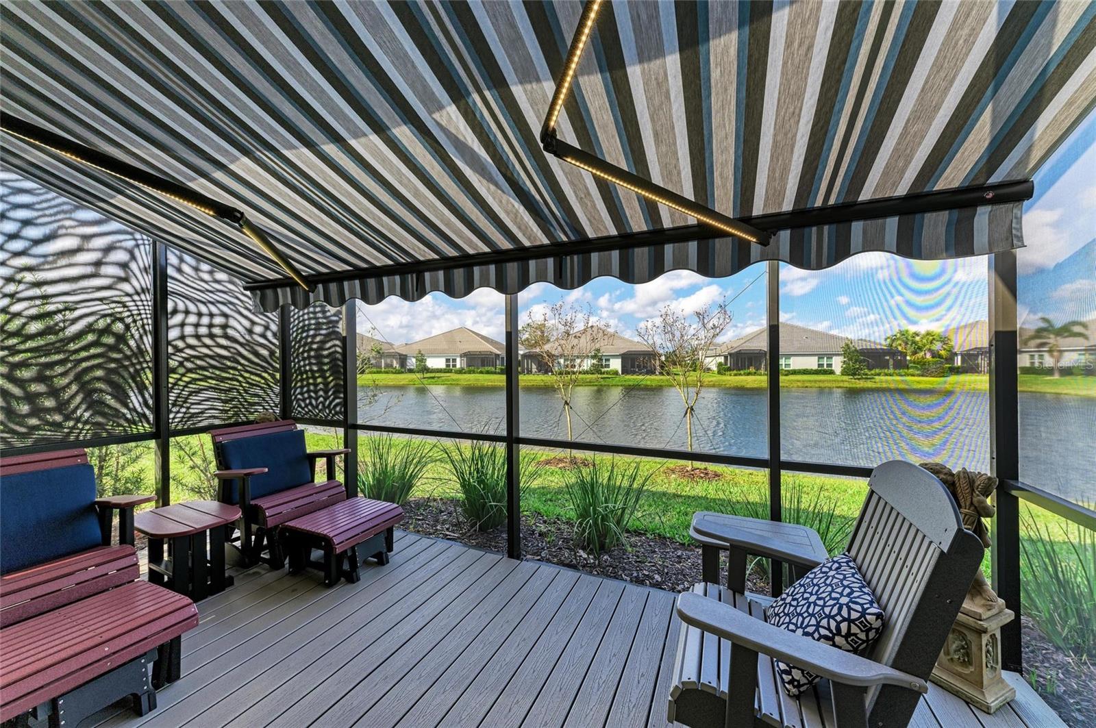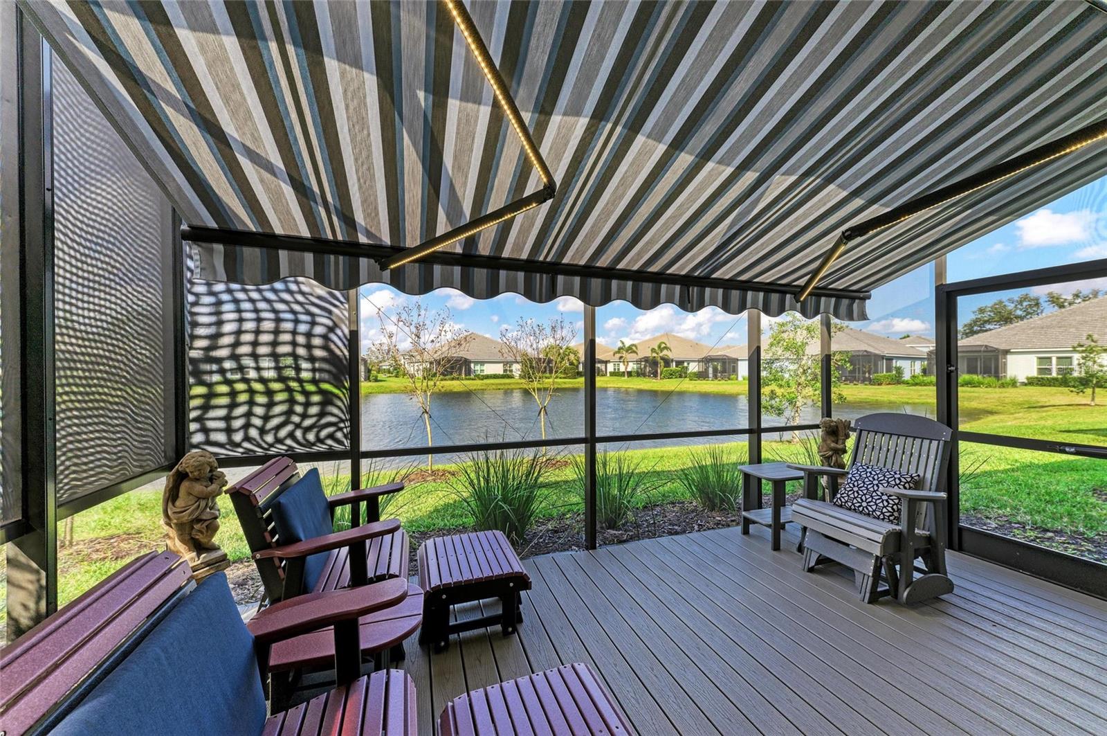 Come see this elegant home with high-end upgrades throughout backing to Lake. 3 bedrooms plus den, 2-Car Garage. Over $150,000+ in premium high-end upgrades. A MUST SEE. Move in ready. Enjoy the Florida lifestyle in this model-like 2-year gorgeous Neal Villa in like-new condition. ADA compliant and features a hurricane leaded glass front door with a removable stainless-steel ramp and many other extra conveniences. Popular gated Indigo, a resort lifestyle, and easy access to everything in LWR. Villas have a separate private community pool and fitness that is just around the corner and is in addition to the large Community Pool and Clubhouse. See the 3-page feature list of the high-end upgrades. Featuring a beautiful outdoor extended, super screened Lanai with the highest grade Trex composite decking, reflective privacy screening, and with remote controlled electric Sunbrella Awning with LED lighting, a beautiful fireplace, and a TV, overlooking the lake. Great for relaxing and entertaining. All neutral interior décor. Upon entering the home you’ll see a new leaded glass hurricane door with Schlage locks. Large Entry Hall. Open concept with the Great Room open to the Dining Room and Kitchen, and features a tray ceiling with custom finish, built-in Electric Fireplace with LED lighting, Custom Entertainment Center with glass cabinets for displays, and more. The dining room chandelier is a premium work of art. 4” Wide custom Plantation Shutters throughout. All flooring is high end luxury waterproof vinyl with whisper quiet underlayment. 3M Prestige Ultra High Impact Security and UV film on all windows and sliders. The Kitchen features soft pale cloud gray cabinets with high end marble pulls, upgraded GE Cafe stainless steel appliances with added brass handles, slide in induction stove with double oven, designer sink with high arch faucet, and matching soap dispenser. Quiet Garbage Insinkerator Disposal. Super quiet Dishwasher. Built in Pantry. Laundry Room with top-of-the-line Electrolux Washer/Gas Dryer on Pedestals, many added cabinets and sink. Den is off the Great Room with a double door. Large Primary Bedroom with customized walk-in closet, built-in makeup vanity, many ample shoe racks, cabinets and clothes hanging, designer porcelain full accent wall, and ensuite bath. The Primary bath features a fully customized large walk-in shower with rain glass, no threshold entry door, wheelchair friendly. Guest Bedrooms have built-in closets and share a large full bath with shower/tub combination. The 2-car insulated garage door features - new Carriage Lights that turn on/off automatically dusk to dawn, full ceiling insulation, Culligan water softener and purification, flooring with high-tech epoxy granite process with lifetime warranty, and Electric Charging Station. Whole house gutters. Lots of new landscaping including a Royal Palm tree, Crape Myrle trees, tall bushes and flowers. Indigo is right in the heart of Lakewood Ranch and features a Clubhouse, Tennis Courts, Fitness, Dog Park, Activity Director with Activities galore. Close to Siesta Key Beach, downtown Sarasota, UTC Mall, Airports. Treat yourself and see this beauty. Easy to show and see.