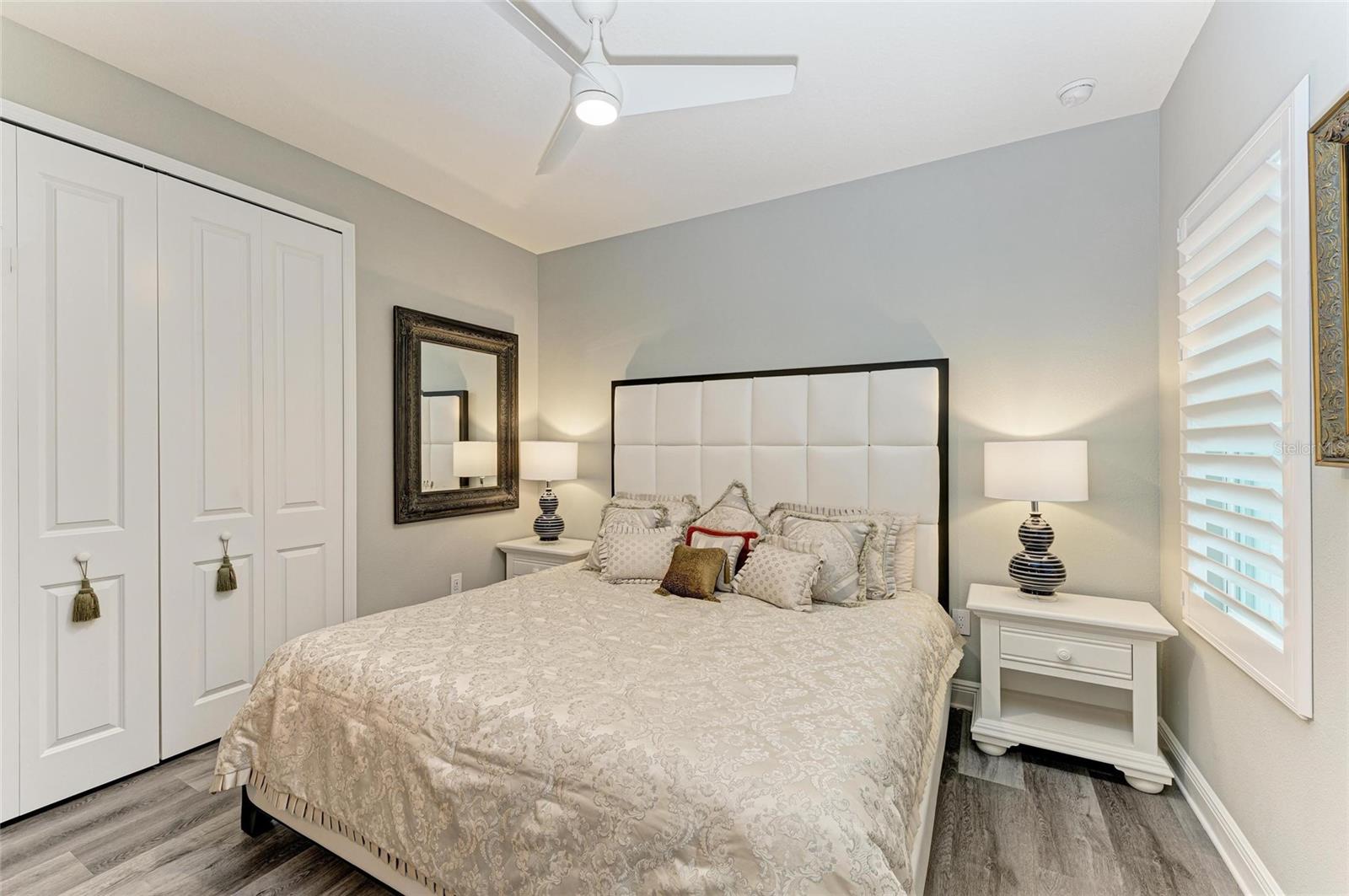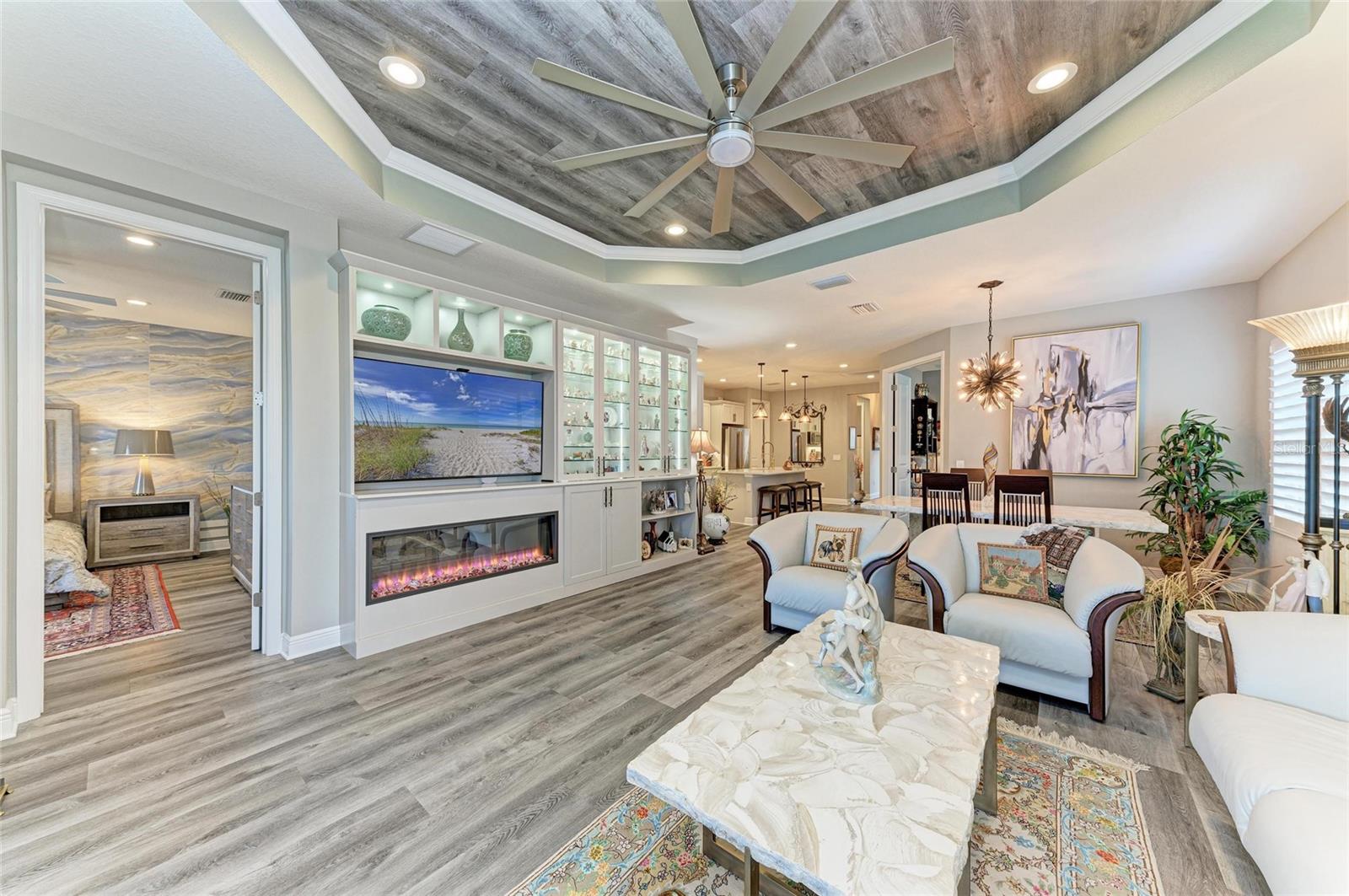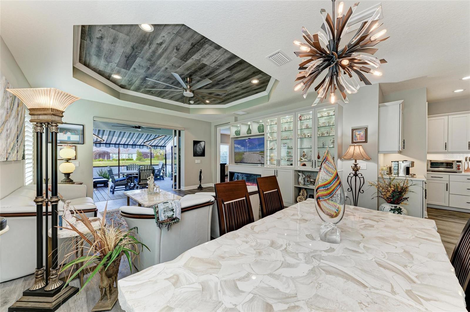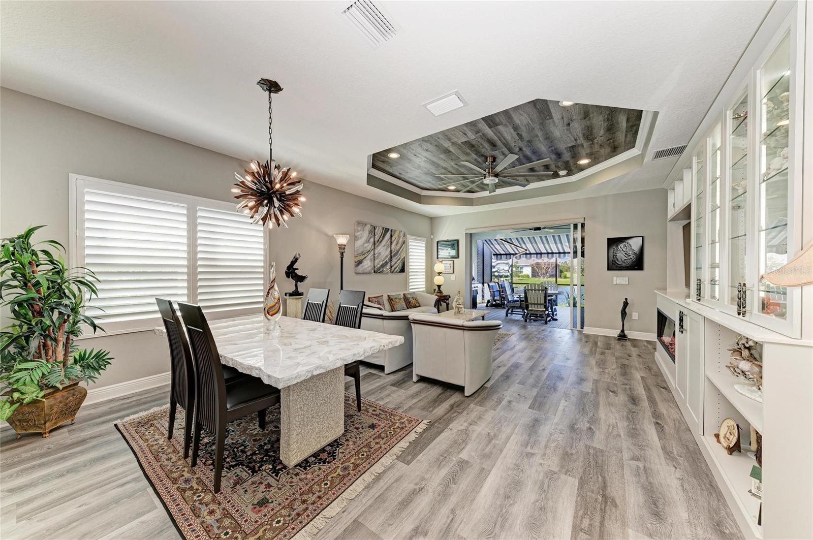 Come see this elegant home with high-end upgrades throughout backing to Lake. 3 bedrooms plus den, 2-Car Garage. Over $150,000+ in premium high-end upgrades. A MUST SEE. Move in ready. Enjoy the Florida lifestyle in this model-like 2-year gorgeous Neal Villa in like-new condition. ADA compliant and features a hurricane leaded glass front door with a removable stainless-steel ramp and many other extra conveniences. Popular gated Indigo, a resort lifestyle, and easy access to everything in LWR. Villas have a separate private community pool and fitness that is just around the corner and is in addition to the large Community Pool and Clubhouse. See the 3-page feature list of the high-end upgrades. Featuring a beautiful outdoor extended, super screened Lanai with the highest grade Trex composite decking, reflective privacy screening, and with remote controlled electric Sunbrella Awning with LED lighting, a beautiful fireplace, and a TV, overlooking the lake. Great for relaxing and entertaining. All neutral interior décor. Upon entering the home you’ll see a new leaded glass hurricane door with Schlage locks. Large Entry Hall. Open concept with the Great Room open to the Dining Room and Kitchen, and features a tray ceiling with custom finish, built-in Electric Fireplace with LED lighting, Custom Entertainment Center with glass cabinets for displays, and more. The dining room chandelier is a premium work of art. 4” Wide custom Plantation Shutters throughout. All flooring is high end luxury waterproof vinyl with whisper quiet underlayment. 3M Prestige Ultra High Impact Security and UV film on all windows and sliders. The Kitchen features soft pale cloud gray cabinets with high end marble pulls, upgraded GE Cafe stainless steel appliances with added brass handles, slide in induction stove with double oven, designer sink with high arch faucet, and matching soap dispenser. Quiet Garbage Insinkerator Disposal. Super quiet Dishwasher. Built in Pantry. Laundry Room with top-of-the-line Electrolux Washer/Gas Dryer on Pedestals, many added cabinets and sink. Den is off the Great Room with a double door. Large Primary Bedroom with customized walk-in closet, built-in makeup vanity, many ample shoe racks, cabinets and clothes hanging, designer porcelain full accent wall, and ensuite bath. The Primary bath features a fully customized large walk-in shower with rain glass, no threshold entry door, wheelchair friendly. Guest Bedrooms have built-in closets and share a large full bath with shower/tub combination. The 2-car insulated garage door features - new Carriage Lights that turn on/off automatically dusk to dawn, full ceiling insulation, Culligan water softener and purification, flooring with high-tech epoxy granite process with lifetime warranty, and Electric Charging Station. Whole house gutters. Lots of new landscaping including a Royal Palm tree, Crape Myrle trees, tall bushes and flowers. Indigo is right in the heart of Lakewood Ranch and features a Clubhouse, Tennis Courts, Fitness, Dog Park, Activity Director with Activities galore. Close to Siesta Key Beach, downtown Sarasota, UTC Mall, Airports. Treat yourself and see this beauty. Easy to show and see.