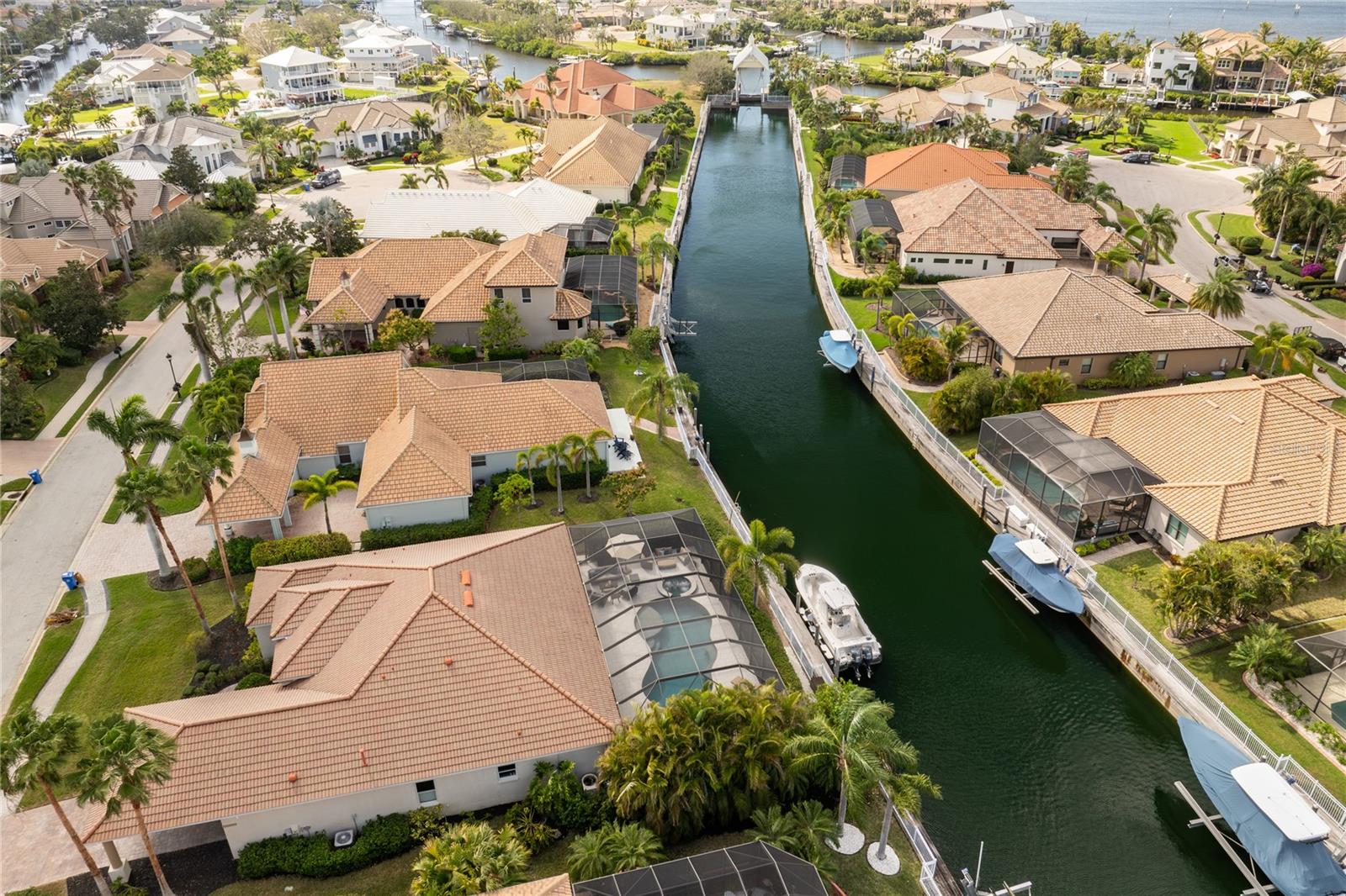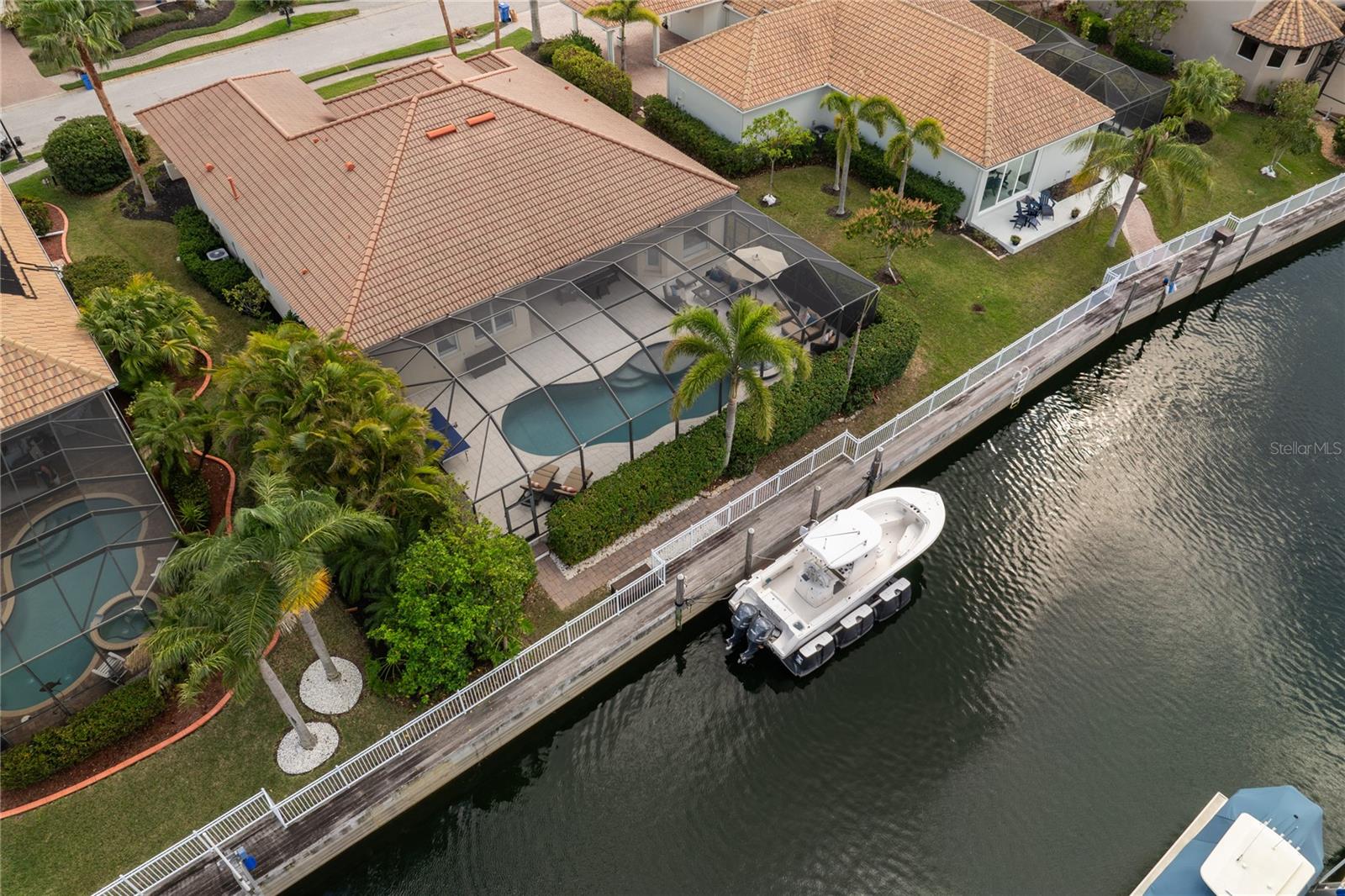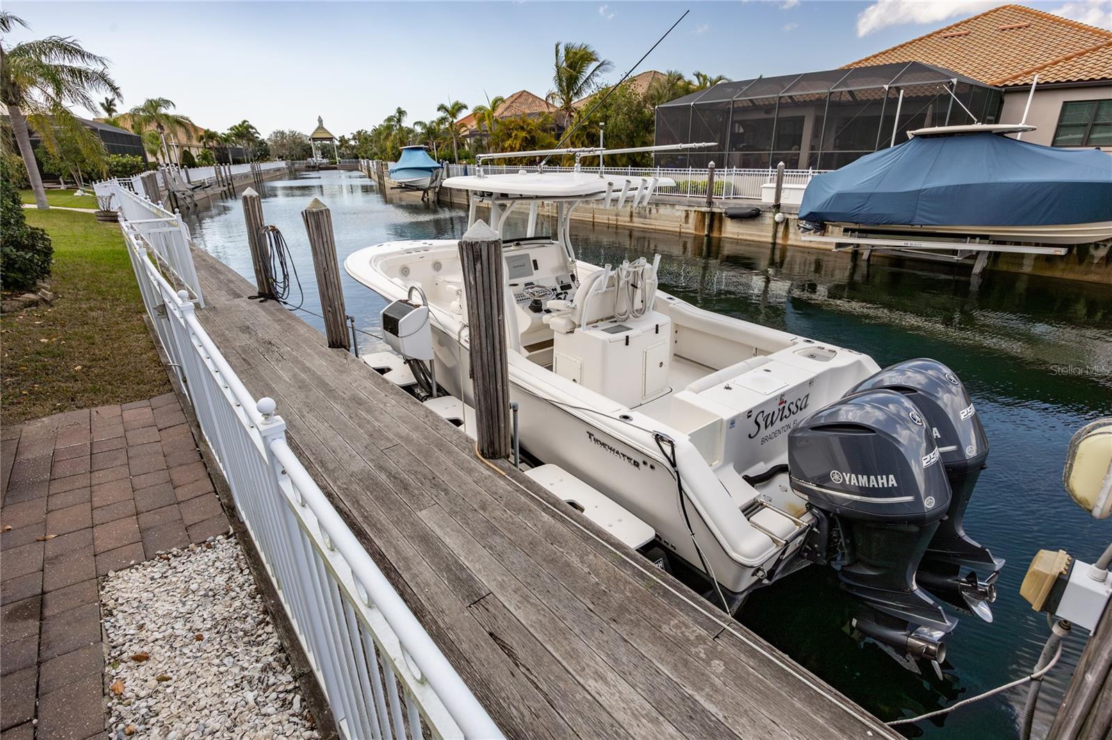 LOCATION... LOCATION... LOCATION... – AND FULLY FURNISHED!!! EXCLUSIVE GATED BOATING COMMUNITY Experience refined coastal luxury in this exceptional waterfront home, where exquisite craftsmanship and thoughtful design create a seamless blend of elegance, comfort, and indoor-outdoor living. Nestled in an exclusive gated boating community, this residence offers direct access to the Gulf of Mexico and features a private dock with a built-in elevator boat lift, providing the ultimate convenience for water enthusiasts. Situated on a private canal, this home boasts a resort-style salt water pool and spa with tranquil waterfalls, surrounded by lush, meticulously landscaped grounds that enhance both privacy and beauty. The expansive lanai serves as a true outdoor retreat, featuring a welcoming dining area with a custom concrete table, ample seating, and a relaxing lounge space, making it ideal for both quiet mornings and lively gatherings. Disappearing sliders seamlessly connect the great room to the outdoors, creating a harmonious transition between interior and exterior living spaces. Inside, the kitchen offers elegant cabinetry, sleek granite countertops, stainless steel appliances, and a spacious granite island with bar seating. A charming breakfast nook with a bay window overlooks the pool and lanai, adding to the home's inviting ambiance. A walk-in pantry provides additional storage and functionality. The open-concept design ensures a natural flow between the kitchen, dining area, and great room, where designer lighting and elegant finishes add a touch of sophistication. The versatile den/office, complete with a built-in Murphy bed, can easily serve as a fourth bedroom, making it ideal for guests, remote work, or a personal retreat. The primary suite is a private sanctuary, featuring his-and-her walk-in closets and a spa-inspired bath with a luxurious shower, deep soaking garden tub, and dual vanities. A glass-paned door opens directly to the lanai, allowing for effortless indoor-outdoor living. A paver walkway leads from the lanai to the private dock, offering easy access to the Manatee River and Gulf of Mexico. The partially fenced backyard is meticulously designed with tropical landscaping to enhance privacy while creating a serene setting. A spacious two-car garage with built-in storage provides ample space for vehicles and equipment. Lightly lived in and used only seasonally by the current owners, this home is truly Turnkey—FULLY FURNISHED and ready to move in. Residents of Harbour Walk at The Inlets enjoy an array of premium amenities, including a tennis court, a playground, an observation pier, scenic walking trails, and a kayak launch—all with no CDD fee. Conveniently located just minutes from world-renowned beaches and over 30 championship golf courses, this home offers the ultimate Florida lifestyle. Simply unlock the door and start living in paradise. Schedule your private tour today.