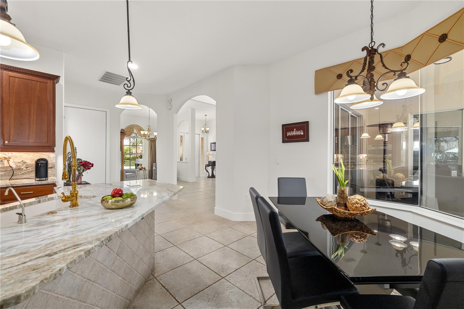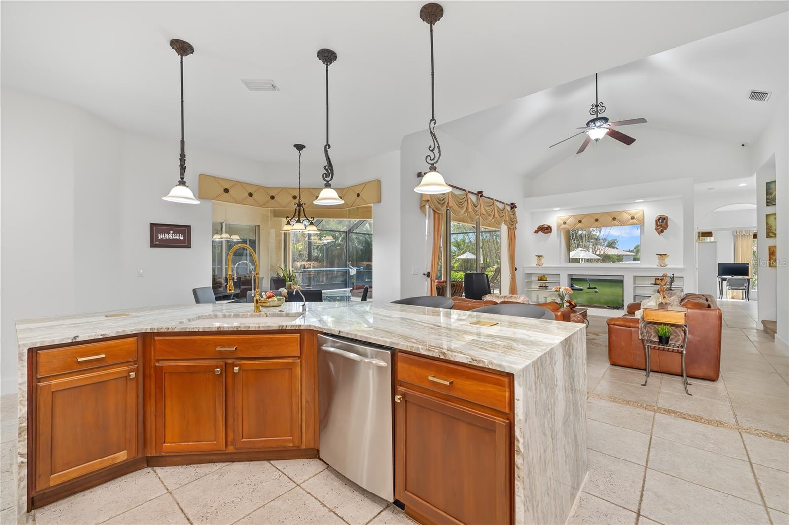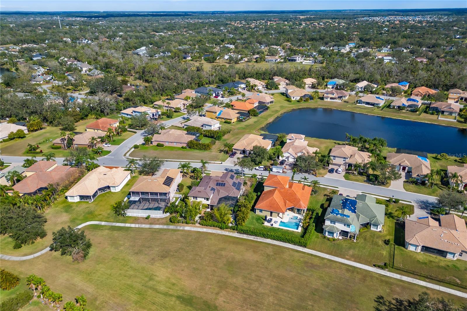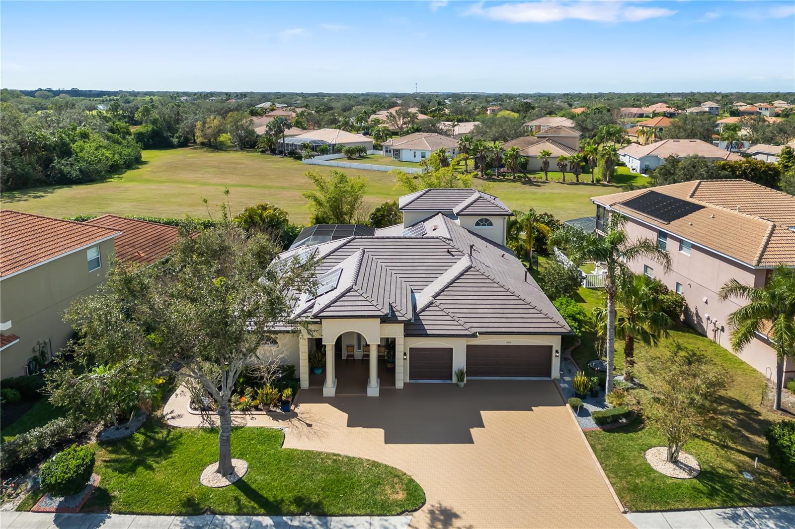 Gorgeous Estate multigenerational home, 12810 Daisy Place, a true masterpiece in the highly desirable, gated community of Greyhawk Landing, with resort style amenities for $75 a year. This quality-built estate showcases modern upgrades including a New Water Softener, NEW TILE ROOF, Solar Panel System, Gutters, and a fully fenced yard, all designed for Energy Efficiency and peace of mind. Step inside and be captivated by the timeless elegance of graceful archways, double tray and vaulted ceilings, crown molding, and inspired finishes. Thoughtfully laid out floor plan offers both privacy and connection, perfect for hosting loved ones of all ages. The heart of the home, a brand-new gourmet kitchen, is a chef’s dream featuring premium appliances, waterfall granite countertops, custom backsplash, under-cabinet lighting, and a breakfast bar that flows effortlessly into an expansive living area, ideal for entertaining or cozy nights in. The primary suite offers a private retreat with a spa-style bath including a soaking tub, oversized shower, dual vanities, and linen storage. Three additional bedrooms are generously sized with access to two beautifully appointed full bathrooms perfect for guests. Upstairs, a versatile bonus room with half bath and new mini bar is perfect for a guest suite, home office, media room, playroom, providing flexible living solutions for multigenerational needs. Triple pocket glass sliders open to a resort-style screened in pool surrounded by lush tropical landscaping, paver decking, and serene stone accents, creating the perfect setting for year-round entertaining, relaxation, and outdoor dining. Residence of Greyhawk have access to community amenities, two resort-style pools, Fitness center, Gym, Tennis, pickleball & basketball courts, Soccer & baseball fields, Fishing pier, Nature trails, lakes, and frequent wildlife sightings. Located near top A-rated schools, colleges, world-renowned beaches, golf, boating, medical facilities, and entertainment, this home is more than just a residence, it’s a lifestyle. Experience the best of Florida living, luxury, comfort, and room for everyone to thrive.