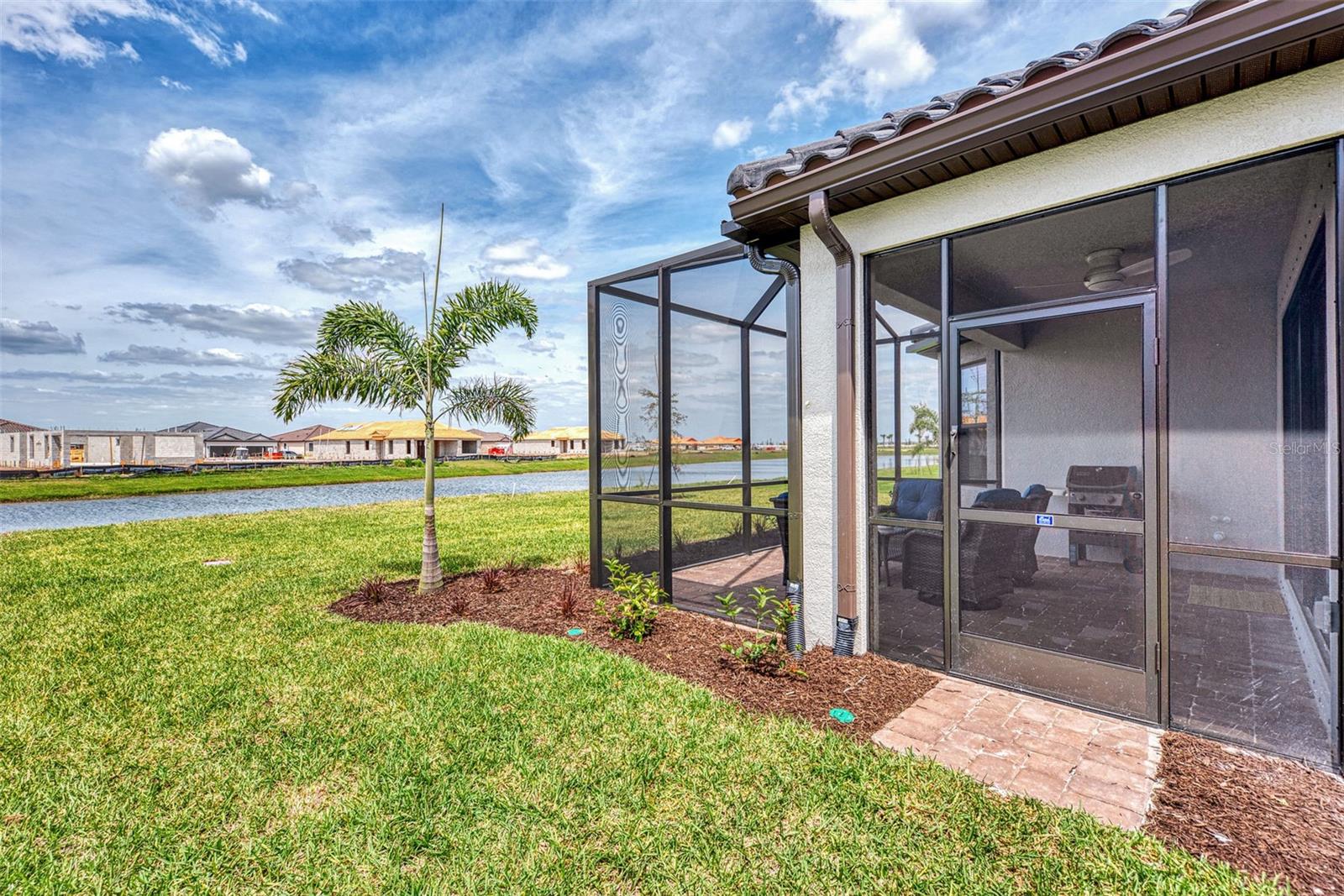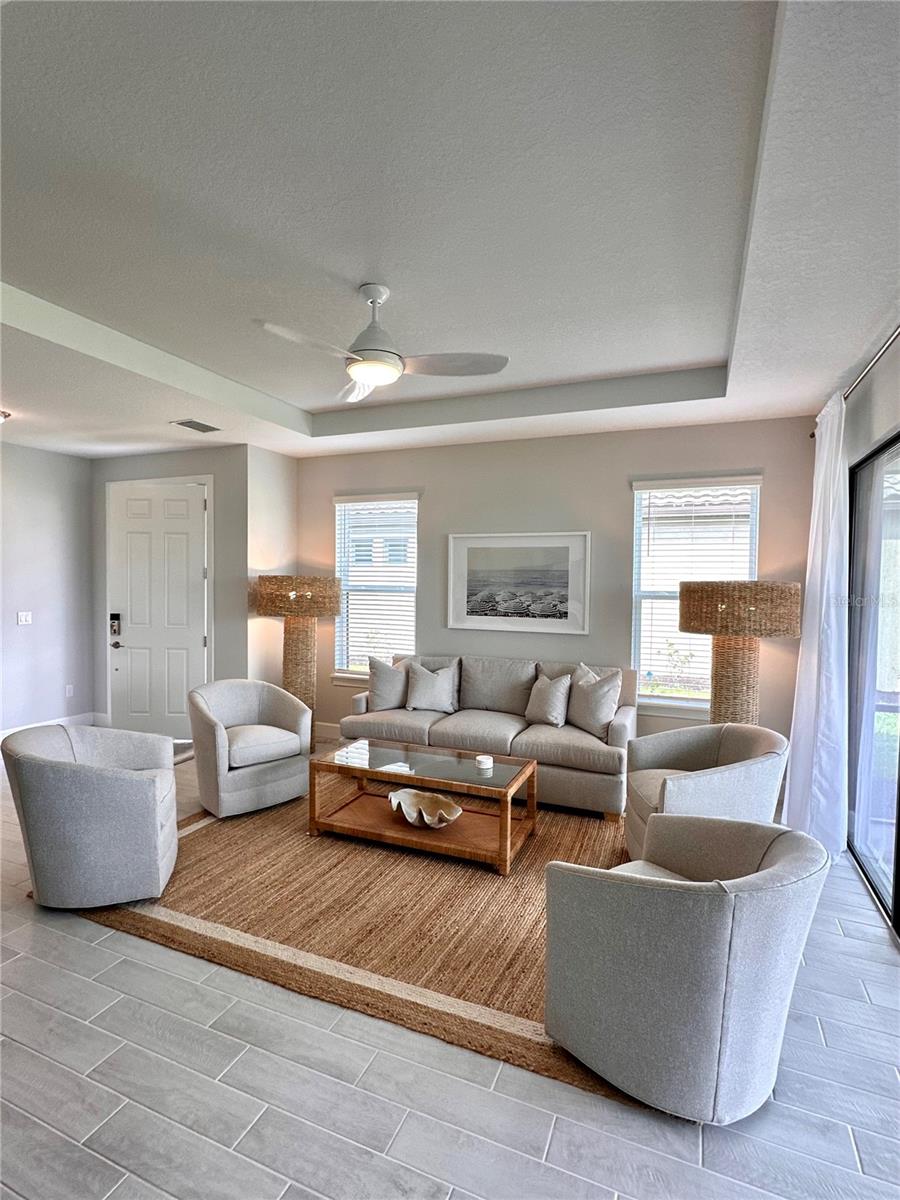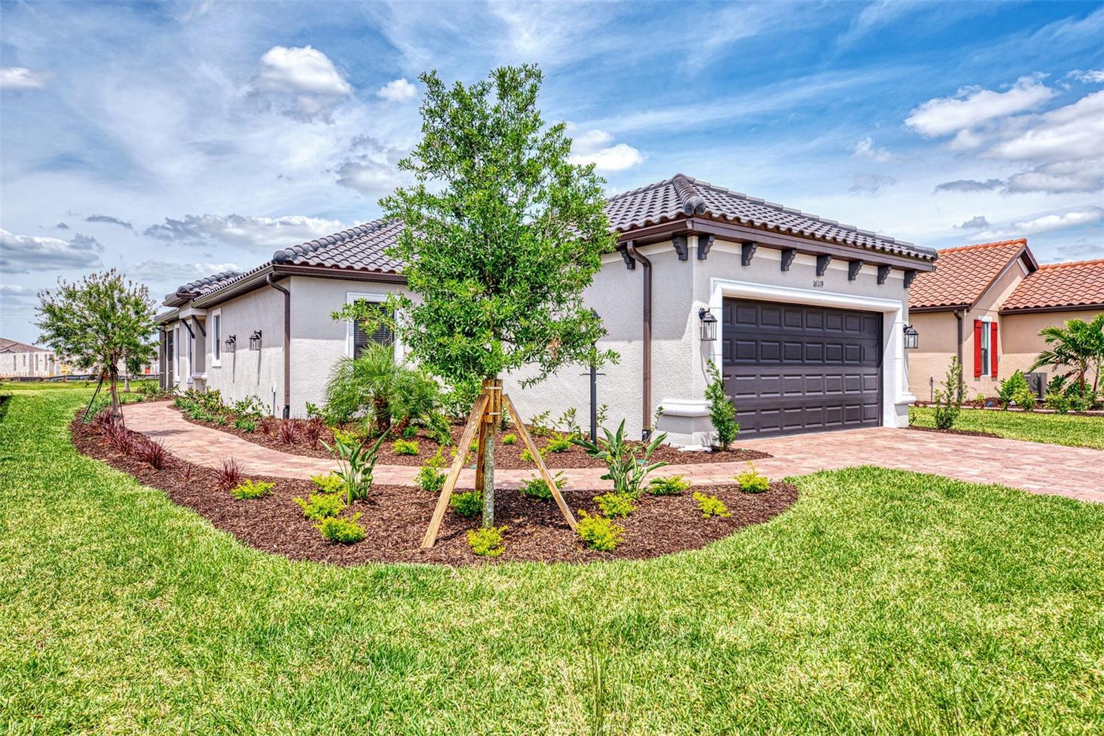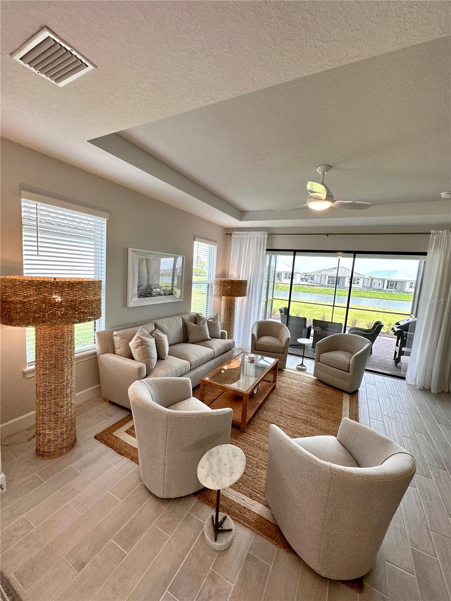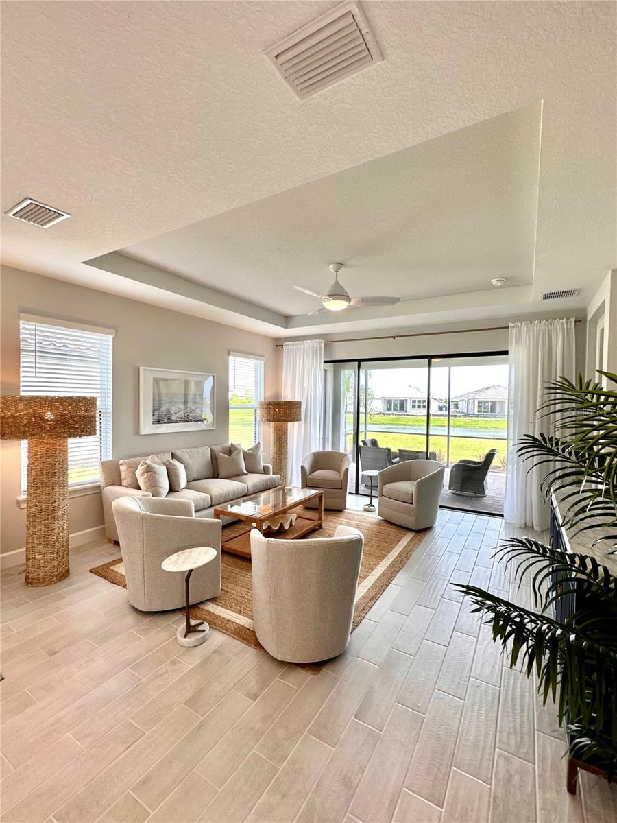 Welcome to this OVERSIZED HOMESITE, GOLF DEEDED WATERFRONT HOME (only one short-term four month rental ending 4/30/2025) turnkey furnished never-lived-in villa nestled in the serene, gated vibrant community of Esplanade at Azario in Lakewood Ranch where luxury meets convenience. This elegant and modern 2-bedroom/ 2-bath home with extended 2 car garage sits on an oversized lot with a gorgeous lake view. This home offers a spacious great room and den, providing the perfect blend of comfort and sophistication. Enjoy the opportunity of purchasing this professionally decorated (Katie Brandt Interiors) turn key home, just bring your suitcase and personal belongings. All the furniture and home items will be sold under a separate contract for $65,000. Upon entering, you are greeted by an open floor plan that seamlessly flows from the living area to the dining space, creating an inviting atmosphere for entertaining or relaxation. There are lots of windows with coffered ceilings in the living room and the master suite which makes this home feel open and light and brings the outside in. The designer kitchen boasts sleek, modern stainless-steel appliances, quartz countertops with ample counter space, making meal preparation a delight. The master suite offers a walk-in closet and a delightful bay window overlooking the lake. The master bath offers dual sinks with quartz countertops, vanity, and expansive walk-in shower. On the other side of the home is the 2nd bedroom with walk-in closet and full bath with quartz countertops. The den offers a pull-out queen sofa bed which can serve as an extra bedroom for guests. The inside laundry room provides plenty of storage space along with laundry sink. Step outside to the extended screened lanai, where you can savor tranquil moments with a cup of coffee or a good book, surrounded by the lush landscaping and gentle Florida breezes with a lake view. The property's large lot provides ample space for outdoor enjoyment. Azario is well known for being very social and active you will also love the NEW CULINARY EXPERIENCE as they have now completed the building. You are walking distance to the golf pro shop and the Bahama pool and clubhouse and Culinary building which is perfect for getting to know your neighbors. Located within a gated community, residents of this exquisite villa have access to the clubhouse, state-of-the-art fitness center, resort-style pool, tennis and pickleball courts, 18-hole golf state-of-the-art golf course including a water driving range, offering a myriad of recreational and leisure opportunities. With its modern design, spacious layout, and access to a host of amenities, this home offers the perfect blend of elegance and comfort making this delightful villa at 16119 Fortezza Drive a rare opportunity for those seeking a tranquil and luxurious lifestyle in Lakewood Ranch. COME SEE THIS HOME TODAY.