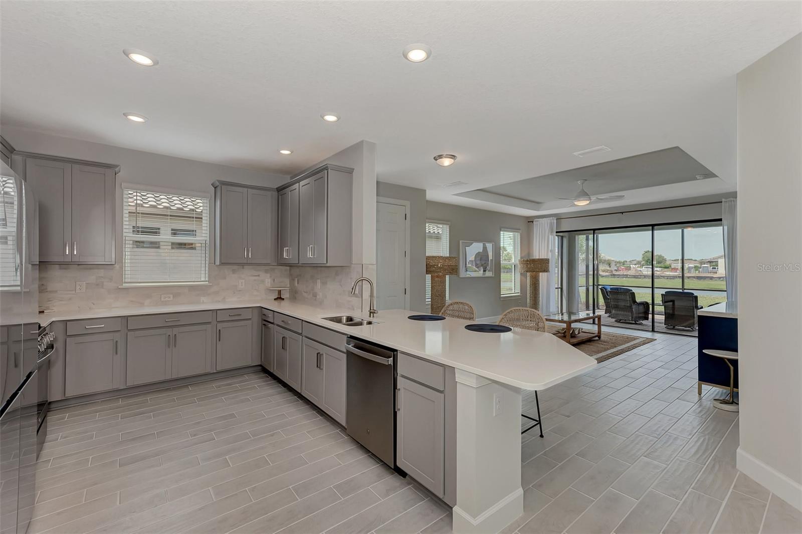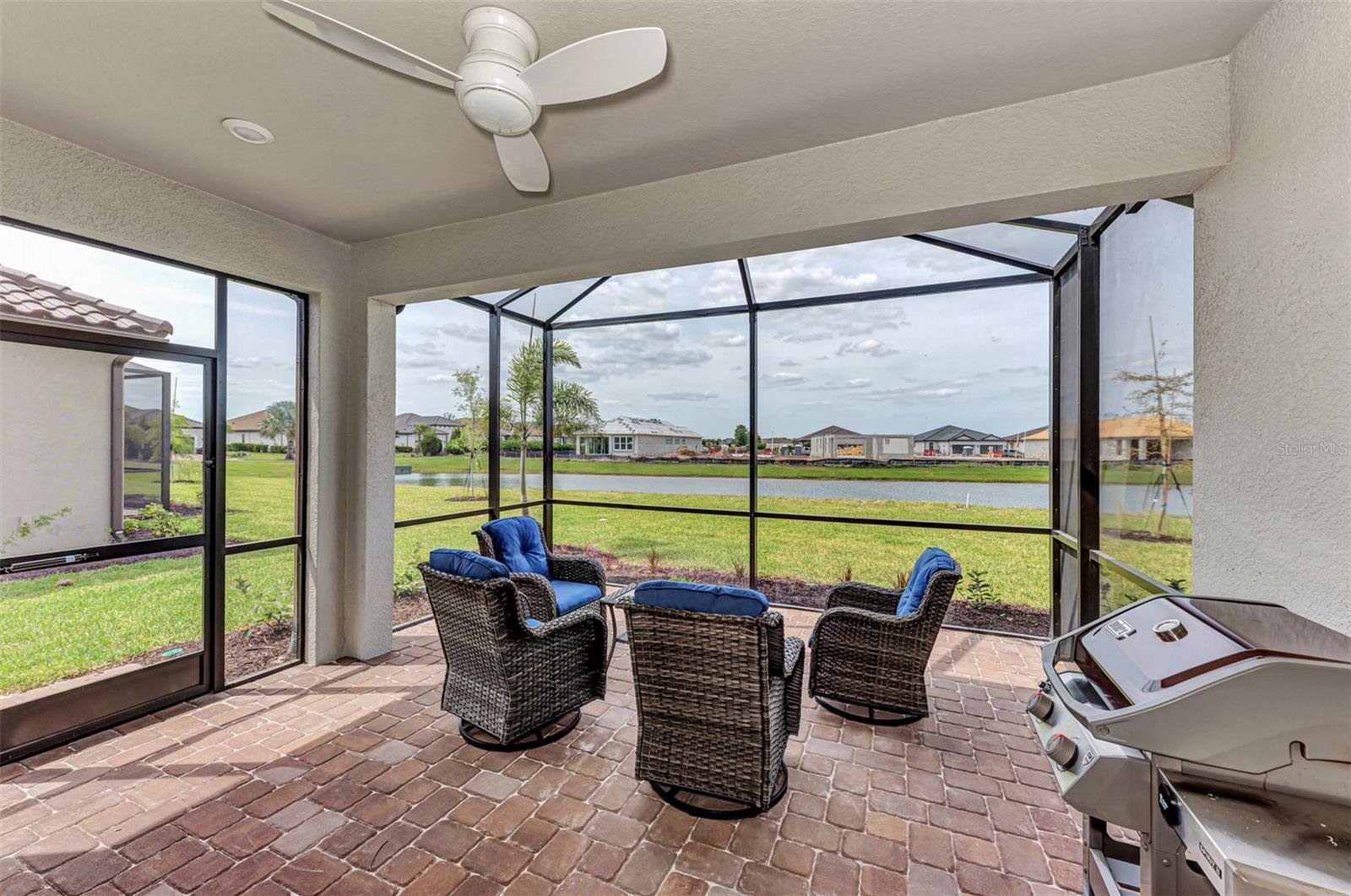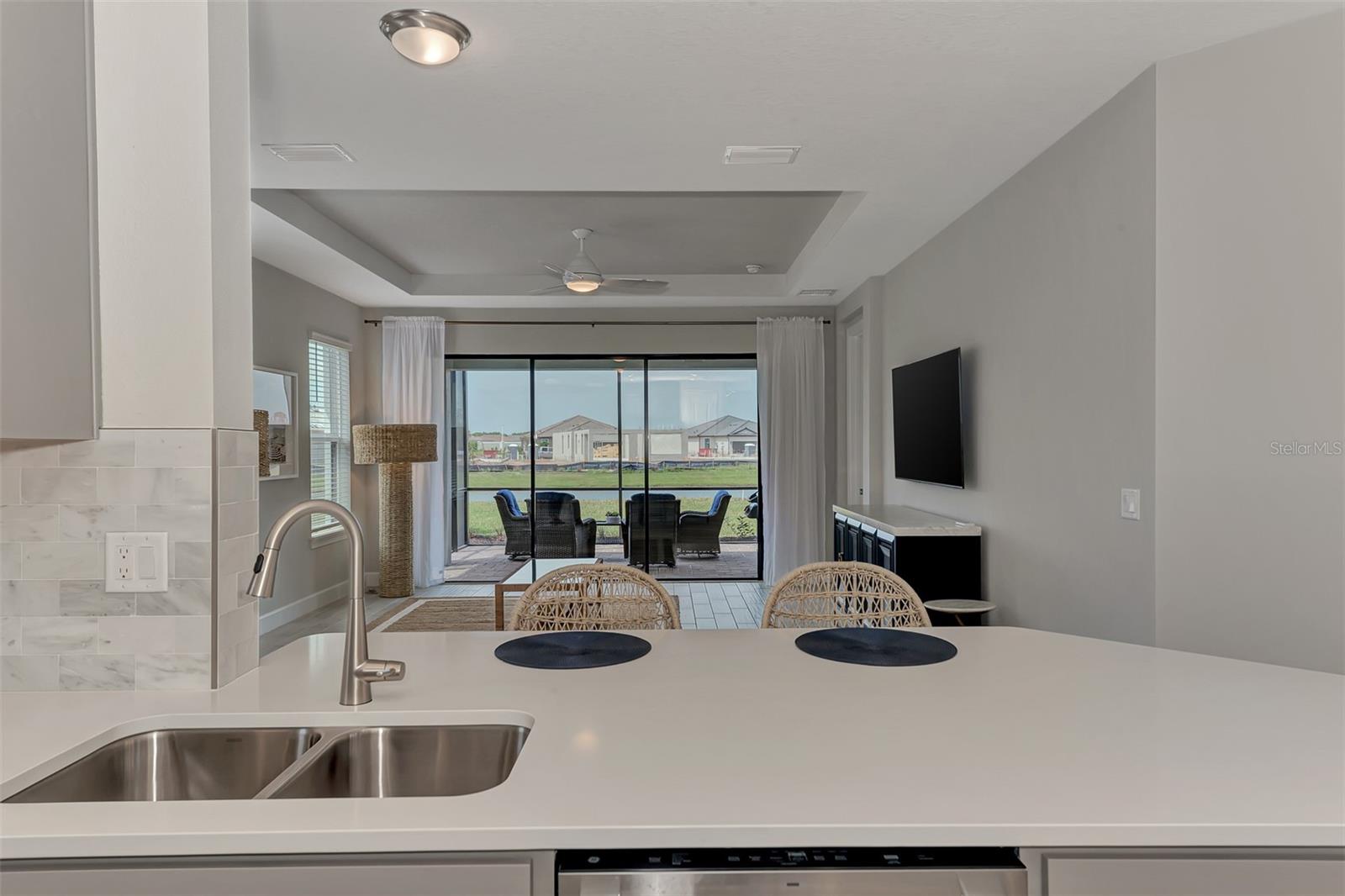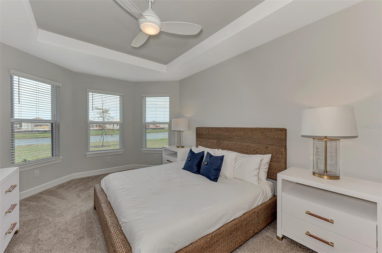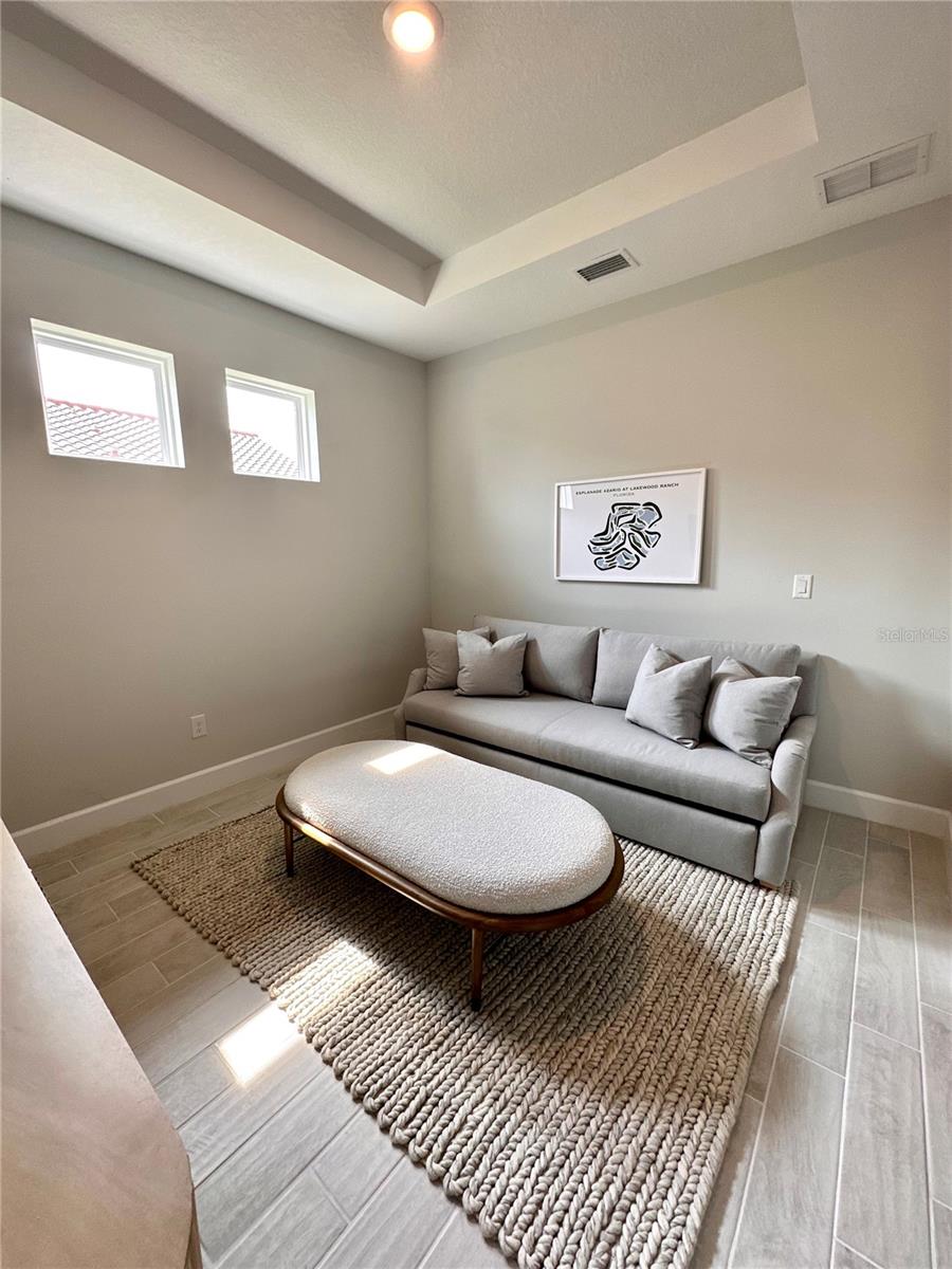 Welcome to this OVERSIZED HOMESITE, GOLF DEEDED WATERFRONT HOME (only one short-term four month rental ending 4/30/2025) turnkey furnished never-lived-in villa nestled in the serene, gated vibrant community of Esplanade at Azario in Lakewood Ranch where luxury meets convenience. This elegant and modern 2-bedroom/ 2-bath home with extended 2 car garage sits on an oversized lot with a gorgeous lake view. This home offers a spacious great room and den, providing the perfect blend of comfort and sophistication. Enjoy the opportunity of purchasing this professionally decorated (Katie Brandt Interiors) turn key home, just bring your suitcase and personal belongings. All the furniture and home items will be sold under a separate contract for $65,000. Upon entering, you are greeted by an open floor plan that seamlessly flows from the living area to the dining space, creating an inviting atmosphere for entertaining or relaxation. There are lots of windows with coffered ceilings in the living room and the master suite which makes this home feel open and light and brings the outside in. The designer kitchen boasts sleek, modern stainless-steel appliances, quartz countertops with ample counter space, making meal preparation a delight. The master suite offers a walk-in closet and a delightful bay window overlooking the lake. The master bath offers dual sinks with quartz countertops, vanity, and expansive walk-in shower. On the other side of the home is the 2nd bedroom with walk-in closet and full bath with quartz countertops. The den offers a pull-out queen sofa bed which can serve as an extra bedroom for guests. The inside laundry room provides plenty of storage space along with laundry sink. Step outside to the extended screened lanai, where you can savor tranquil moments with a cup of coffee or a good book, surrounded by the lush landscaping and gentle Florida breezes with a lake view. The property's large lot provides ample space for outdoor enjoyment. Azario is well known for being very social and active you will also love the NEW CULINARY EXPERIENCE as they have now completed the building. You are walking distance to the golf pro shop and the Bahama pool and clubhouse and Culinary building which is perfect for getting to know your neighbors. Located within a gated community, residents of this exquisite villa have access to the clubhouse, state-of-the-art fitness center, resort-style pool, tennis and pickleball courts, 18-hole golf state-of-the-art golf course including a water driving range, offering a myriad of recreational and leisure opportunities. With its modern design, spacious layout, and access to a host of amenities, this home offers the perfect blend of elegance and comfort making this delightful villa at 16119 Fortezza Drive a rare opportunity for those seeking a tranquil and luxurious lifestyle in Lakewood Ranch. COME SEE THIS HOME TODAY.
