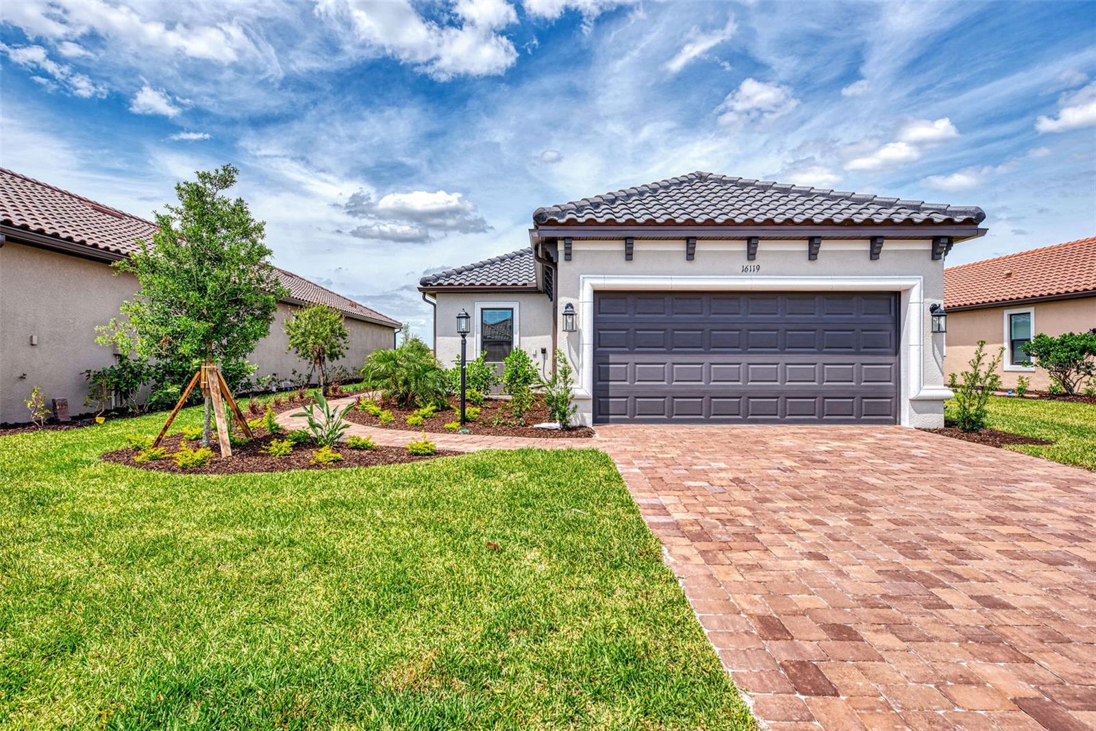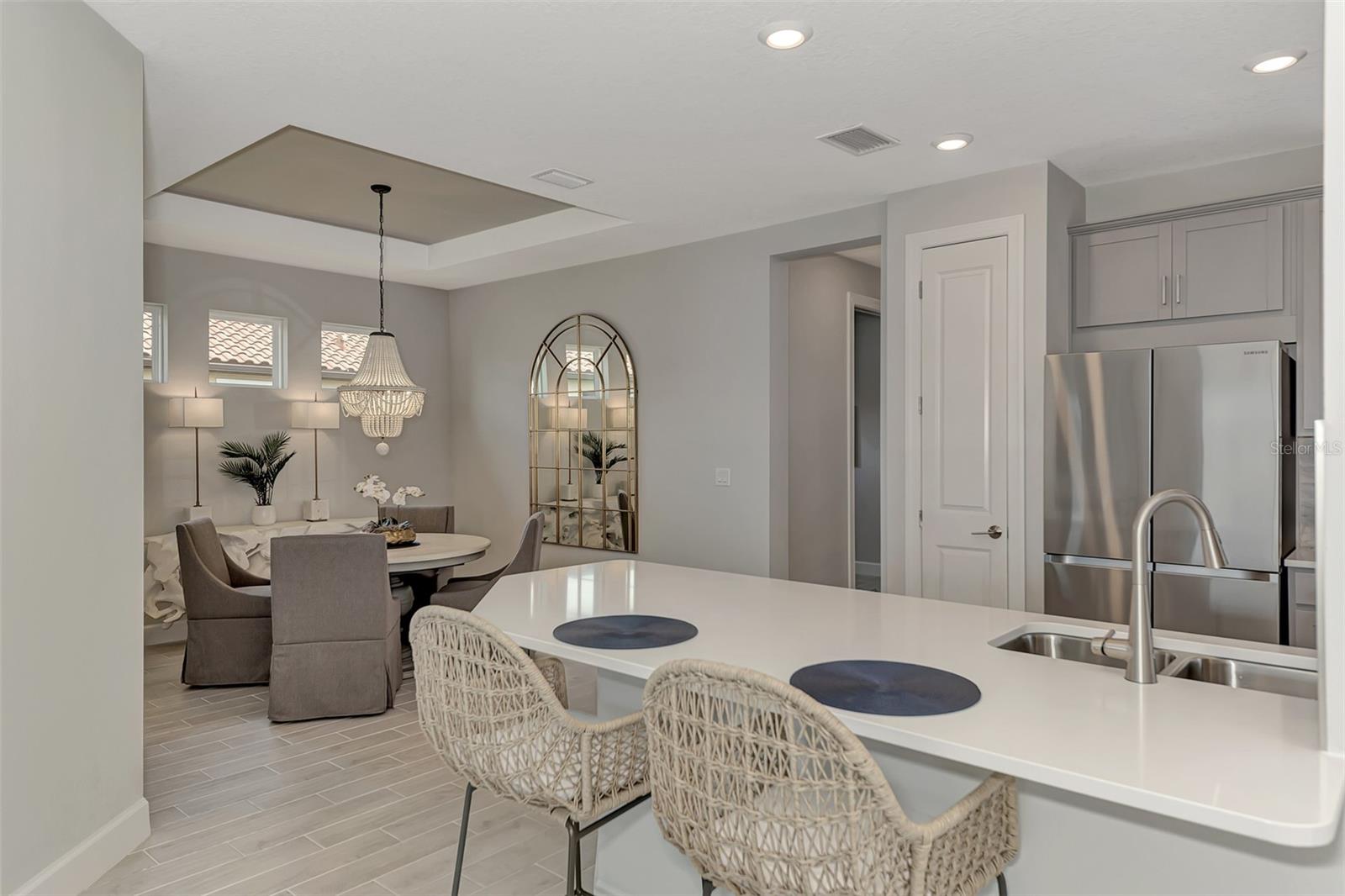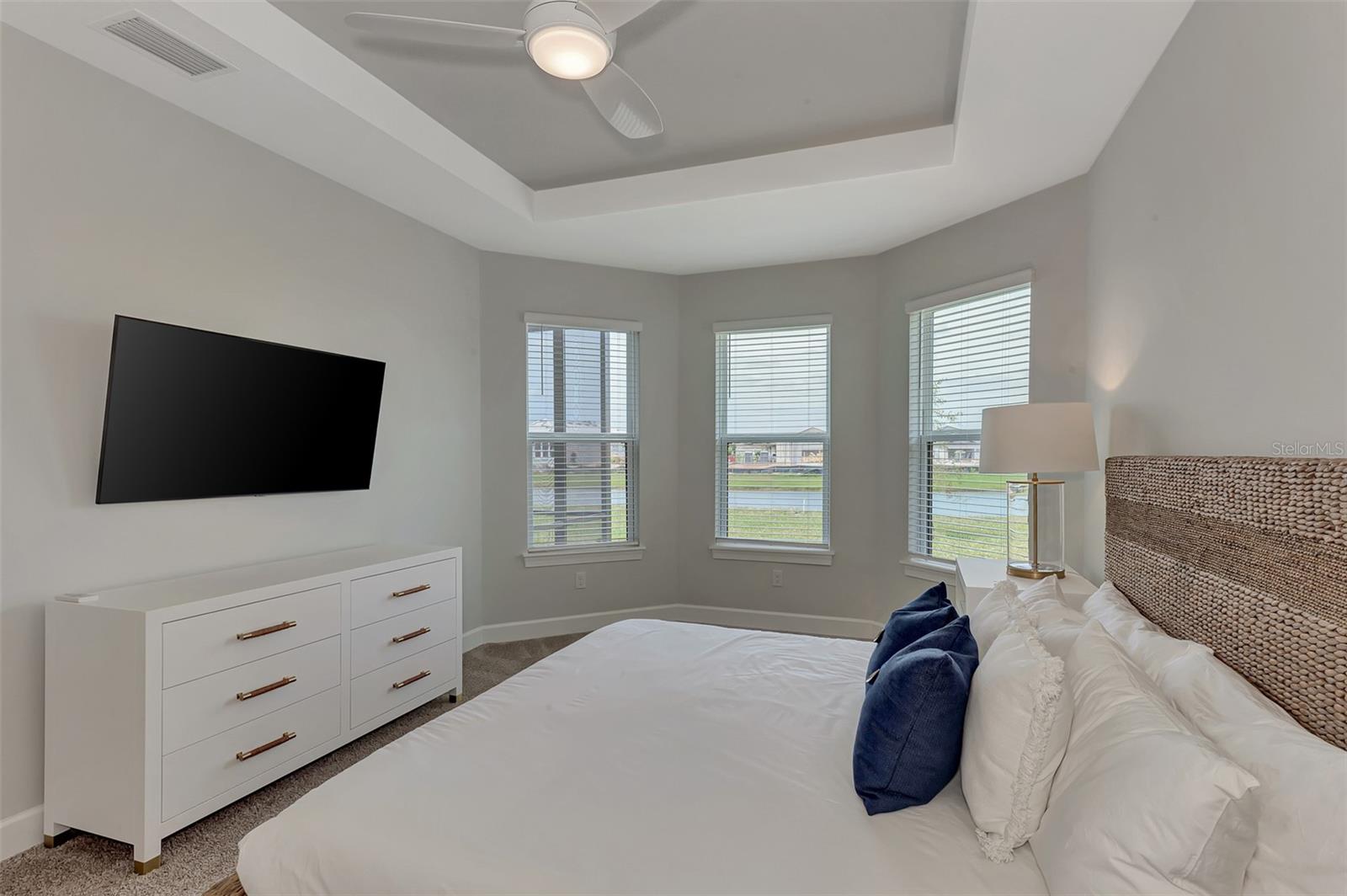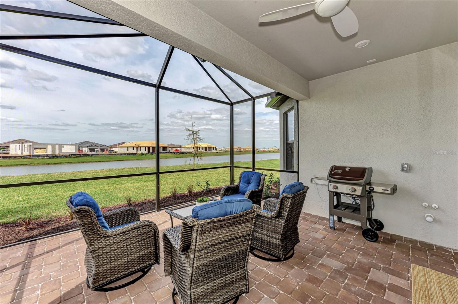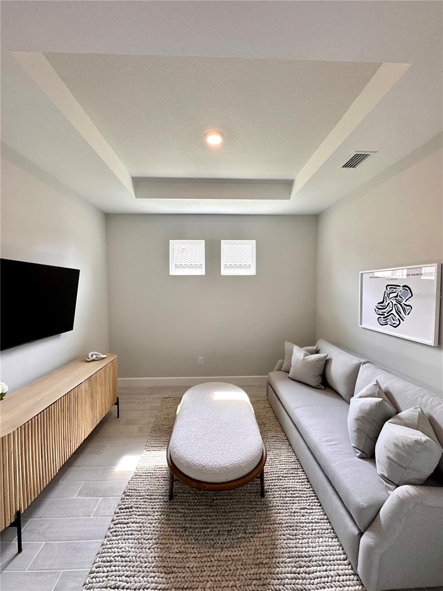 Welcome to this OVERSIZED HOMESITE, GOLF DEEDED WATERFRONT HOME (only one short-term four month rental ending 4/30/2025) turnkey furnished never-lived-in villa nestled in the serene, gated vibrant community of Esplanade at Azario in Lakewood Ranch where luxury meets convenience. This elegant and modern 2-bedroom/ 2-bath home with extended 2 car garage sits on an oversized lot with a gorgeous lake view. This home offers a spacious great room and den, providing the perfect blend of comfort and sophistication. Enjoy the opportunity of purchasing this professionally decorated (Katie Brandt Interiors) turn key home, just bring your suitcase and personal belongings. All the furniture and home items will be sold under a separate contract for $65,000. Upon entering, you are greeted by an open floor plan that seamlessly flows from the living area to the dining space, creating an inviting atmosphere for entertaining or relaxation. There are lots of windows with coffered ceilings in the living room and the master suite which makes this home feel open and light and brings the outside in. The designer kitchen boasts sleek, modern stainless-steel appliances, quartz countertops with ample counter space, making meal preparation a delight. The master suite offers a walk-in closet and a delightful bay window overlooking the lake. The master bath offers dual sinks with quartz countertops, vanity, and expansive walk-in shower. On the other side of the home is the 2nd bedroom with walk-in closet and full bath with quartz countertops. The den offers a pull-out queen sofa bed which can serve as an extra bedroom for guests. The inside laundry room provides plenty of storage space along with laundry sink. Step outside to the extended screened lanai, where you can savor tranquil moments with a cup of coffee or a good book, surrounded by the lush landscaping and gentle Florida breezes with a lake view. The property's large lot provides ample space for outdoor enjoyment. Azario is well known for being very social and active you will also love the NEW CULINARY EXPERIENCE as they have now completed the building. You are walking distance to the golf pro shop and the Bahama pool and clubhouse and Culinary building which is perfect for getting to know your neighbors. Located within a gated community, residents of this exquisite villa have access to the clubhouse, state-of-the-art fitness center, resort-style pool, tennis and pickleball courts, 18-hole golf state-of-the-art golf course including a water driving range, offering a myriad of recreational and leisure opportunities. With its modern design, spacious layout, and access to a host of amenities, this home offers the perfect blend of elegance and comfort making this delightful villa at 16119 Fortezza Drive a rare opportunity for those seeking a tranquil and luxurious lifestyle in Lakewood Ranch. COME SEE THIS HOME TODAY.