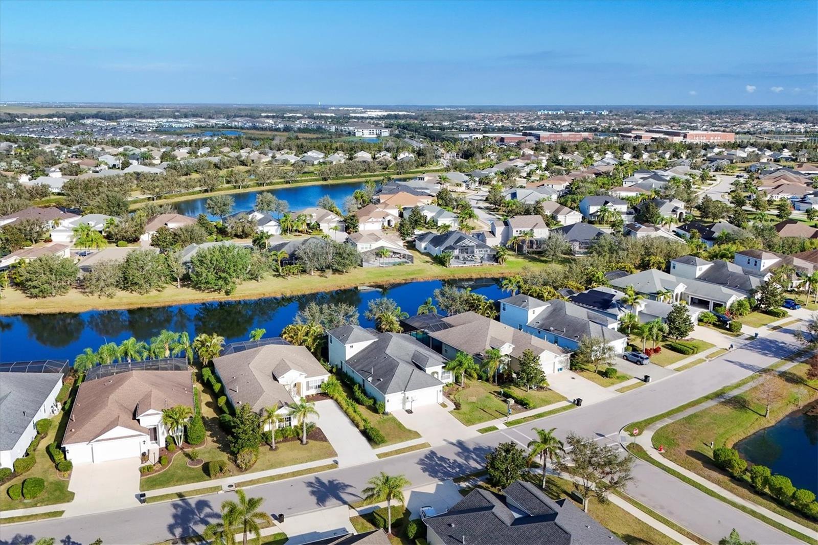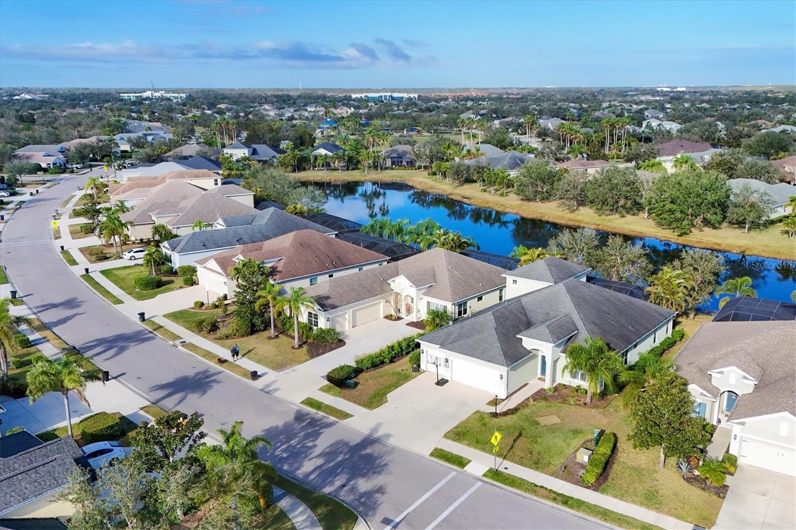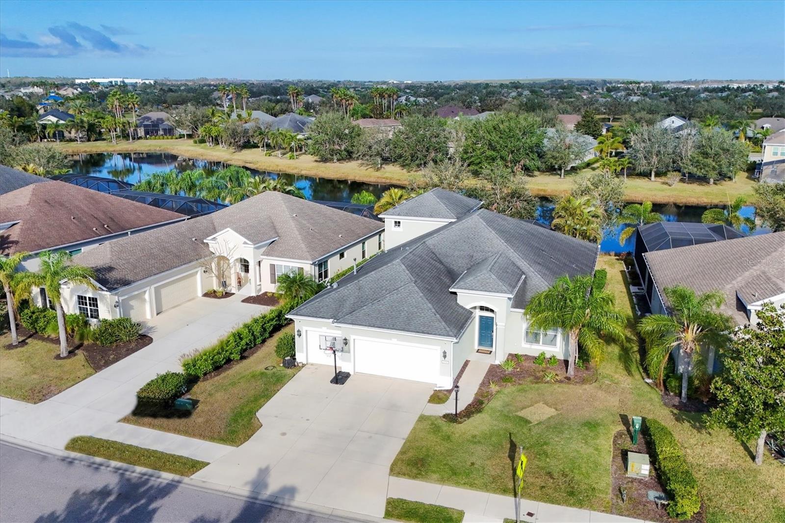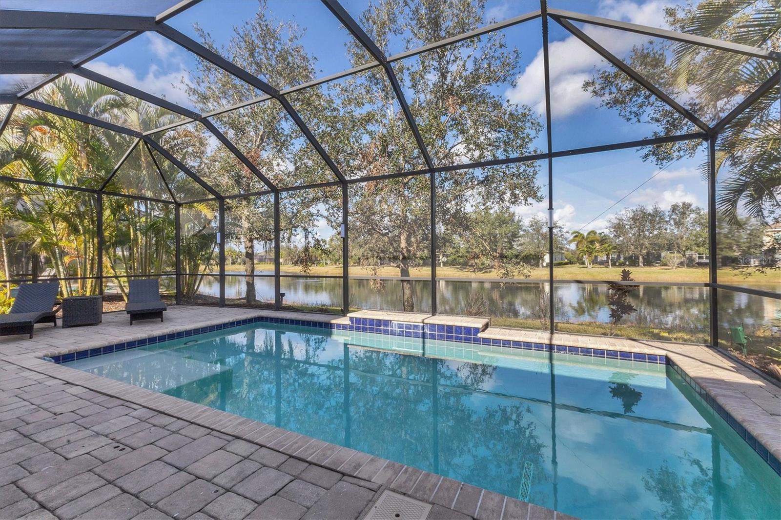 PRICE IMPROVEMENT!!! This stunning home with 2,999 sq ft of living space features 4 bedrooms plus 2 dens and 4 full baths, with a primary bedroom located on both floors for ultimate convenience. The interior boasts high ceilings and 18x18 ceramic tile throughout the main living areas, creating an elegant and open atmosphere. Enjoy serene lake views from your backyard, complete with a heated pool for year-round relaxation. The great room features tray ceilings and pocket sliders that open to a spacious lanai, perfect for entertaining. The open kitchen is a chef’s dream, with granite countertops, Cherry Spice cabinetry, and a gourmet island. The home also includes a formal dining room, a laundry room with extra storage, and a spacious 3-car garage. Set in a Lakewood Ranch gated community, residents enjoy access to tennis courts, dog parks, a splash park, and plenty of walking trails for outdoor recreation. Minutes to UTC, hospital, interstate and plenty of shopping and restaurants.